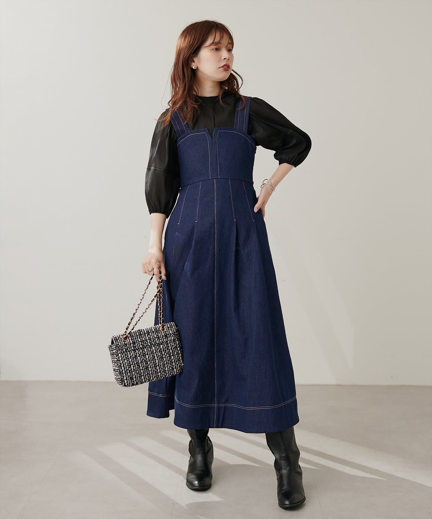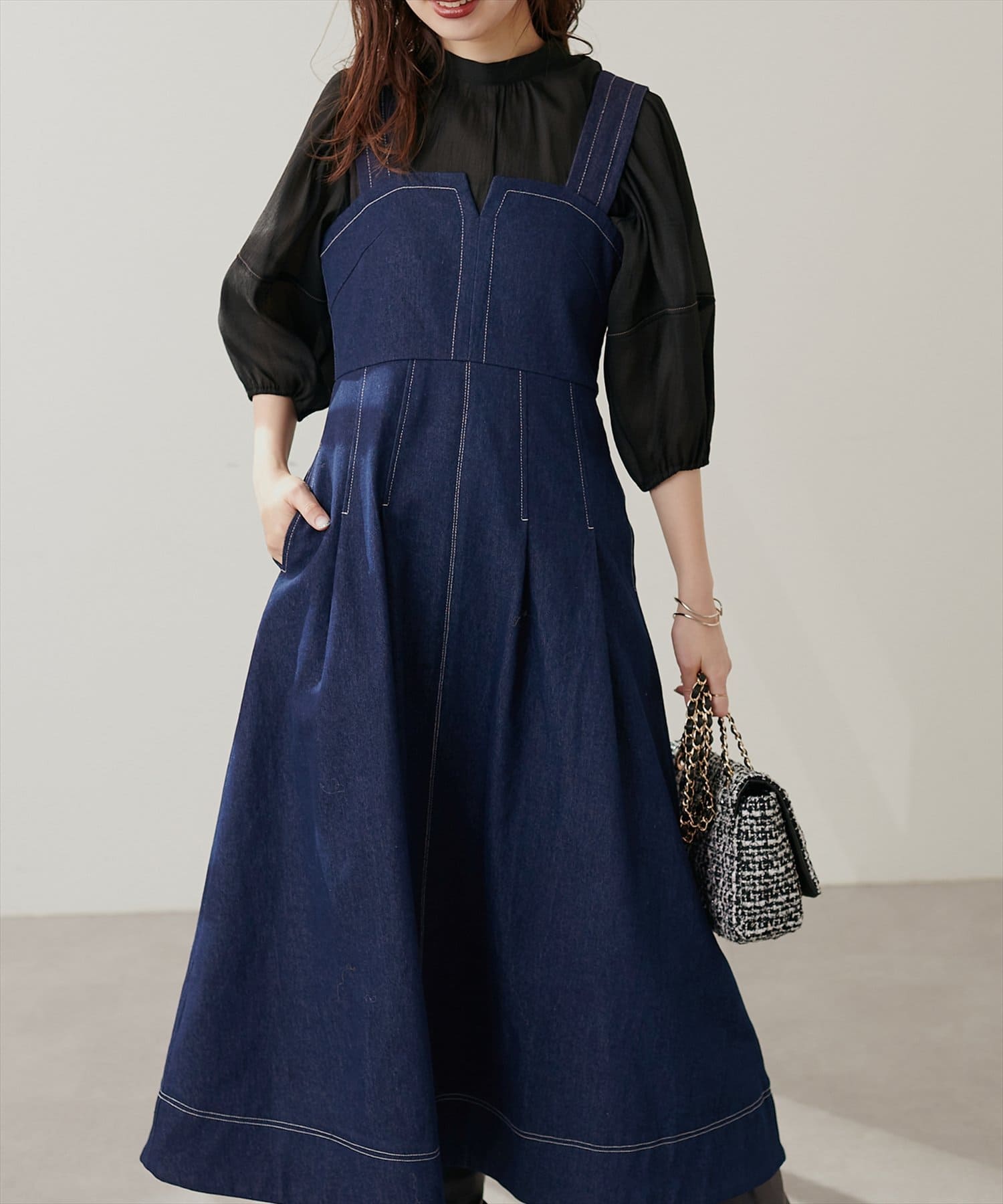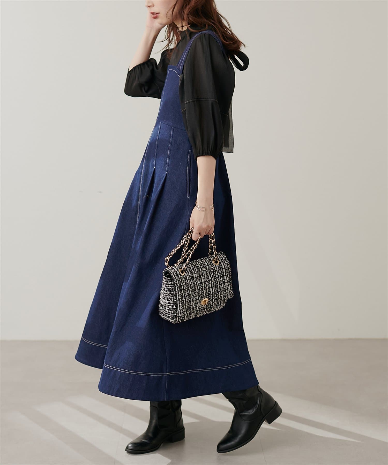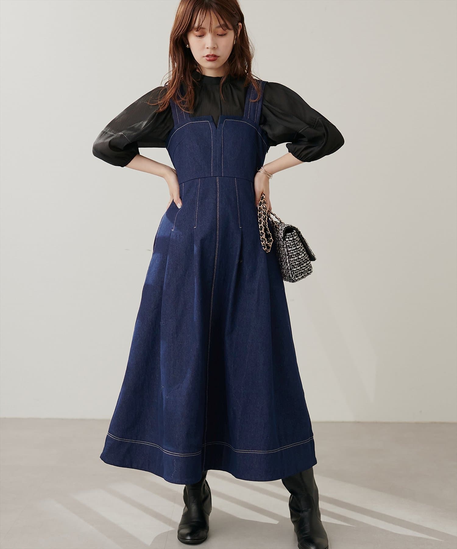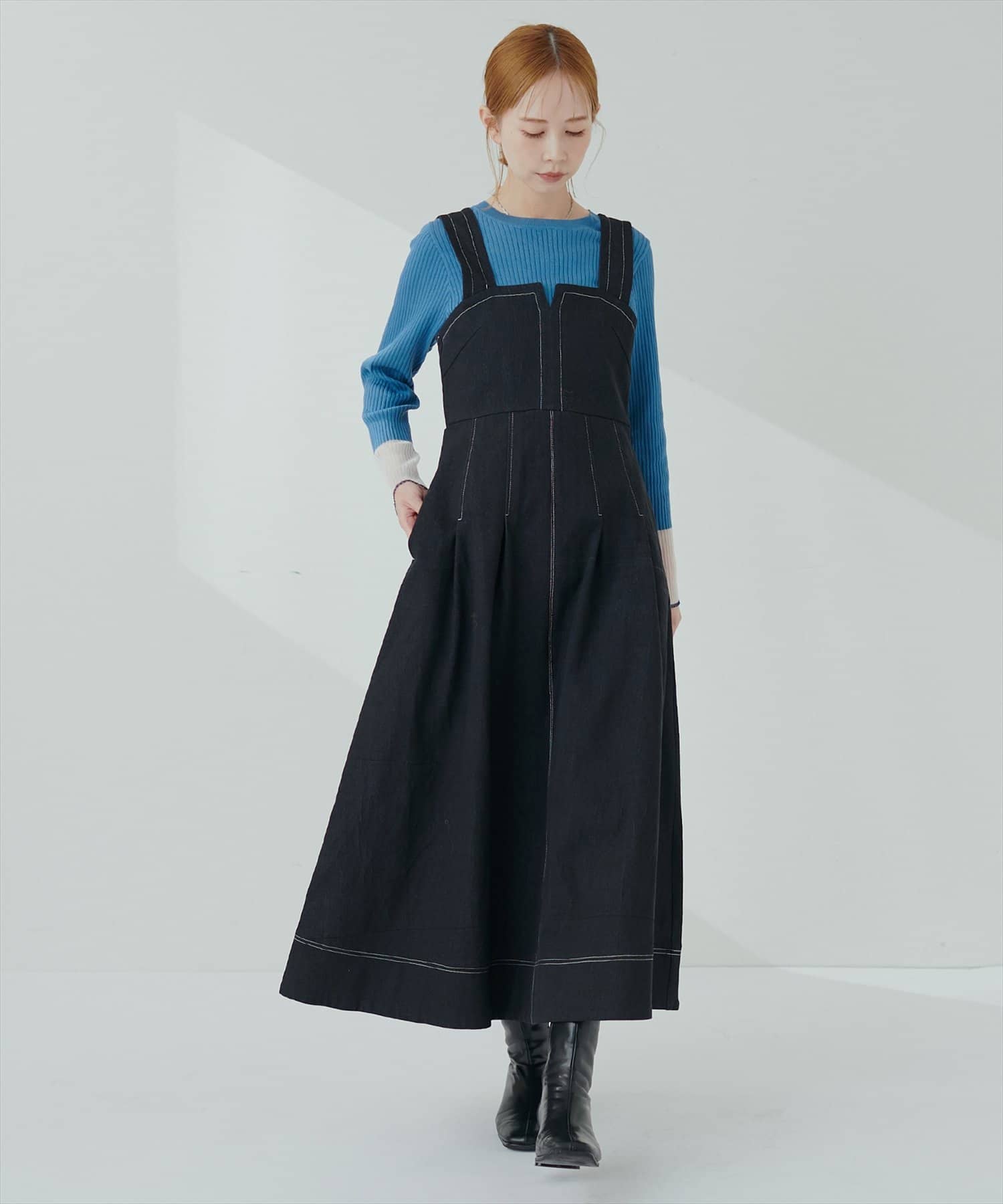 1枚でデザイン性があり主役級のジャンパースカートなので、インナーはシンプルなトップスを合わせるだけでコーデがきまります。