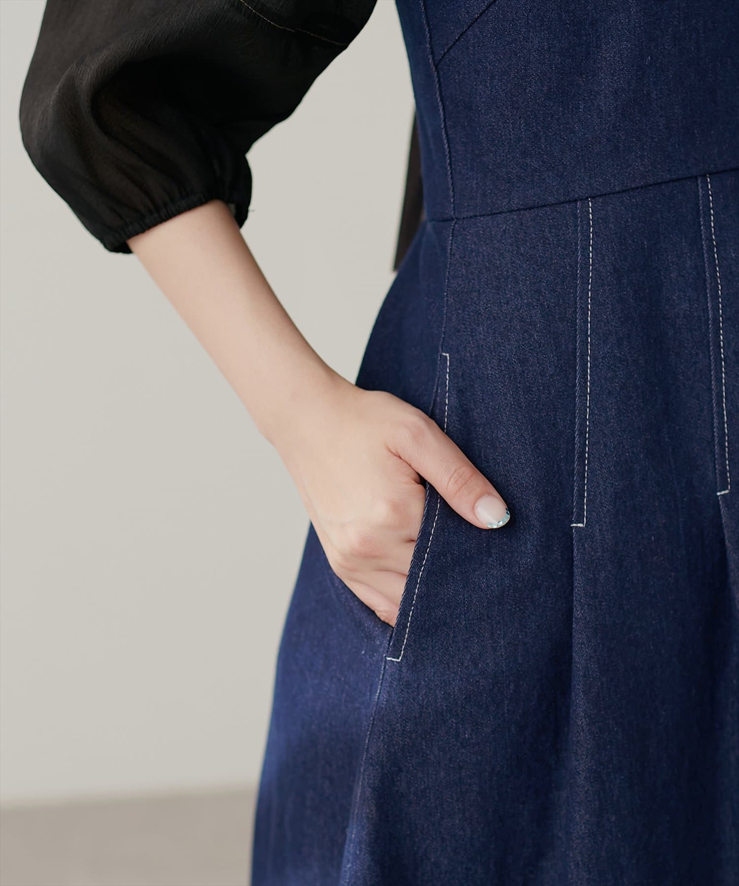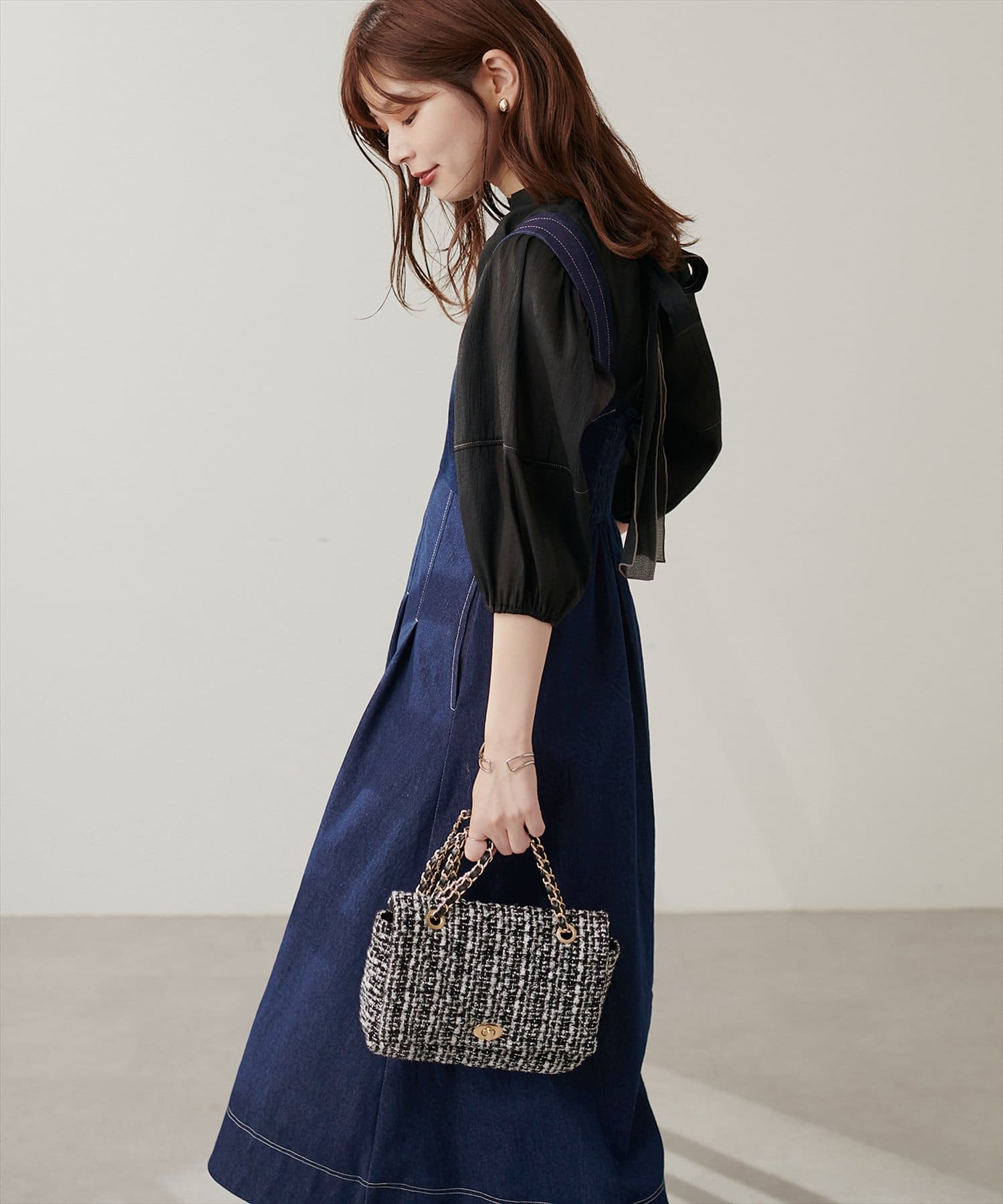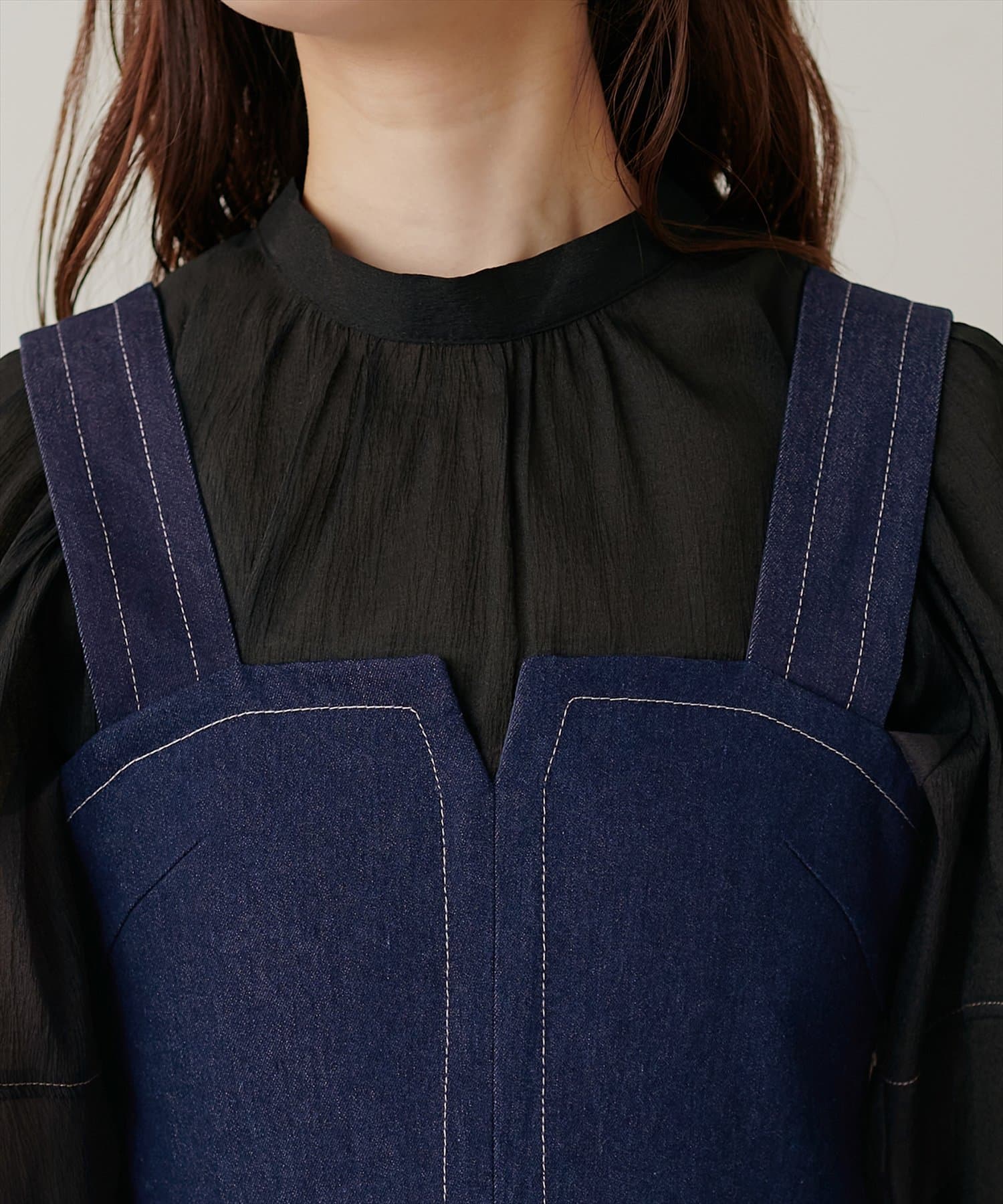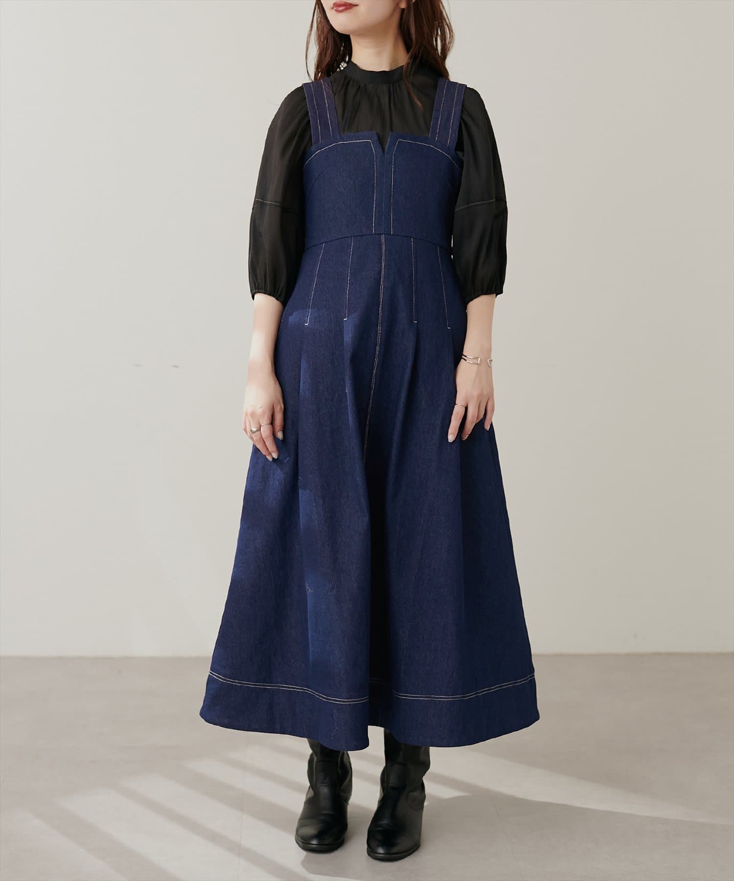1枚でデザイン性があり主役級のジャンパースカートなので、インナーはシンプルなトップスを合わせるだけでコーデがきまります。