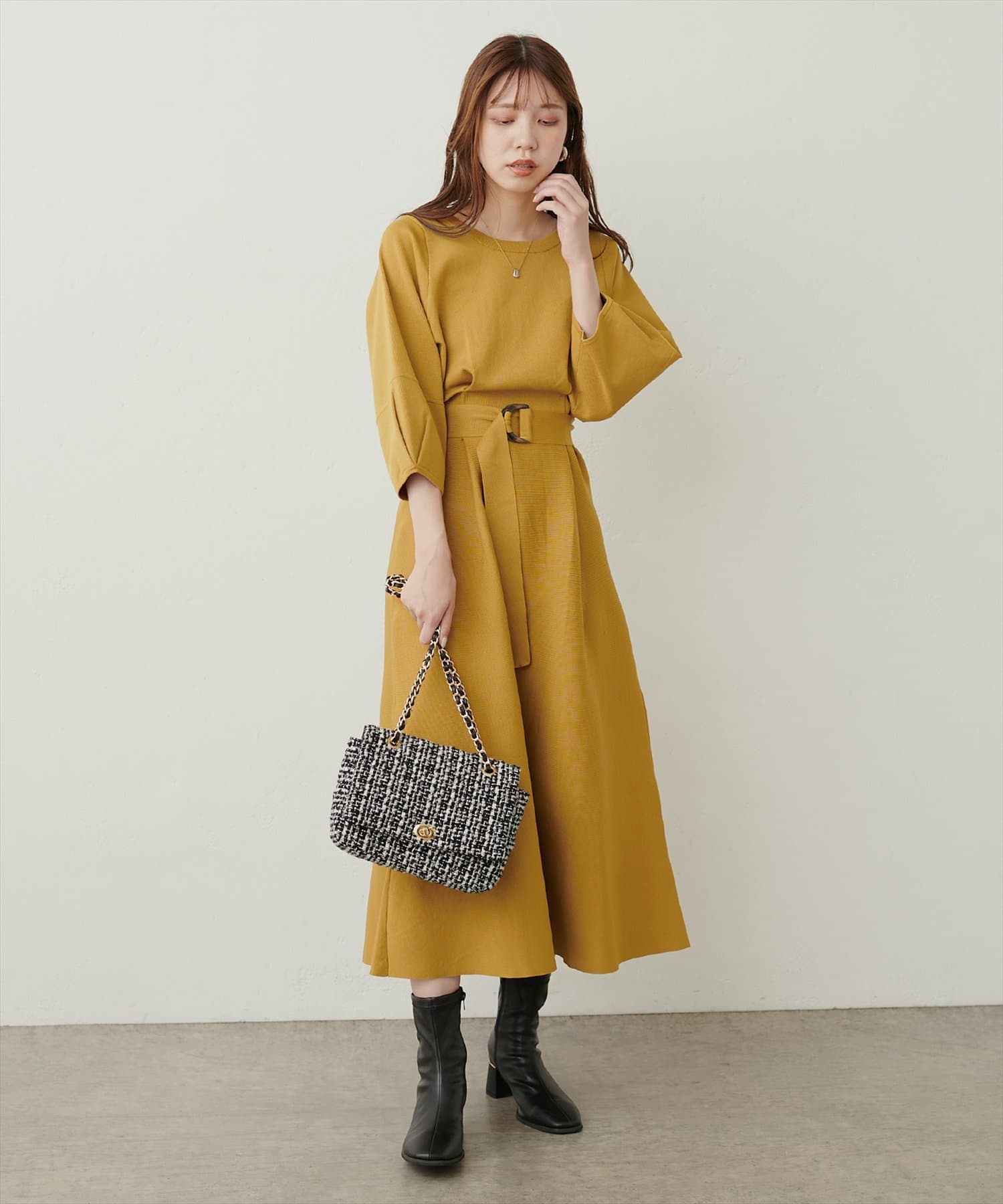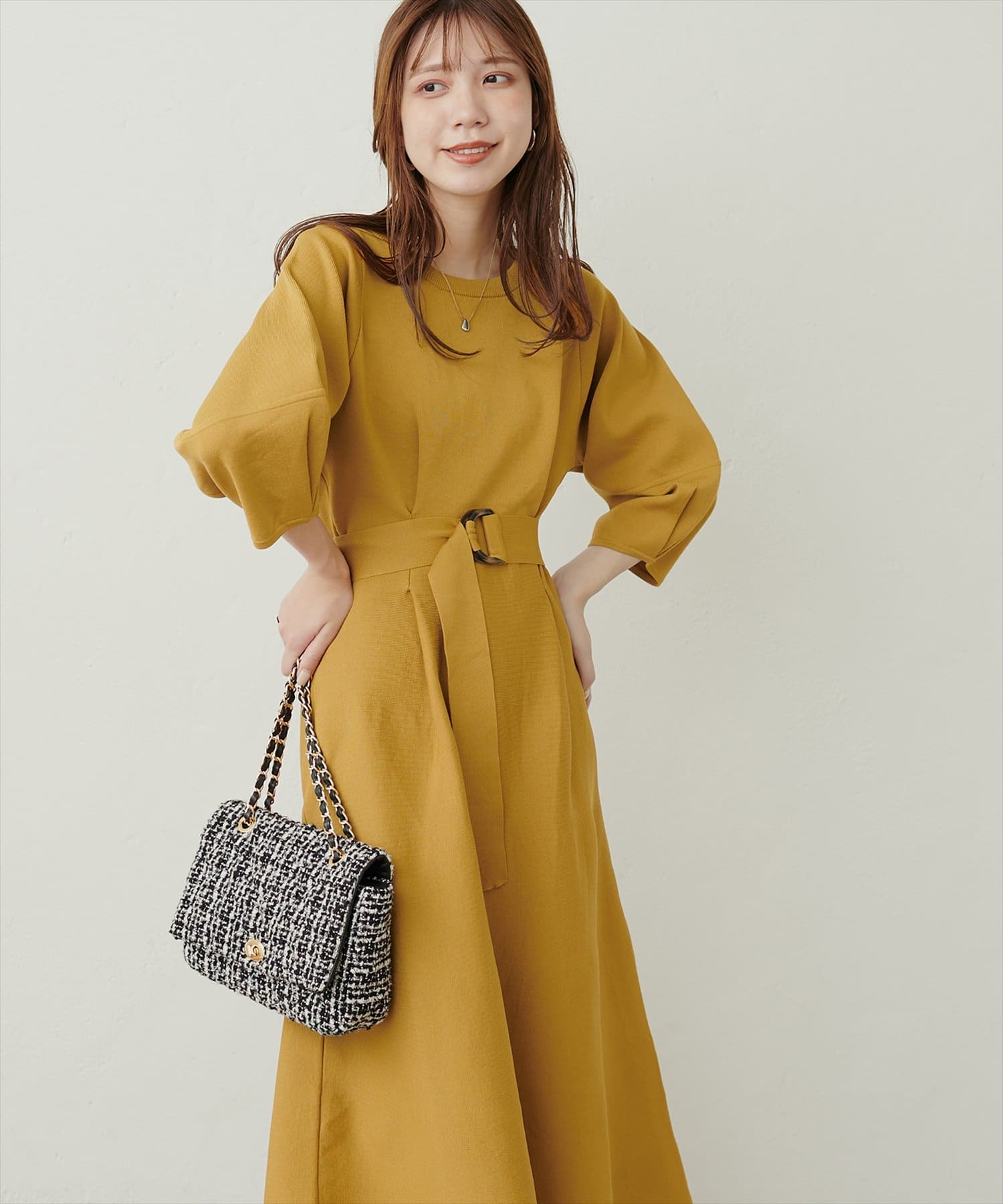 付属のベルトでウエストマークするとより洗練された印象に。