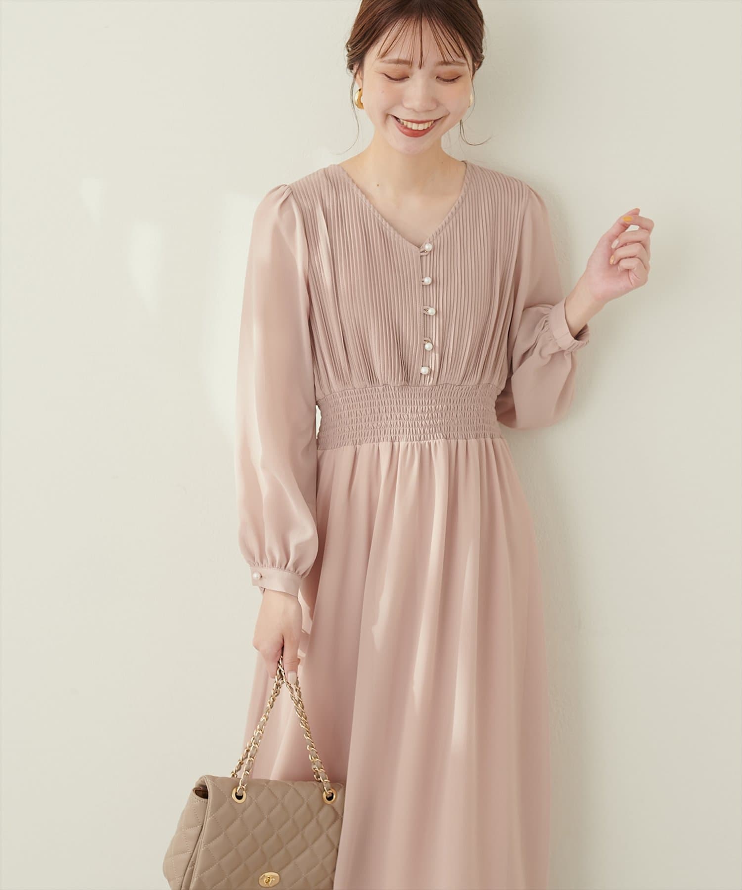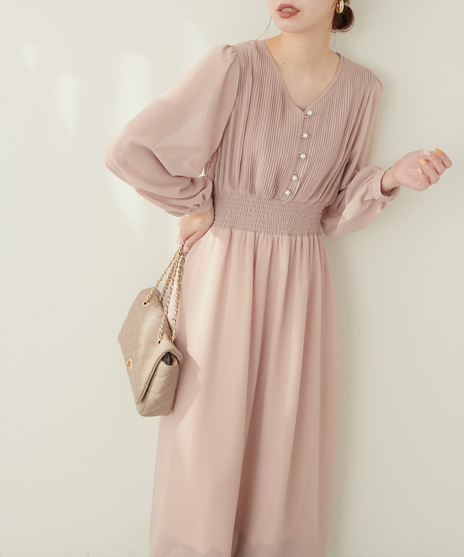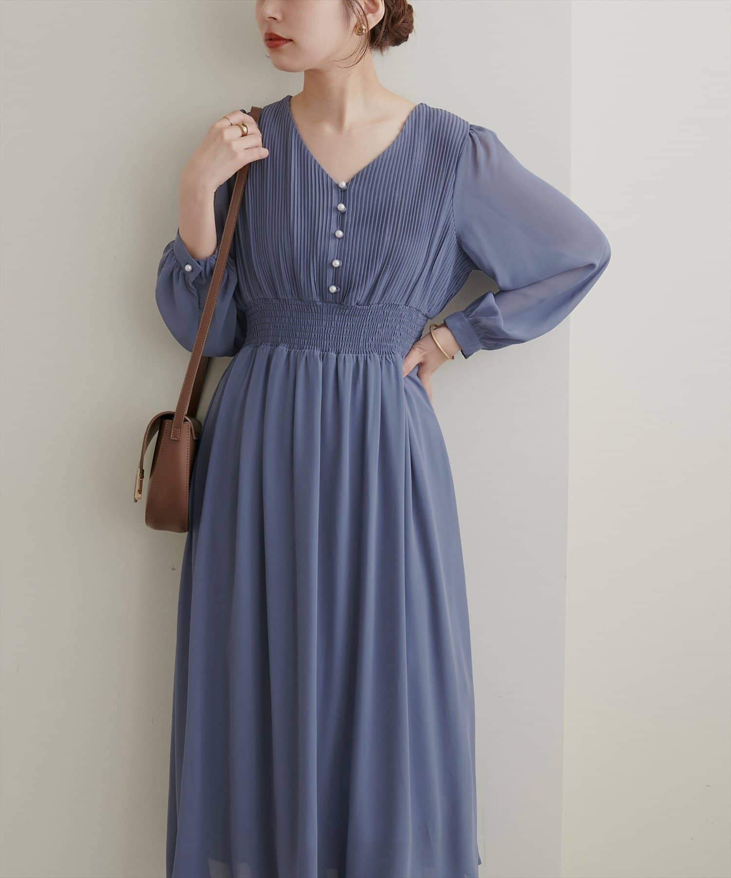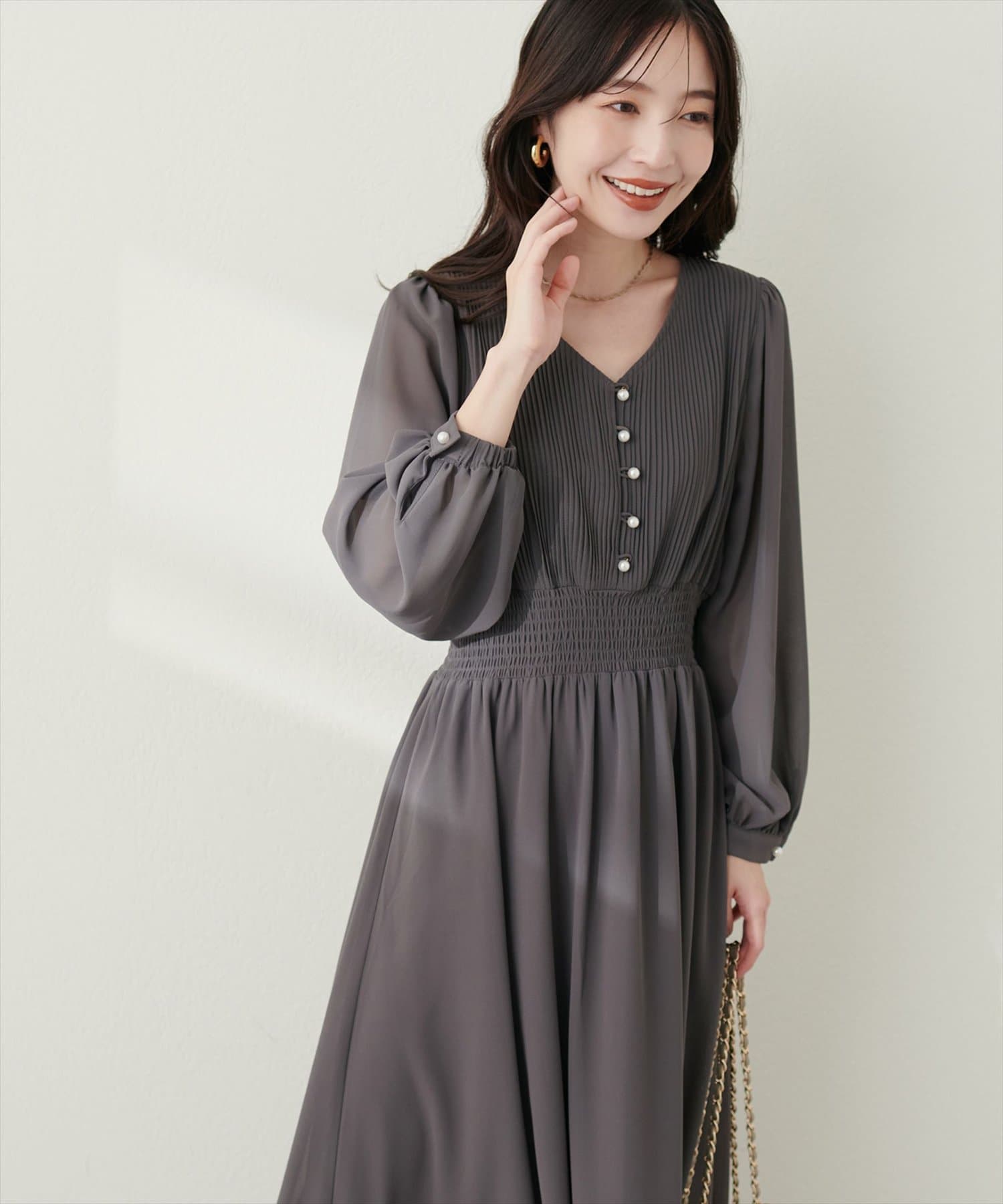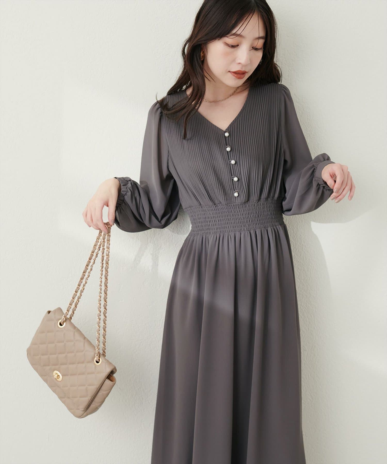 パール釦をあしらった女性らしいデザインのワンピースです。