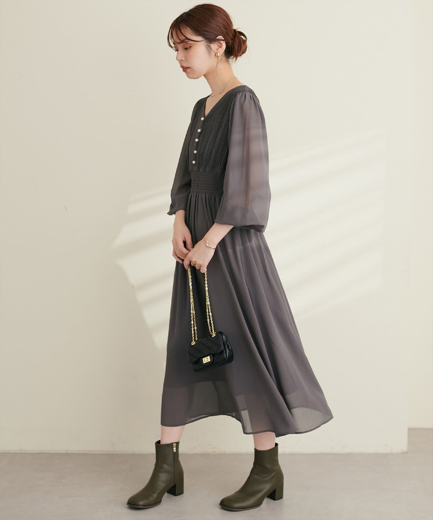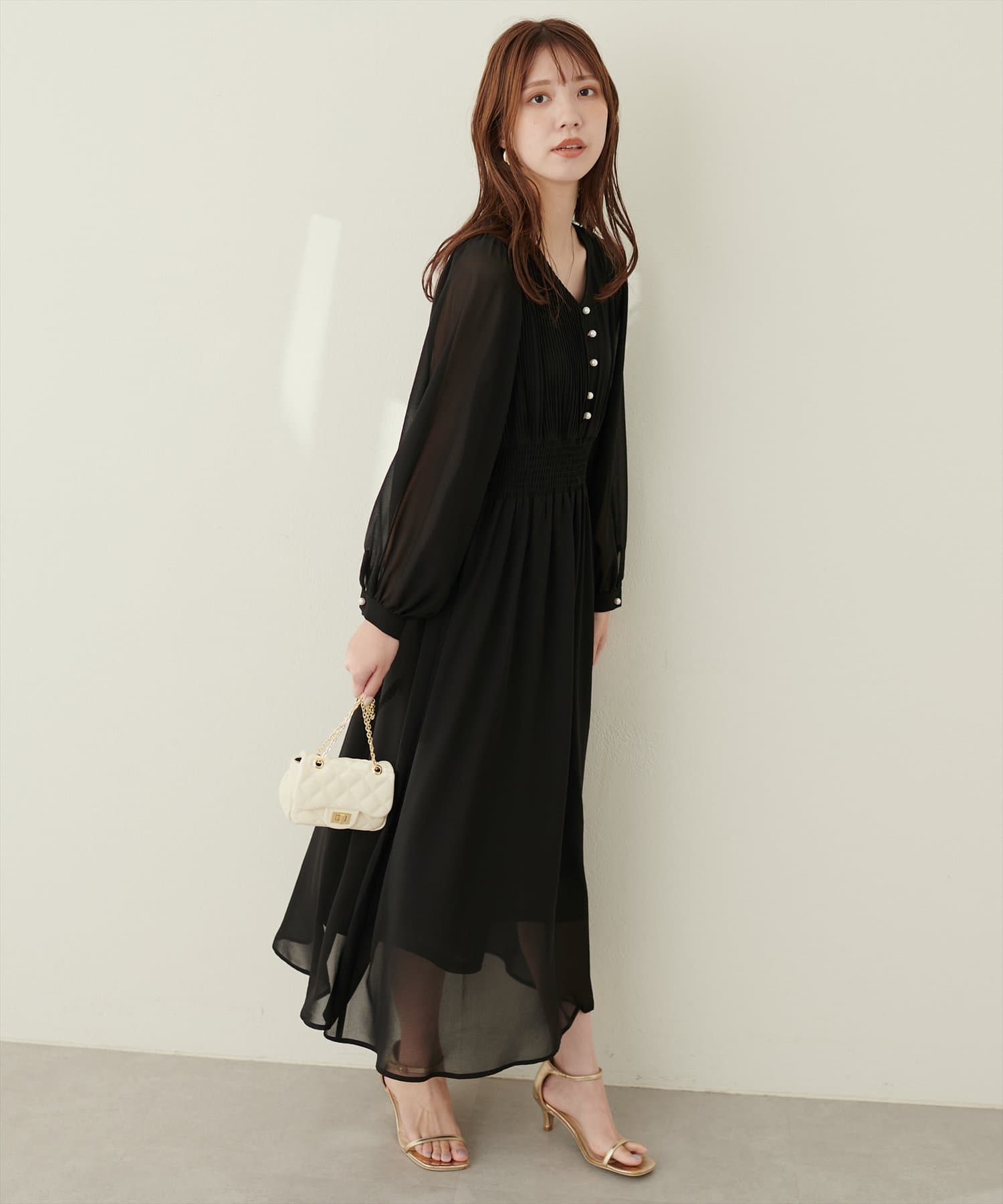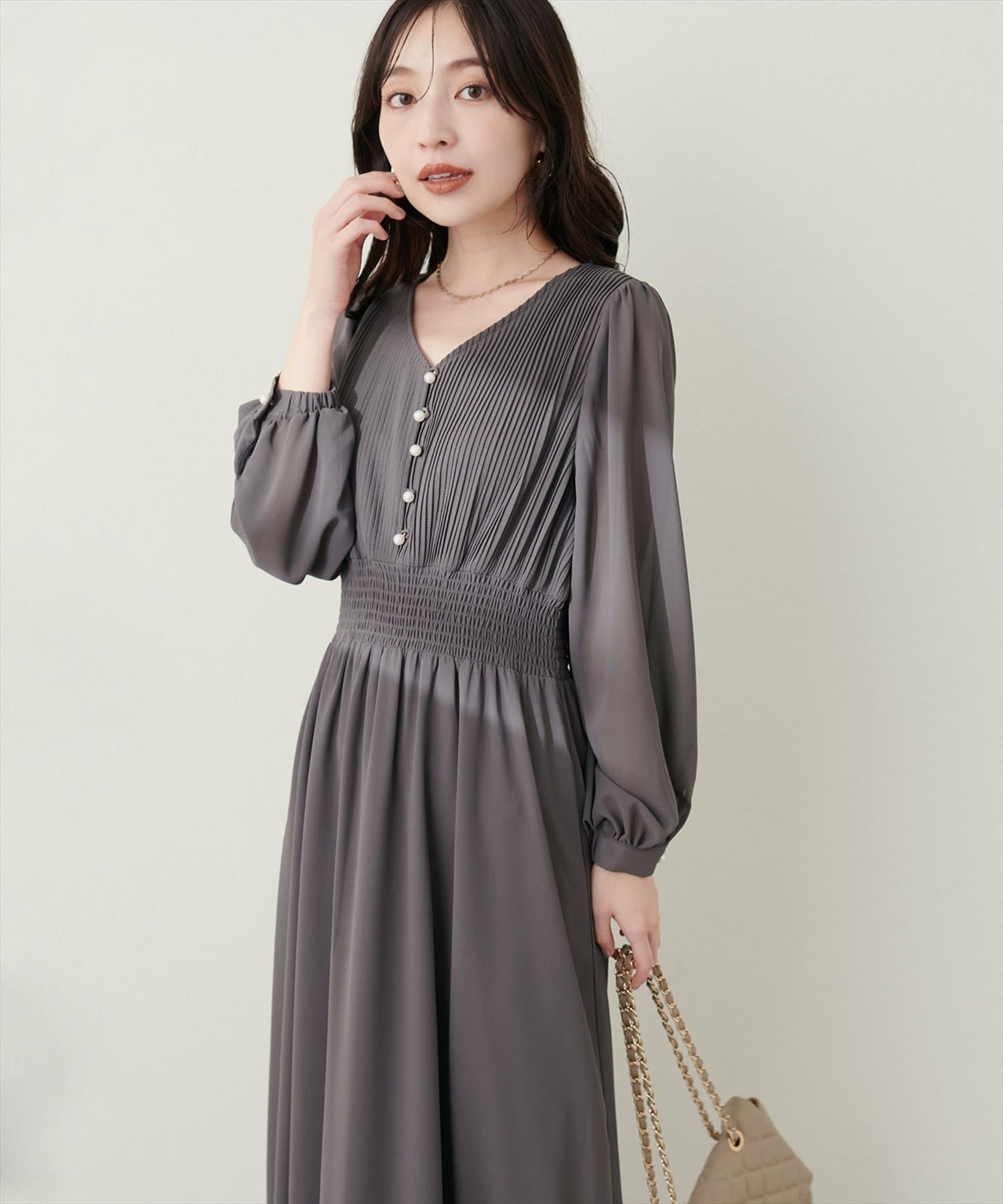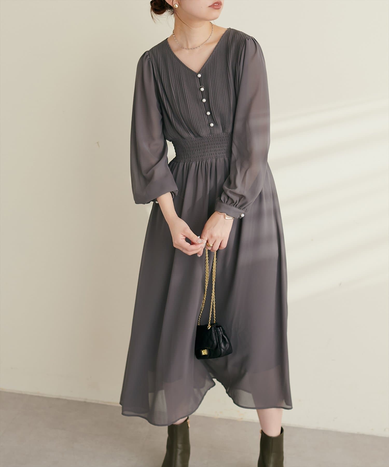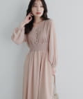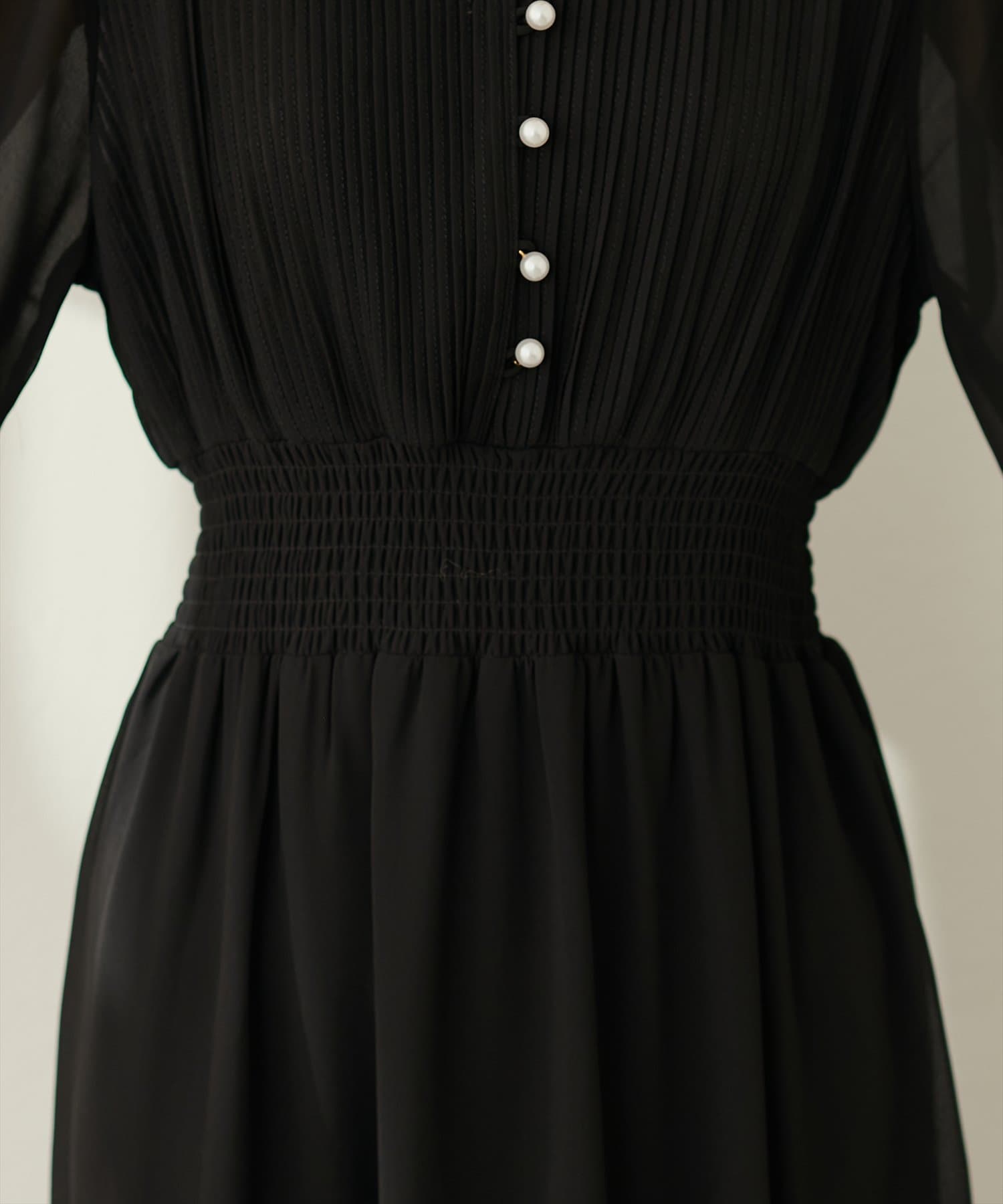 パール釦をあしらった女性らしいデザインのワンピースです。