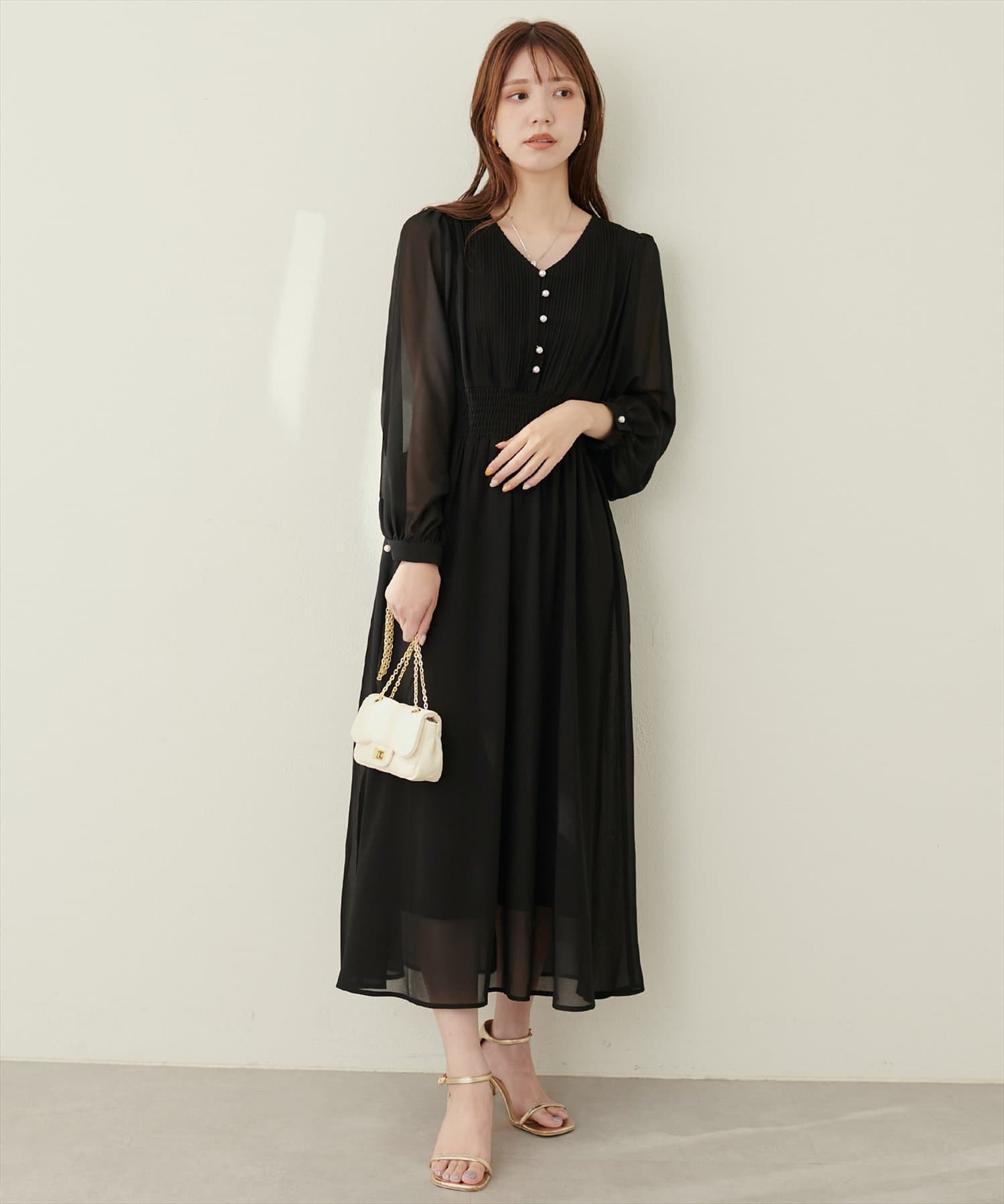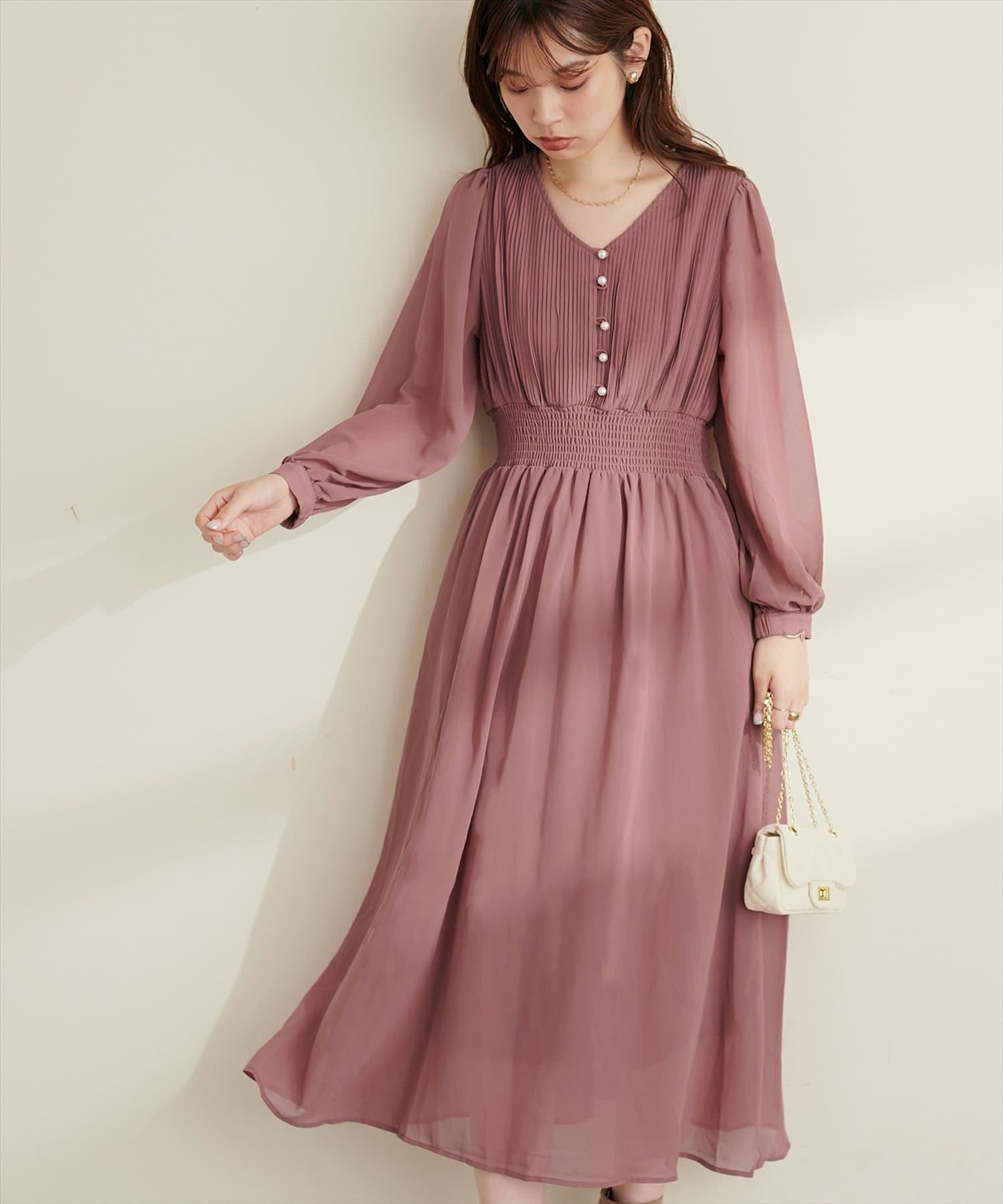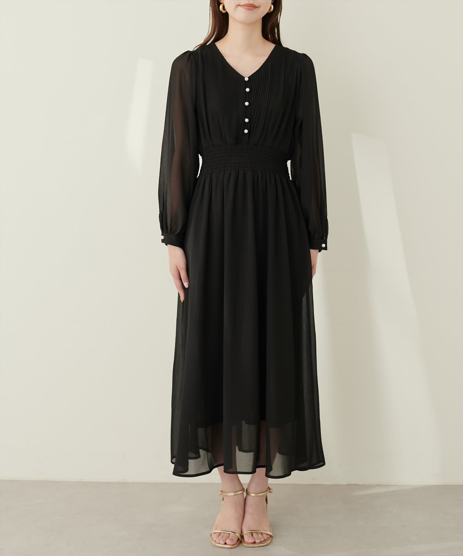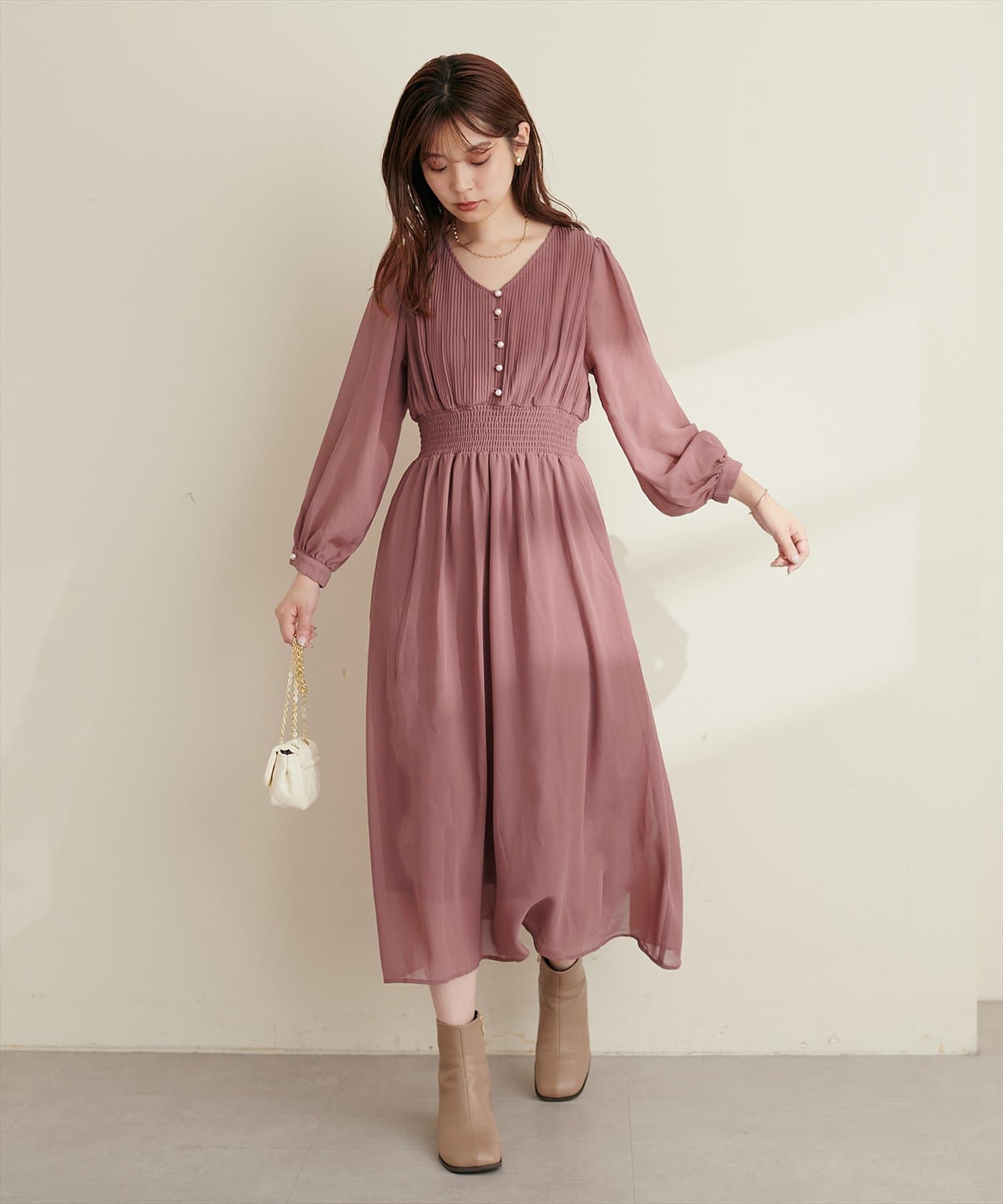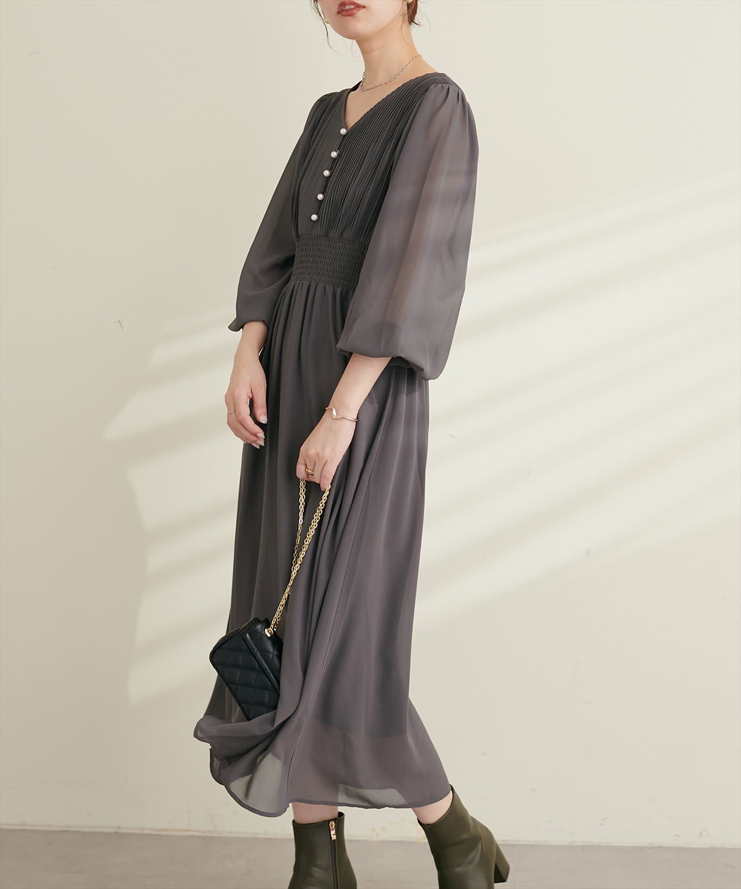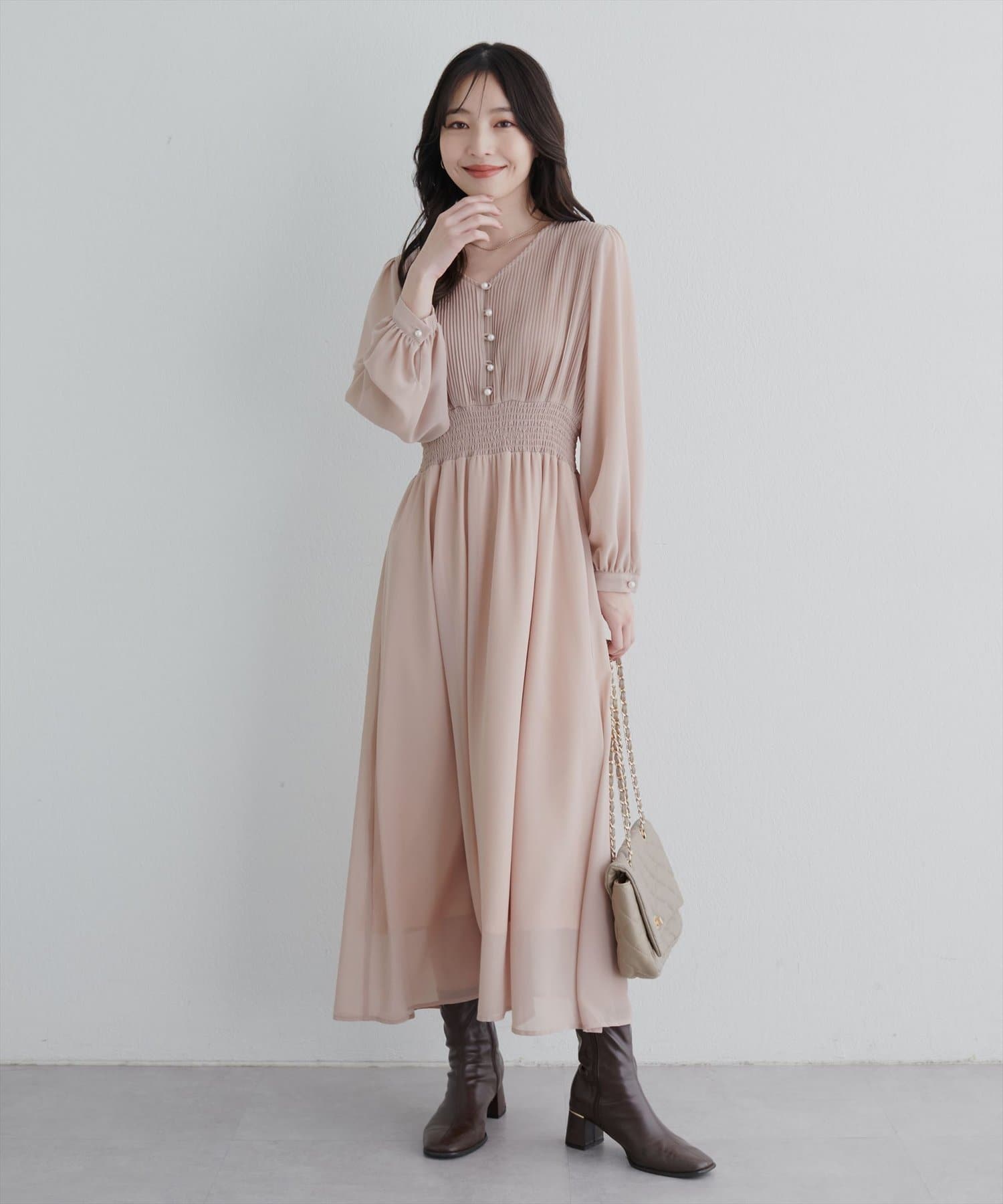 パール釦をあしらった女性らしいデザインのワンピースです。