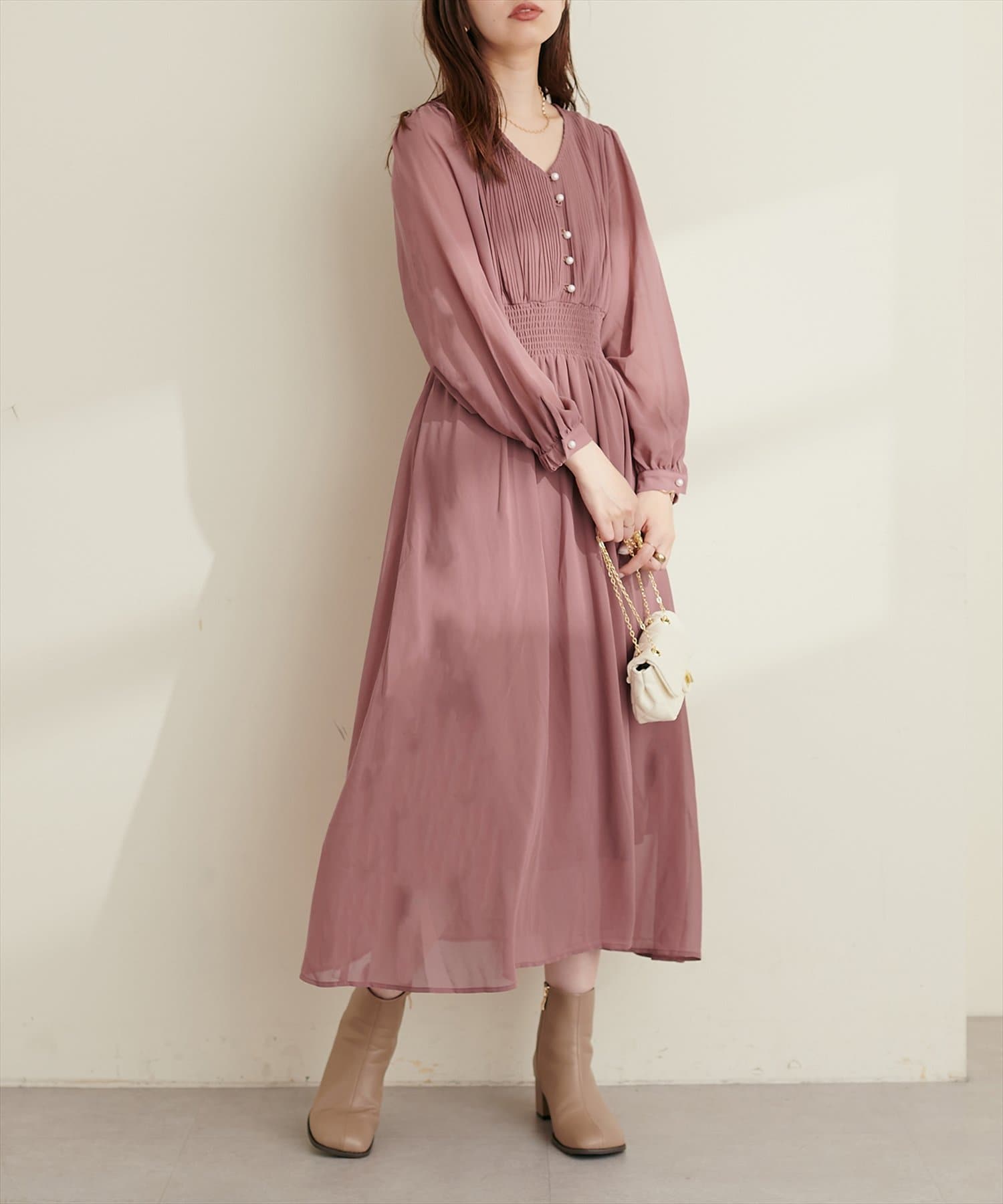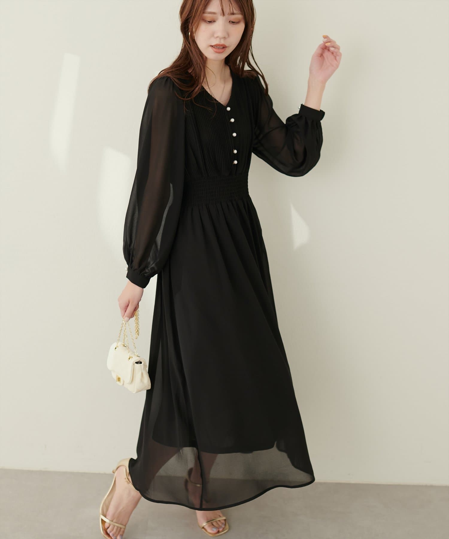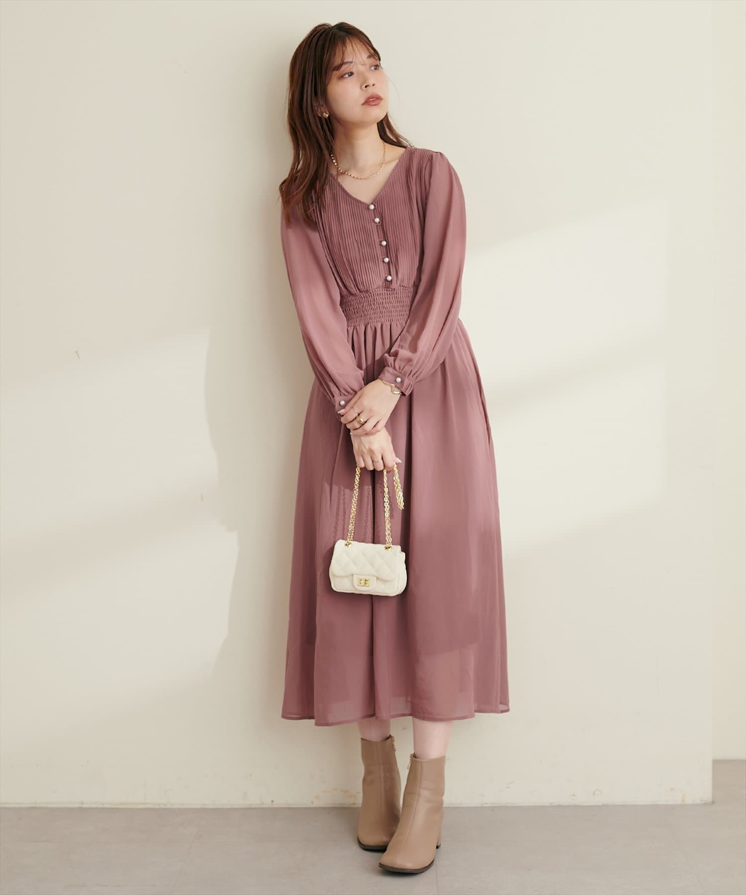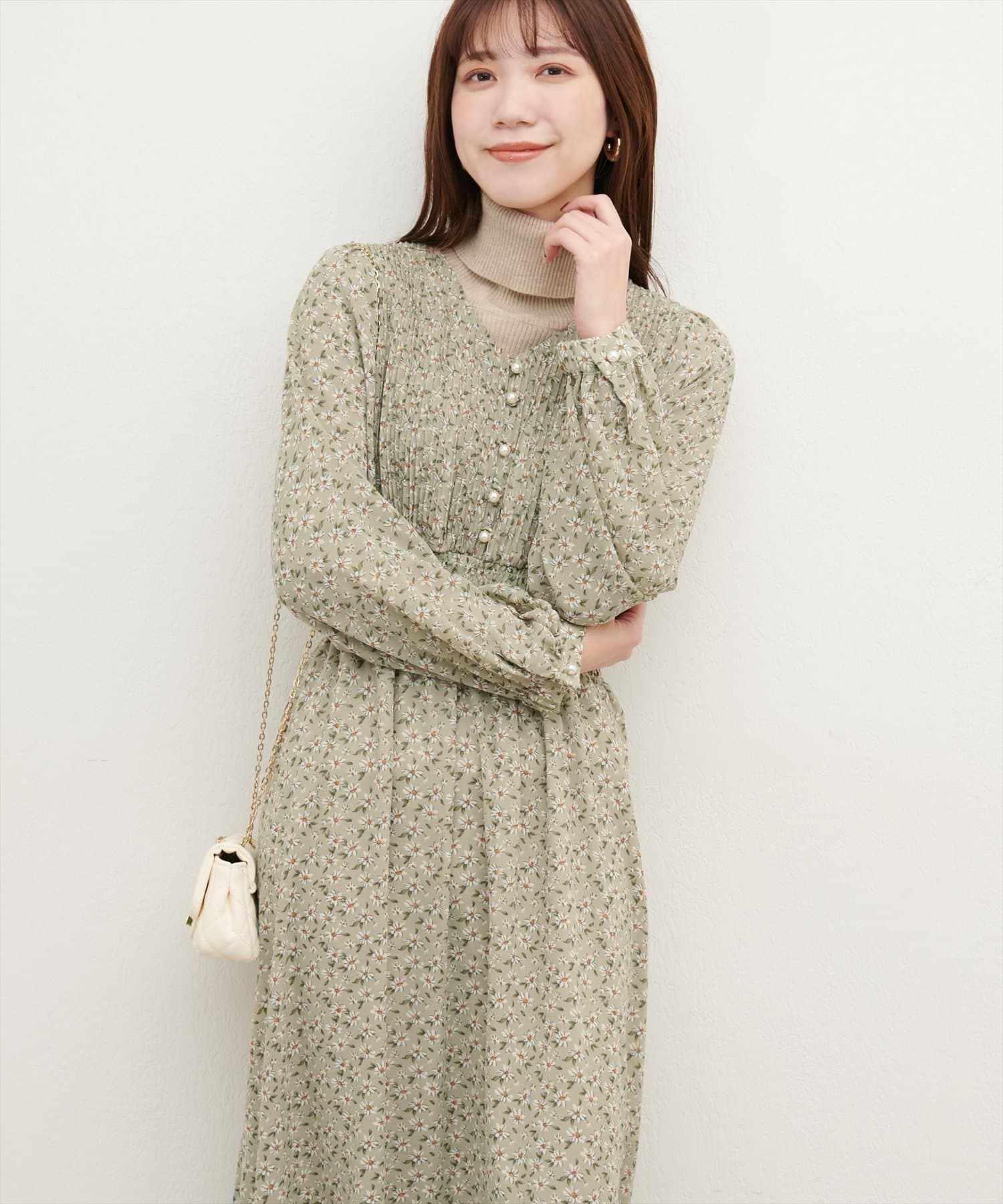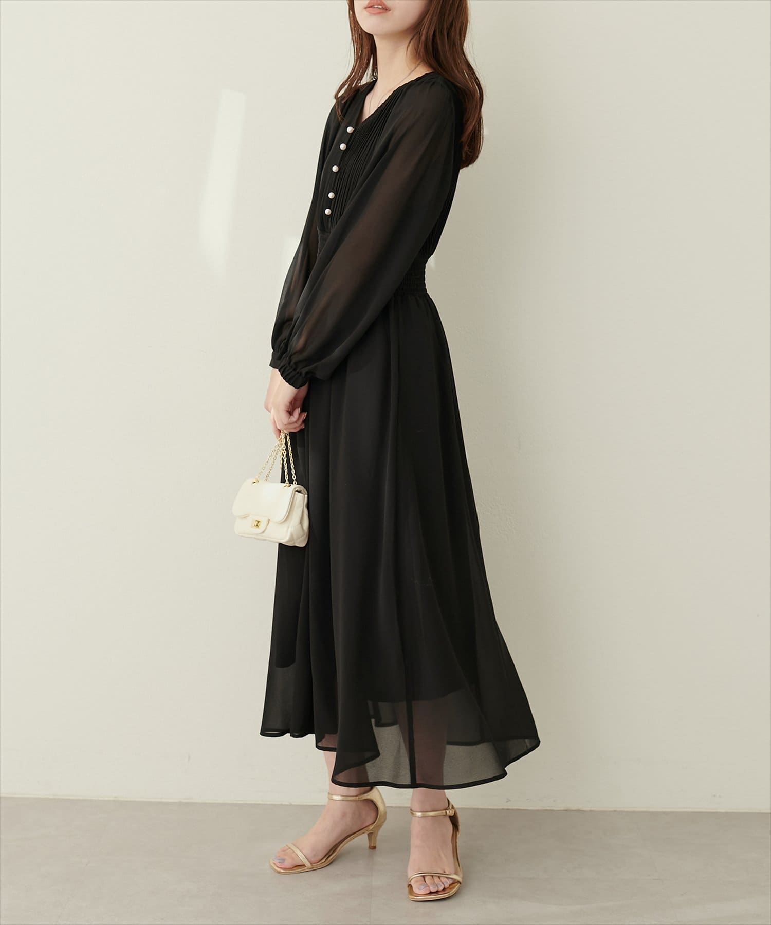 パール釦をあしらった女性らしいデザインのワンピースです。