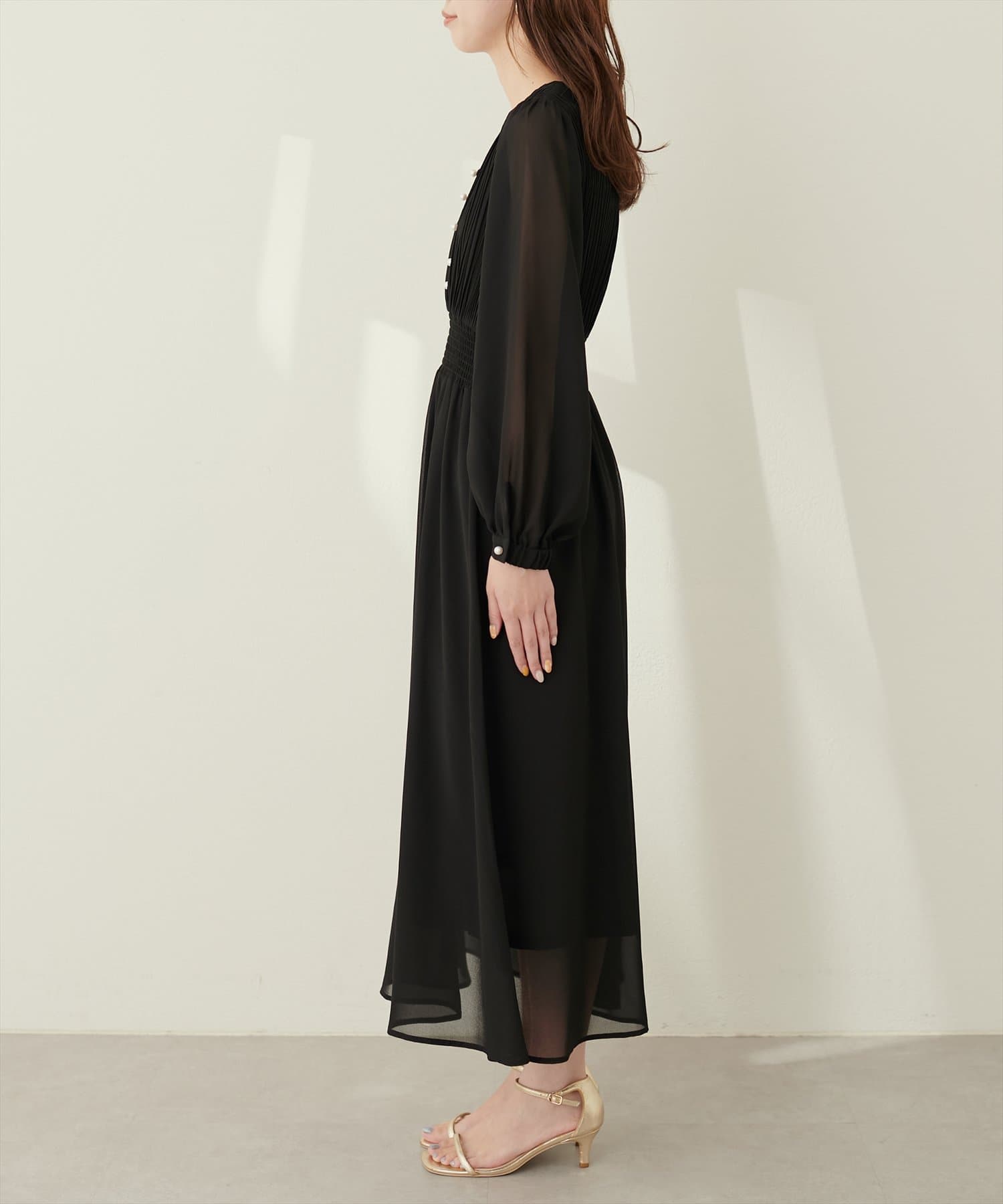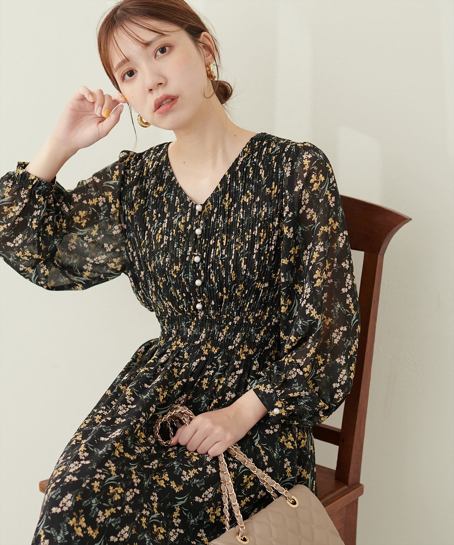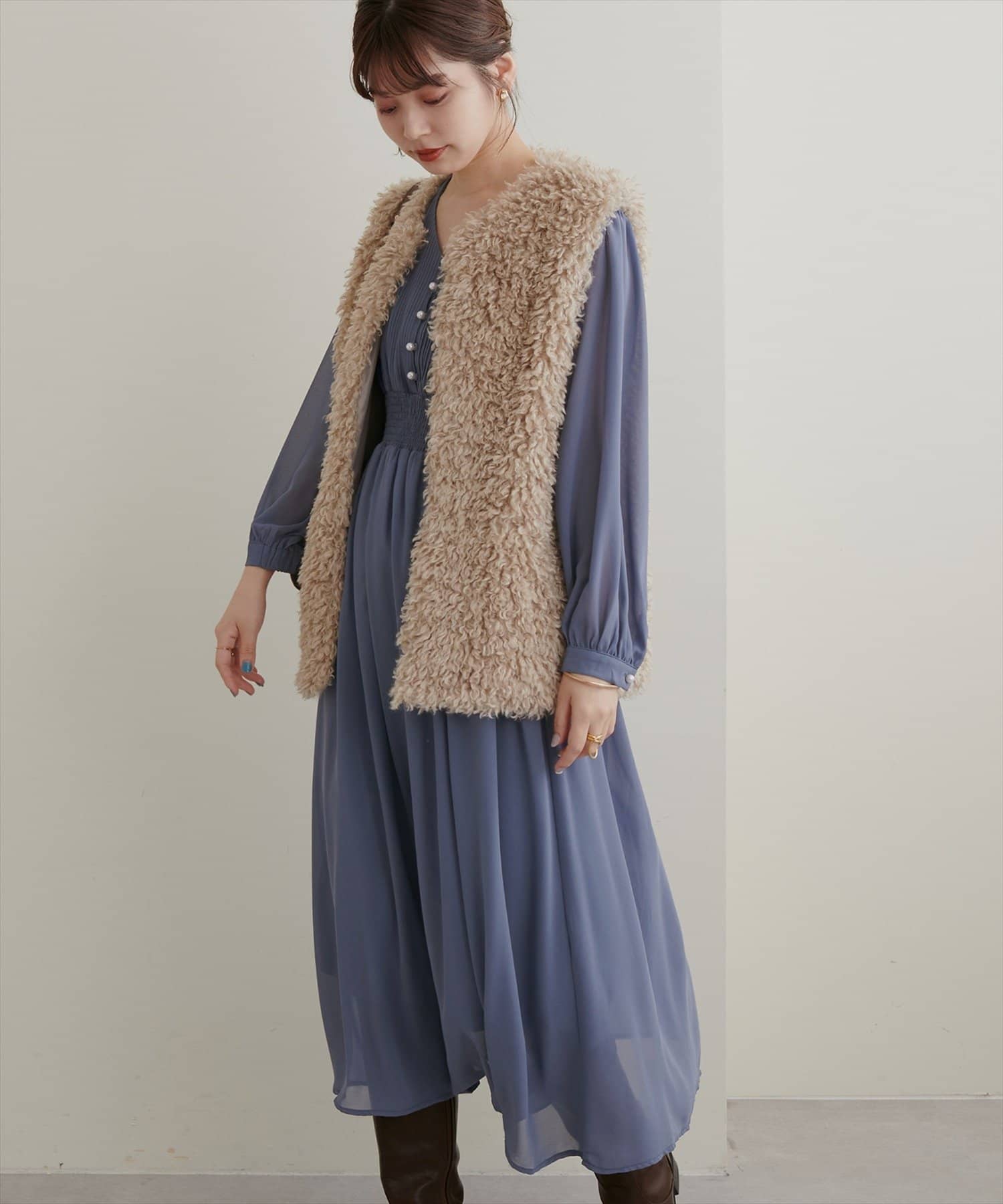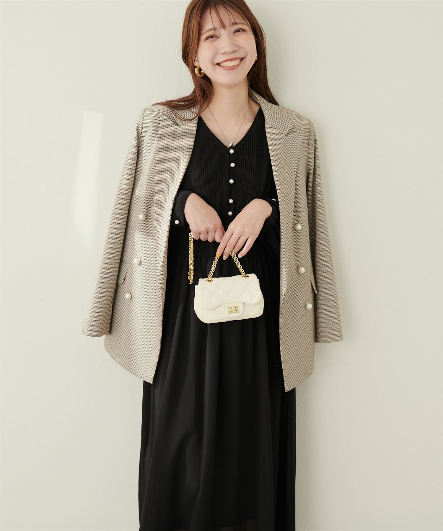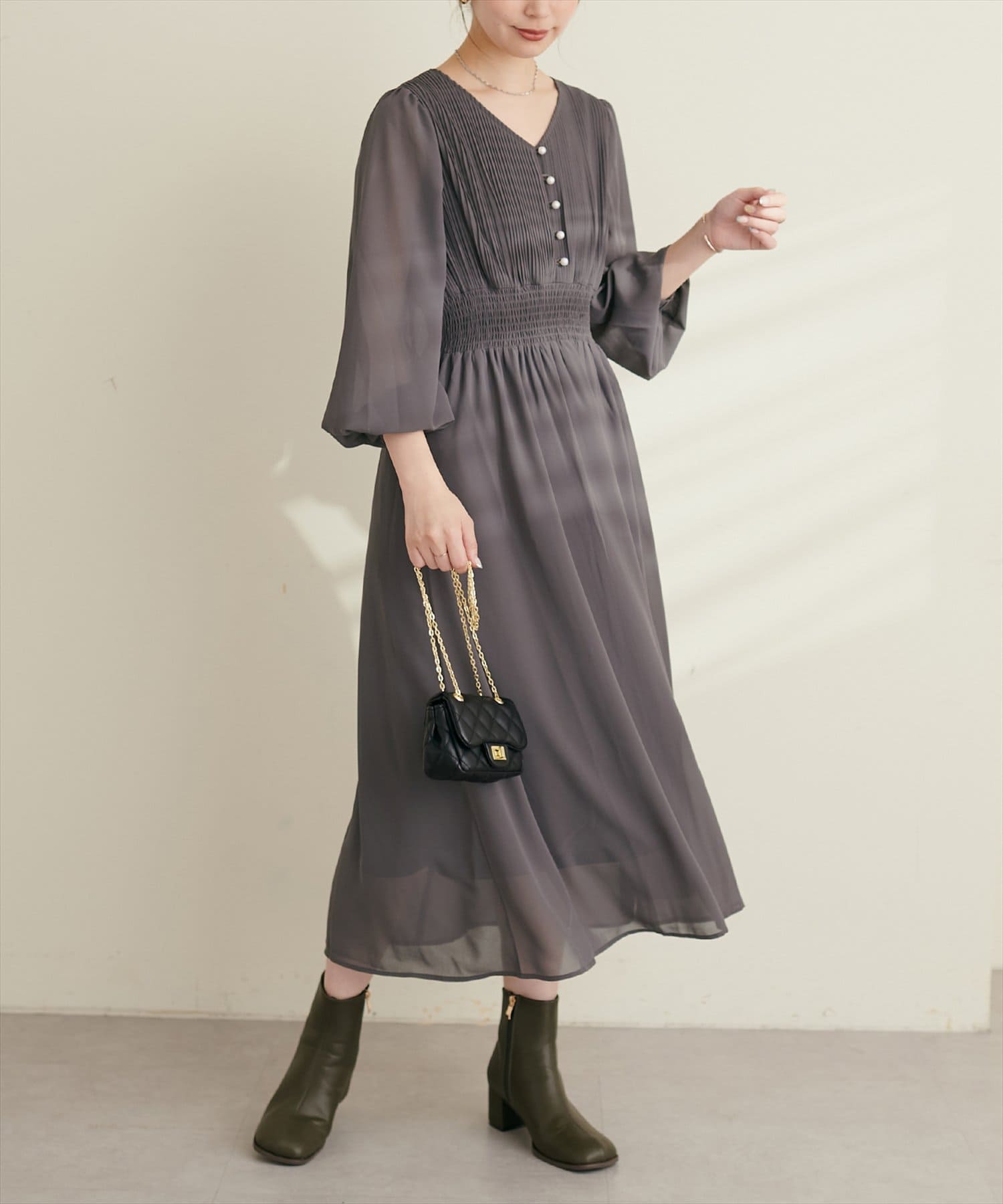 パール釦をあしらった女性らしいデザインのワンピースです。
