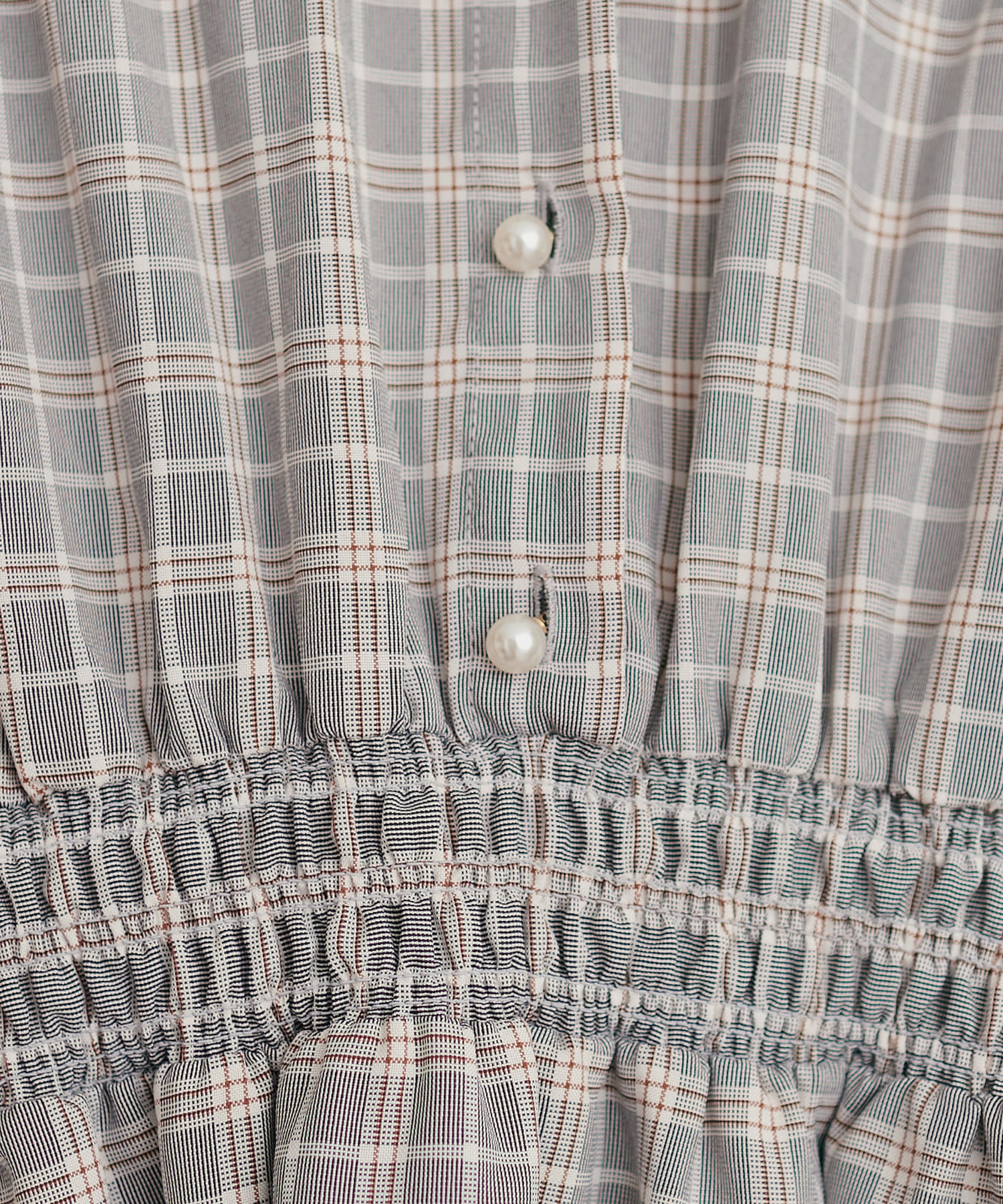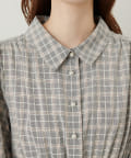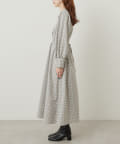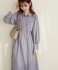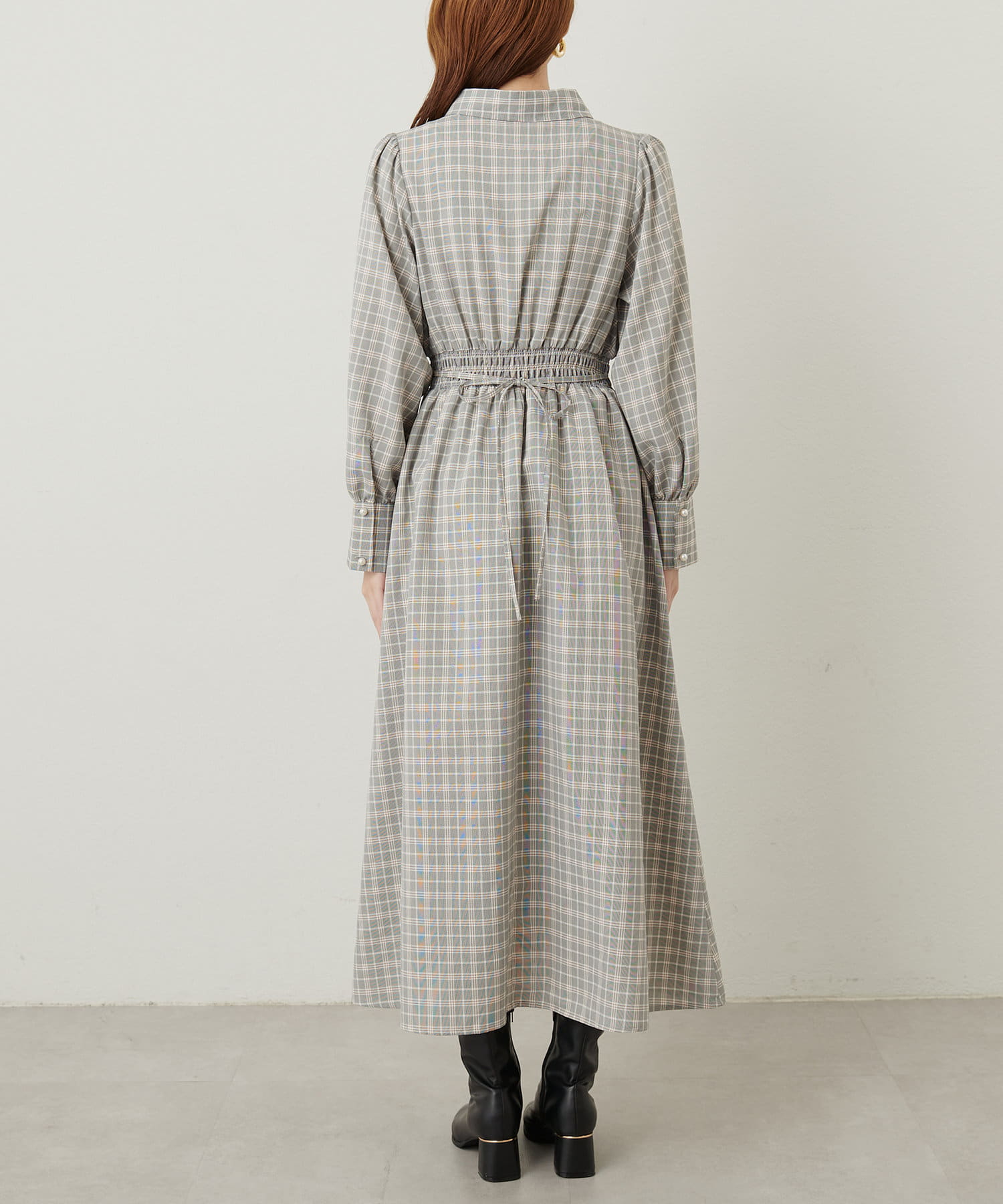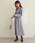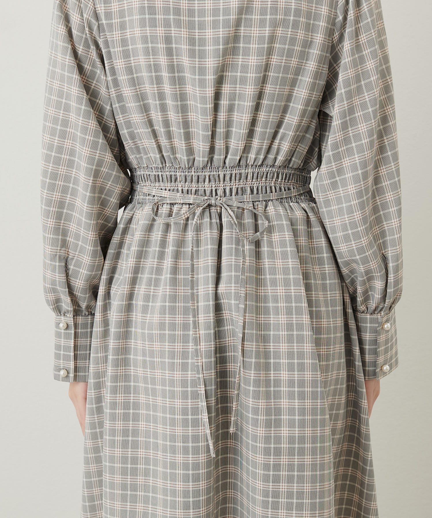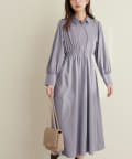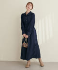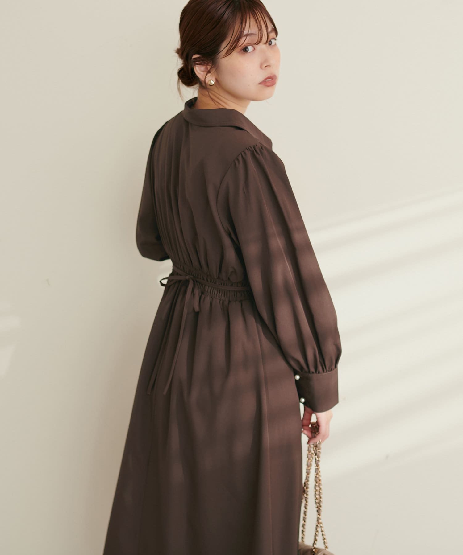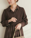 シンプルなシャツワンピースにパール釦とウエストシャーリングのアクセントをプラス。