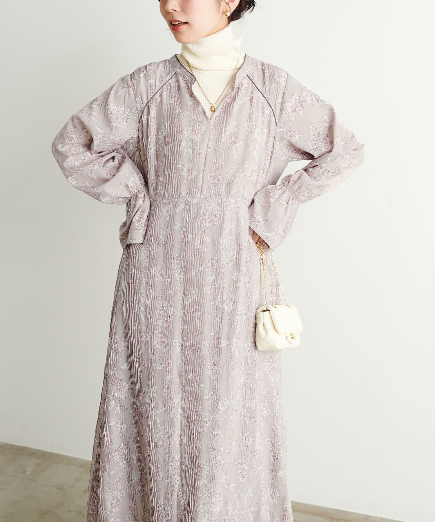 上品なフラワーモチーフが華やかで、ぐっとドレッシーな雰囲気に。