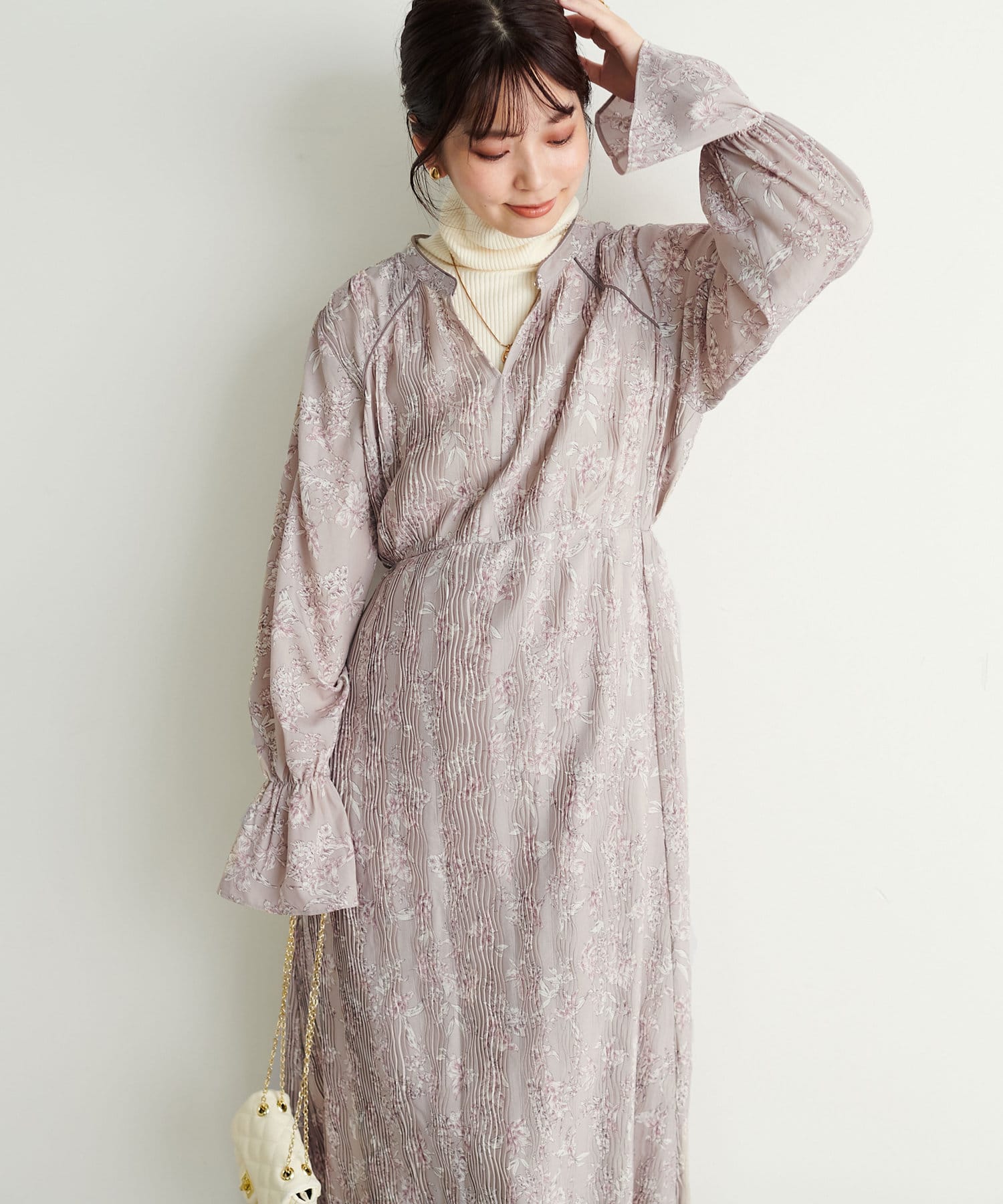 流れるような変形プリーツが印象的な大人レディワンピース。