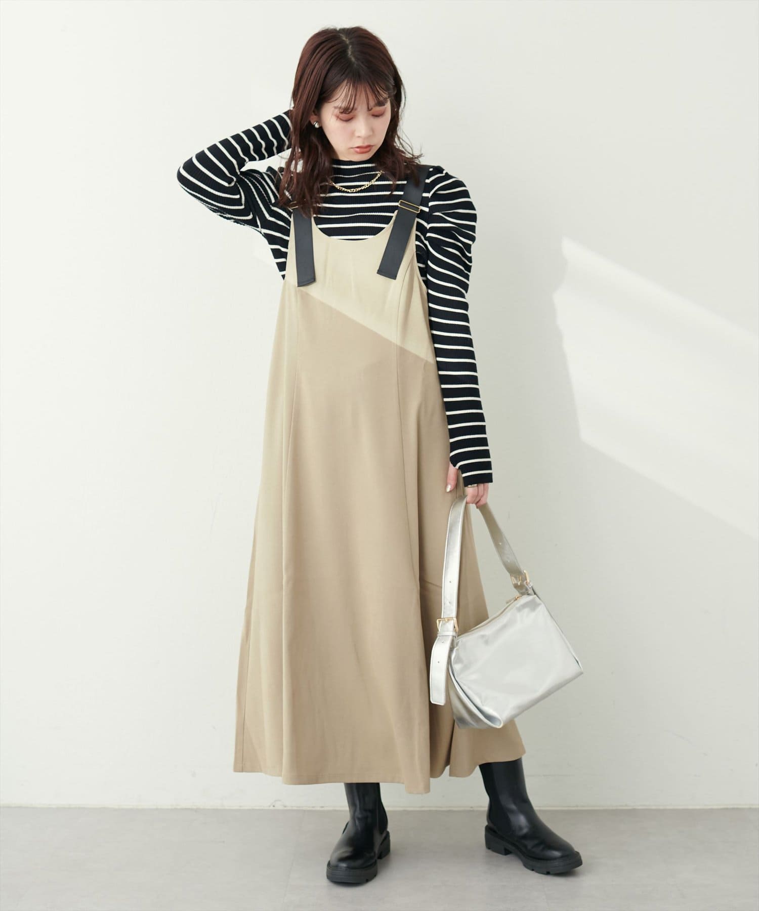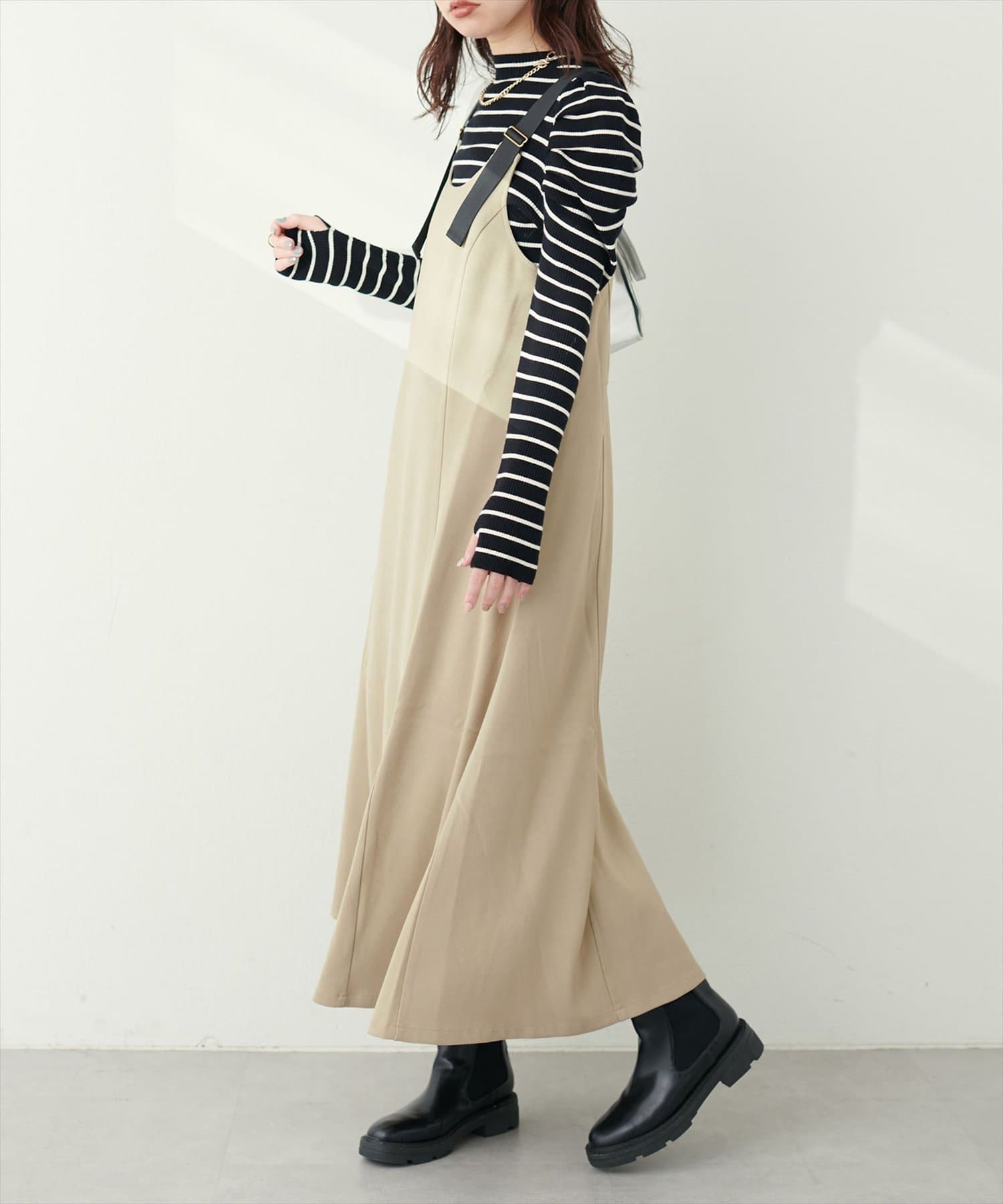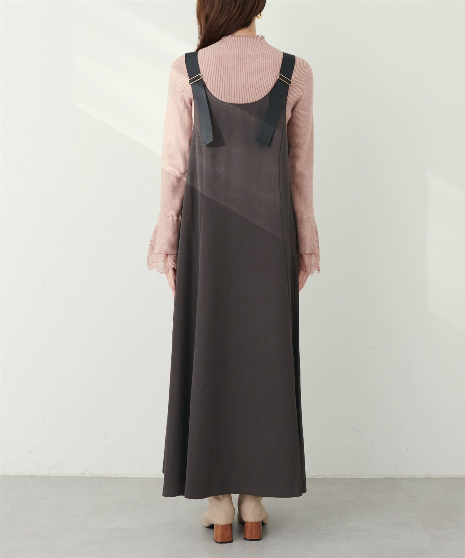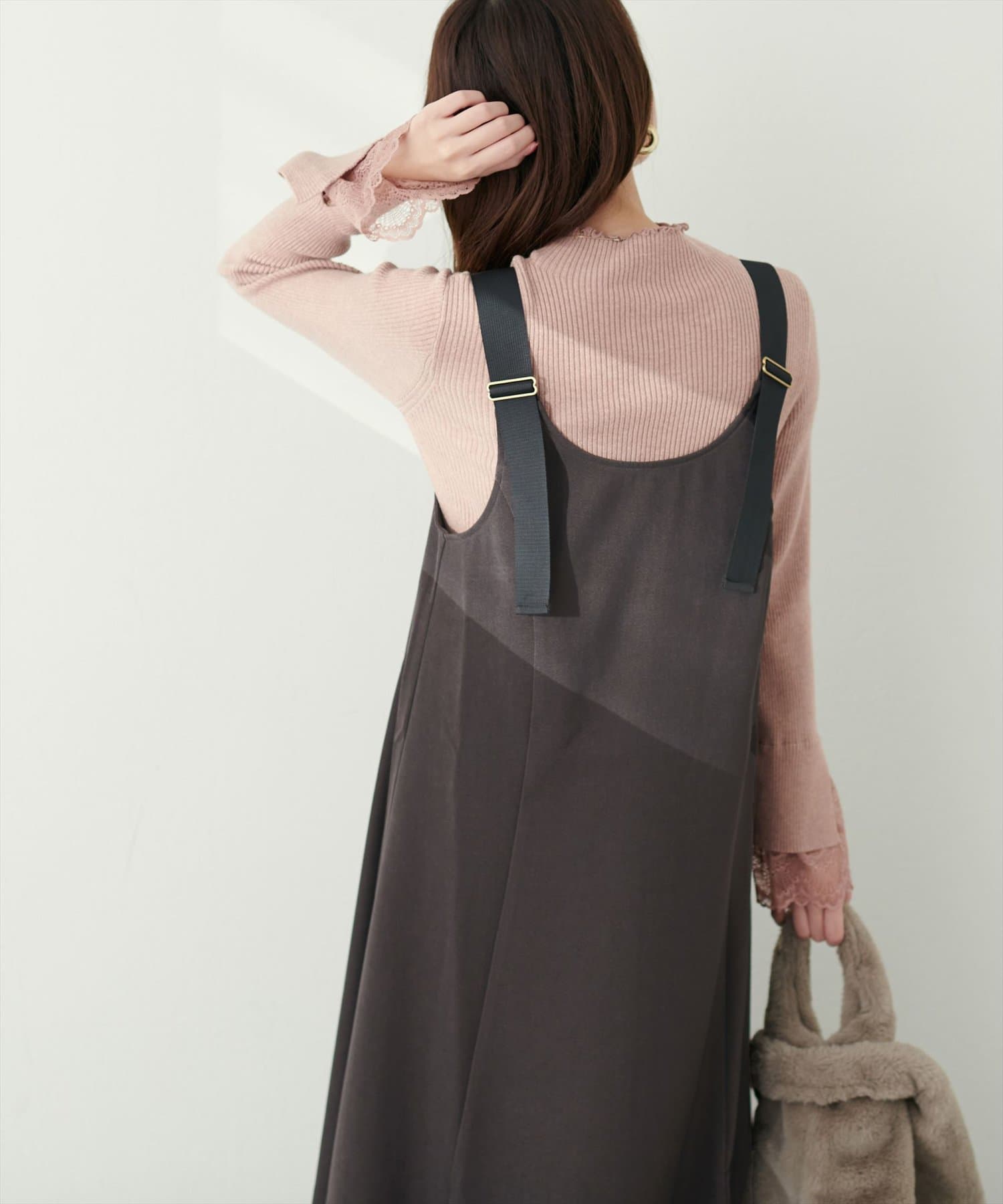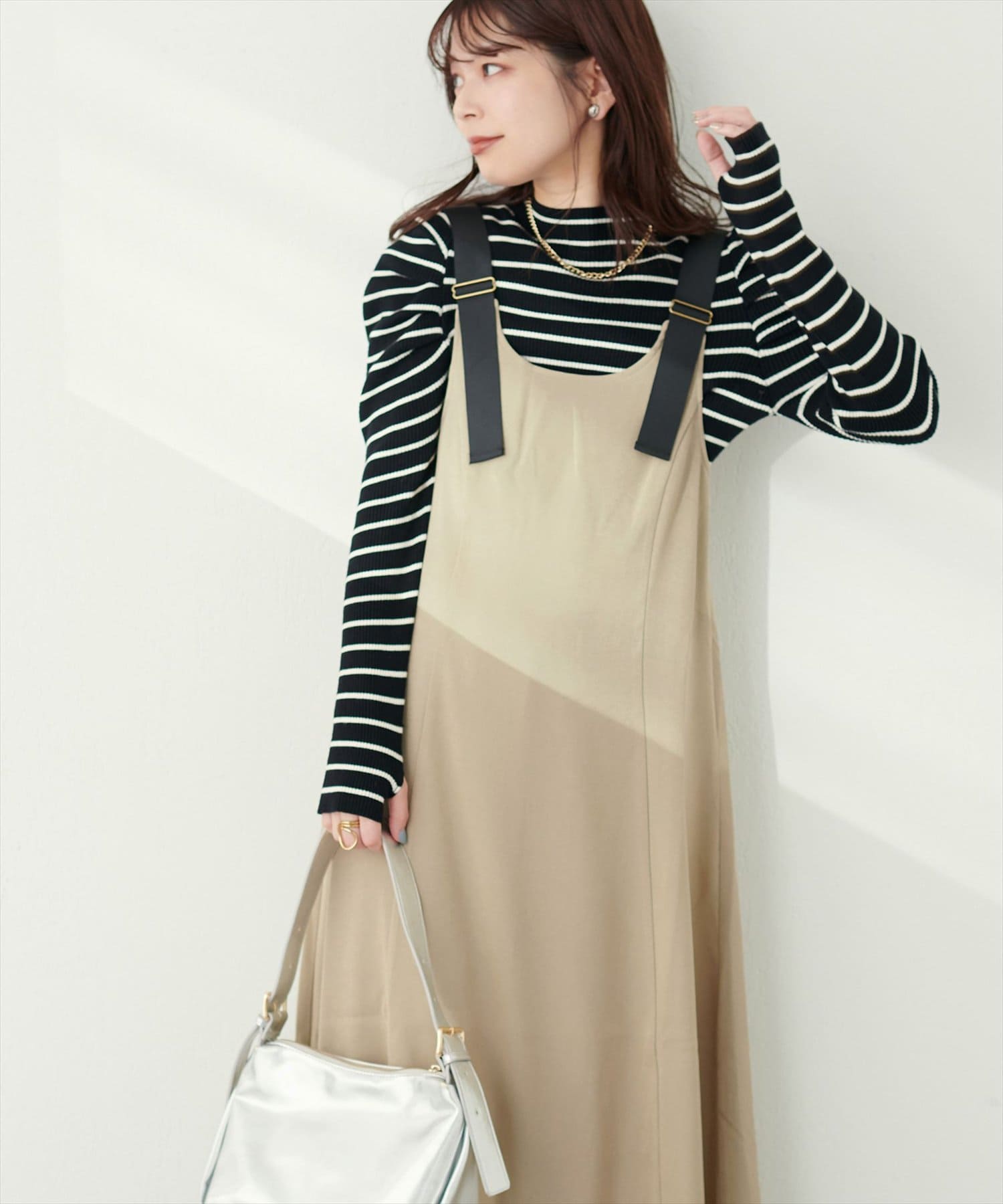 さらっとした軽めの素材とショルダーベルトでカジュアルみえするジャンスカ。