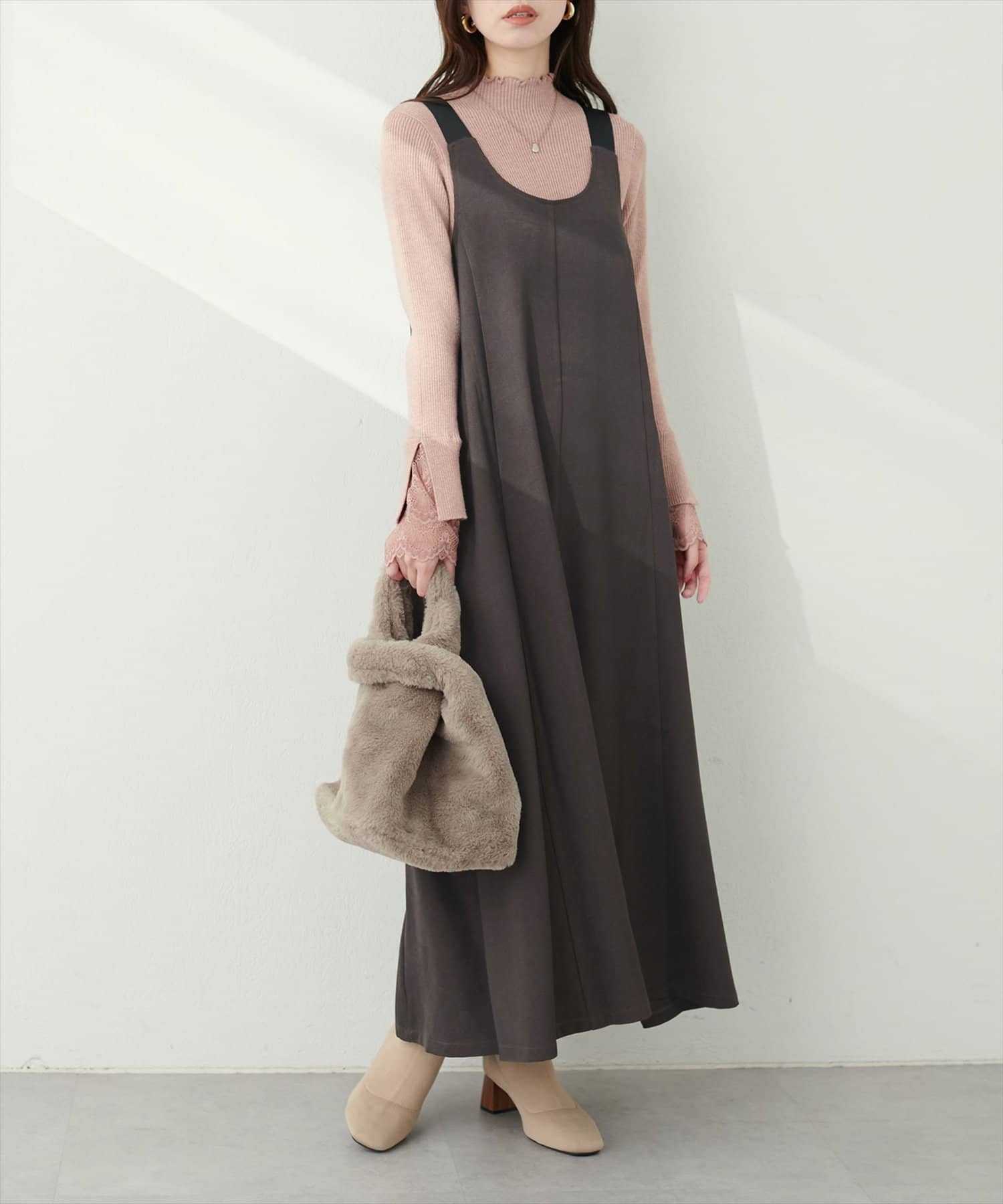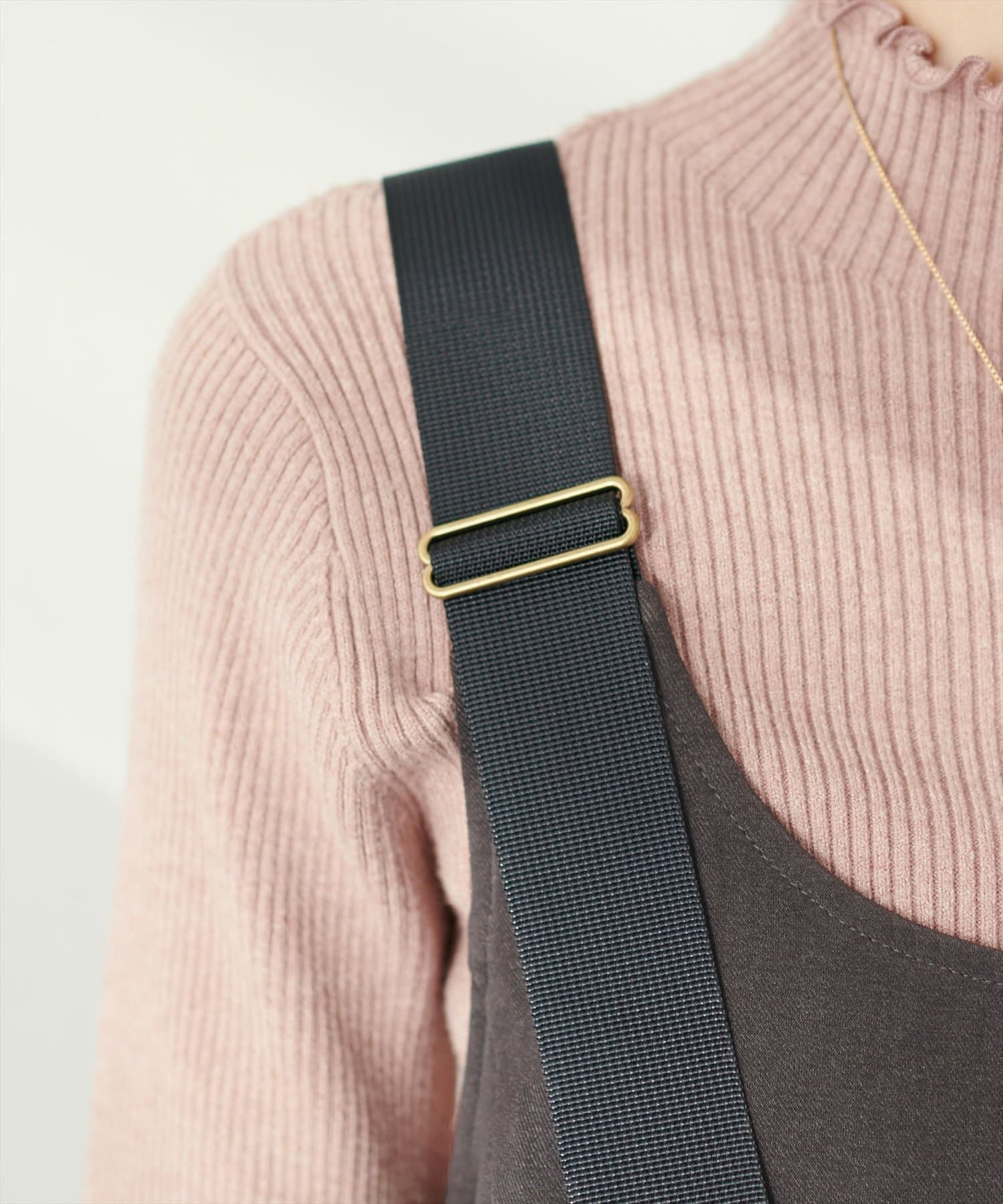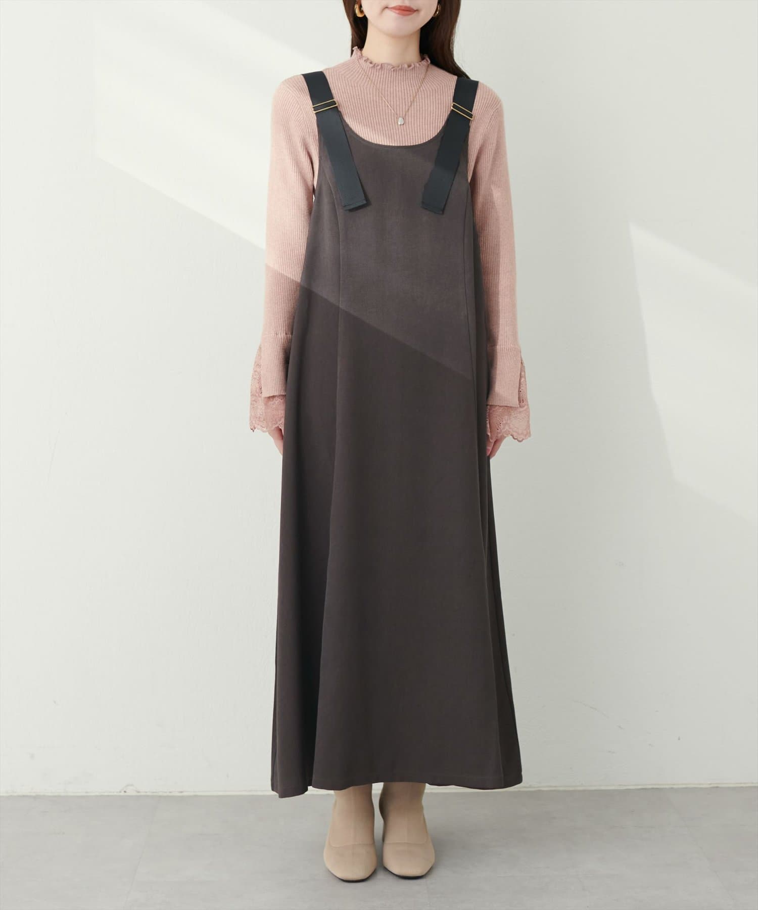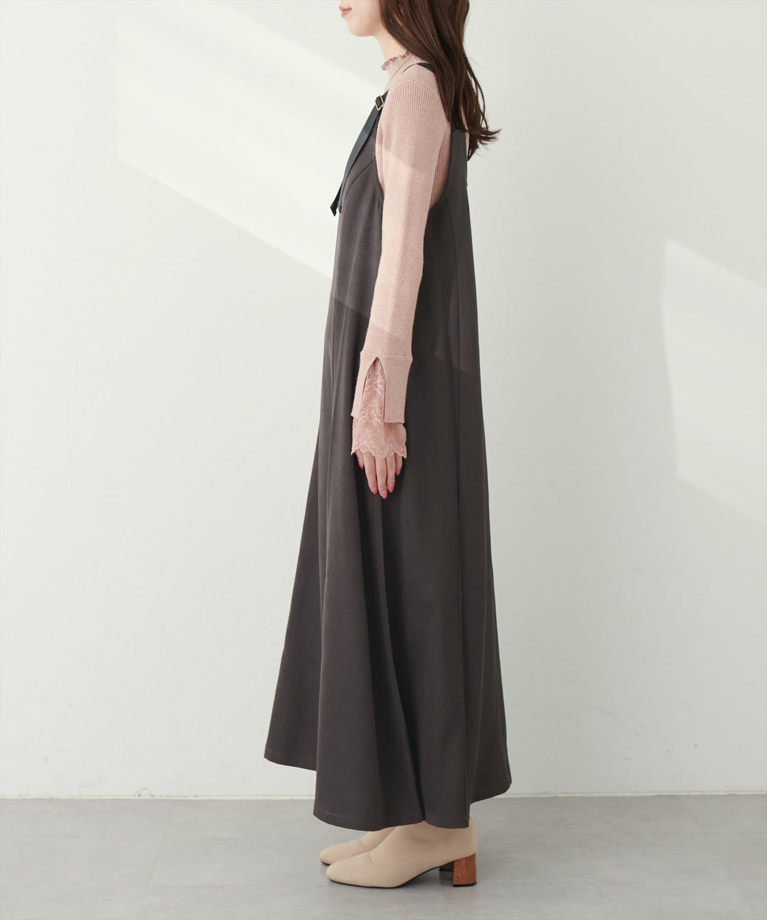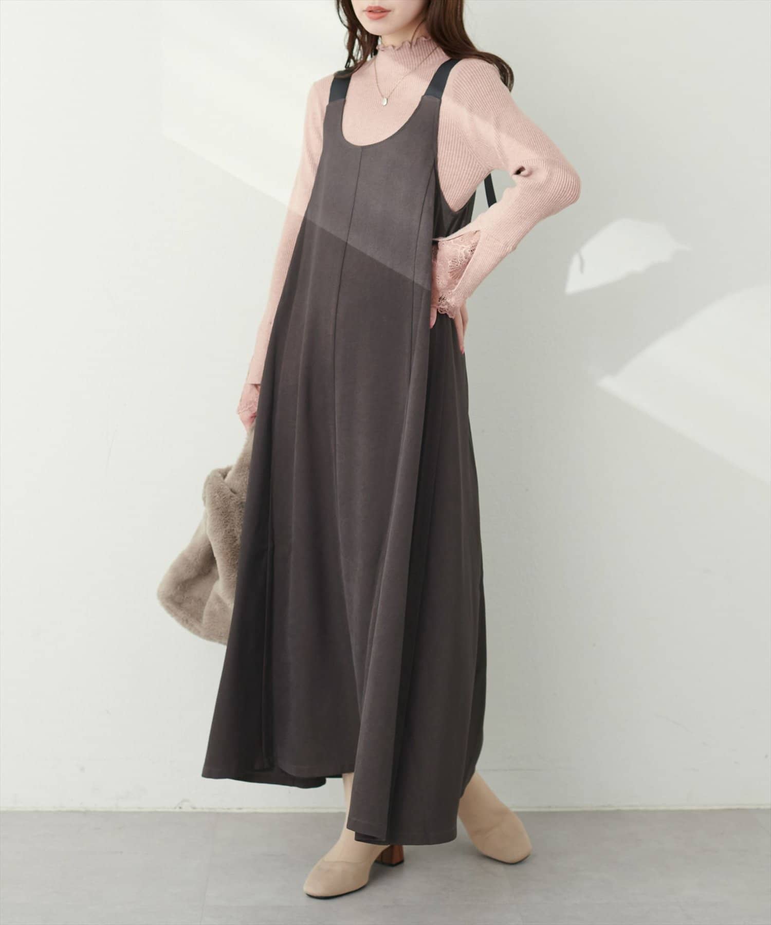 さらっとした軽めの素材とショルダーベルトでカジュアルみえするジャンスカ。