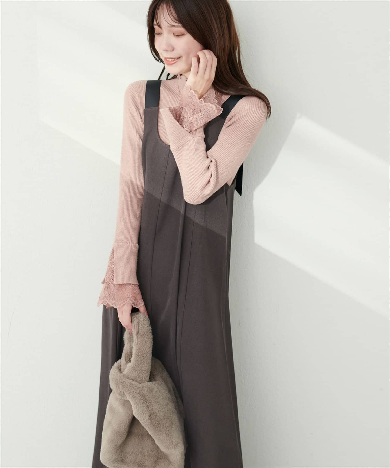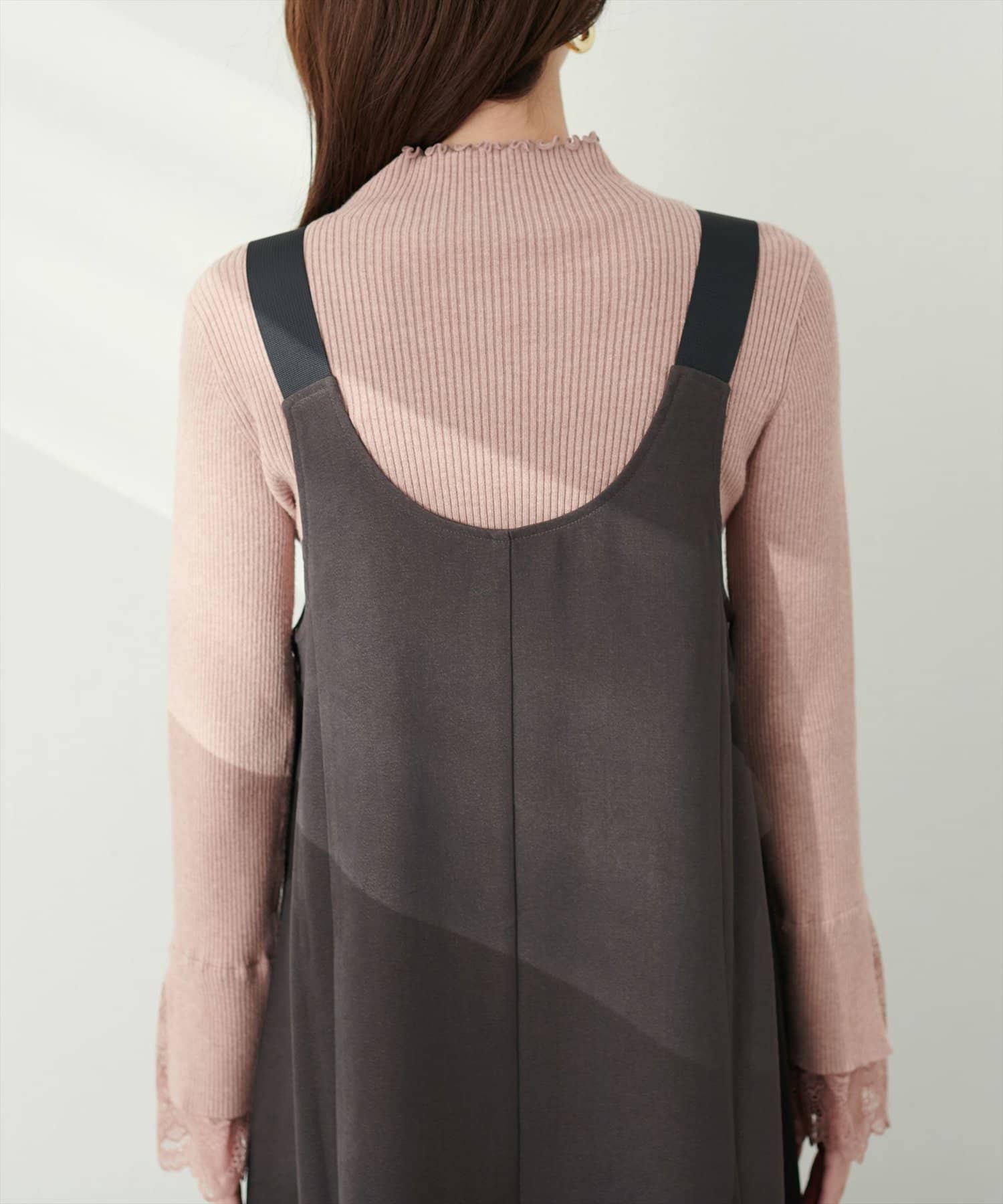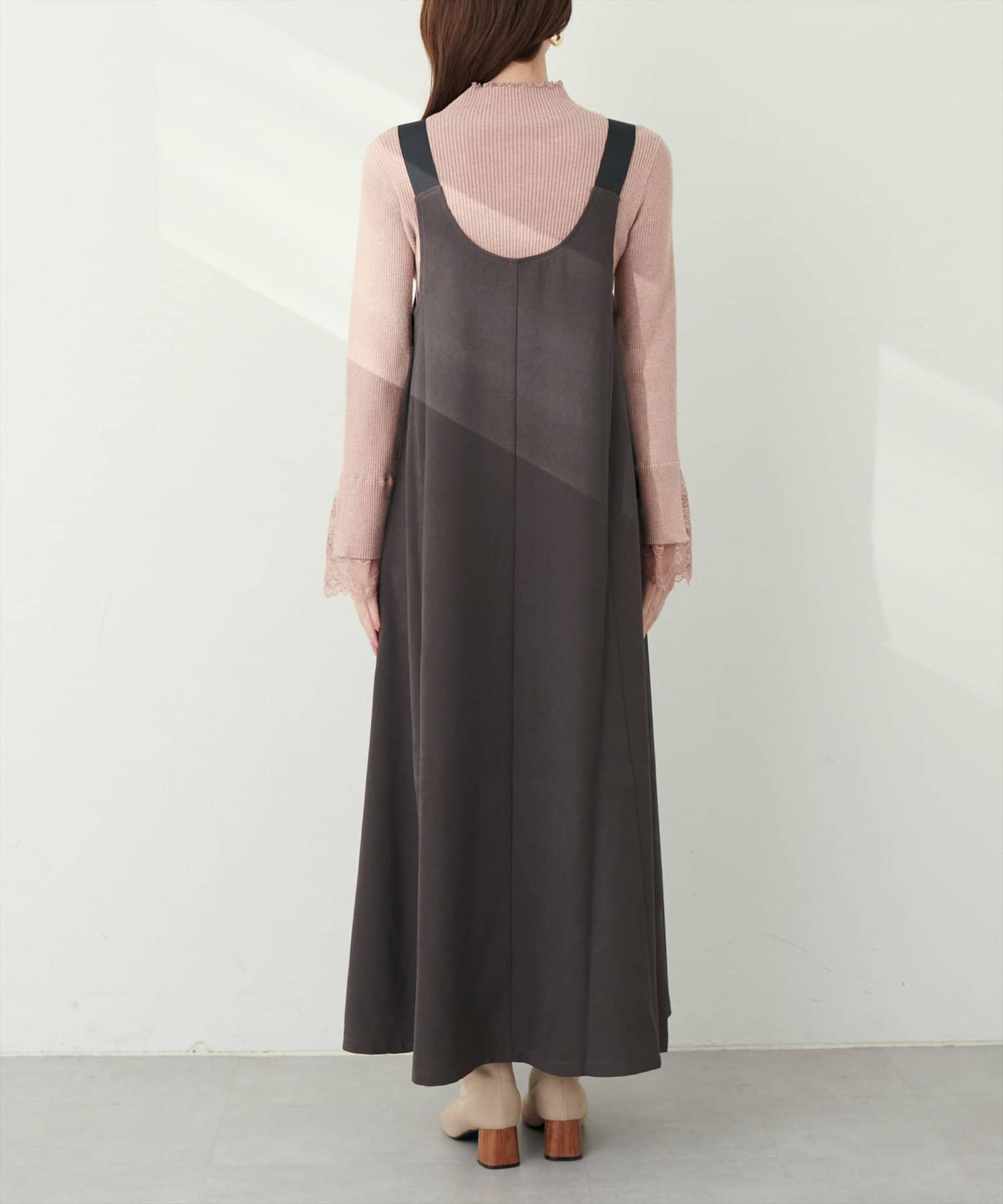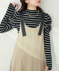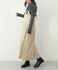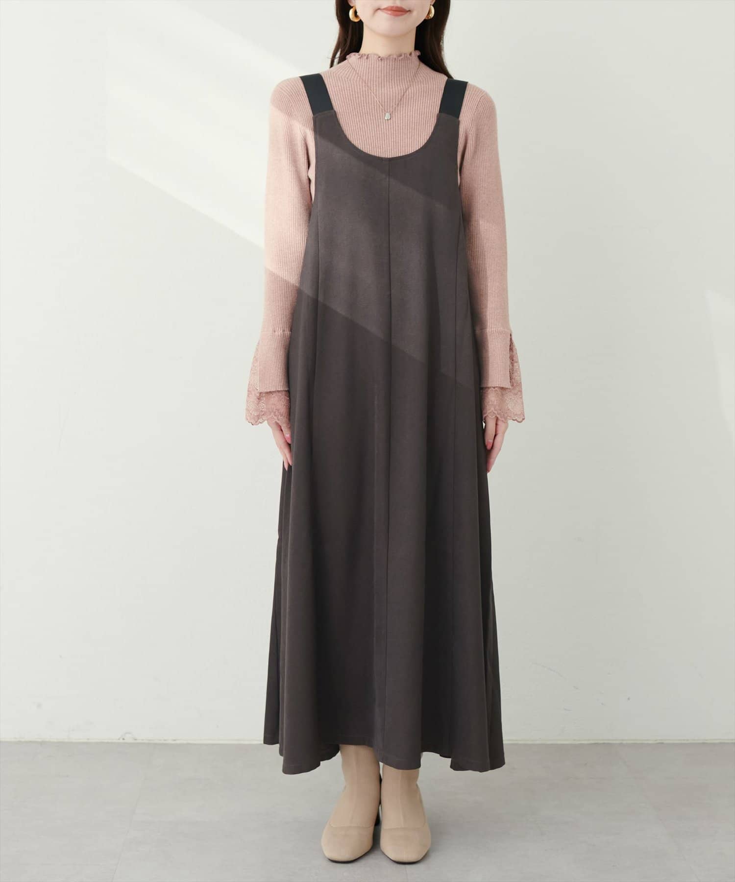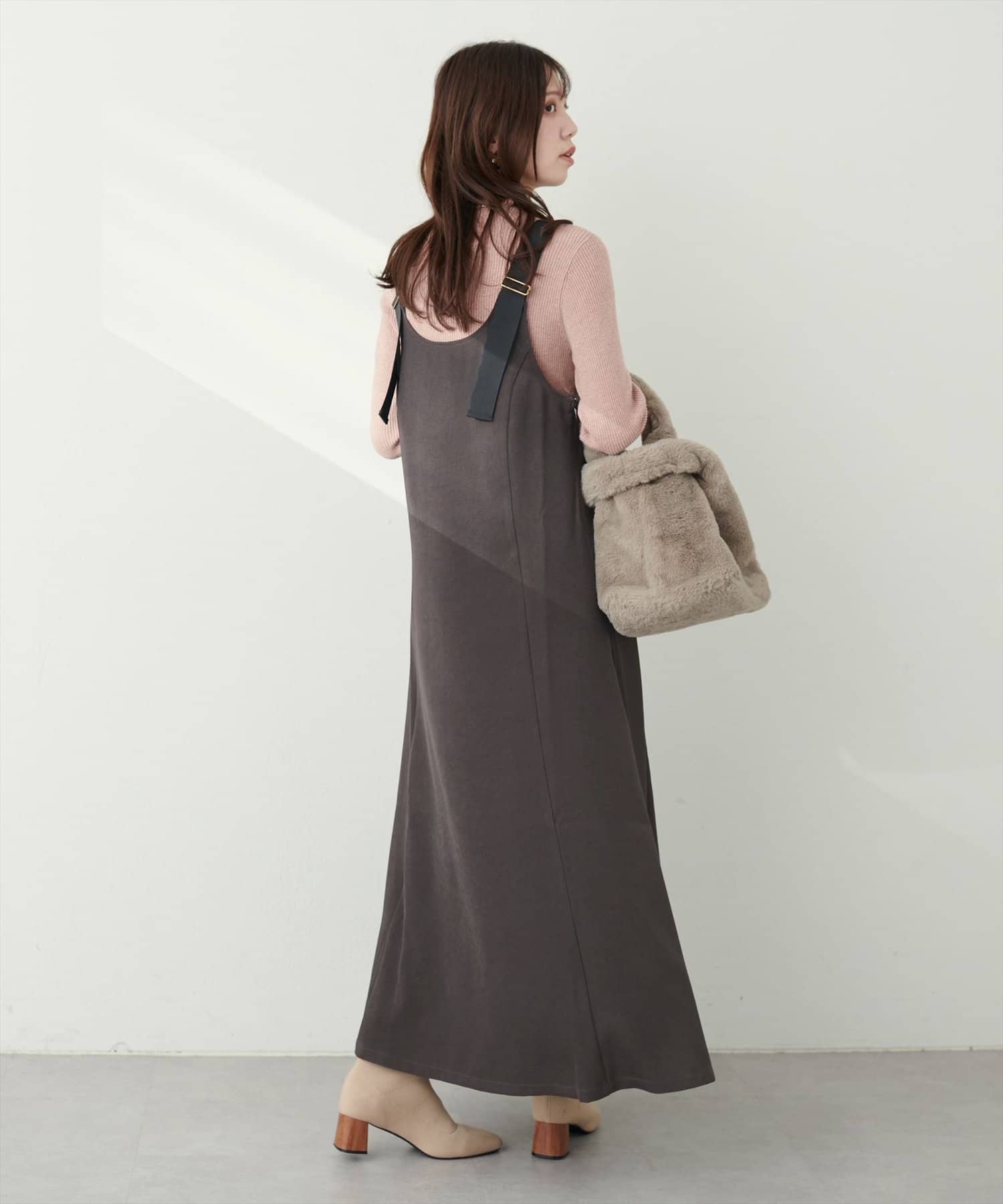 さらっとした軽めの素材とショルダーベルトでカジュアルみえするジャンスカ。