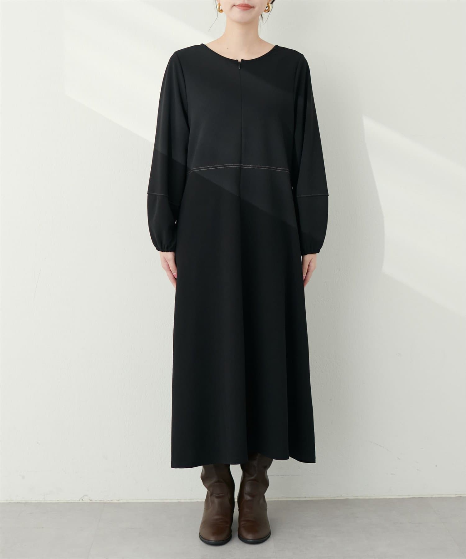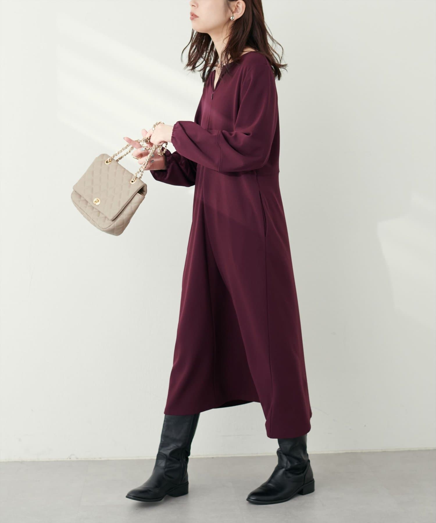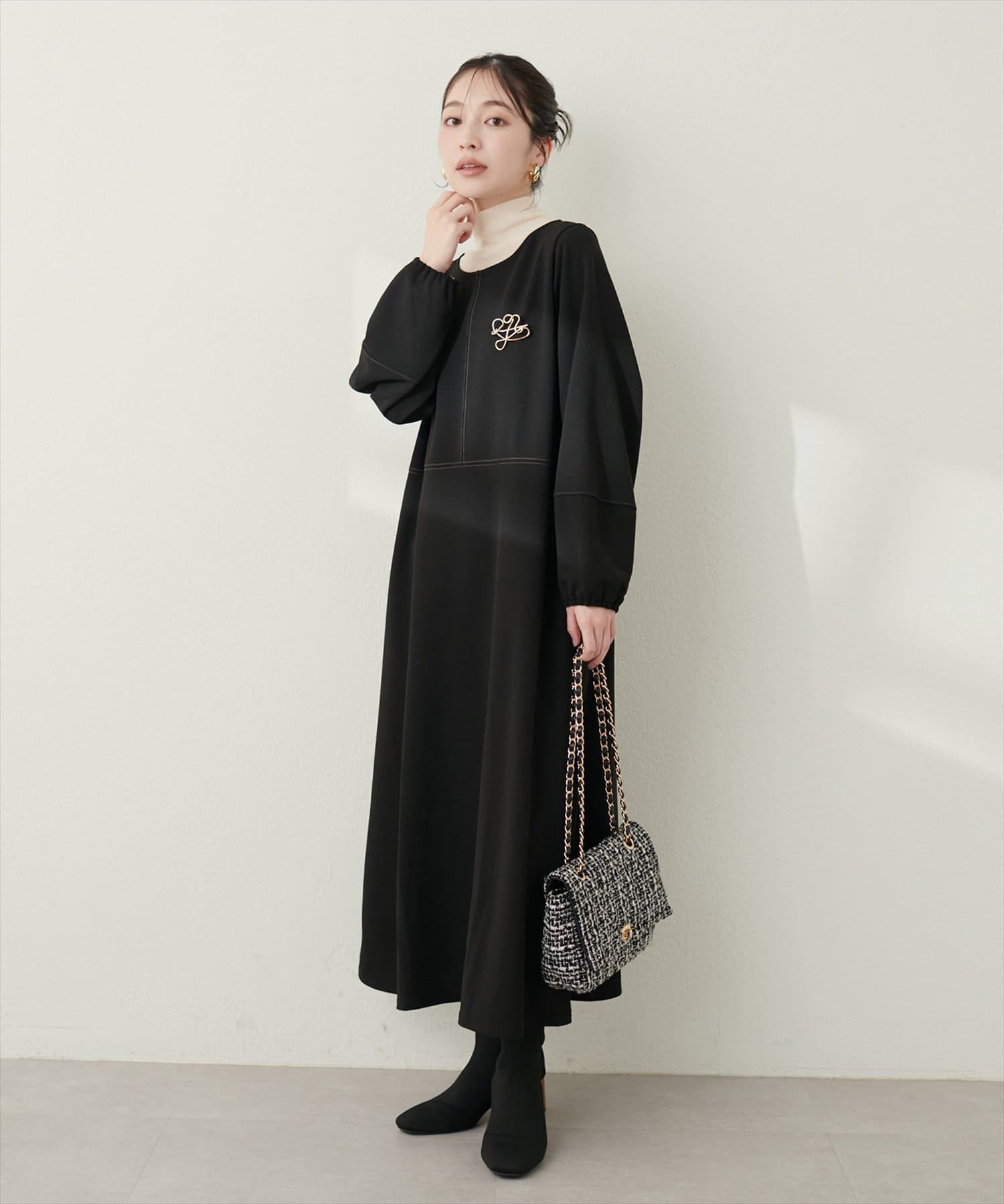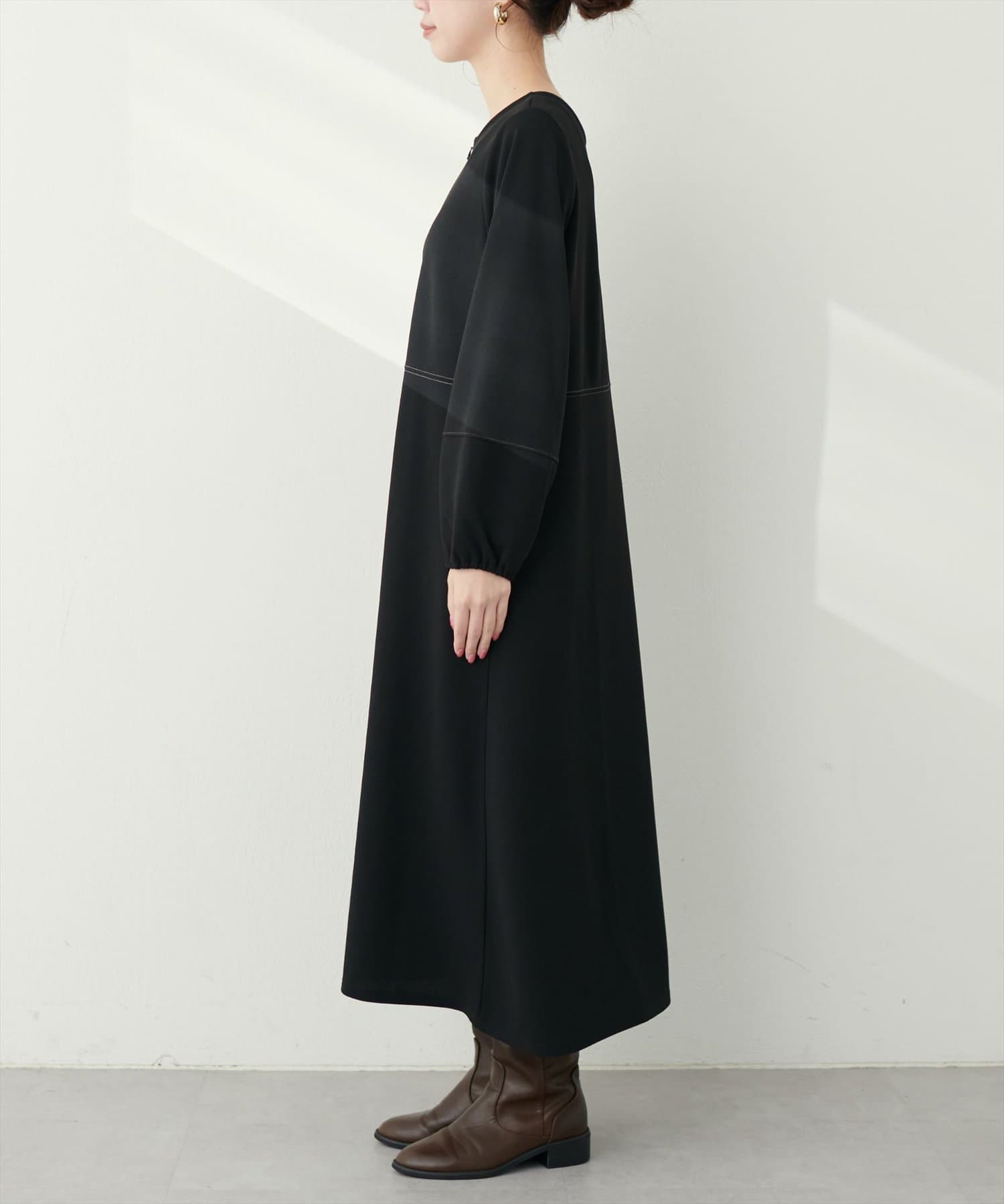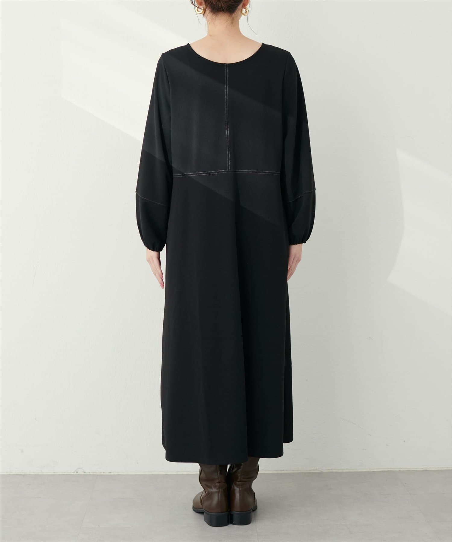 手元を華奢に見せてくれるランタンスリーブが目を惹く、mamamoシリーズの新作ワンピース。