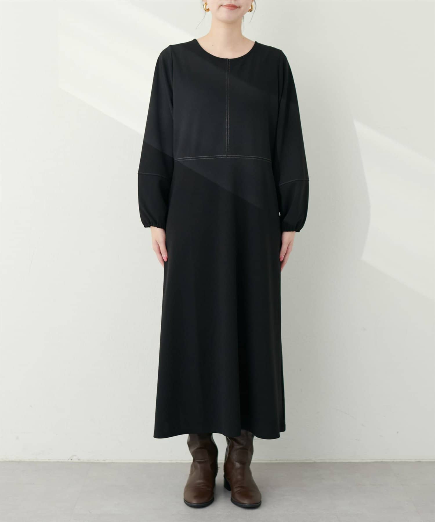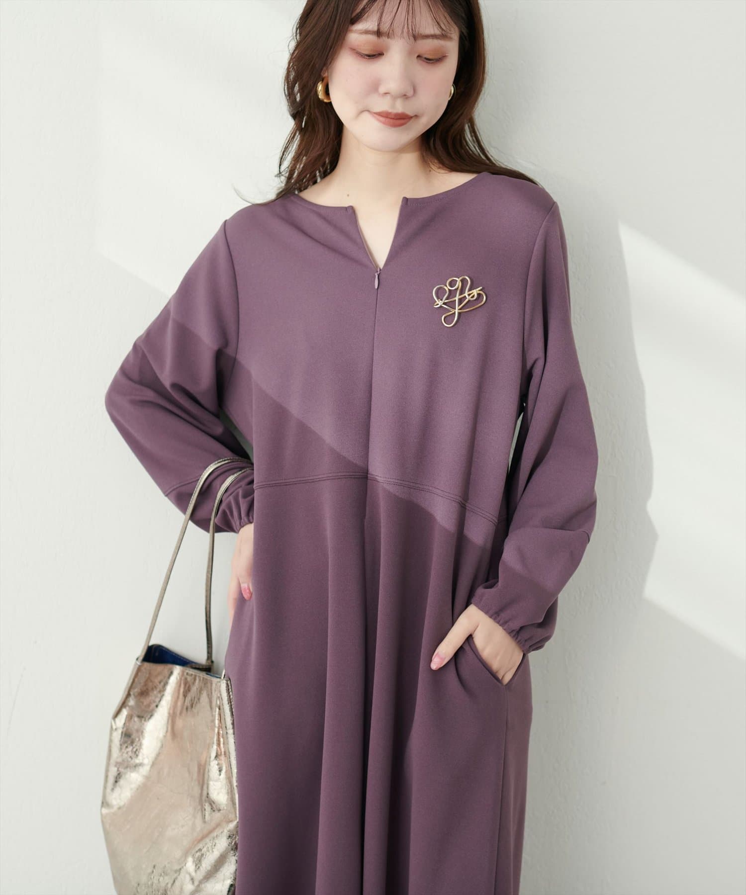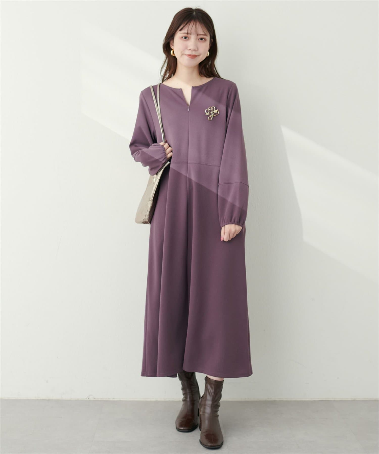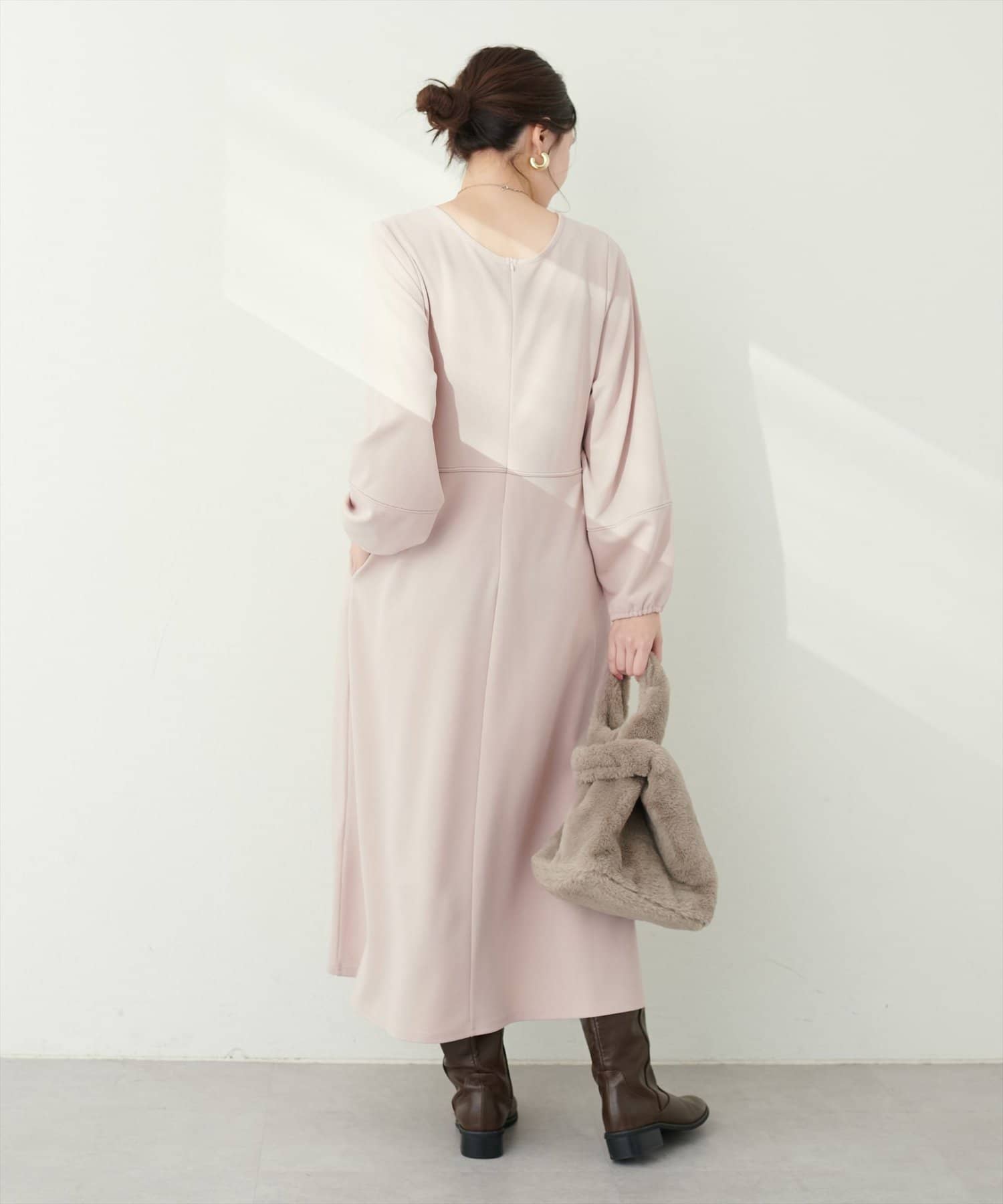 手元を華奢に見せてくれるランタンスリーブが目を惹く、mamamoシリーズの新作ワンピース。