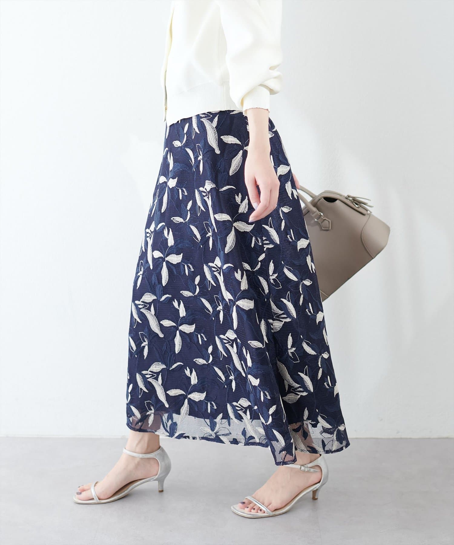 ややハリのあるメッシュ生地にフラワー刺繡を施し、女性らしさとトレンド感を併せ持ったデザインのレーススカート。