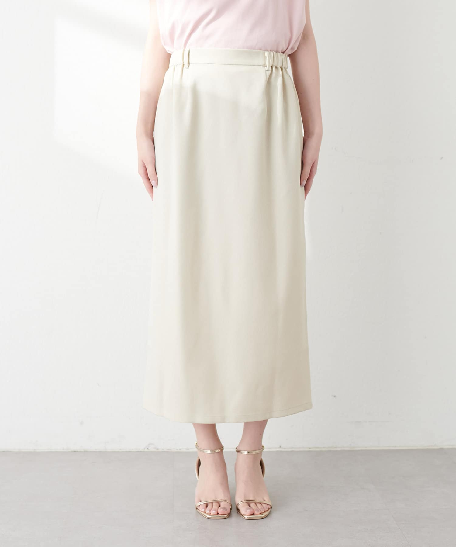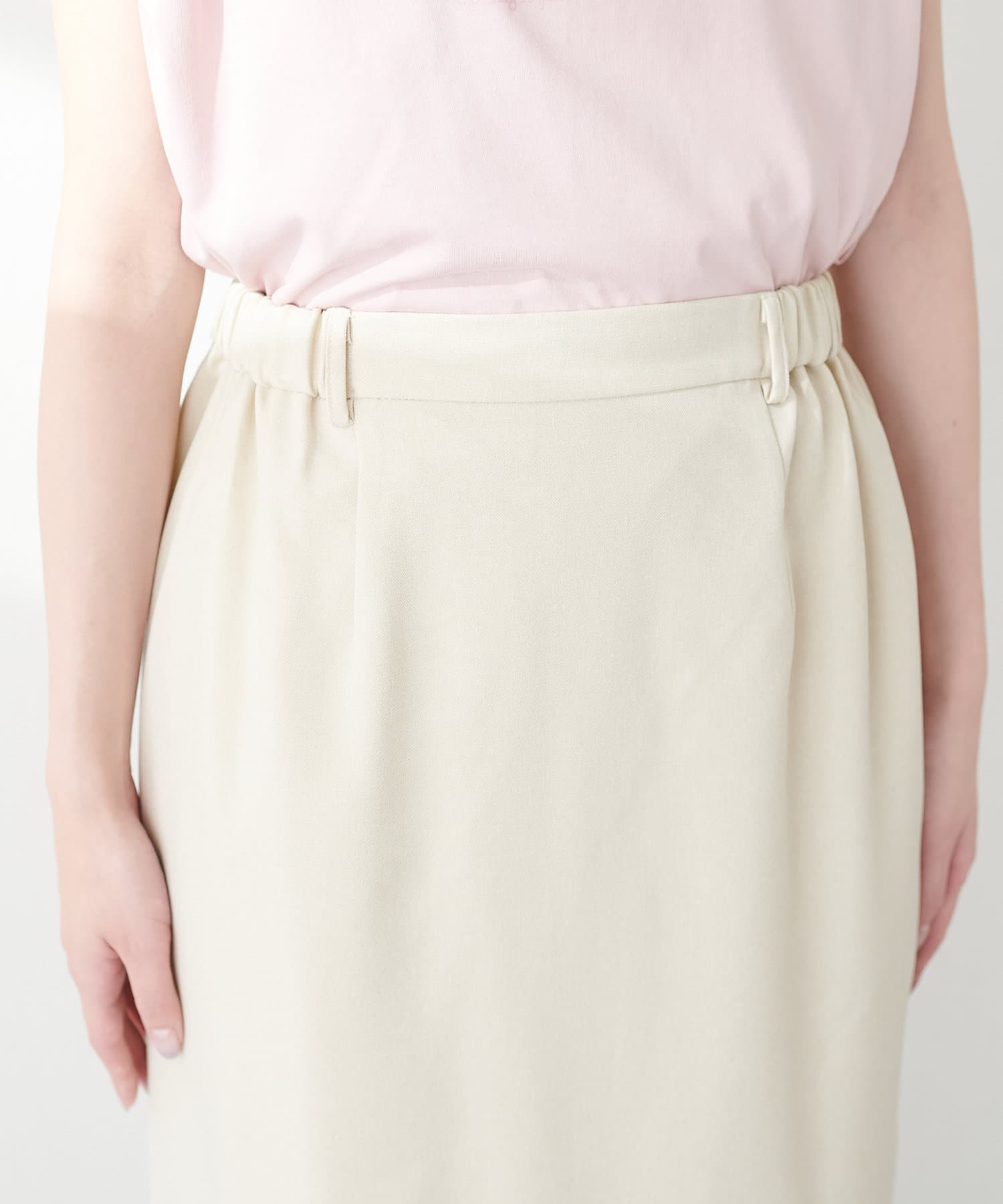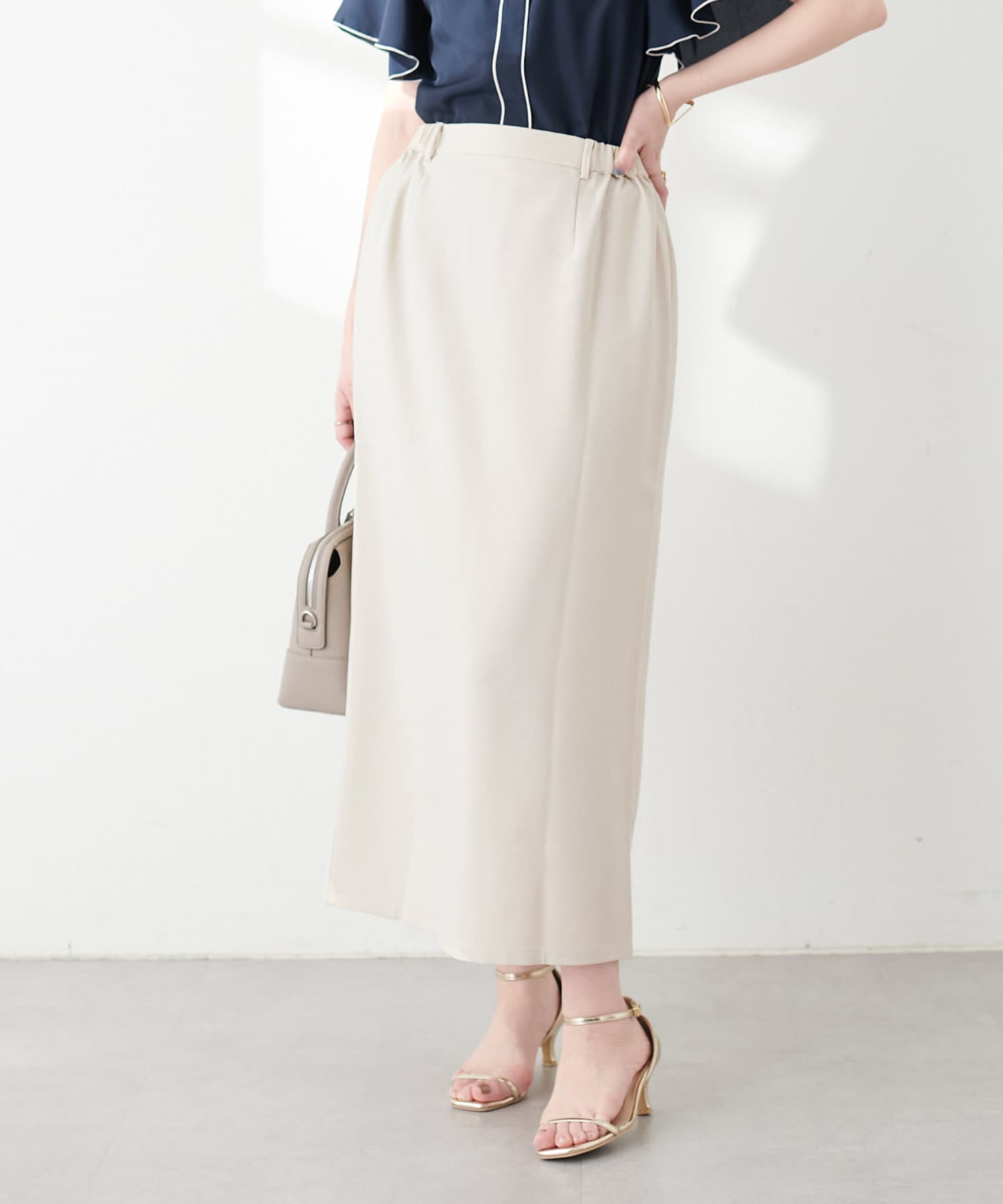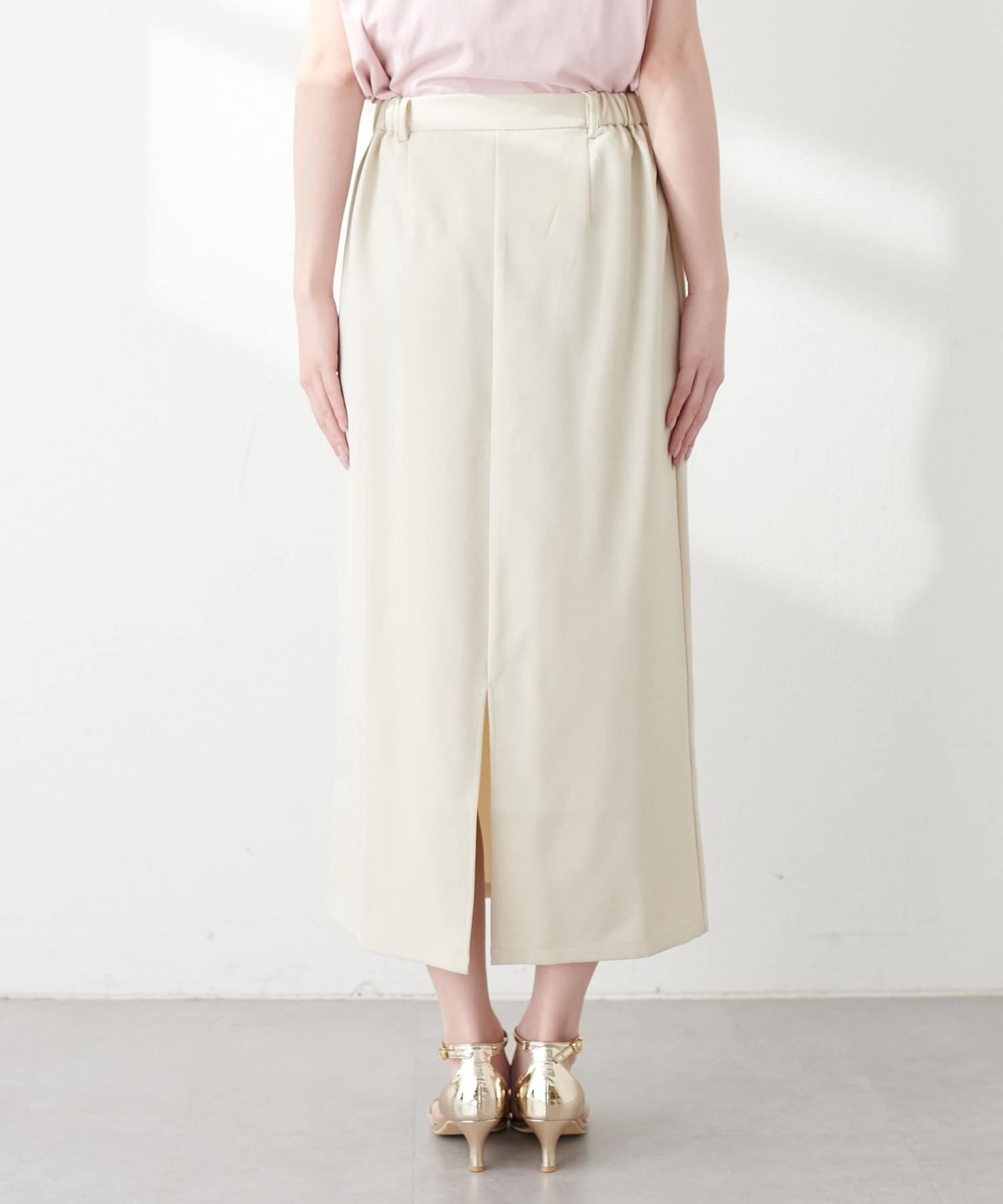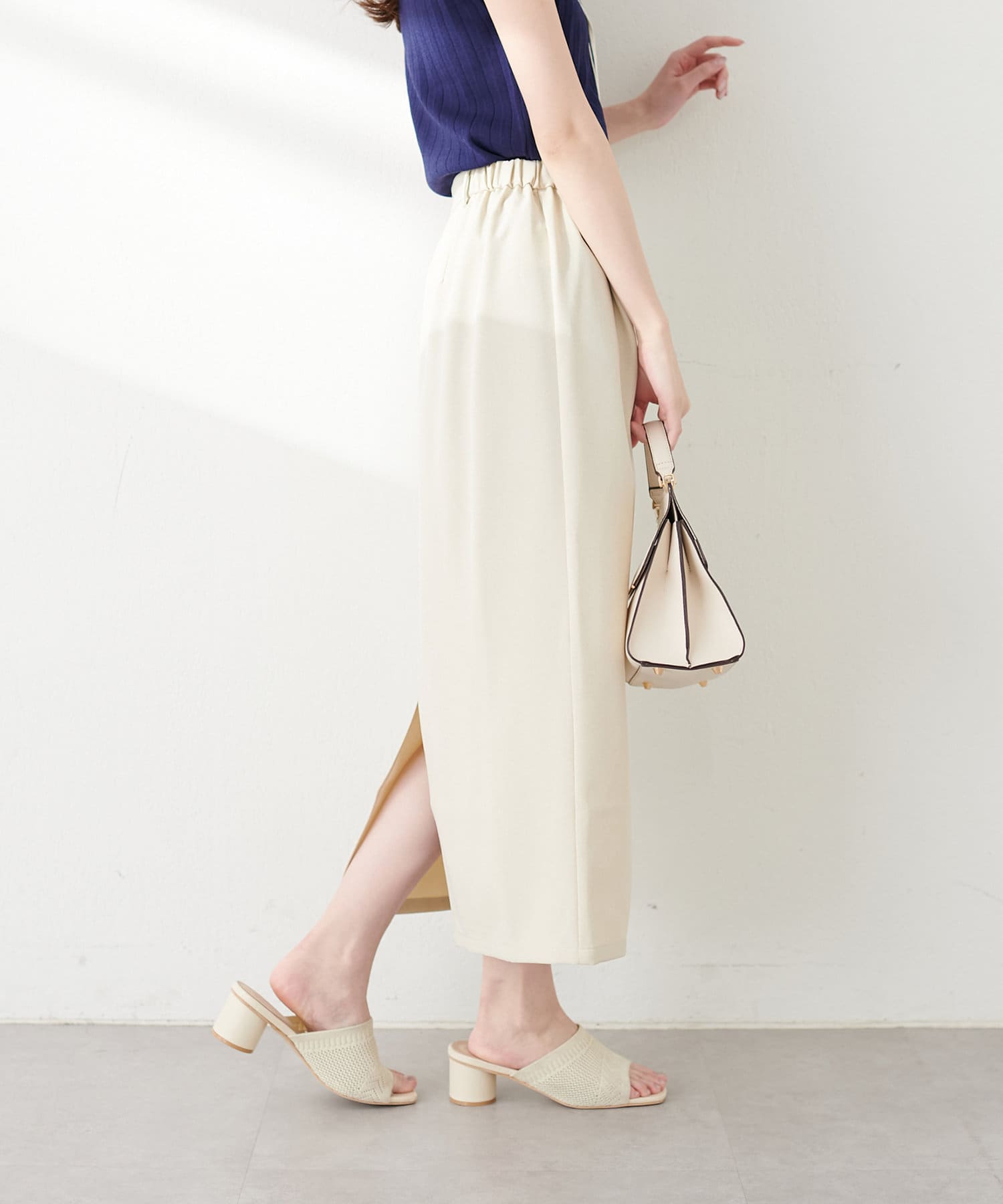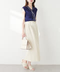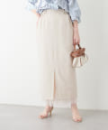 ナロースカートはさらりとした肌触りの落ち感のある生地を使用。