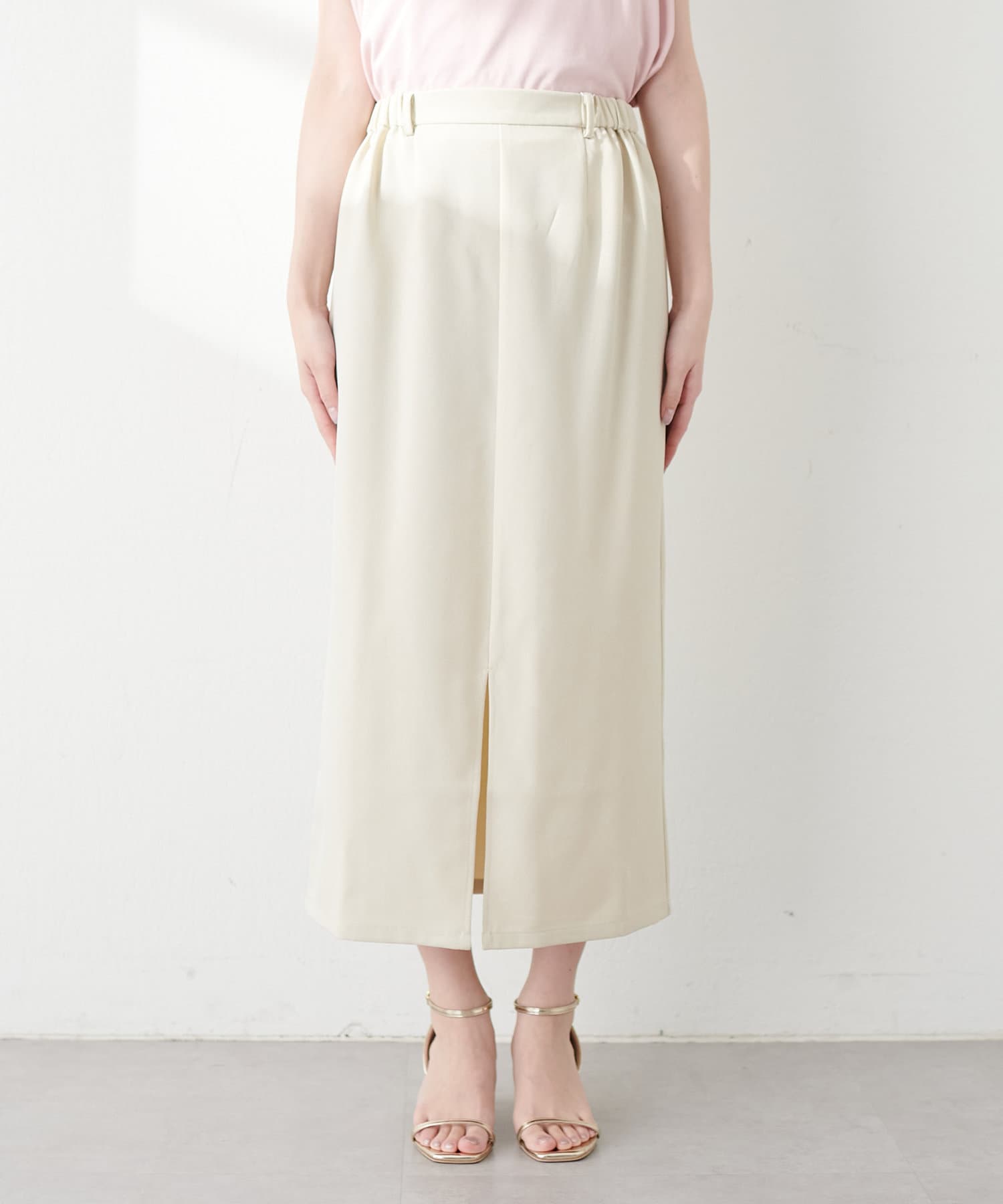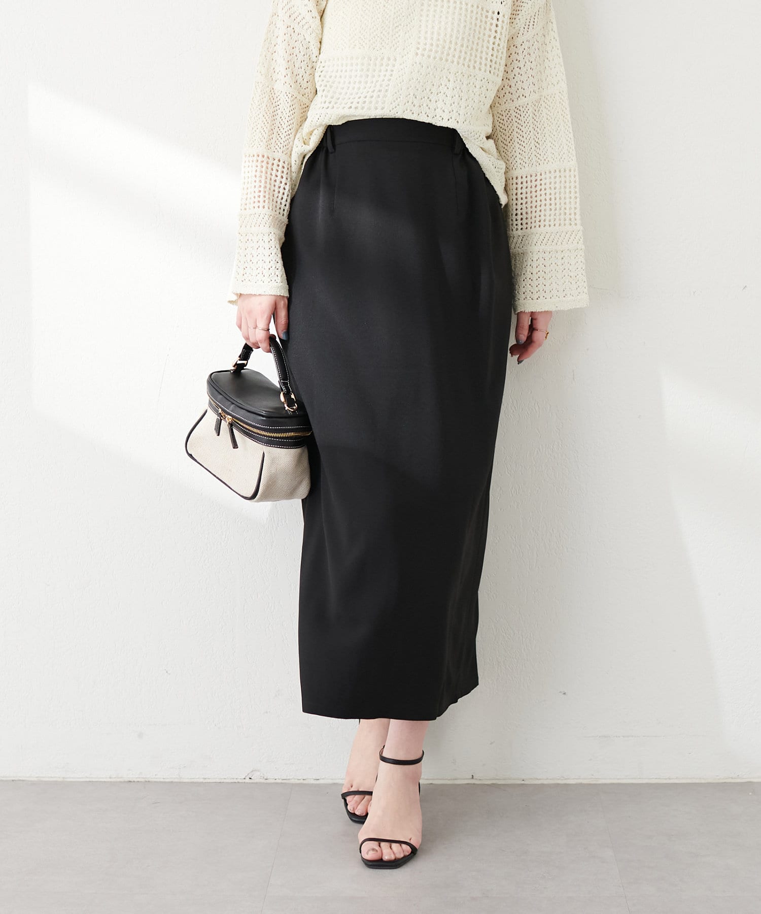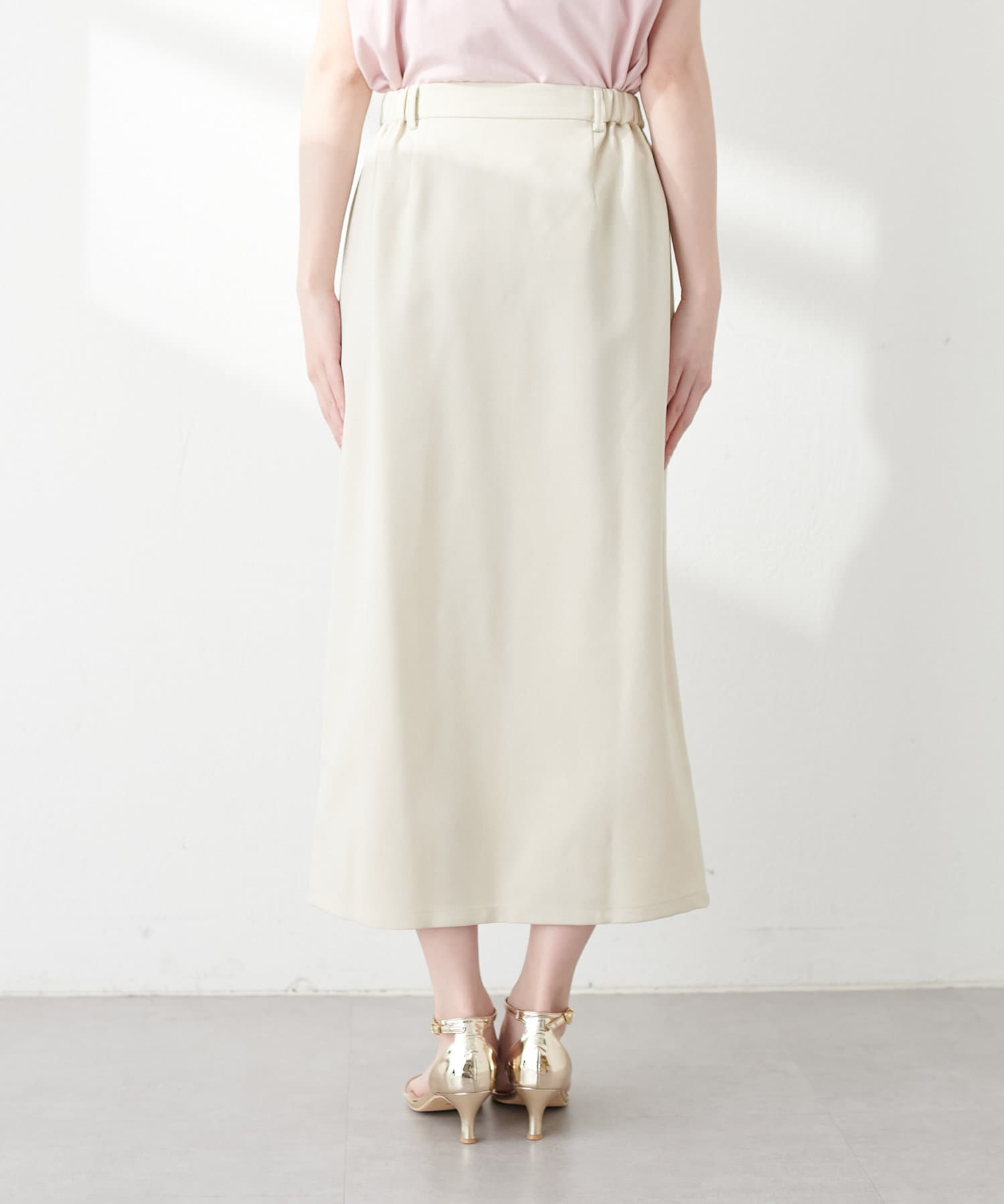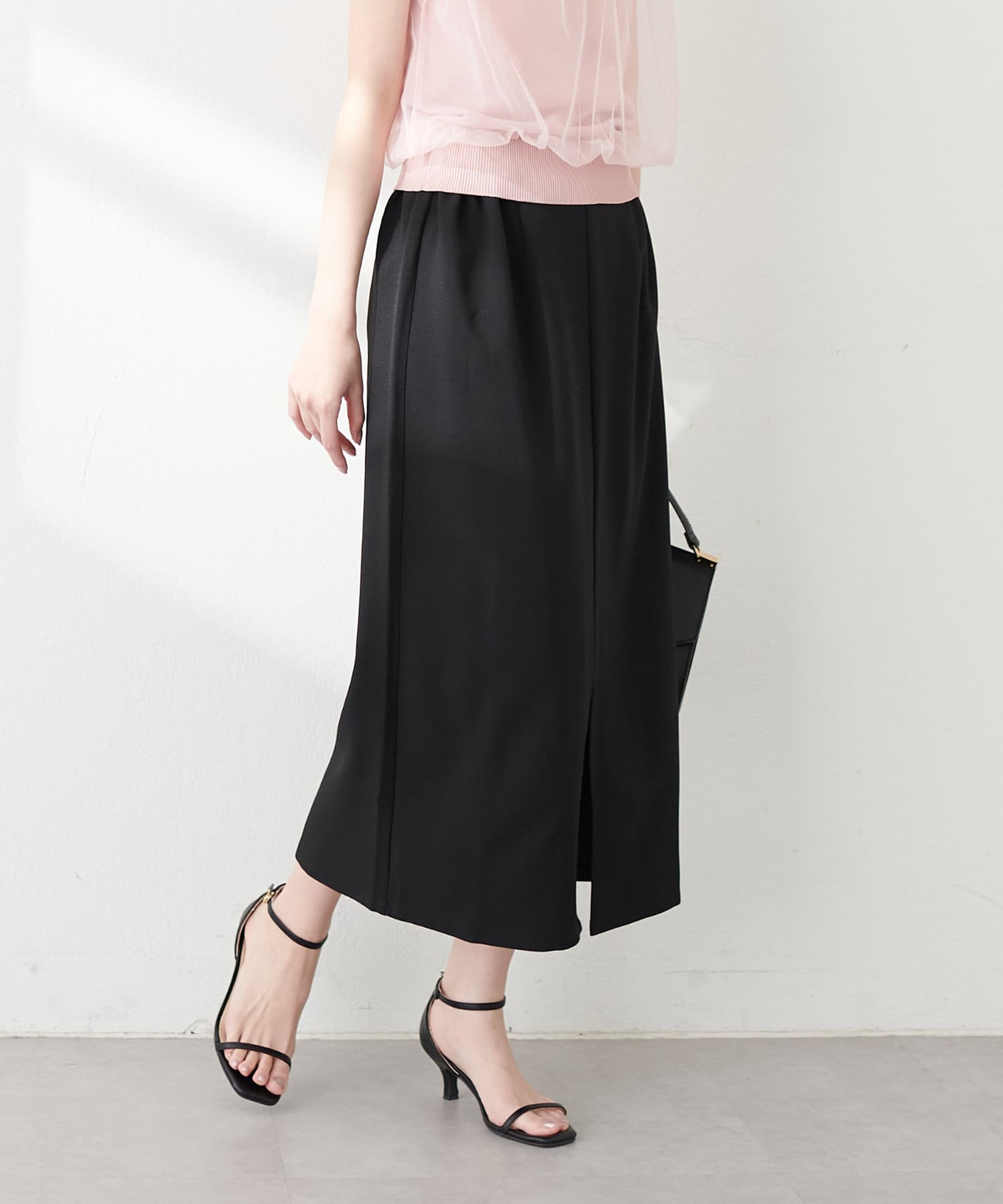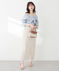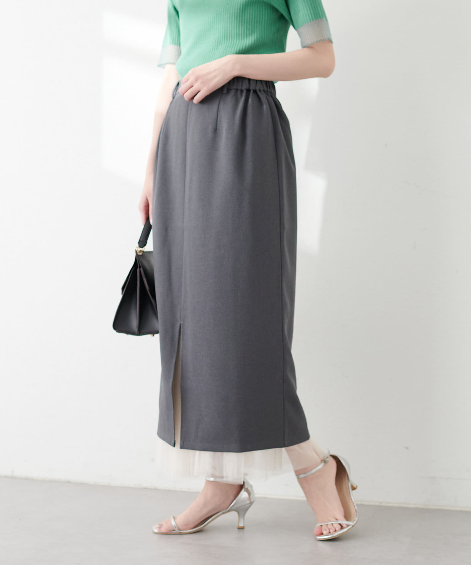 ナロースカートはさらりとした肌触りの落ち感のある生地を使用。