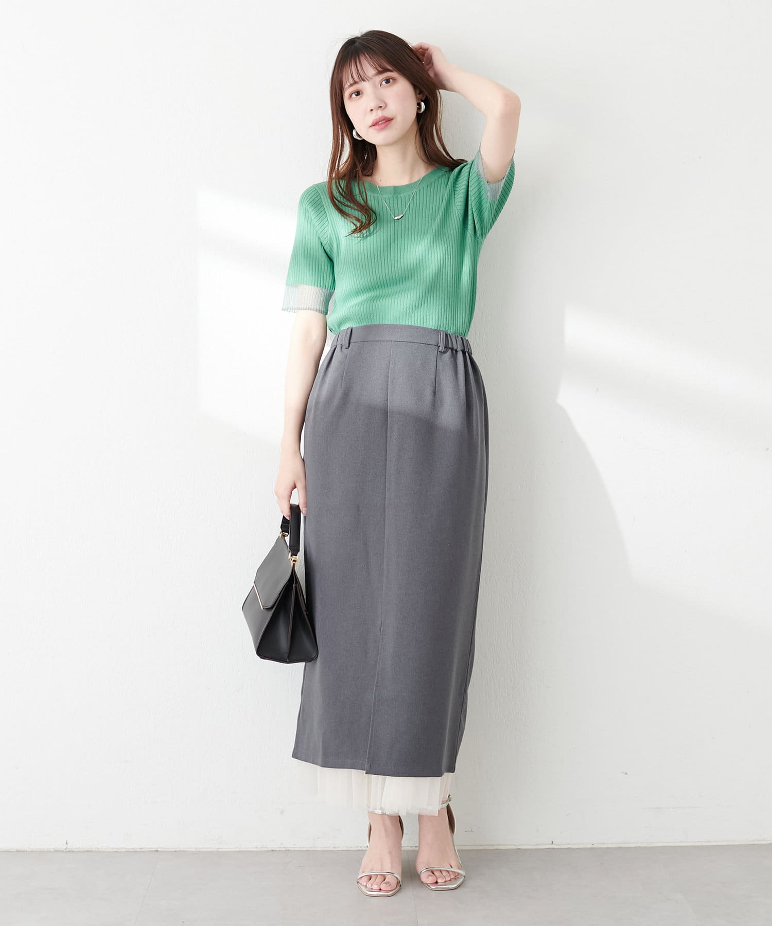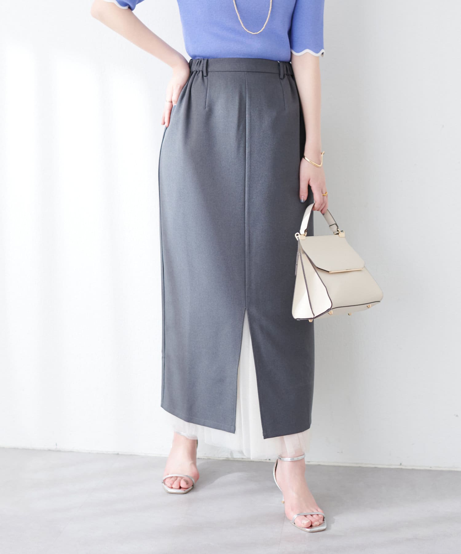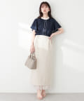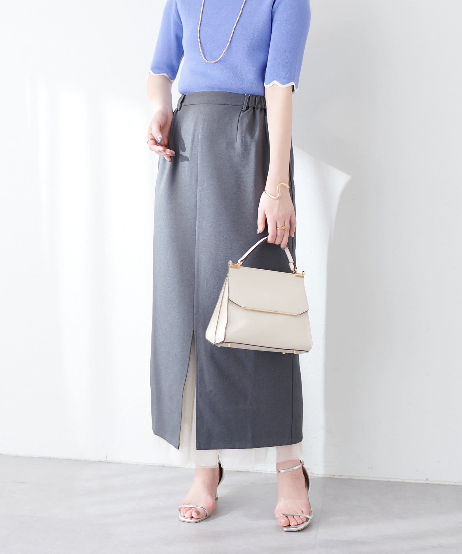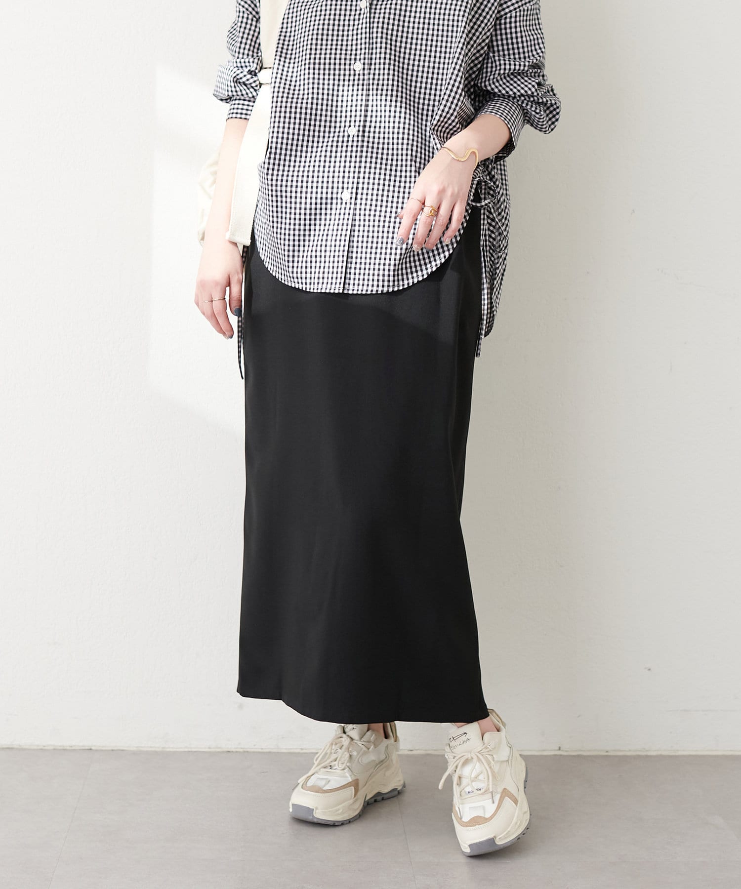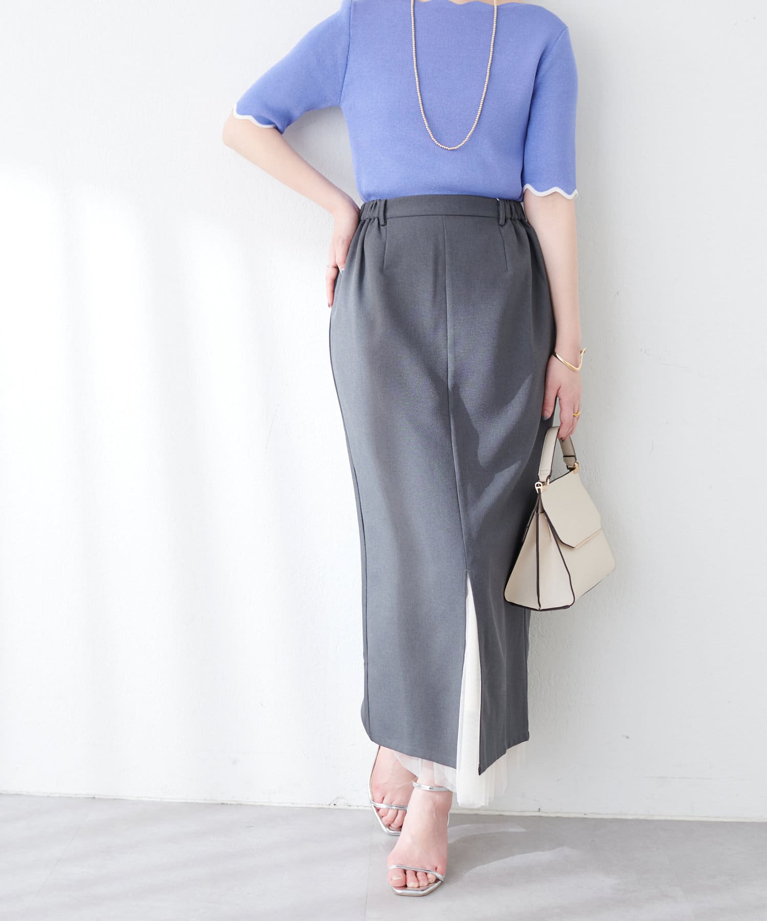 ナロースカートはさらりとした肌触りの落ち感のある生地を使用。