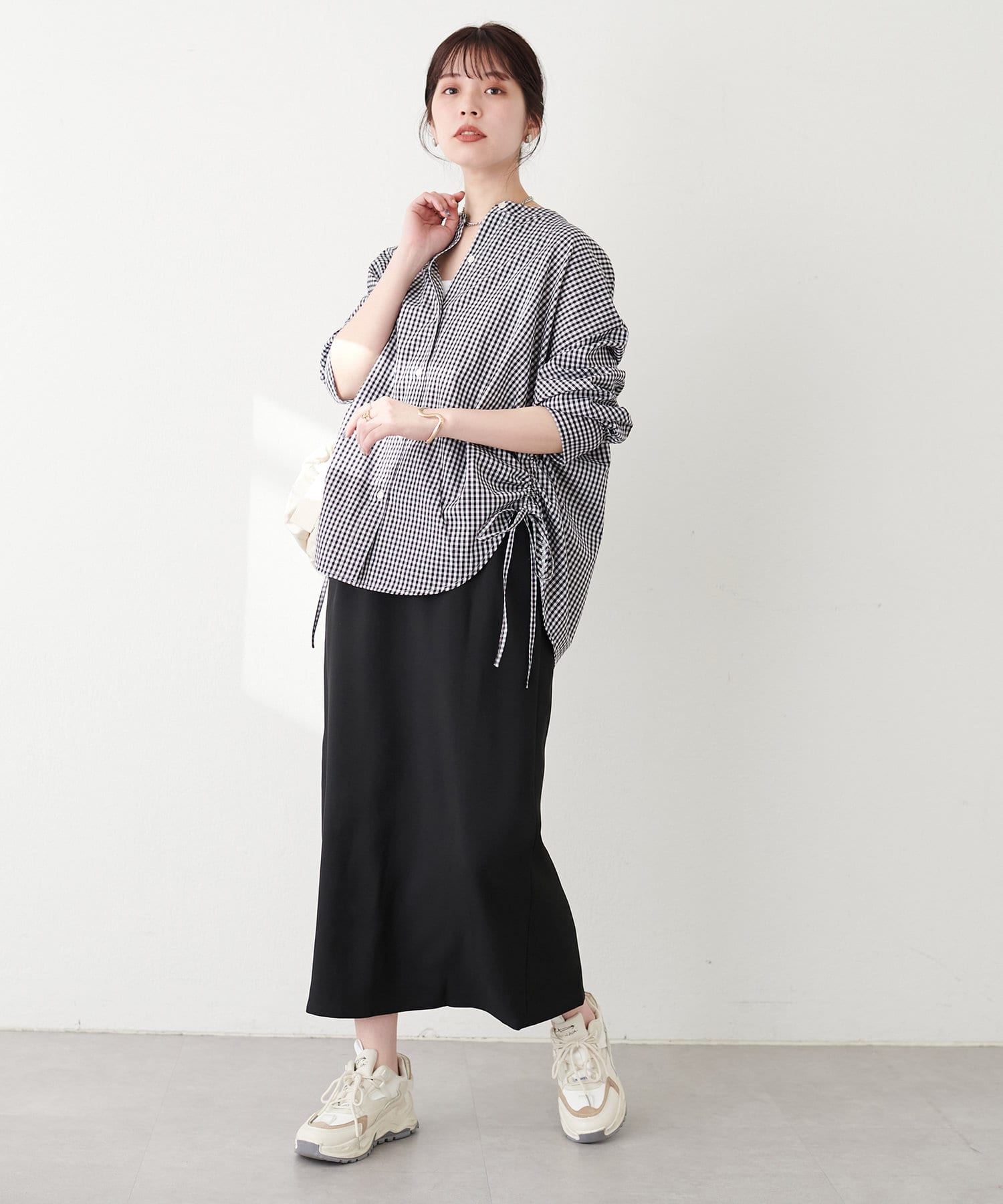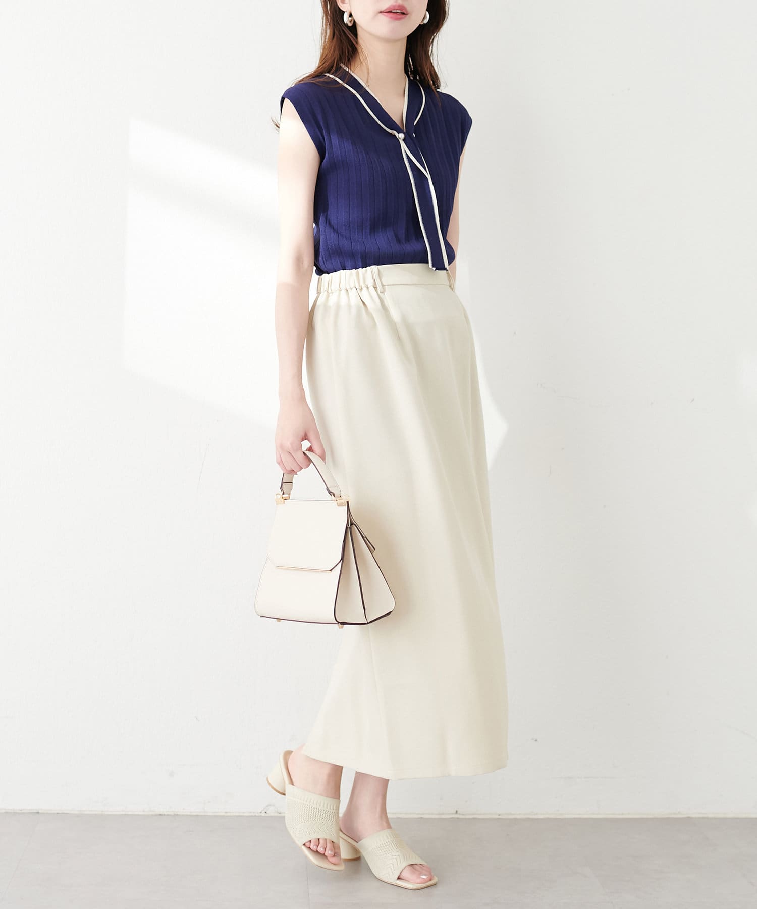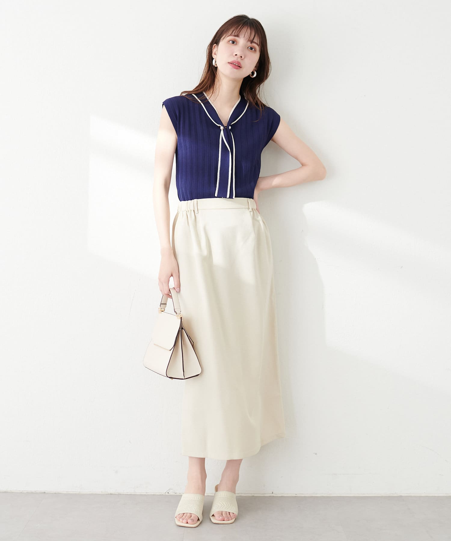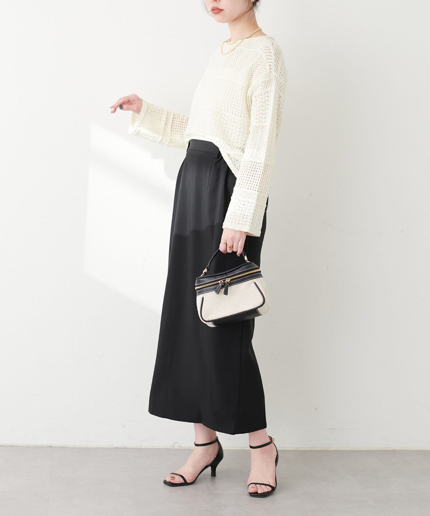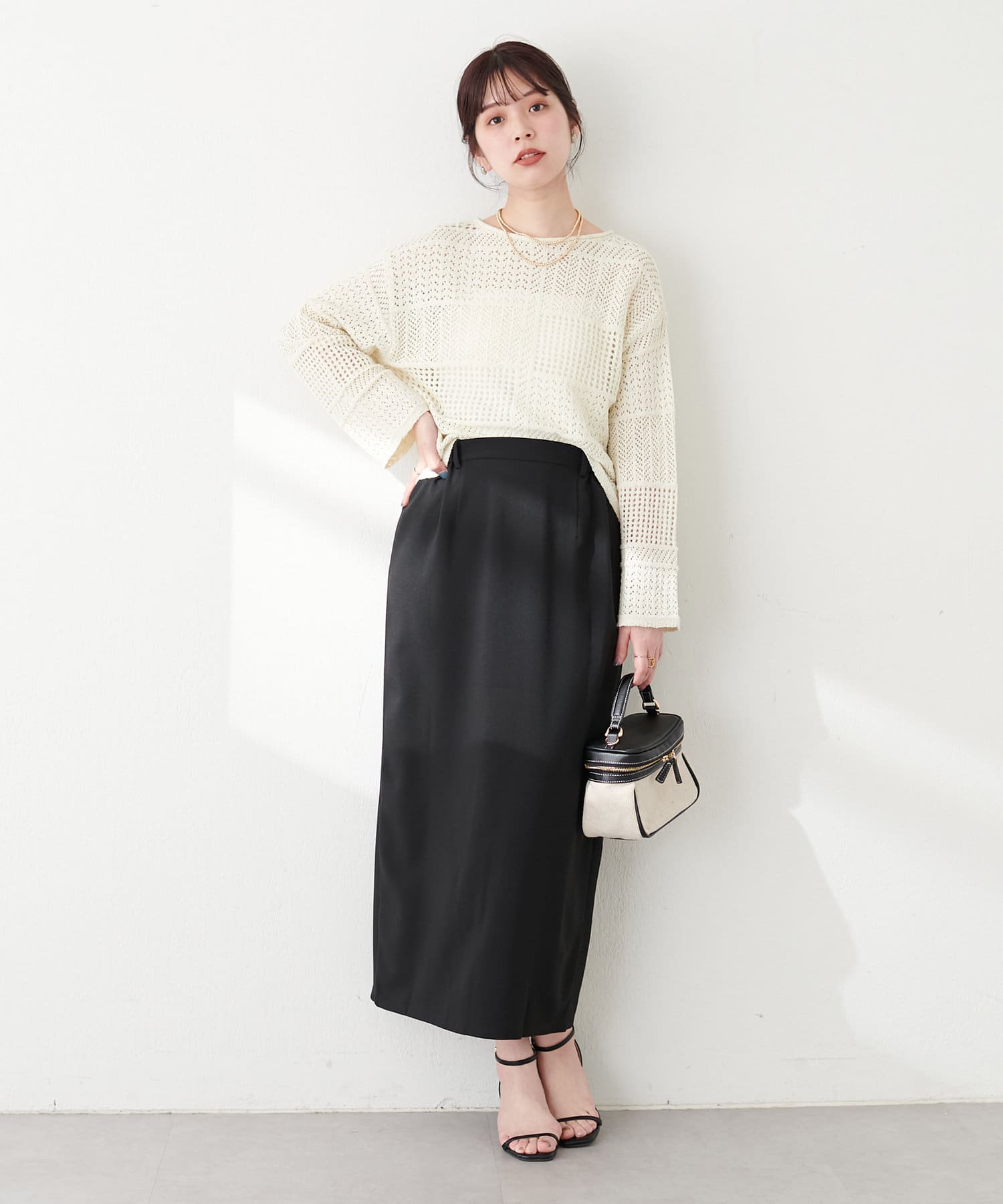ナロースカートはさらりとした肌触りの落ち感のある生地を使用。