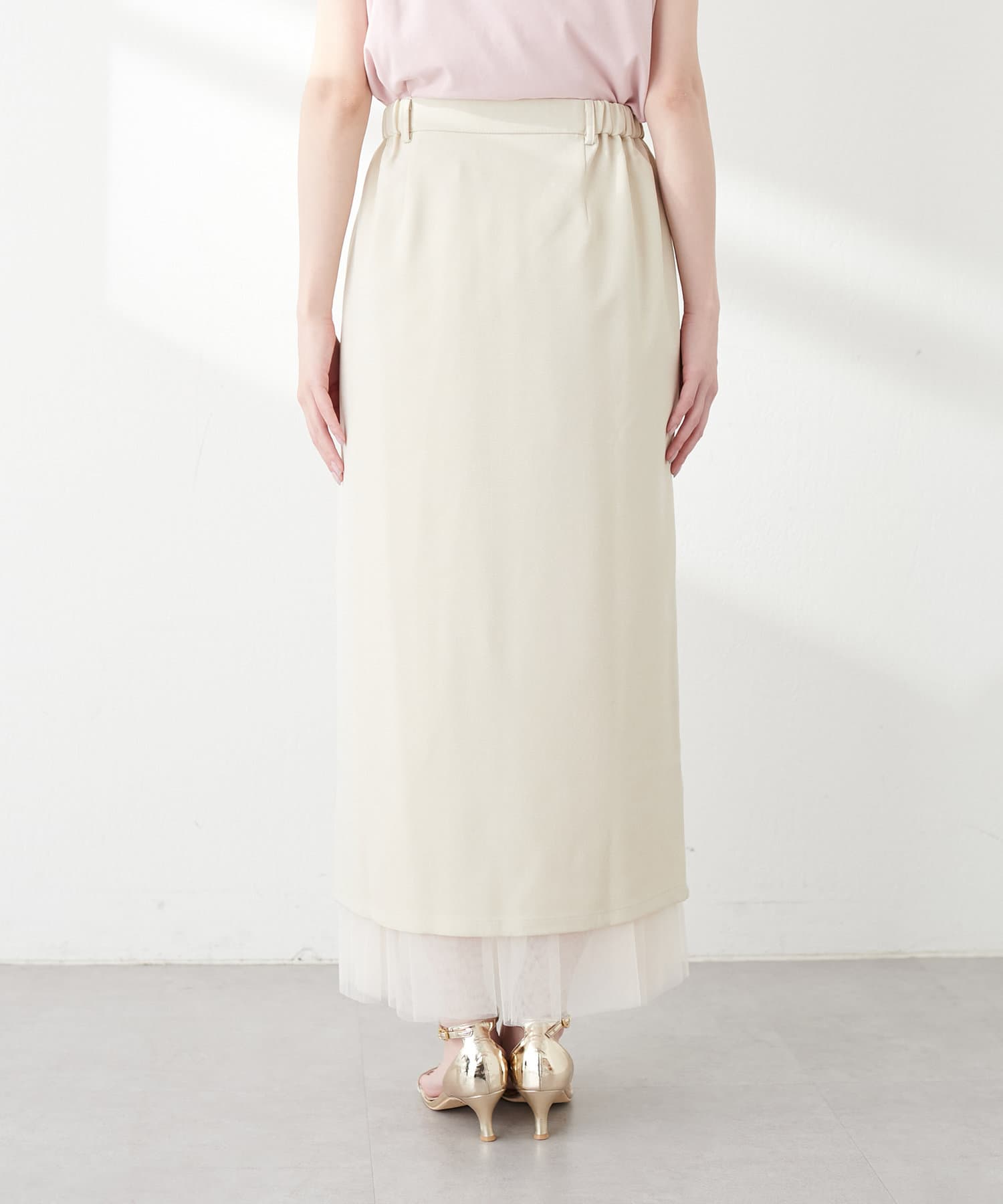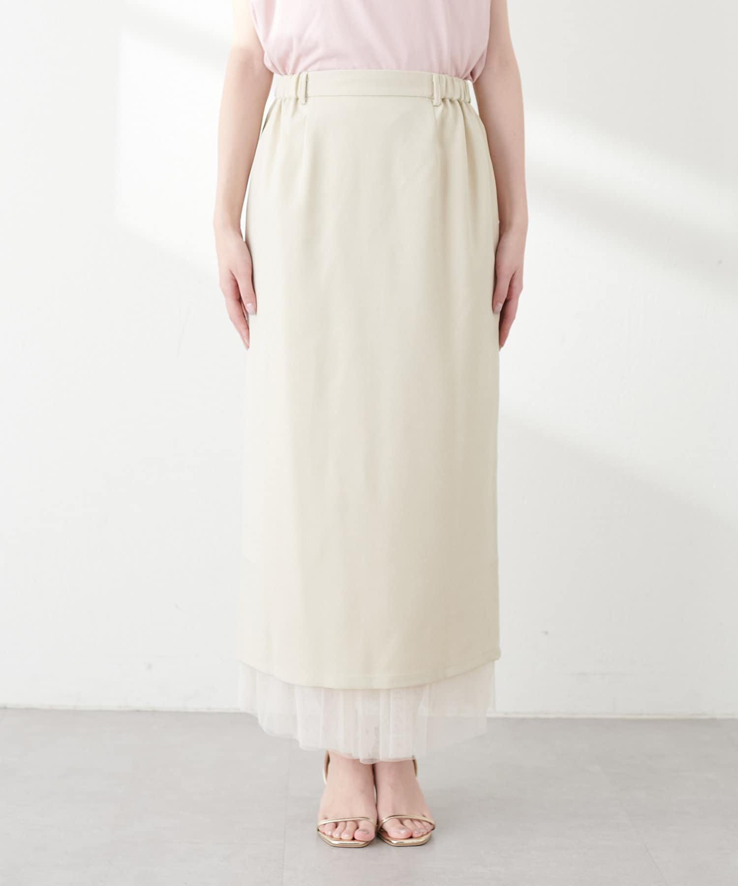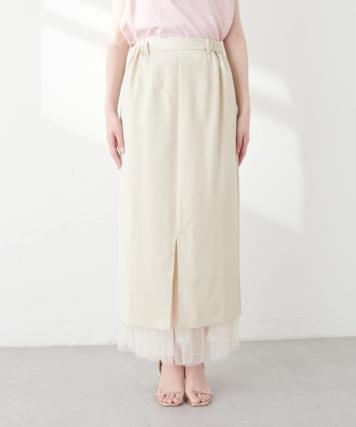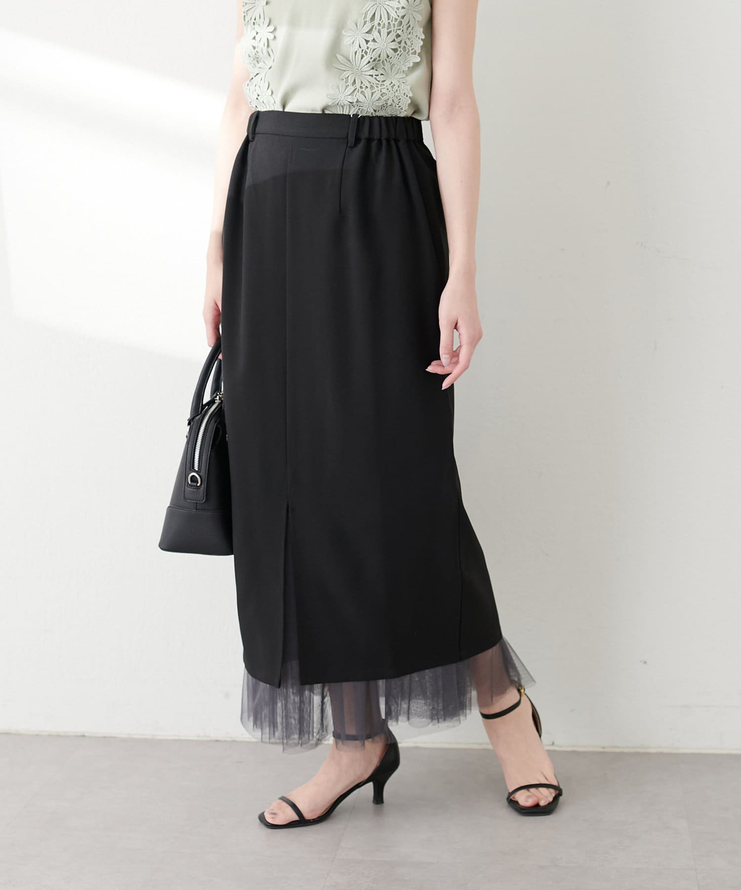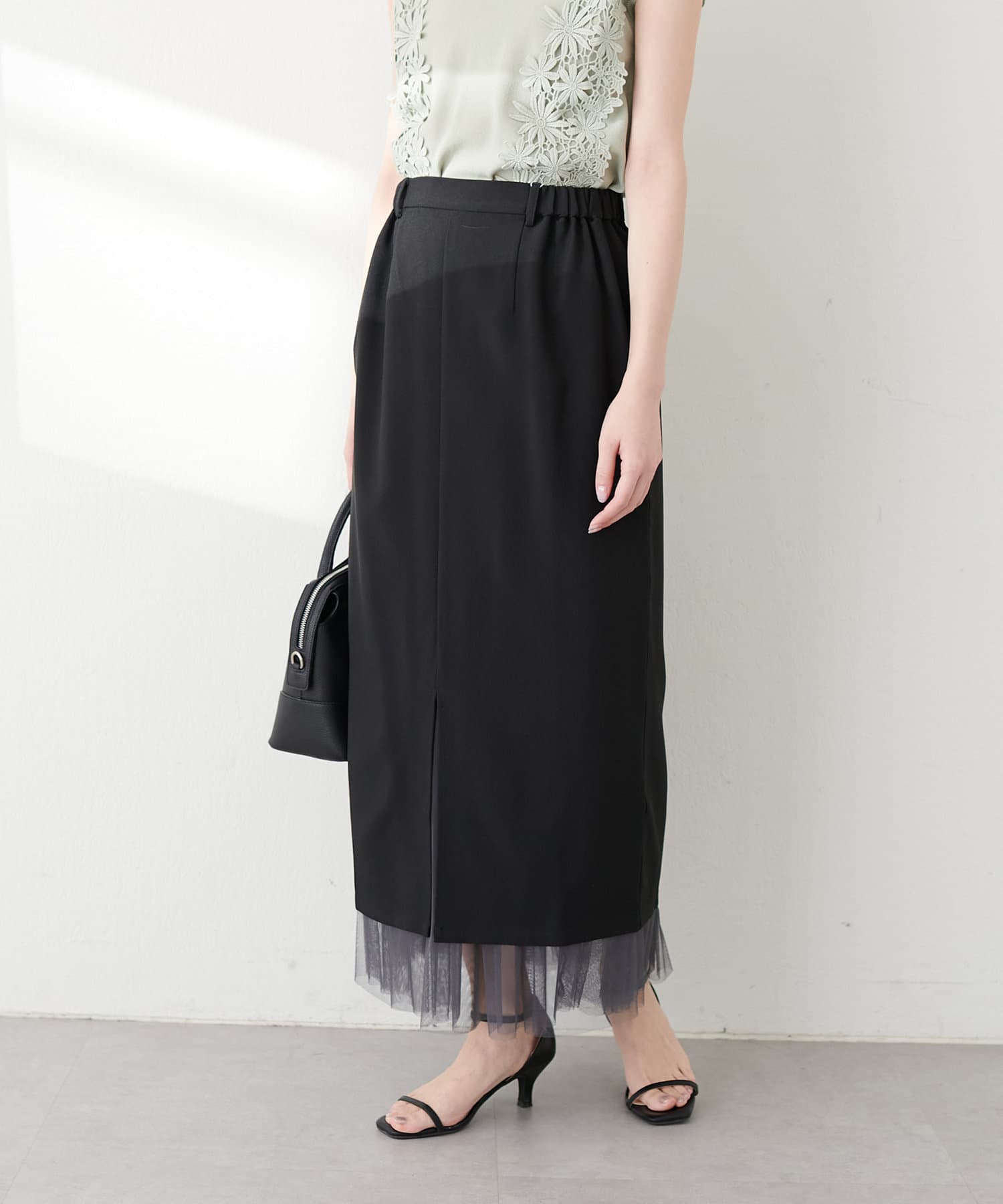 さらりとした肌触りで品の良いナロースカートと、柔らかなチュールをふんだんに使用したスカートのセットアイテム。