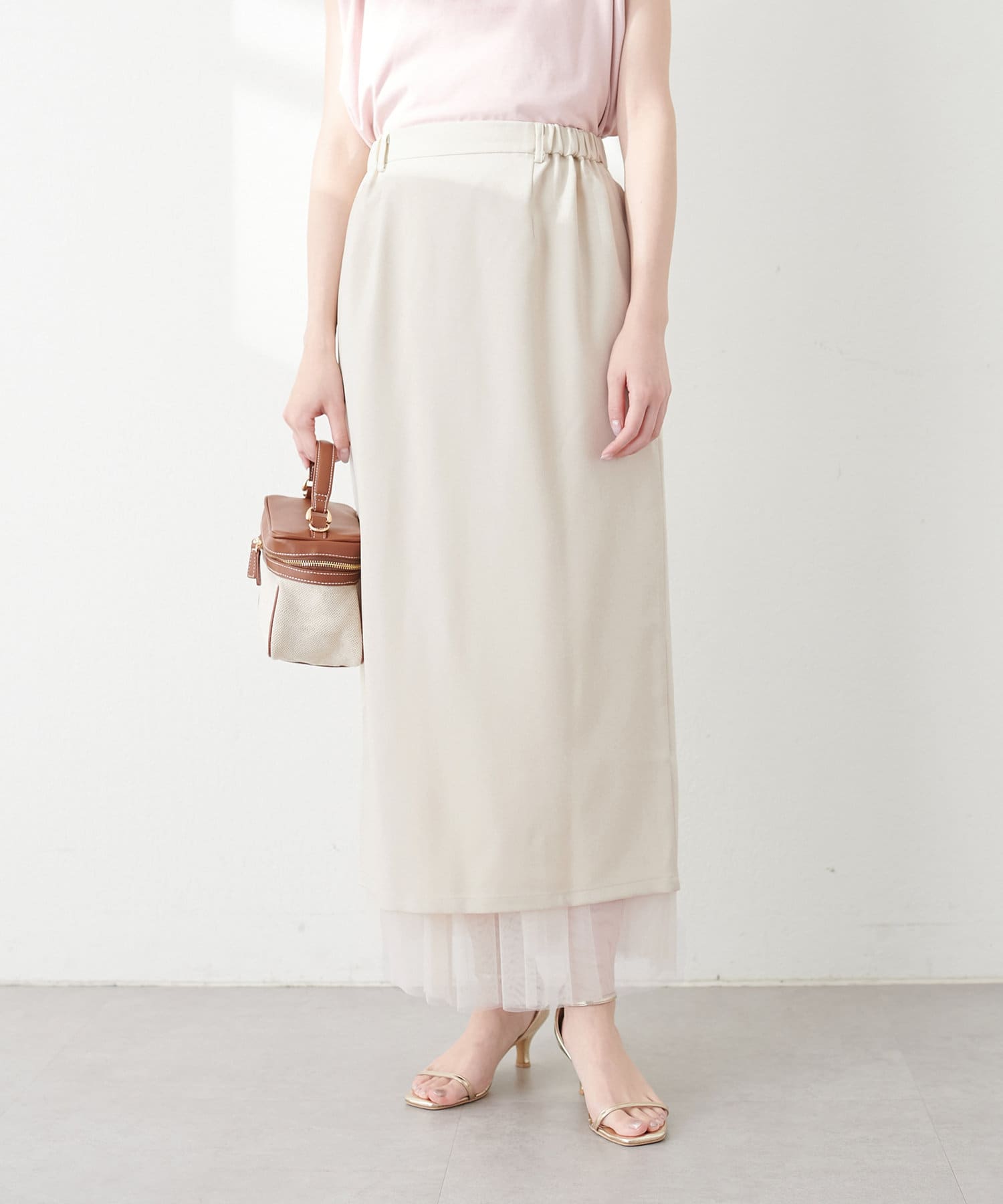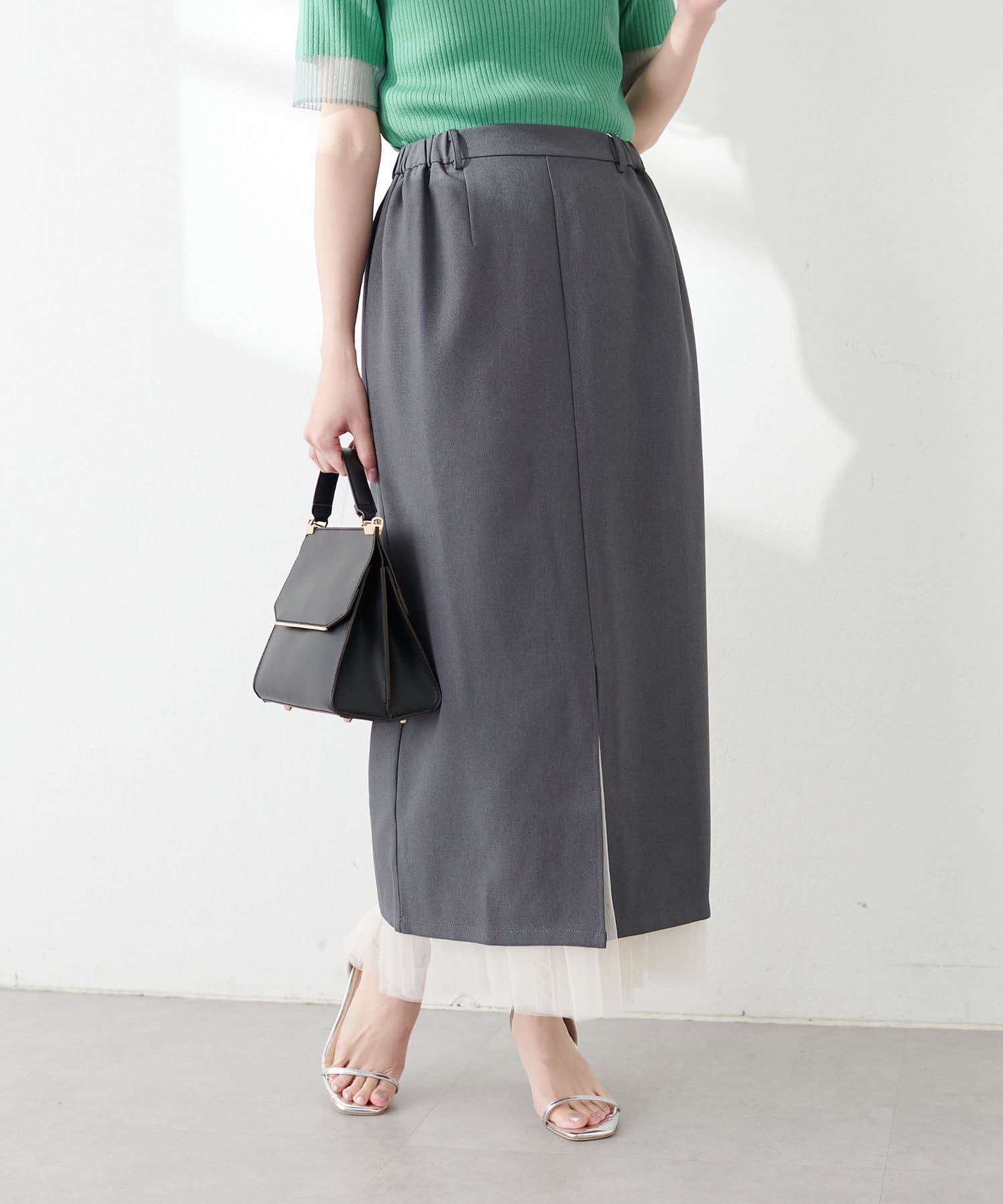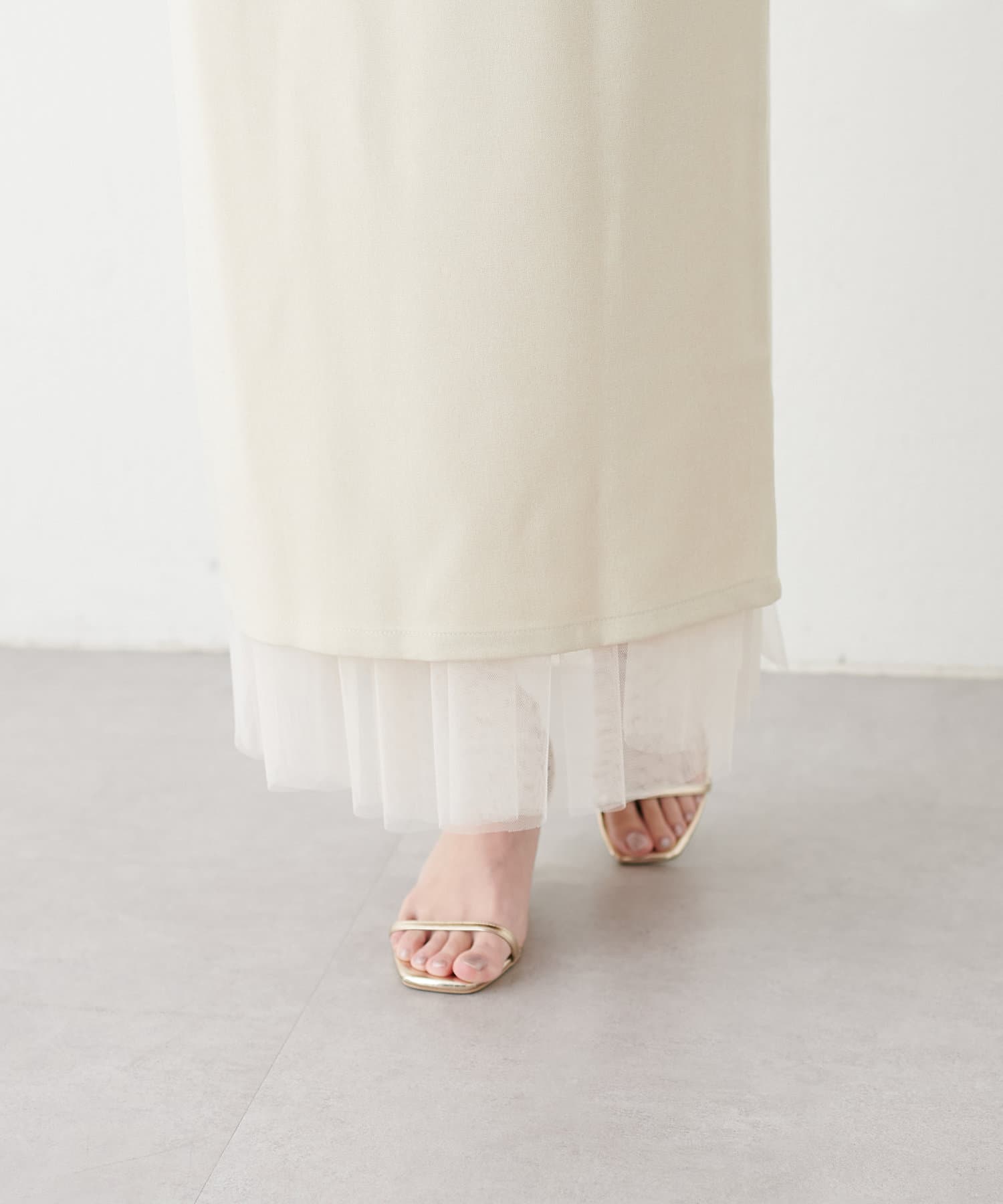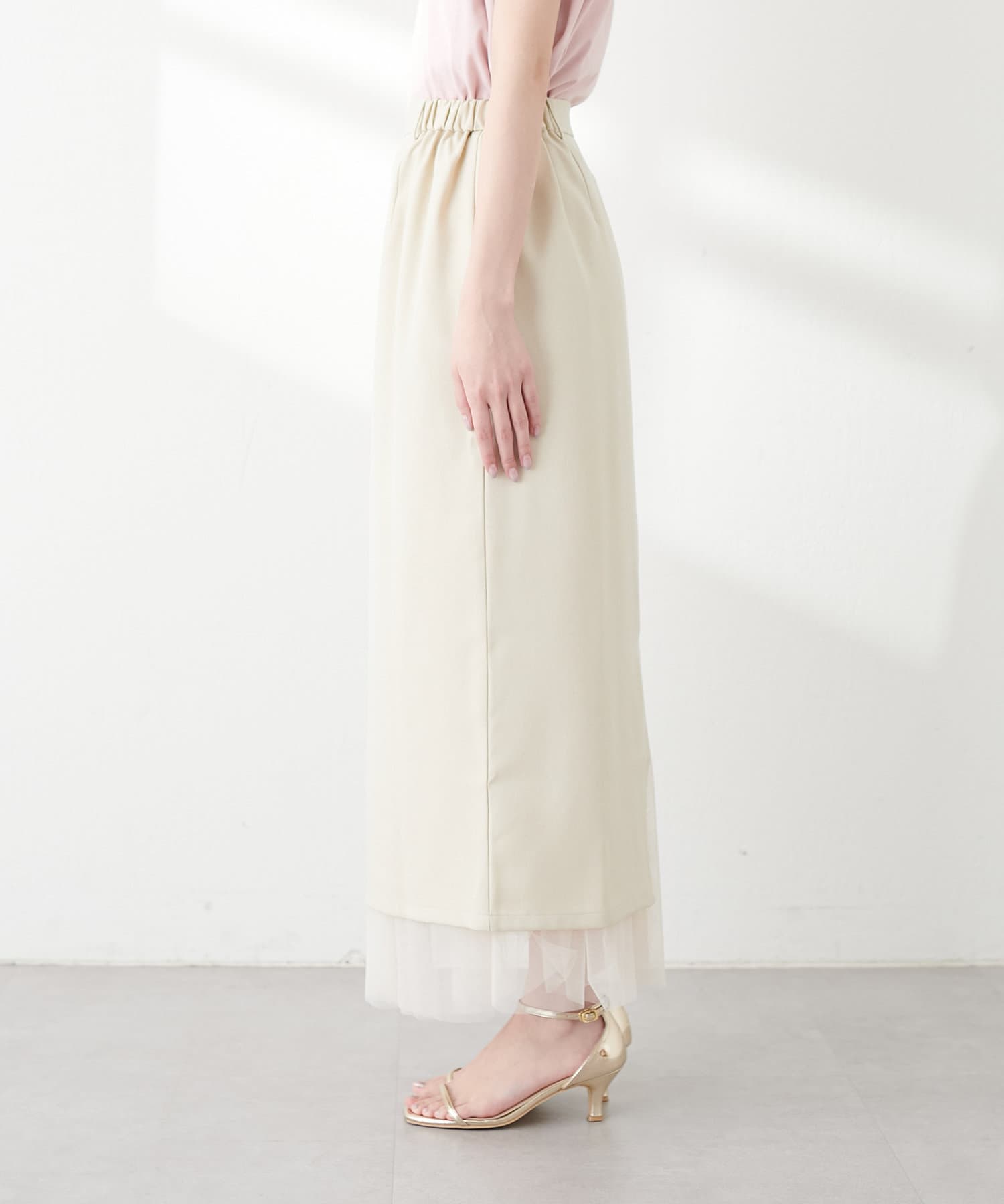 さらりとした肌触りで品の良いナロースカートと、柔らかなチュールをふんだんに使用したスカートのセットアイテム。