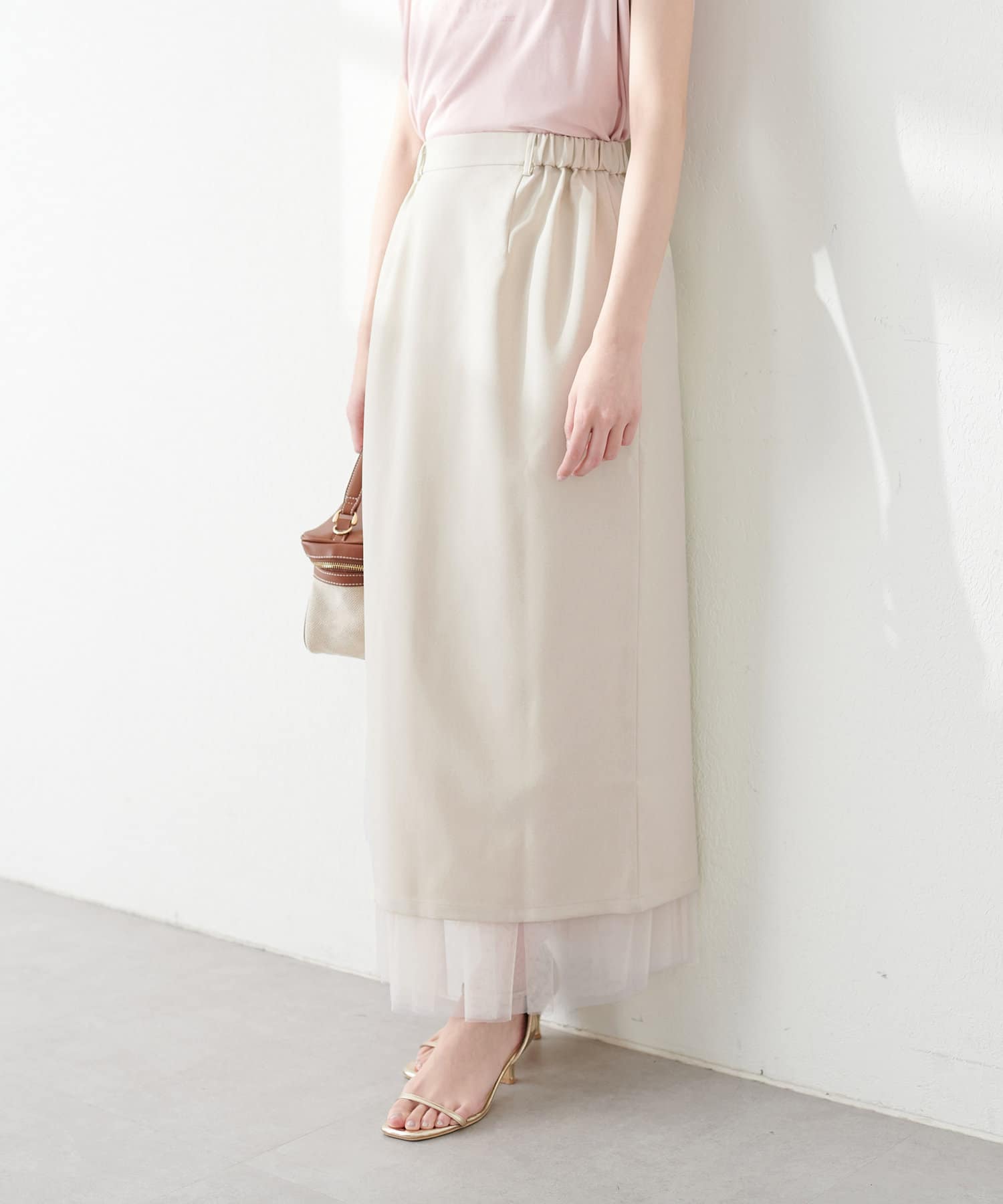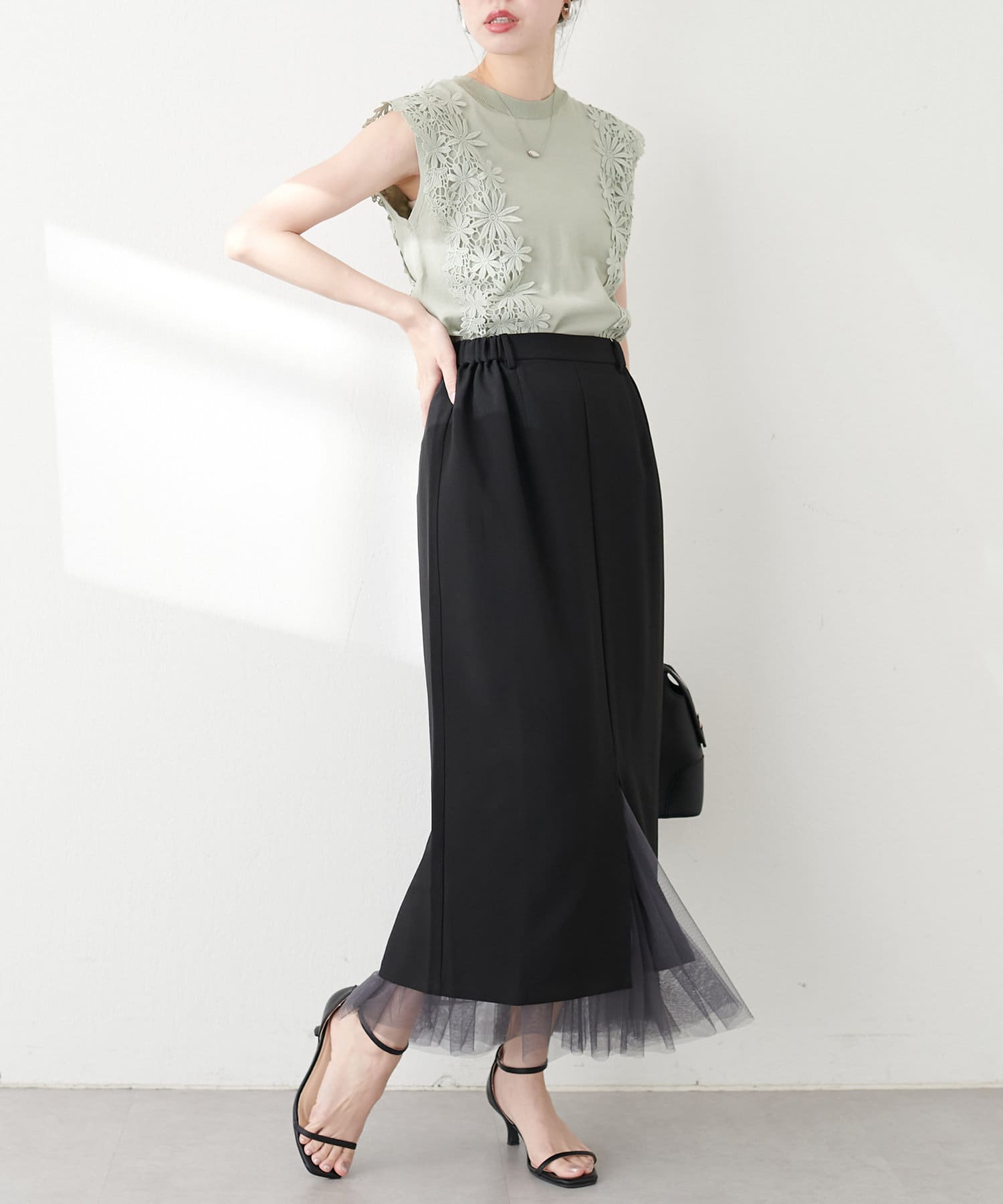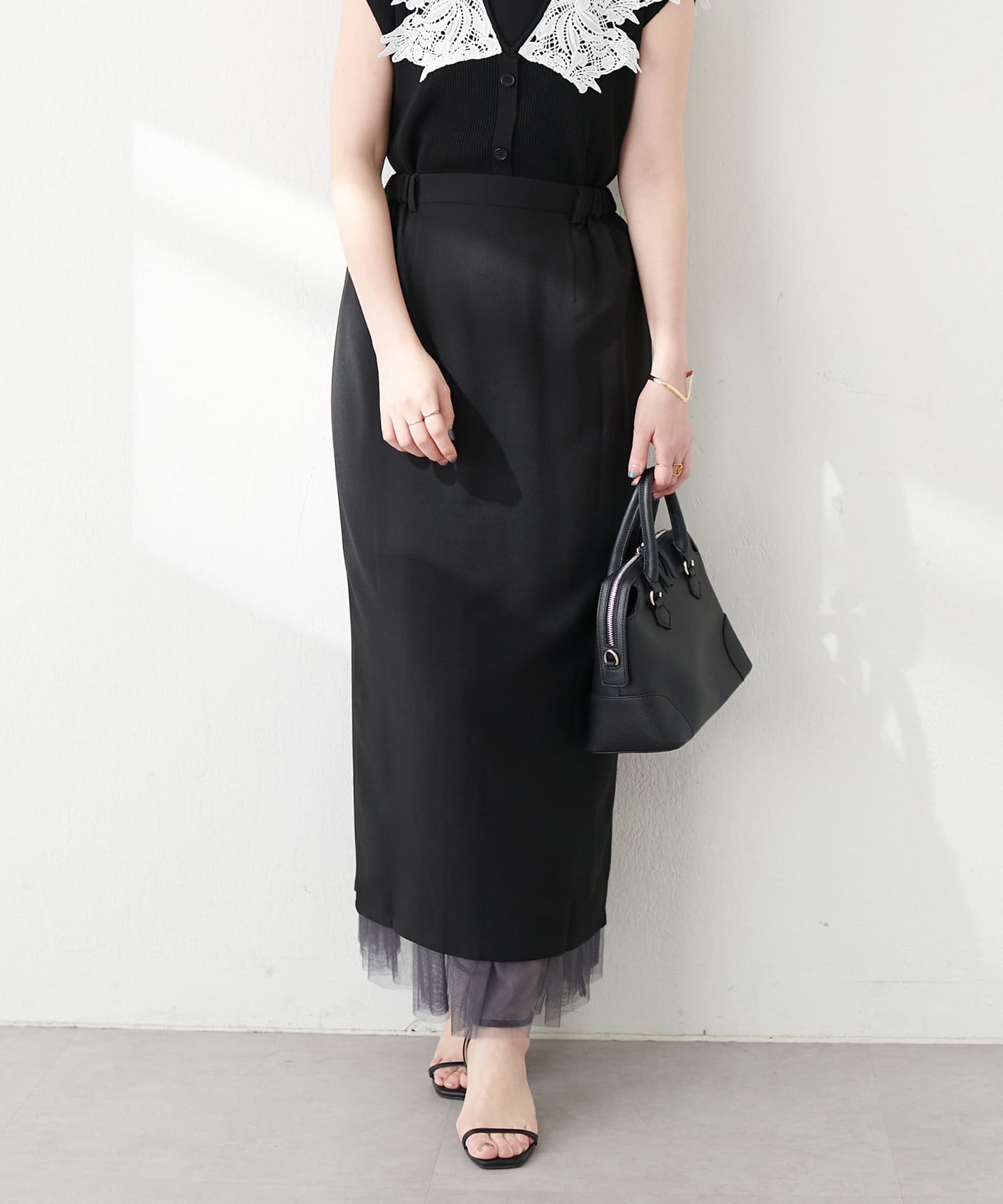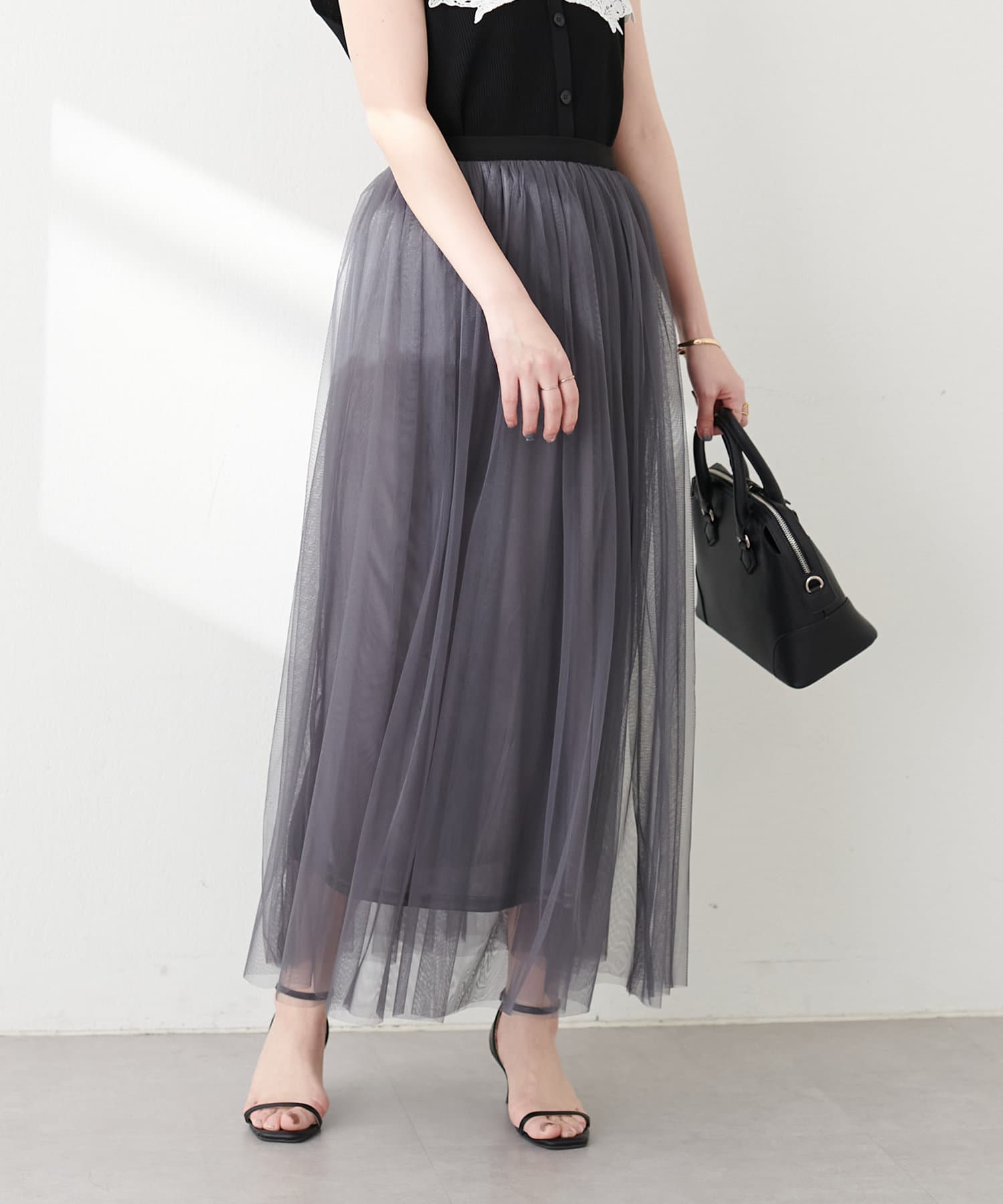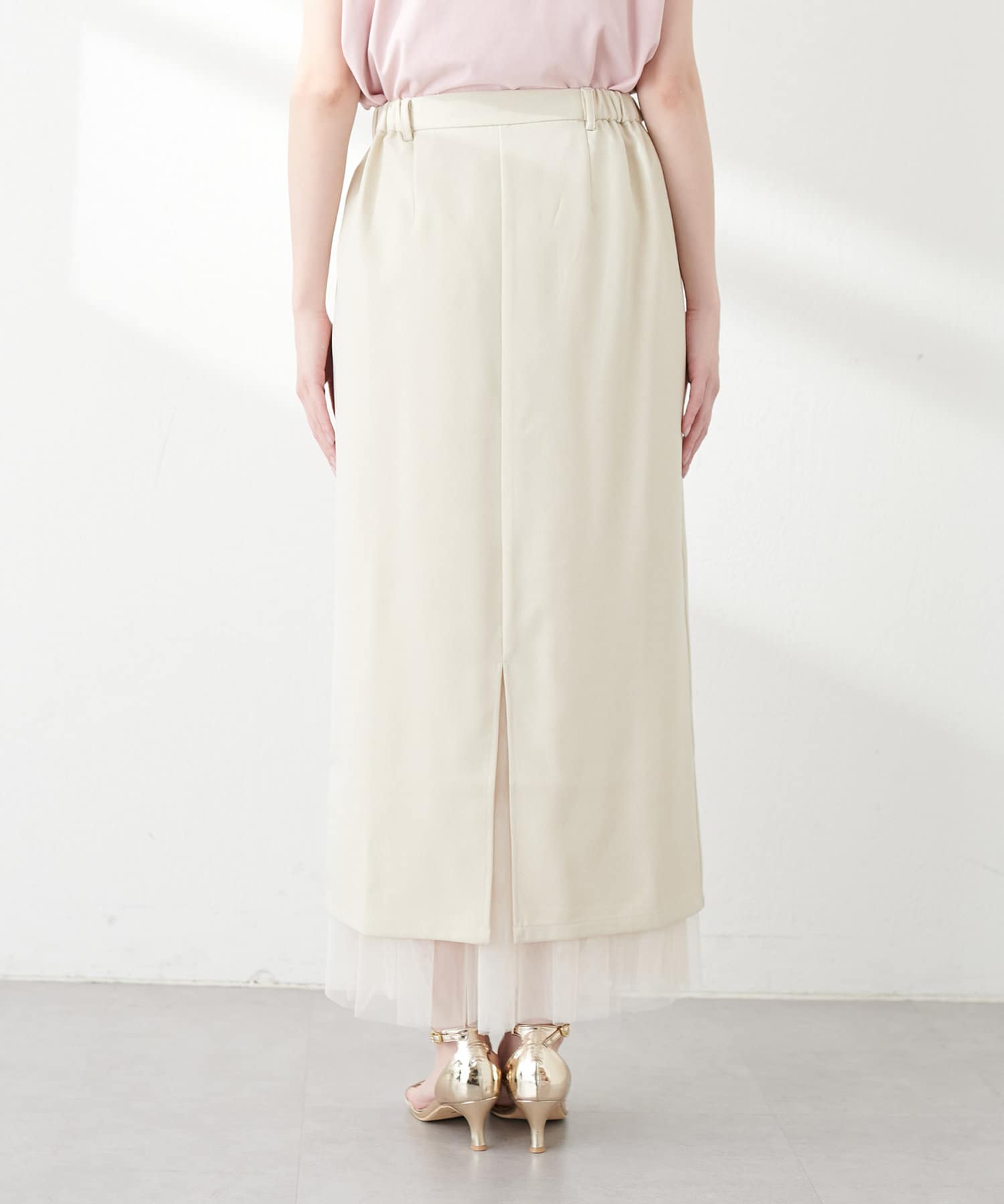 さらりとした肌触りで品の良いナロースカートと、柔らかなチュールをふんだんに使用したスカートのセットアイテム。