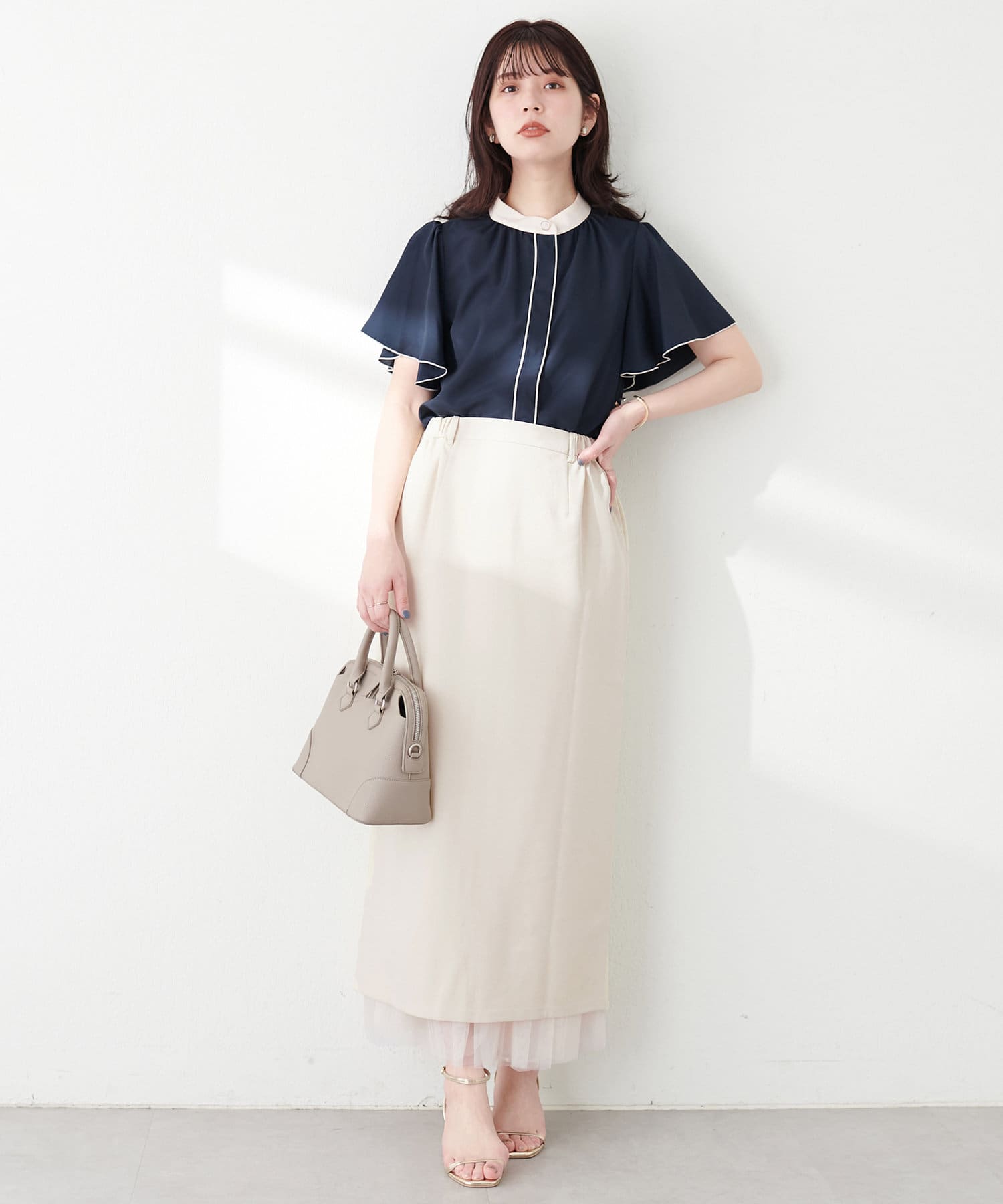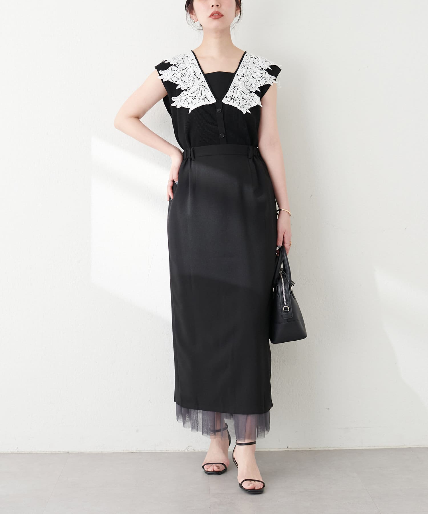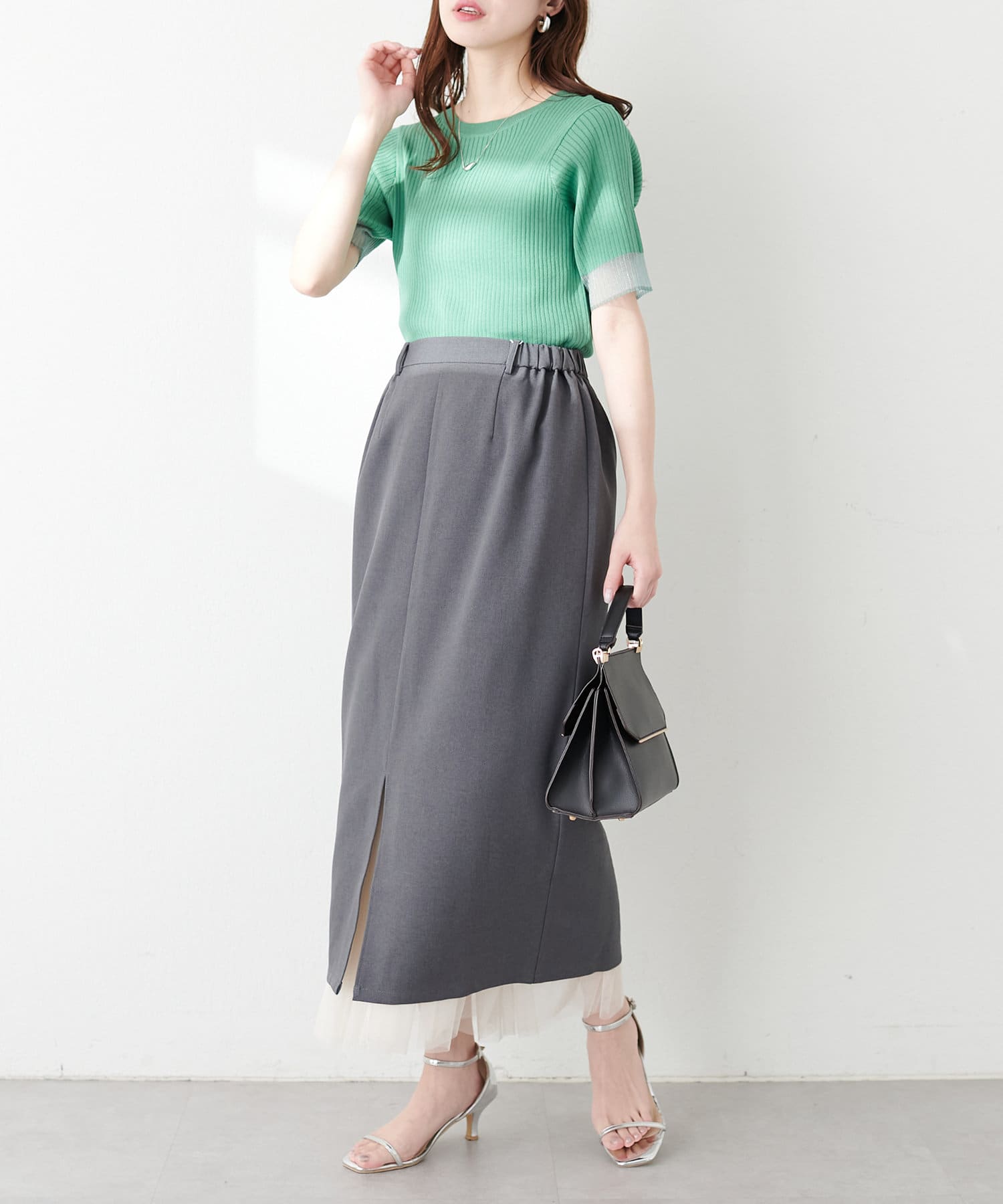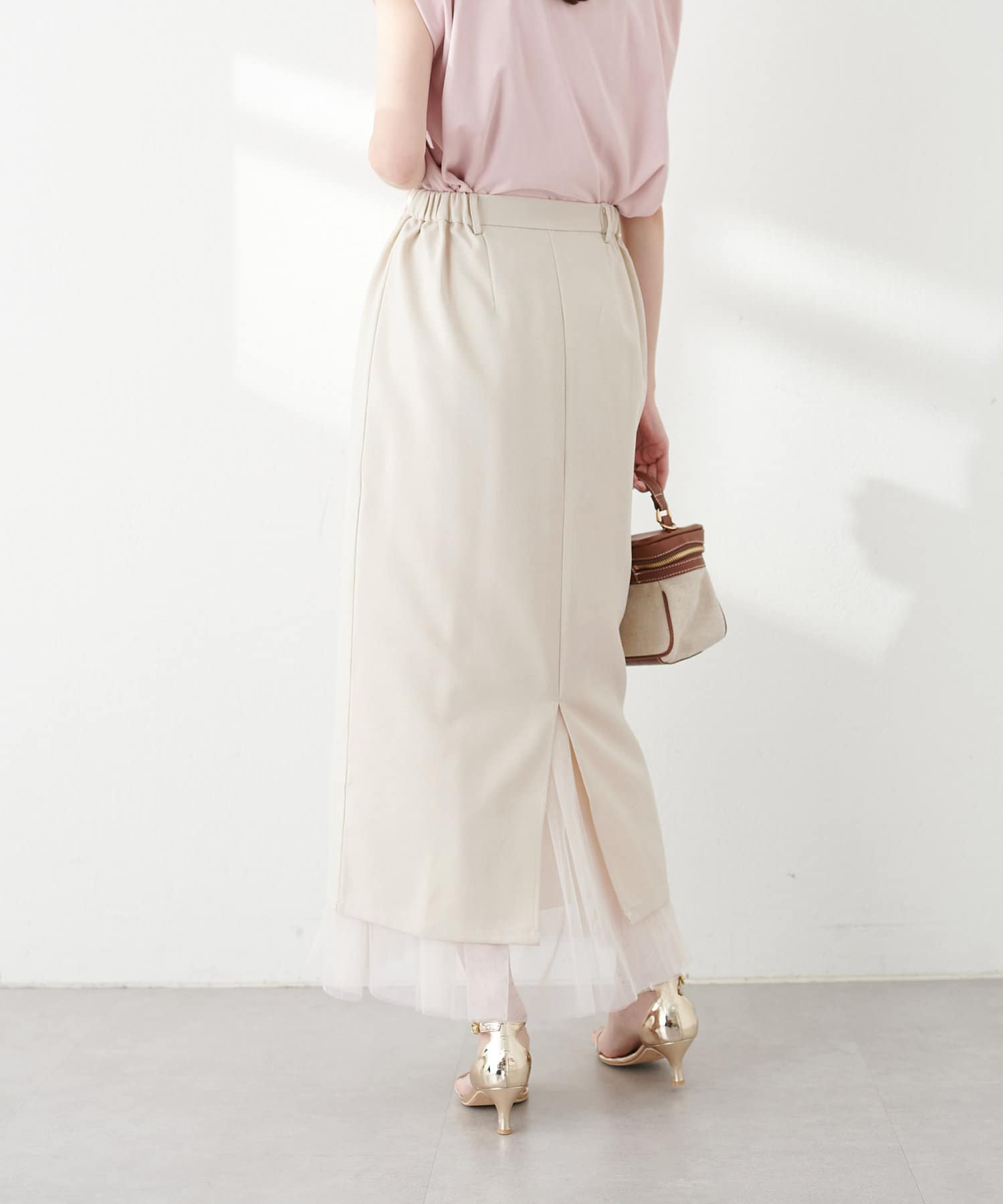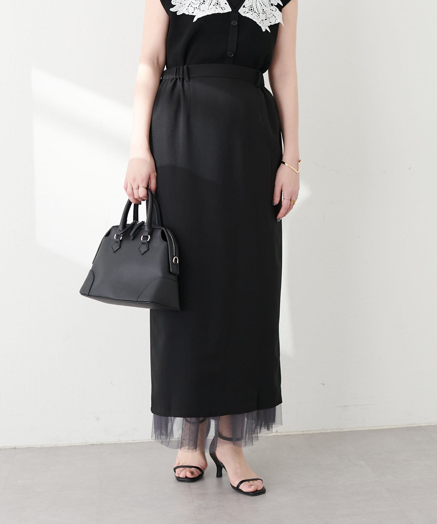 さらりとした肌触りで品の良いナロースカートと、柔らかなチュールをふんだんに使用したスカートのセットアイテム。