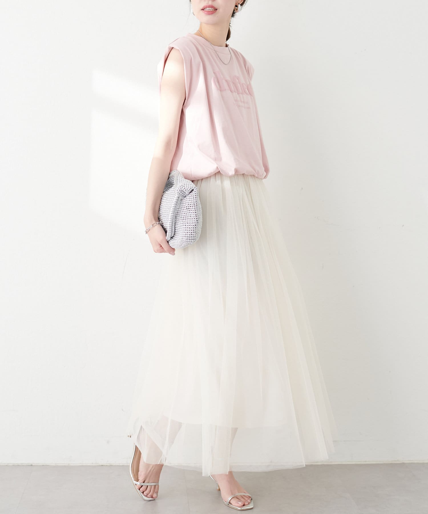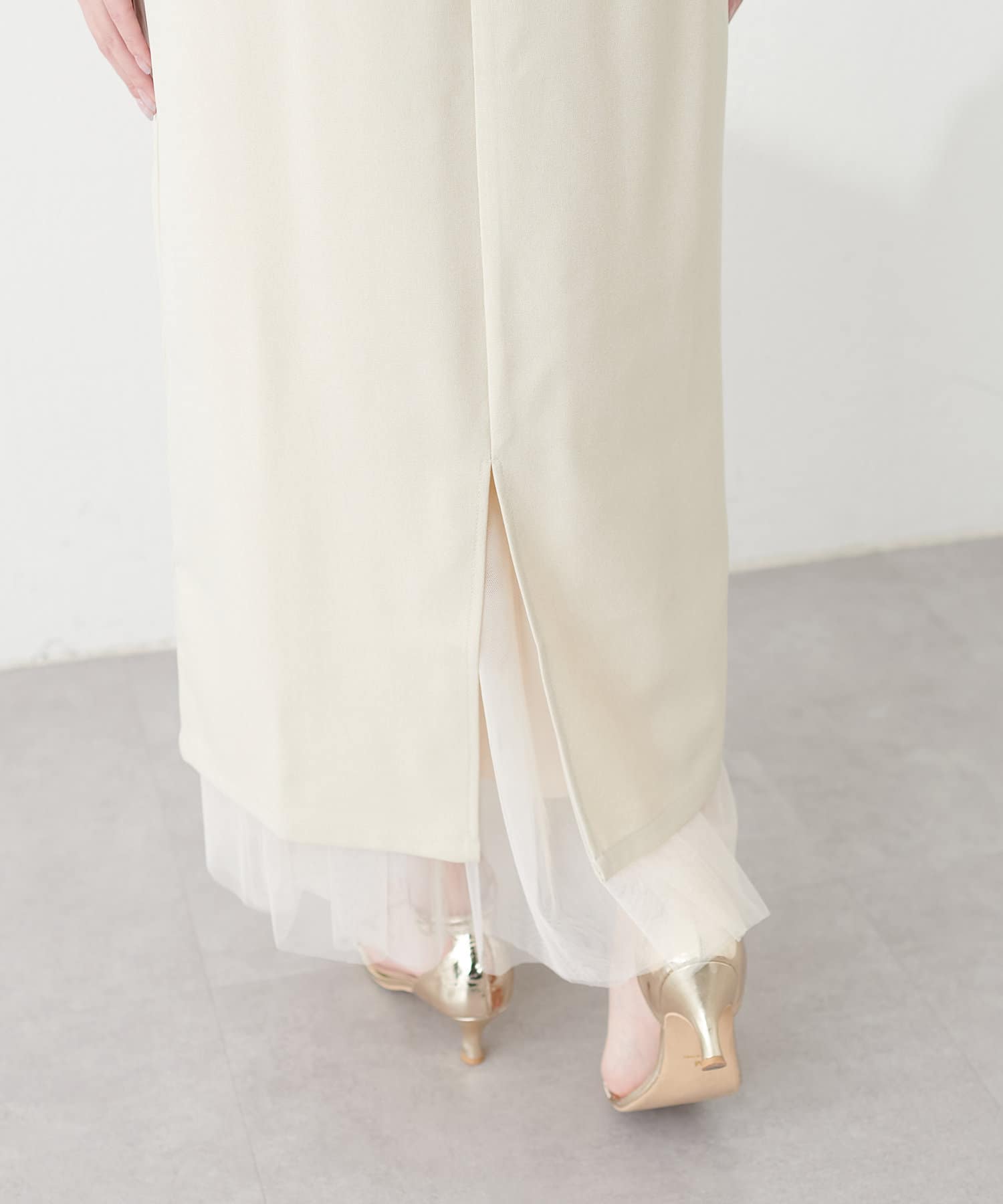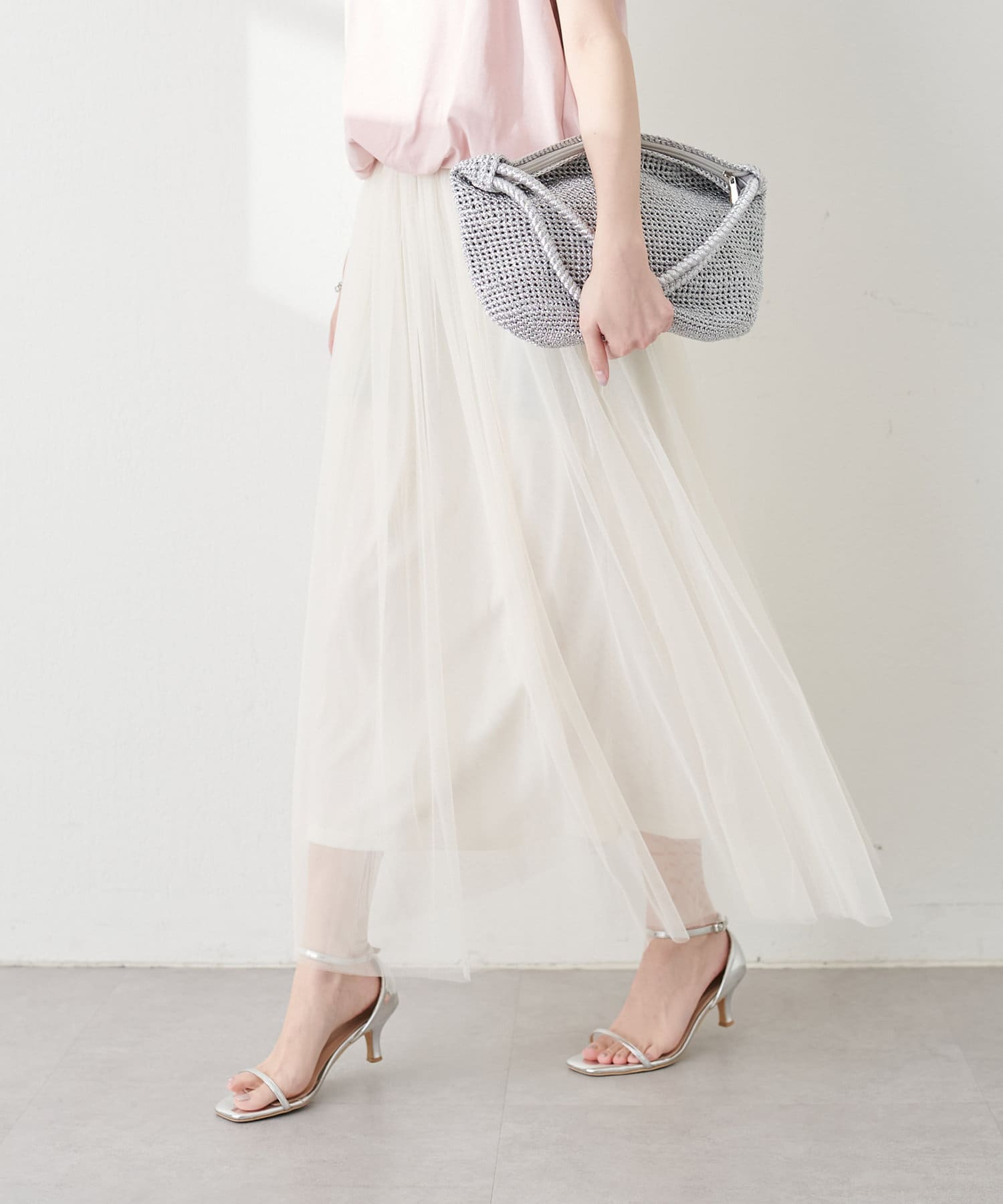 チュールスカートはできるだけボリュームを落とし、かつ、単品でお召し頂いてもサマになるよう設計。