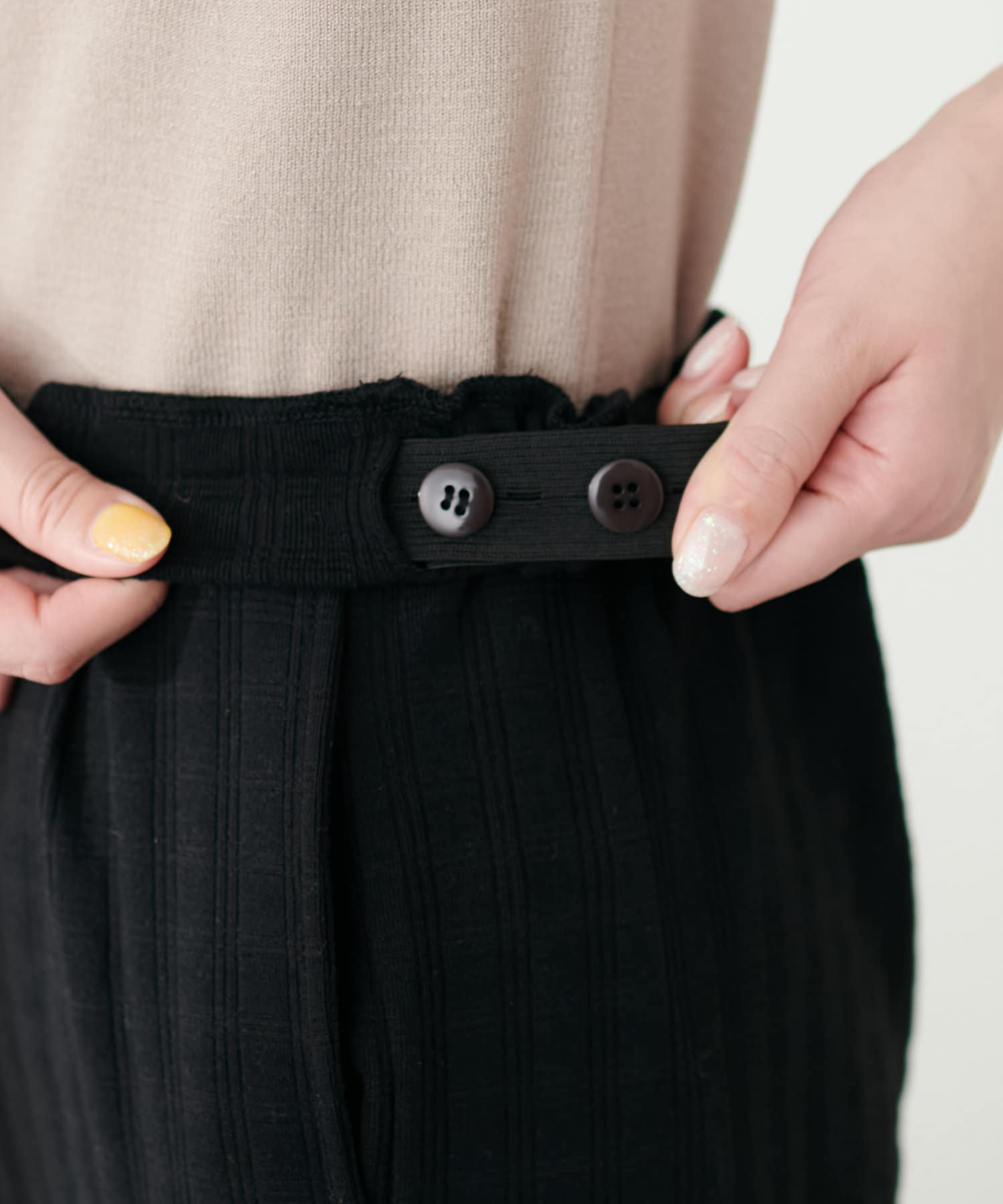 ウエストゴムには一周ボタンホールがあるのでお好みのウエストで着用頂けます。
