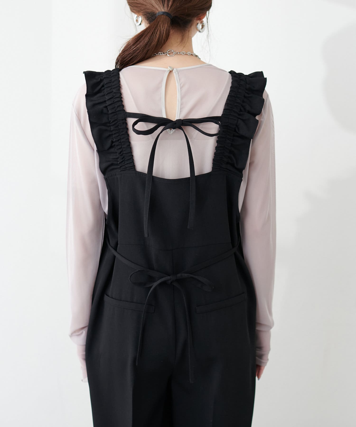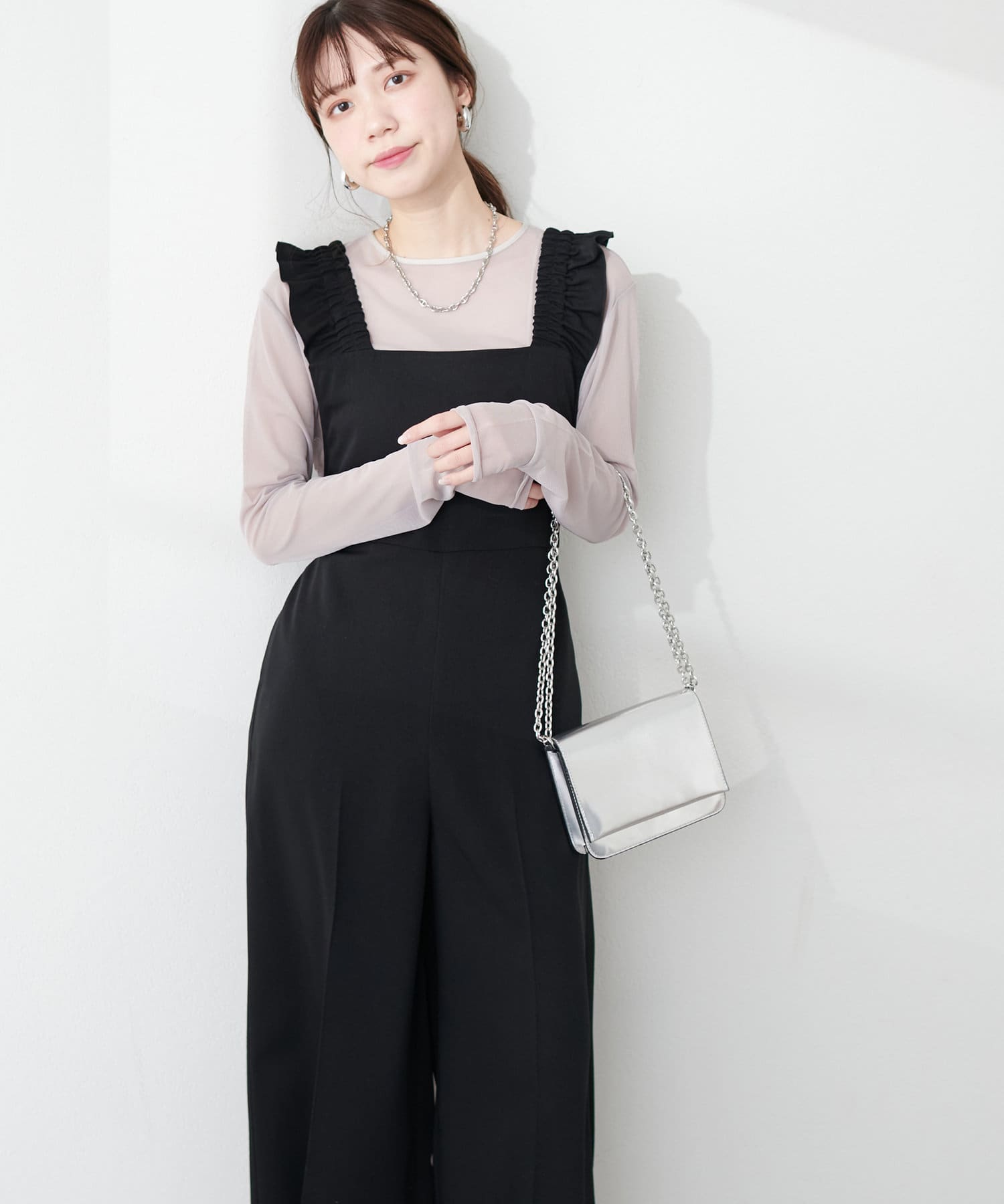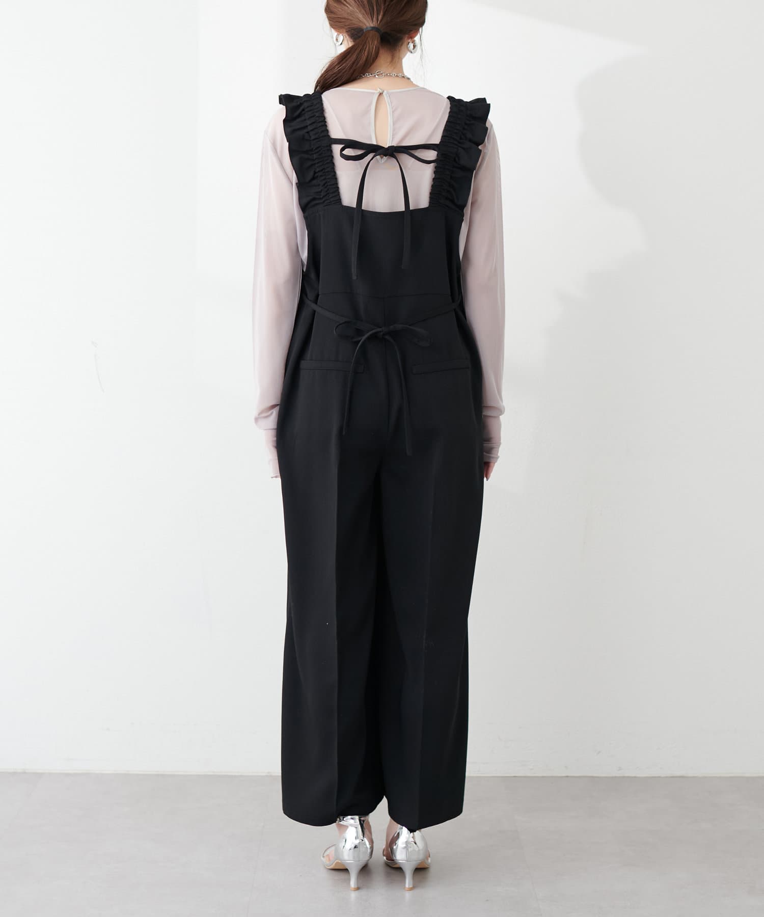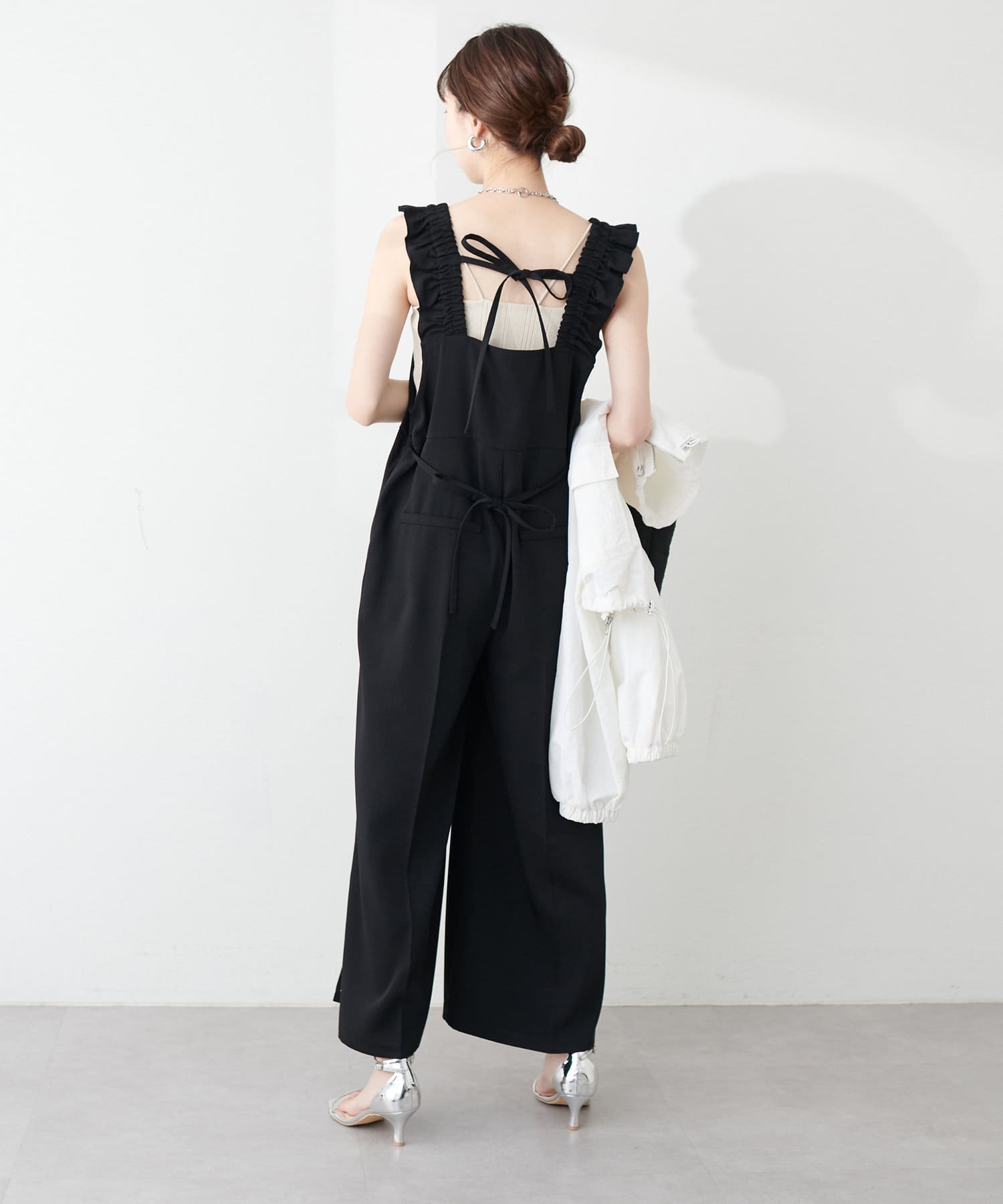 肩ヒモにあしらわれたフリルがフェミニンで印象的なオールインワン。