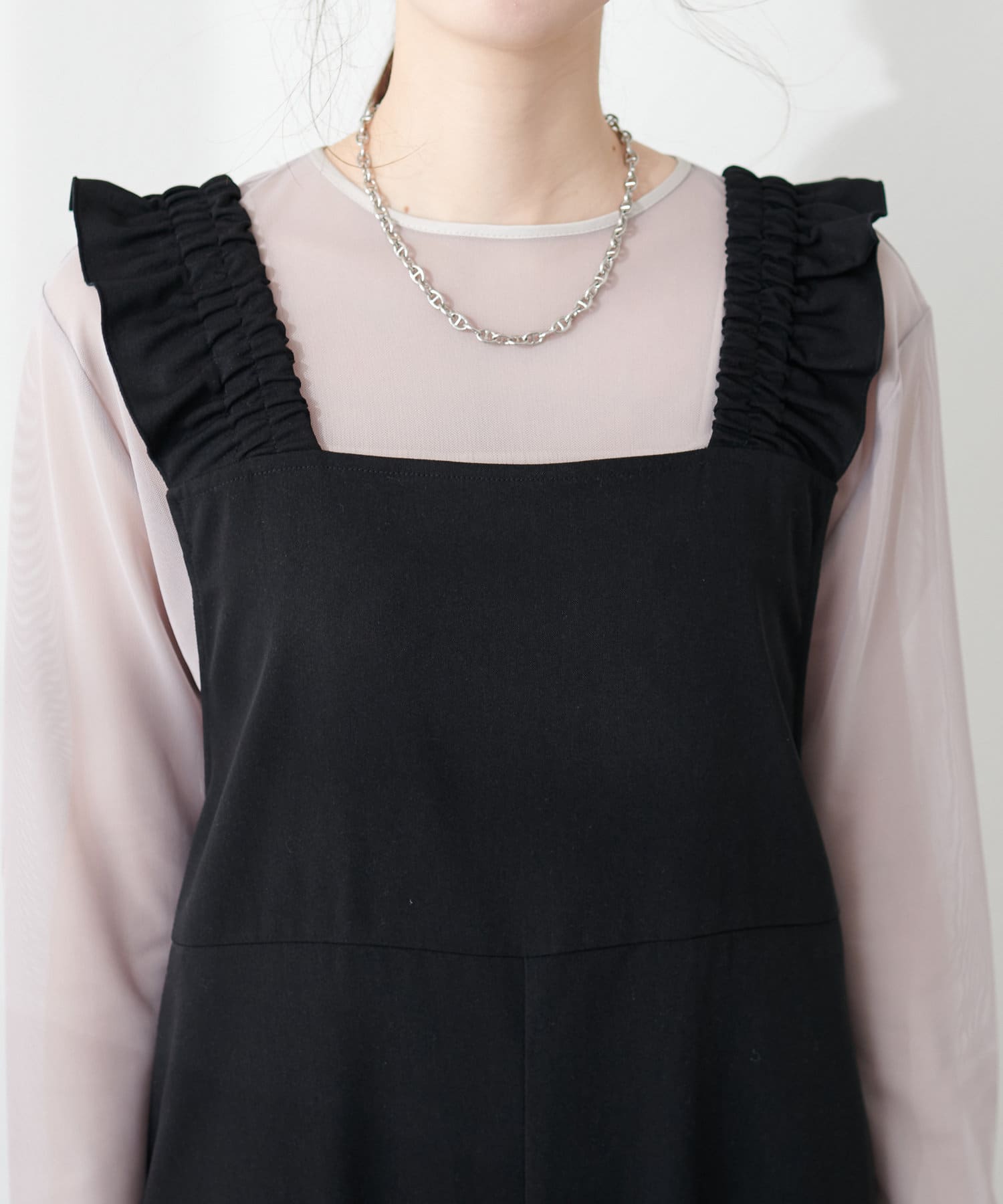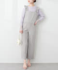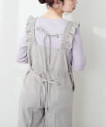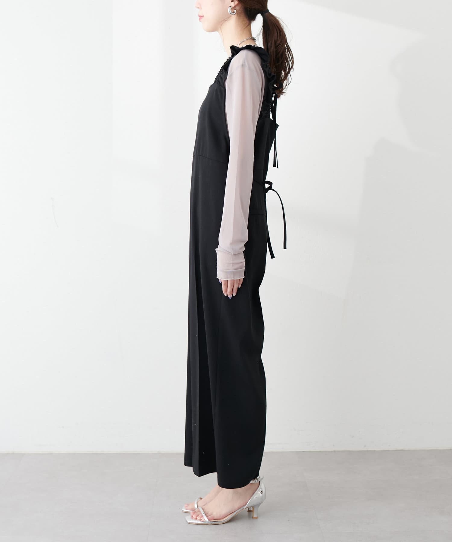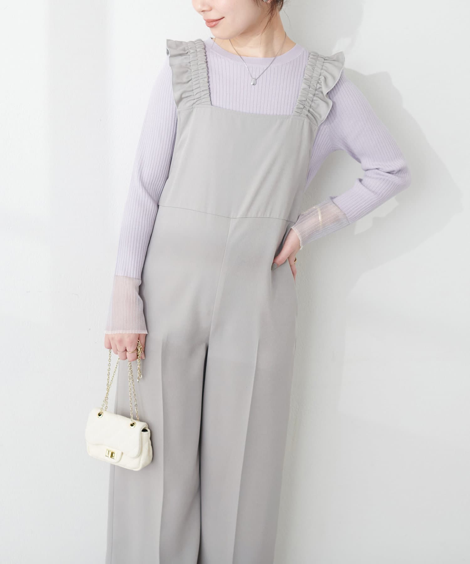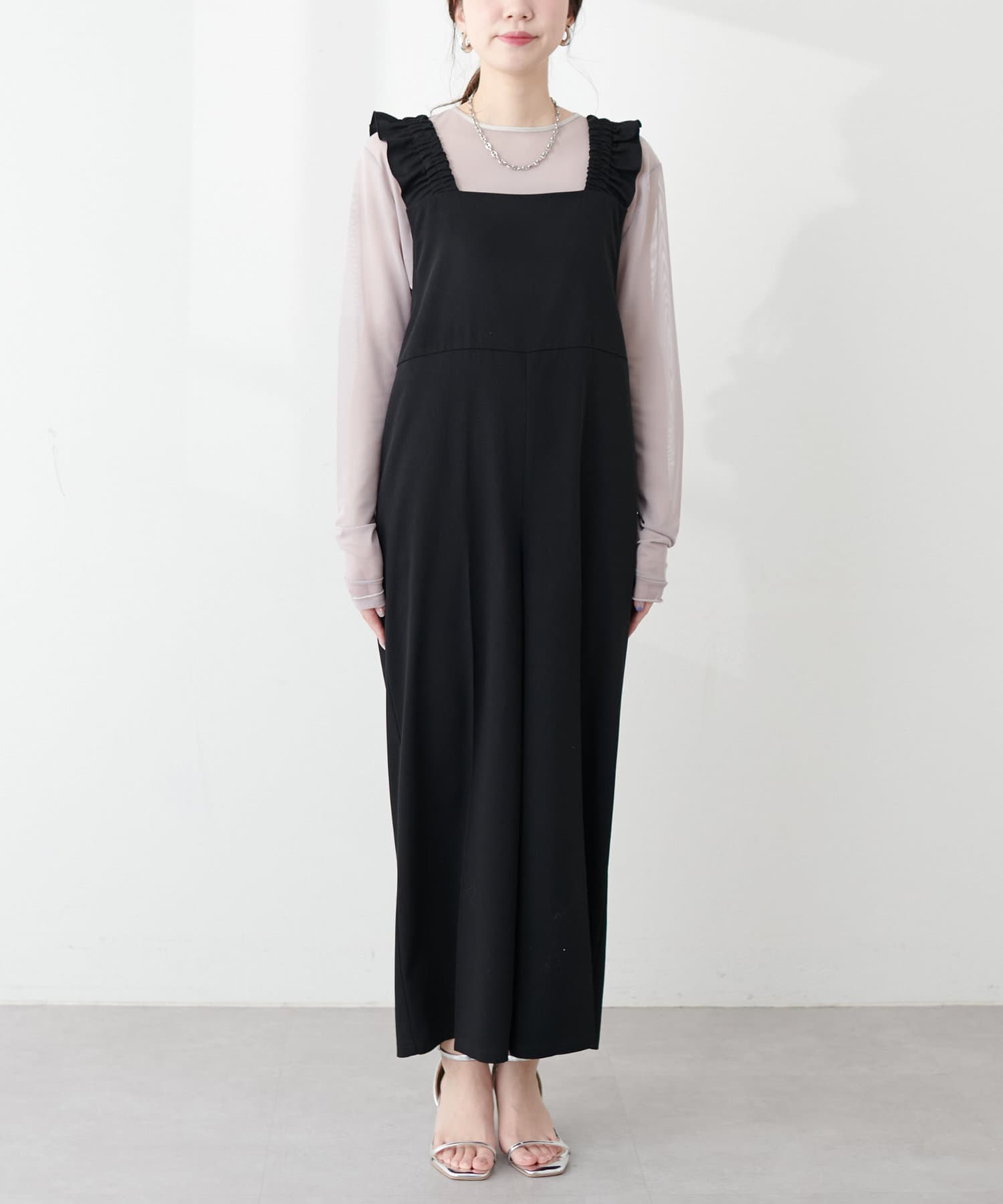 肩ヒモにあしらわれたフリルがフェミニンで印象的なオールインワン。