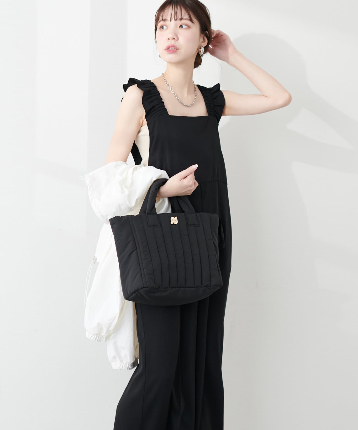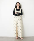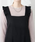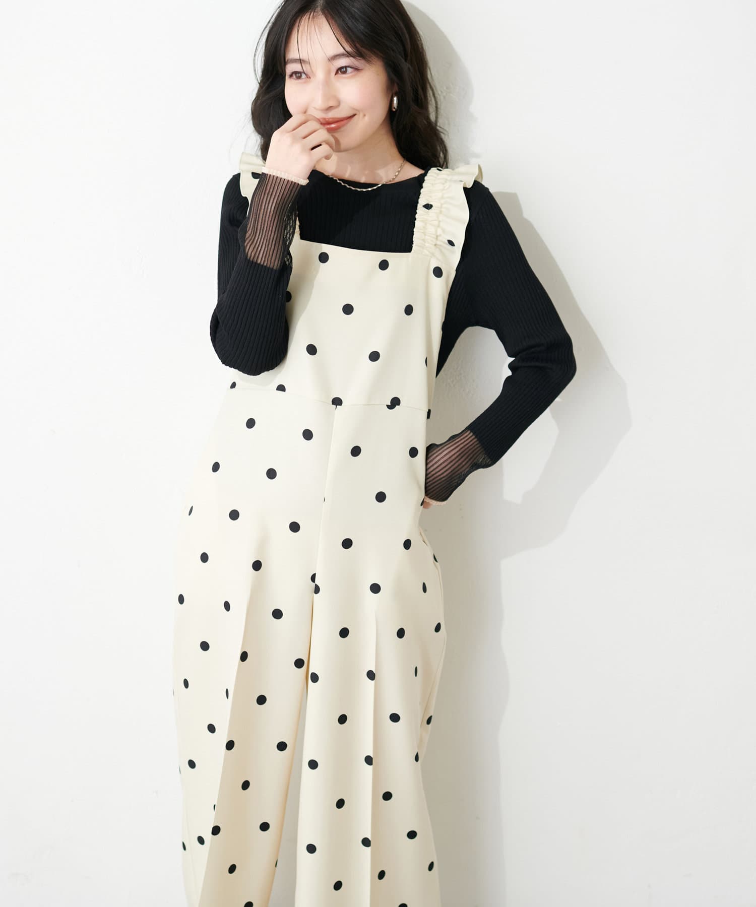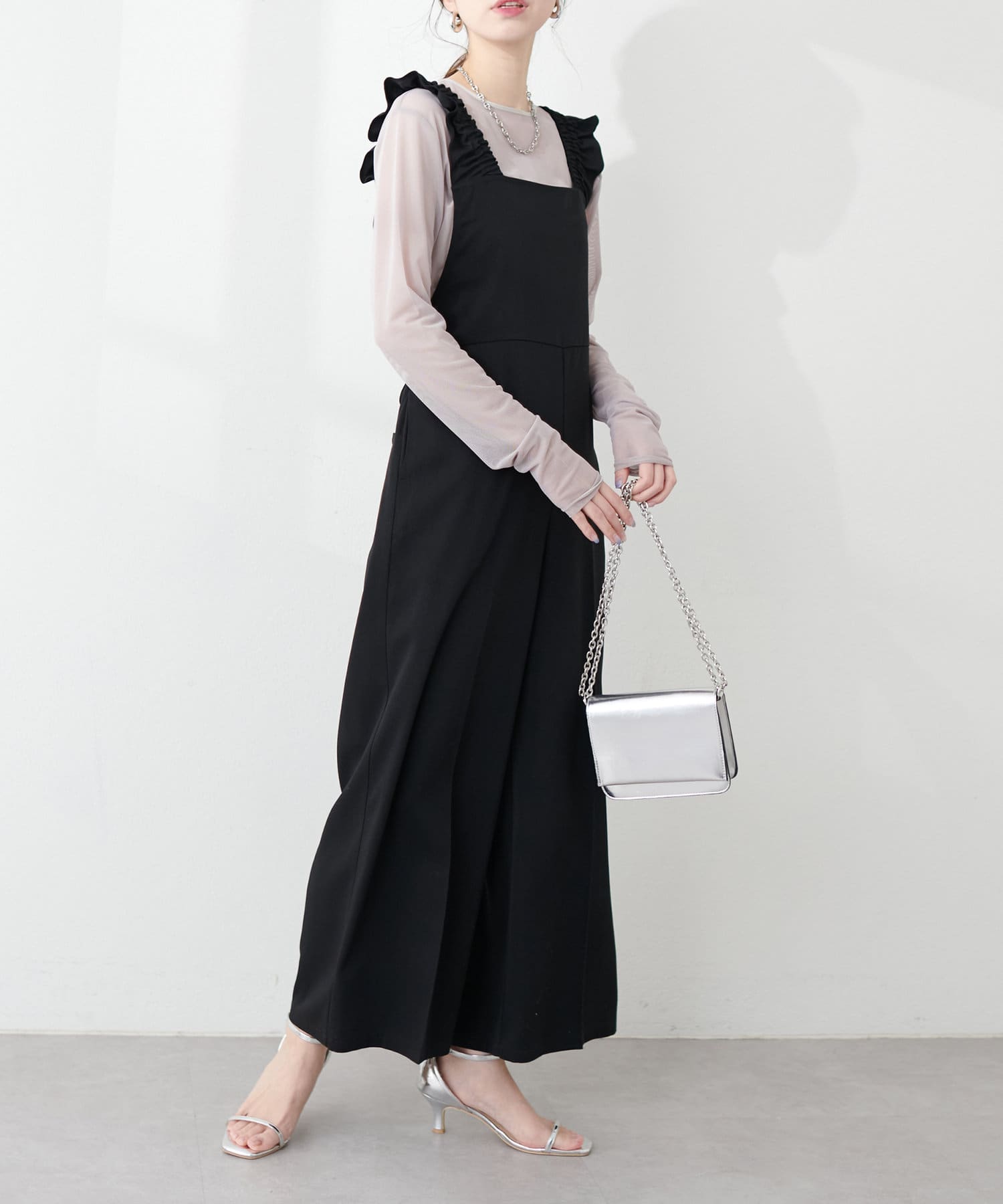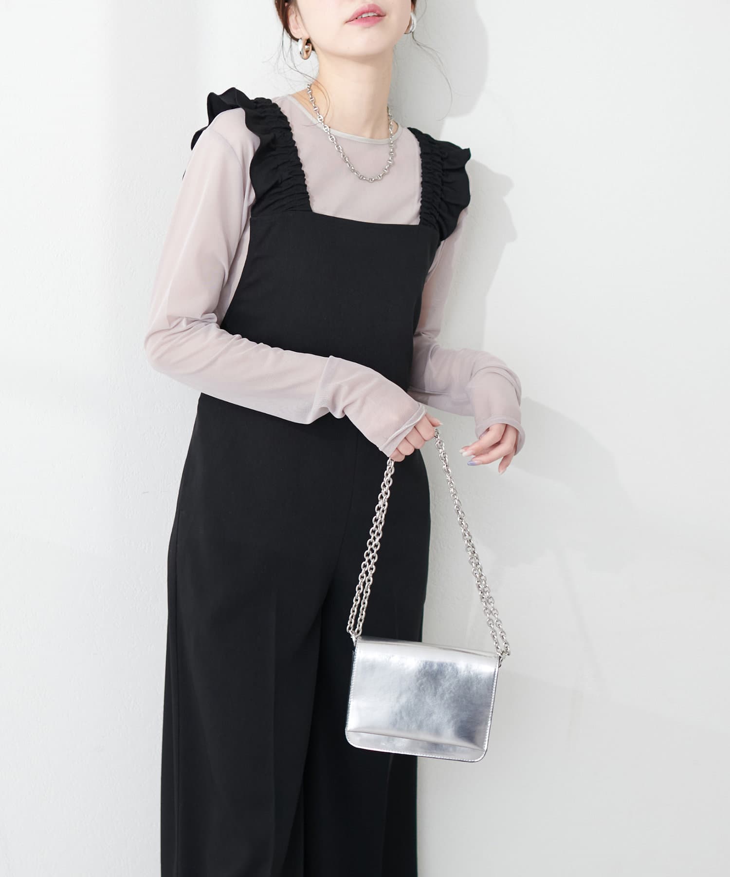 肩ヒモにあしらわれたフリルがフェミニンで印象的なオールインワン。