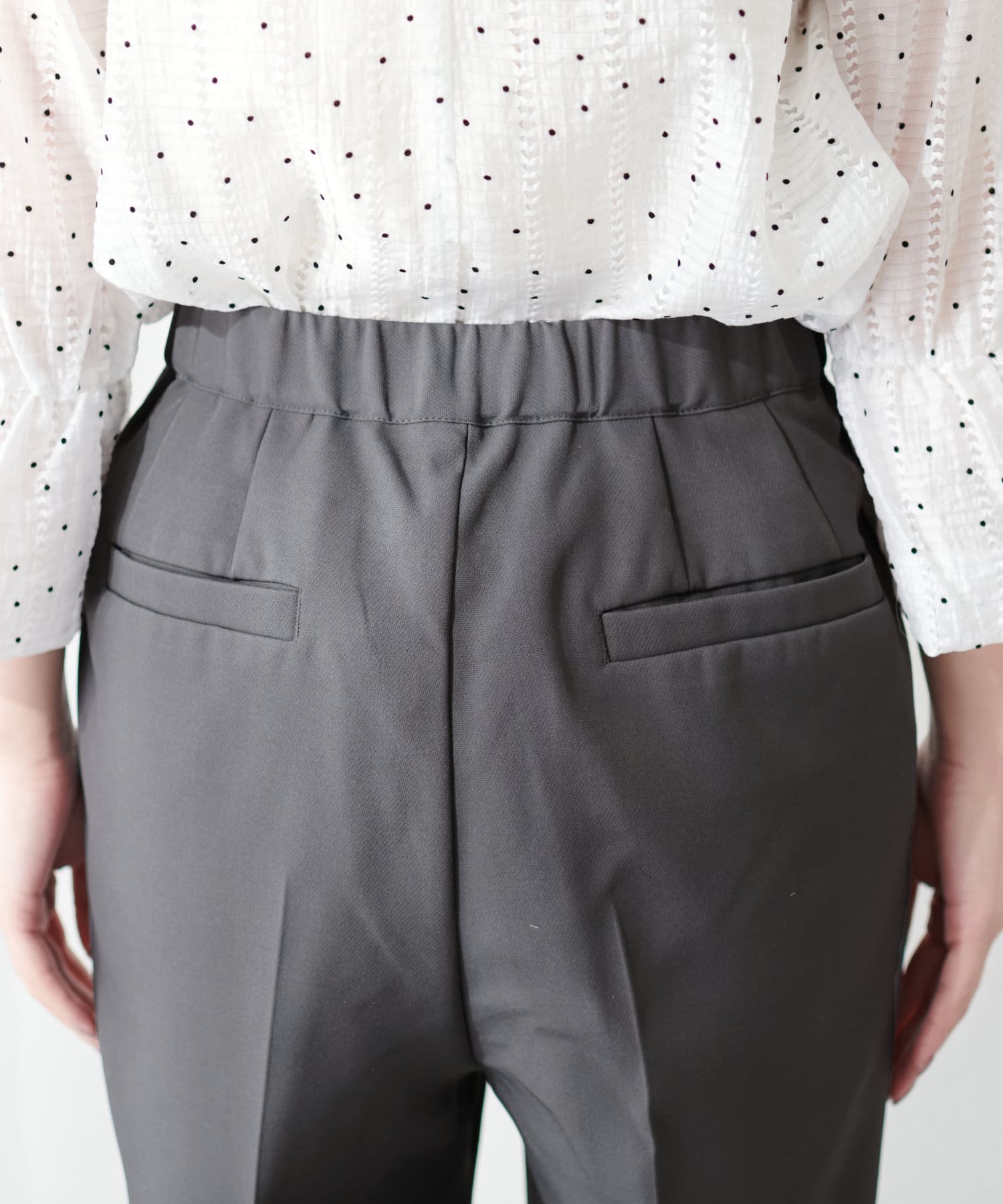 オフィスで着れるキレイメパンツ。ハイウエストで着れて、腰回りのふくらみを少しでも抑えて着てもらえるようにこだわりました。
