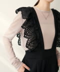 カジュアルになりがちなサロペットですが、スカラップ刺繍フリルで大人ガーリーにお召頂けます。