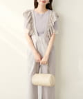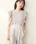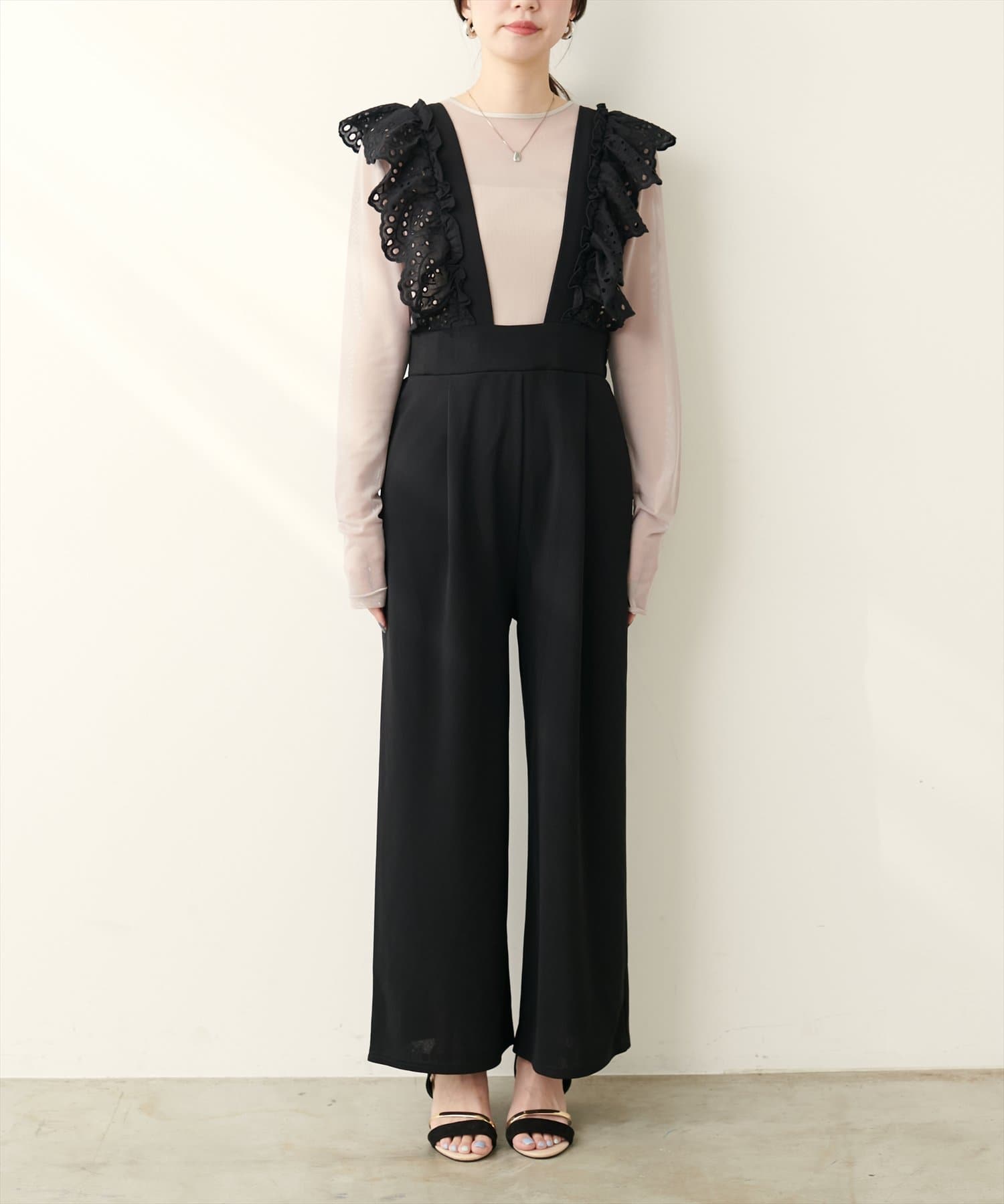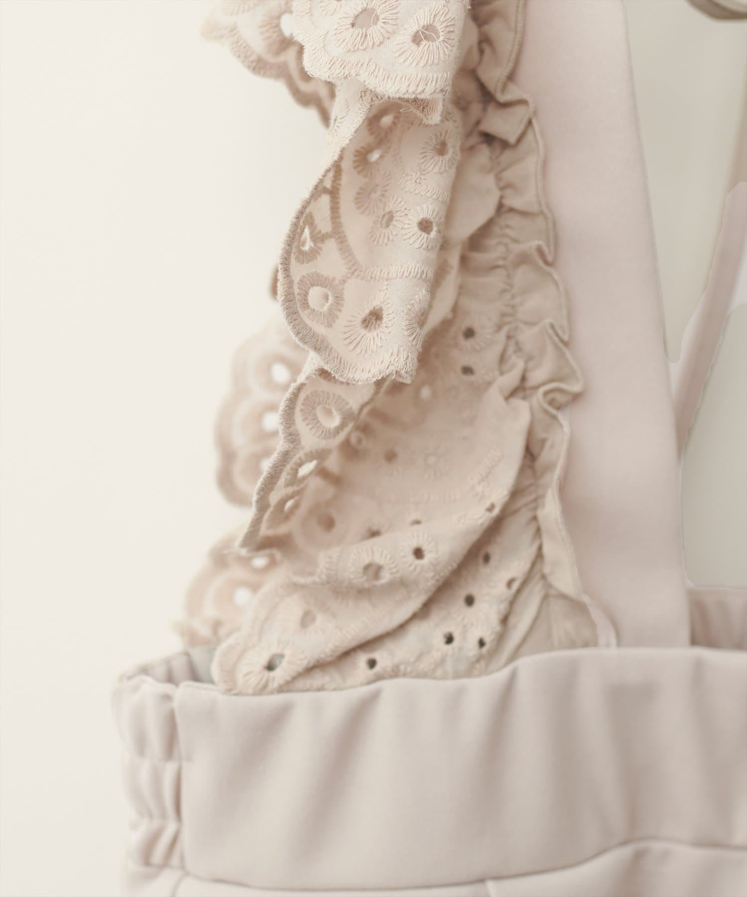 大胆にあしらわれたコットンレースのフリルが目を引くサロペット。