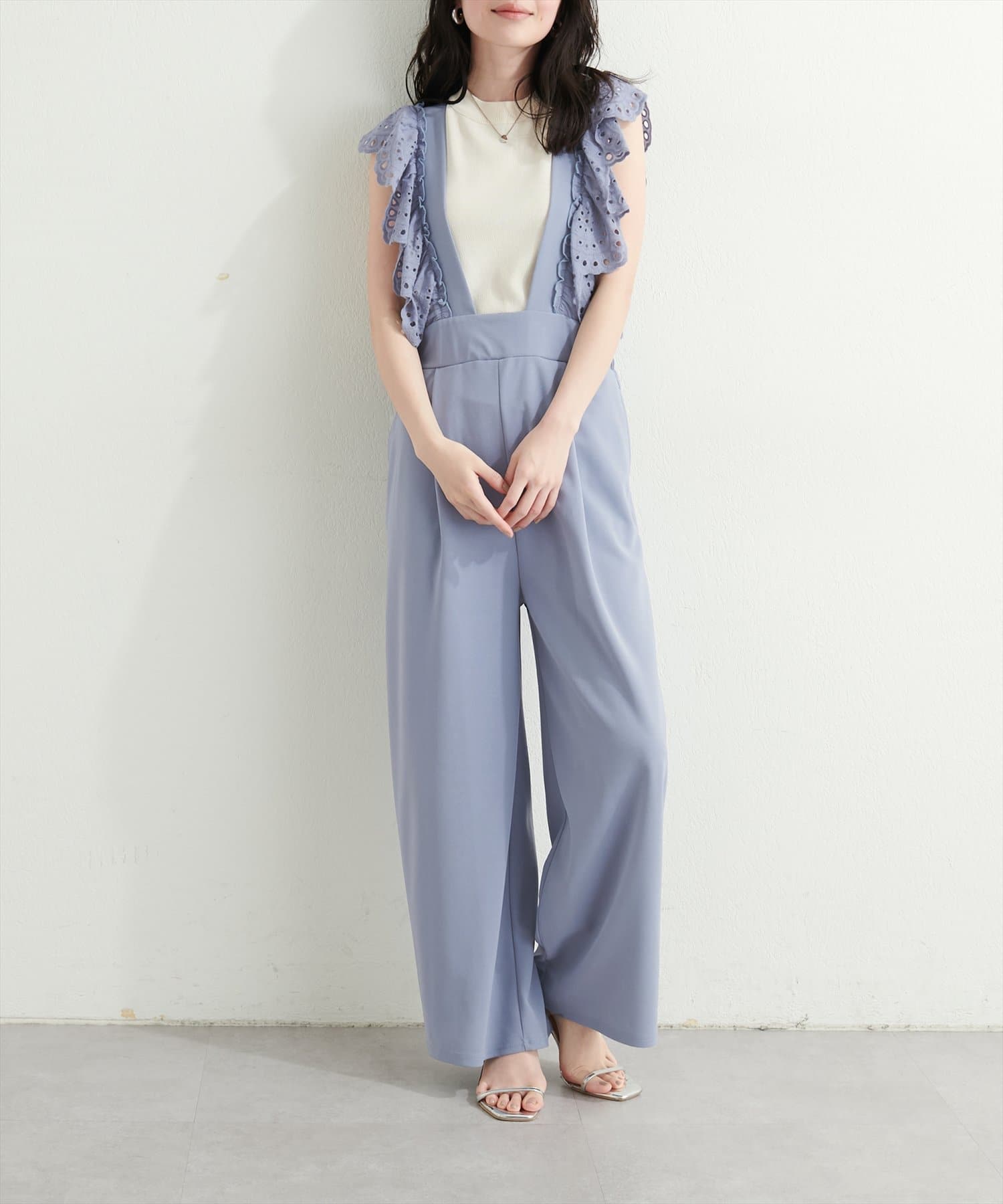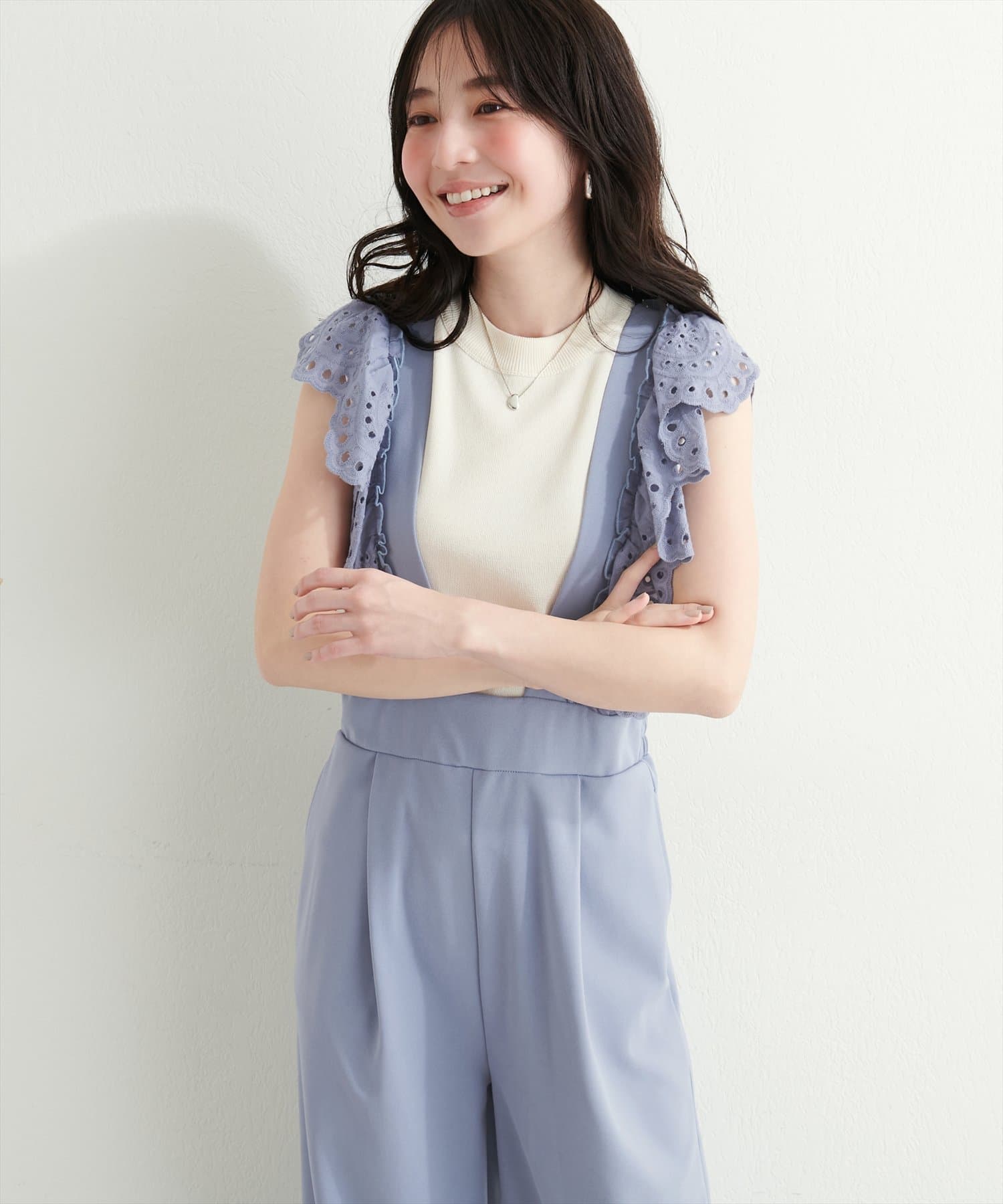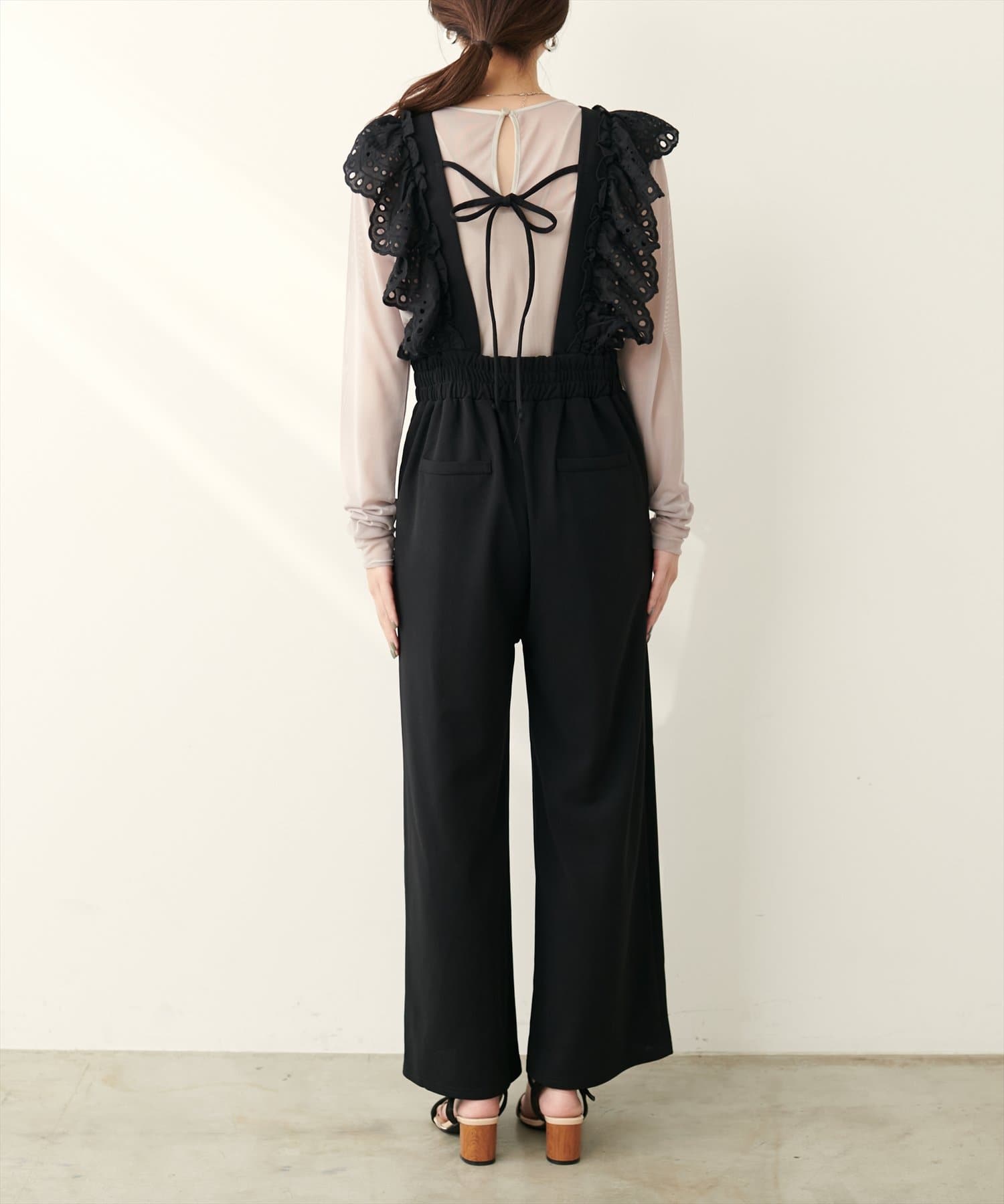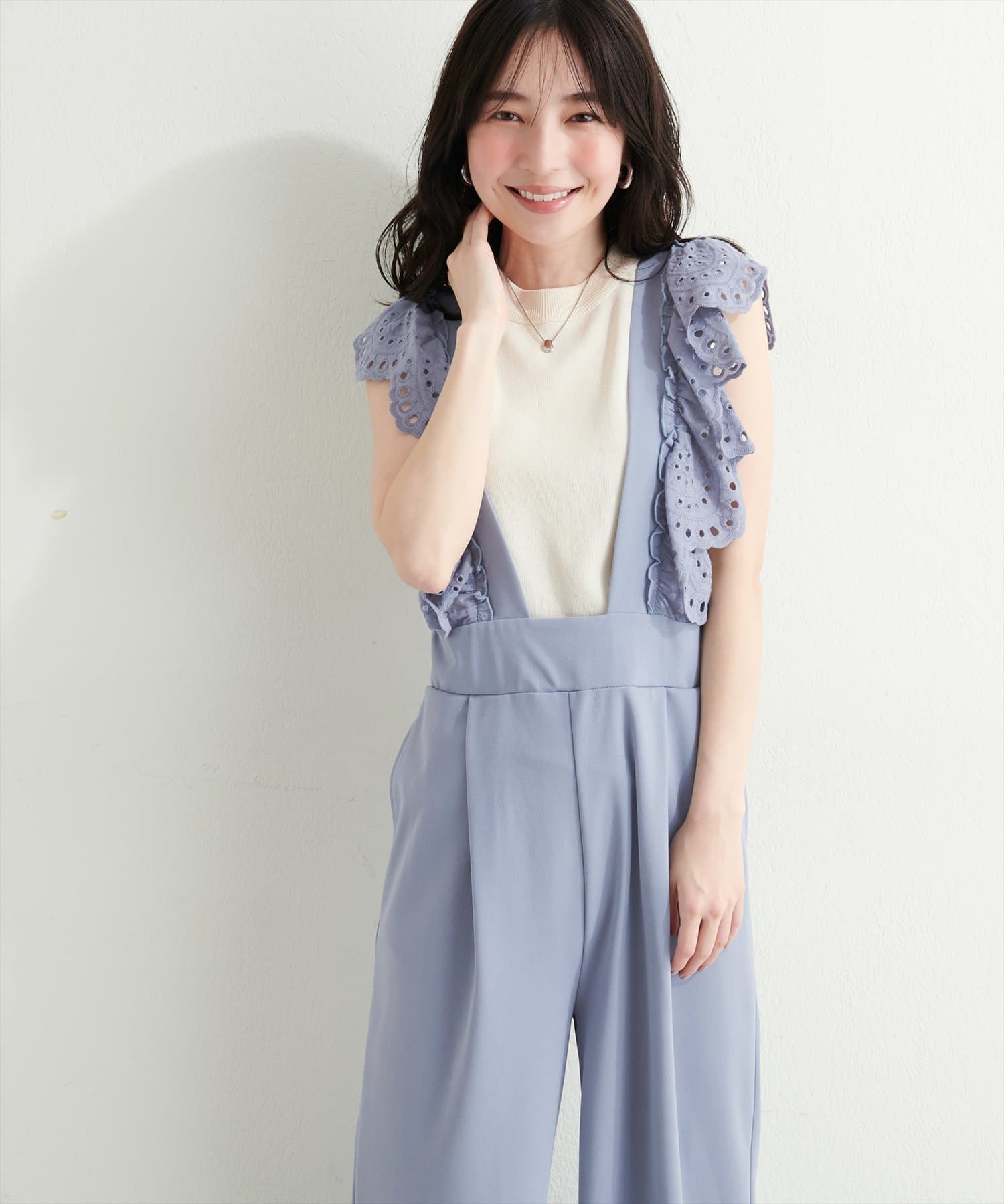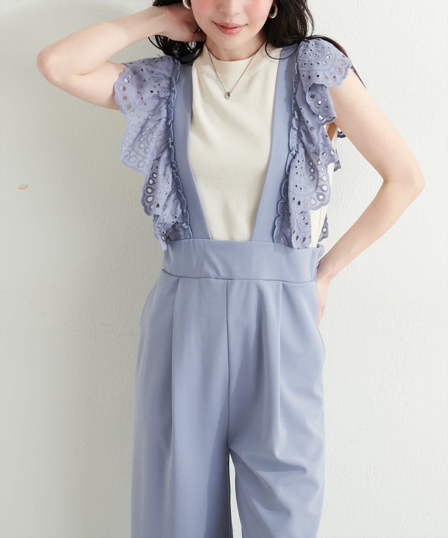カジュアルになりがちなサロペットですが、スカラップ刺繍フリルで大人ガーリーにお召頂けます。