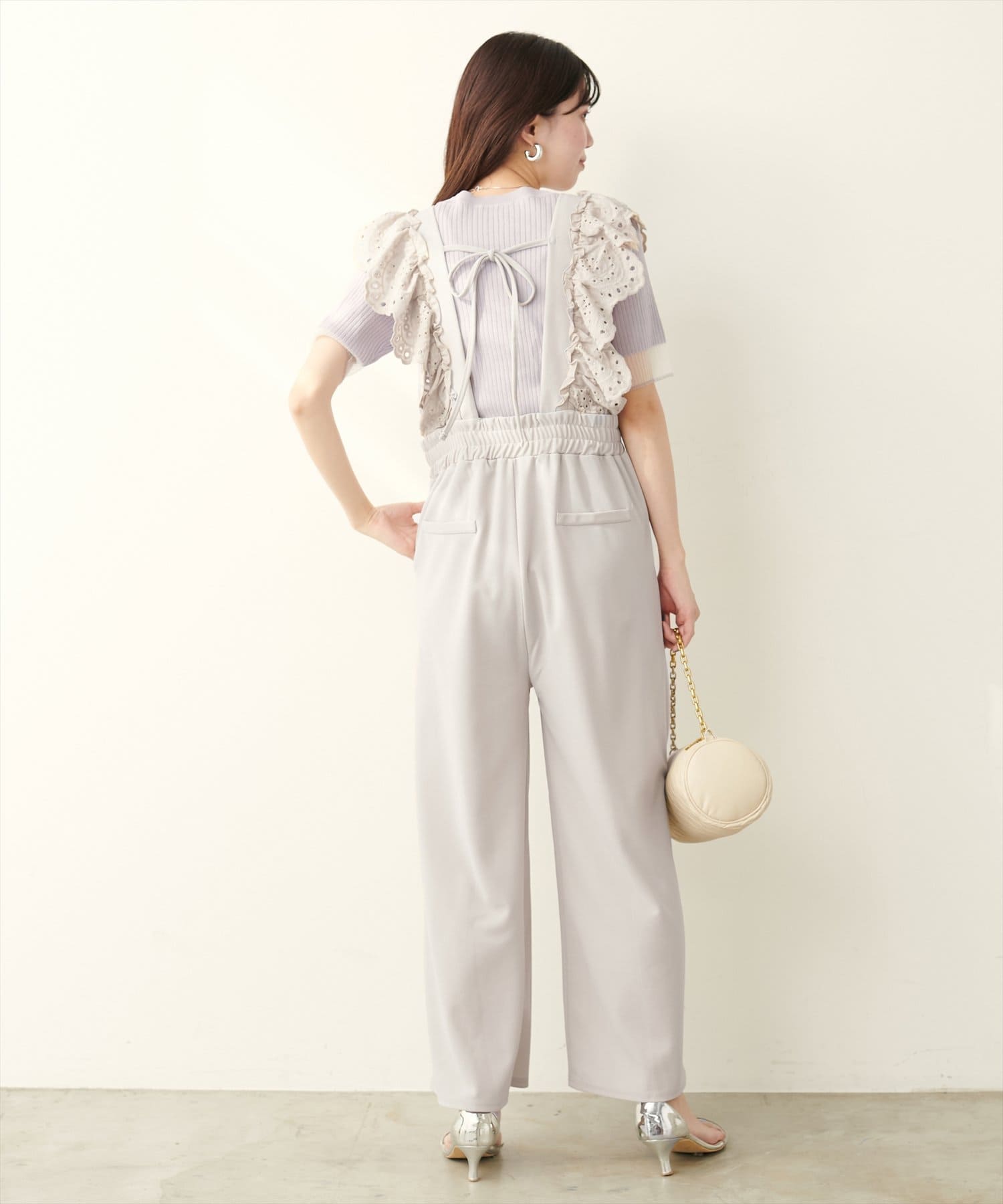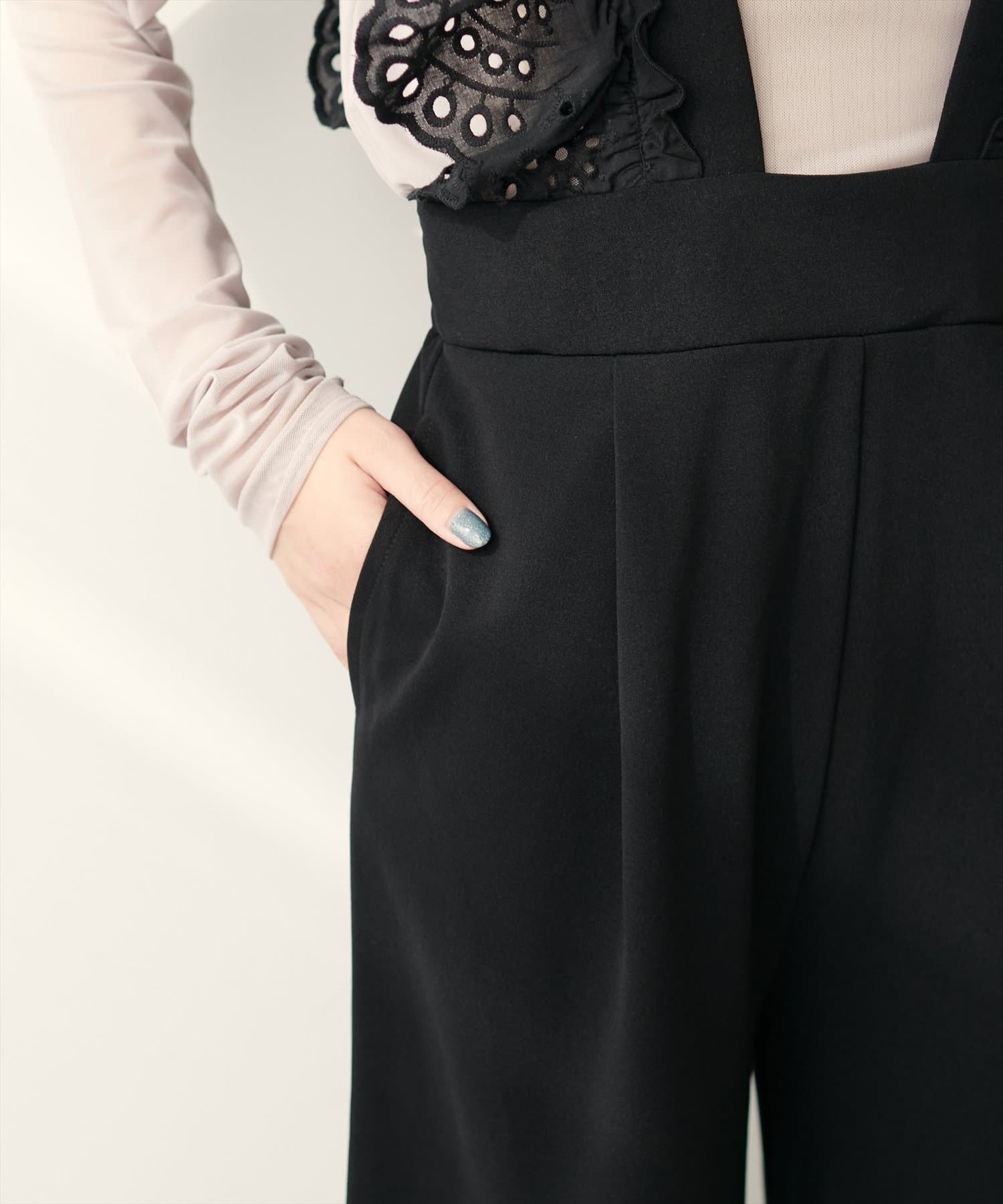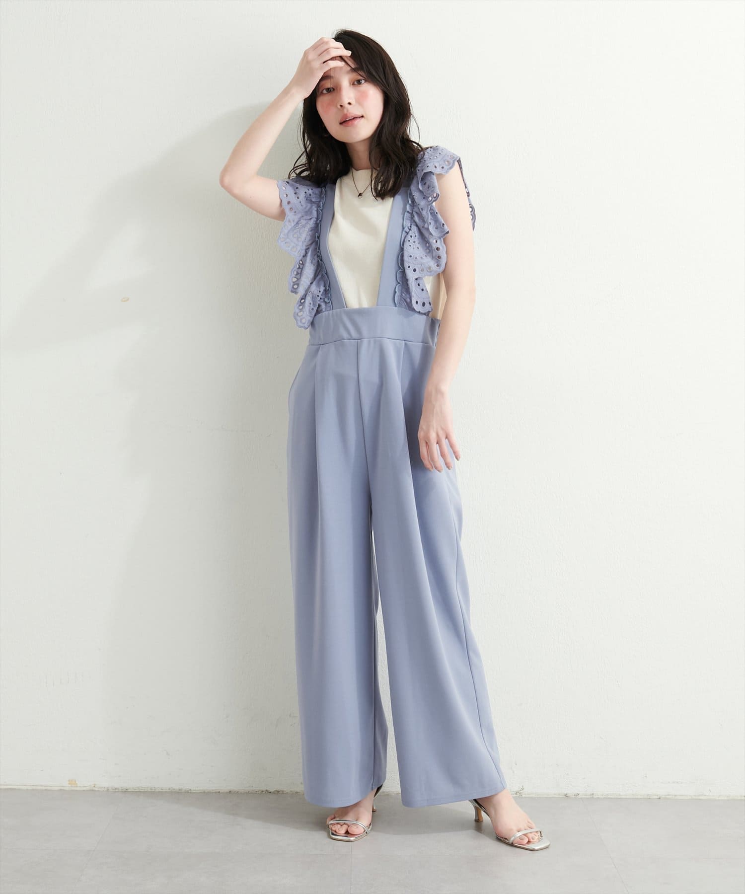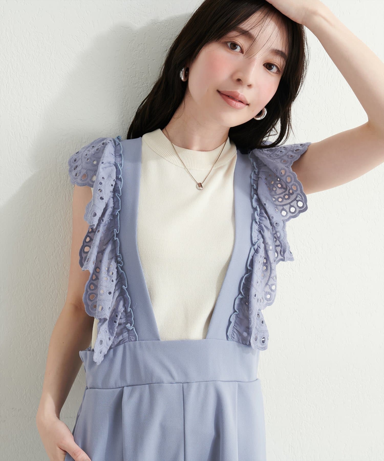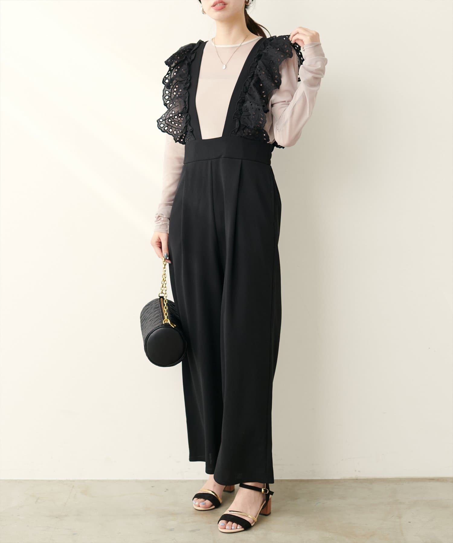 カジュアルになりがちなサロペットですが、スカラップ刺繍フリルで大人ガーリーにお召頂けます。