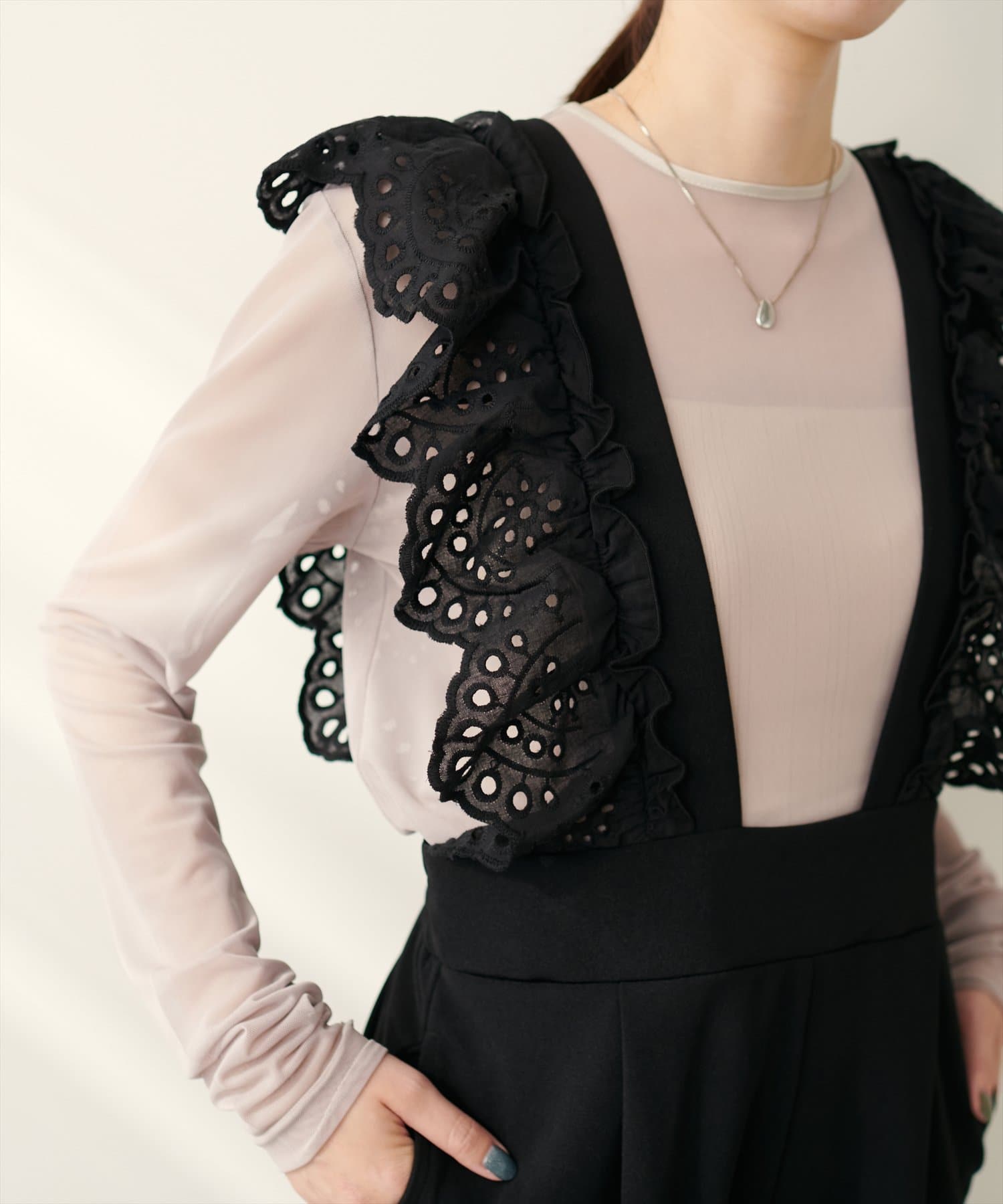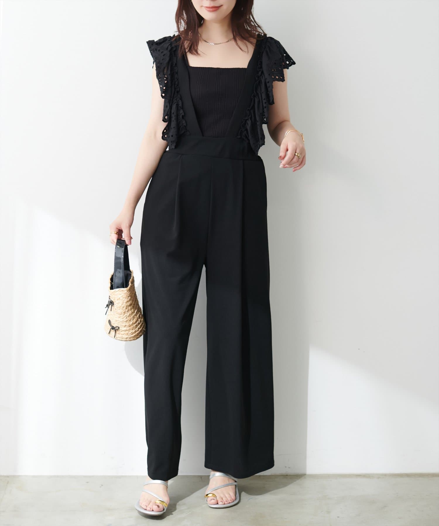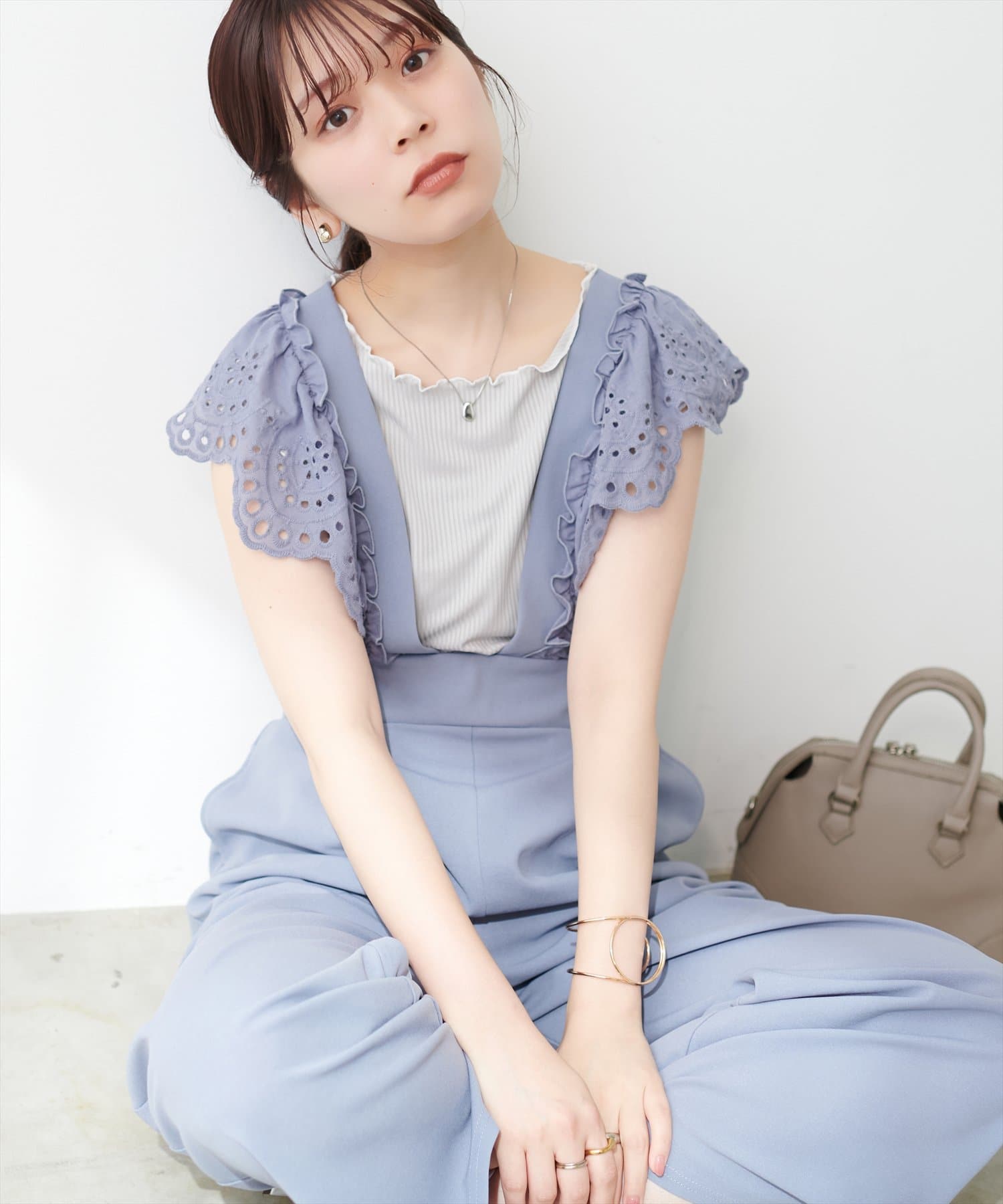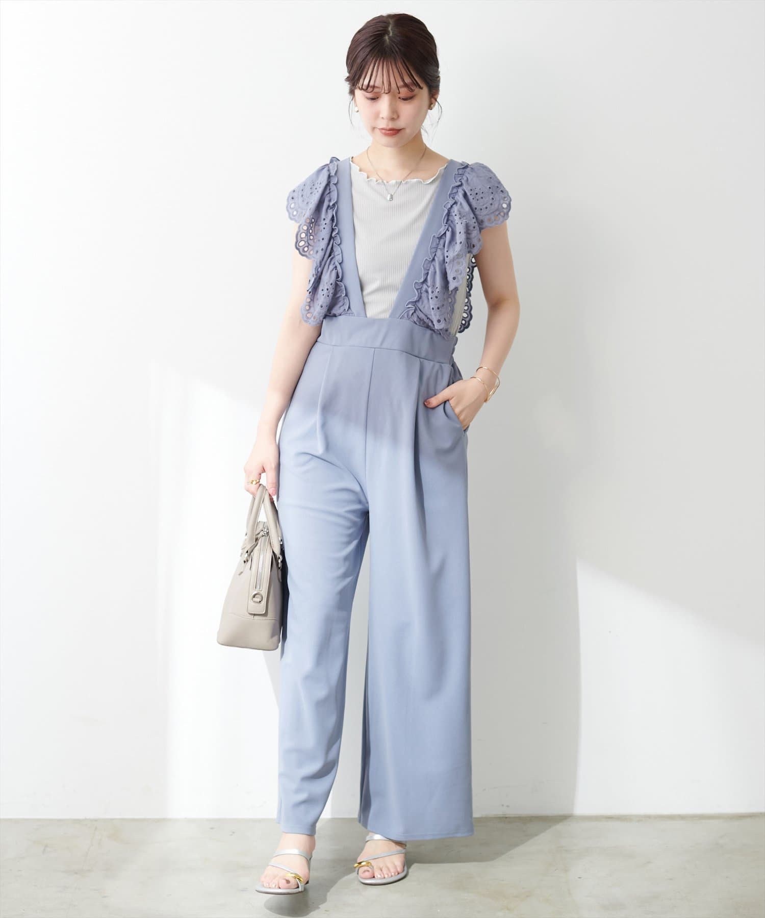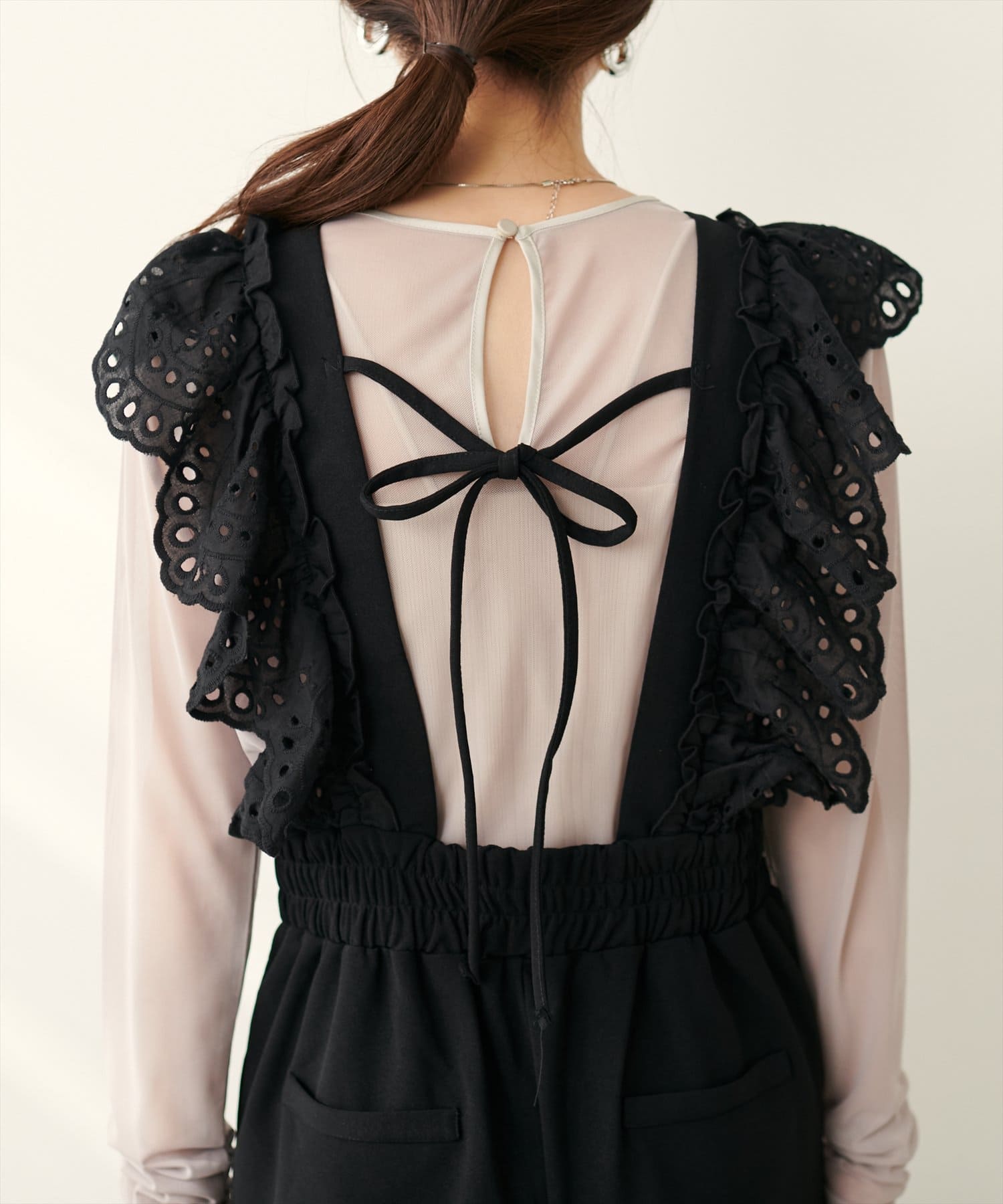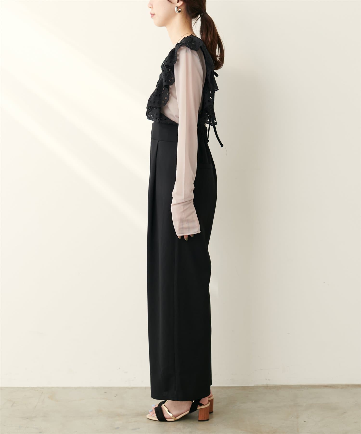 カジュアルになりがちなサロペットですが、スカラップ刺繍フリルで大人ガーリーにお召頂けます。