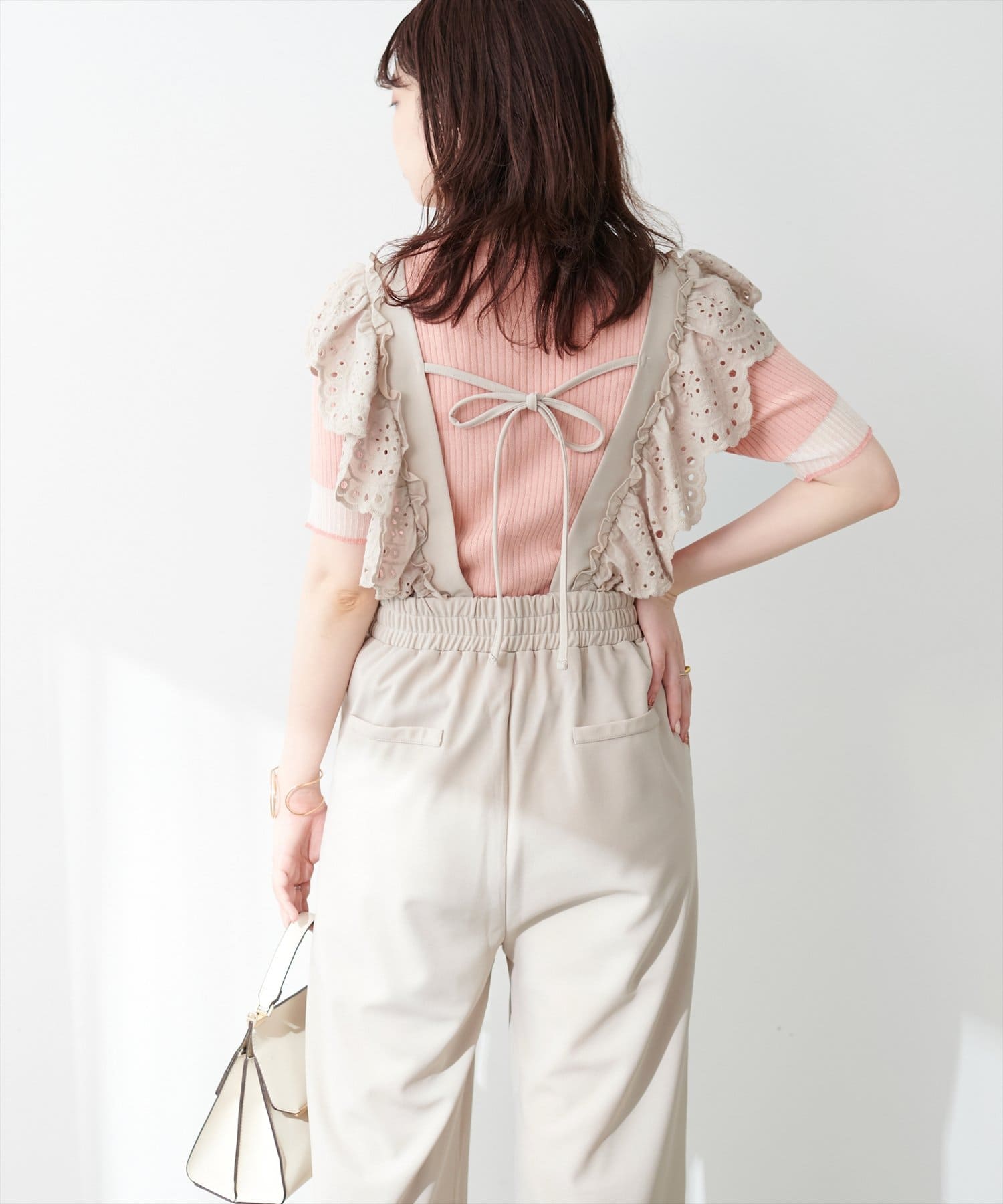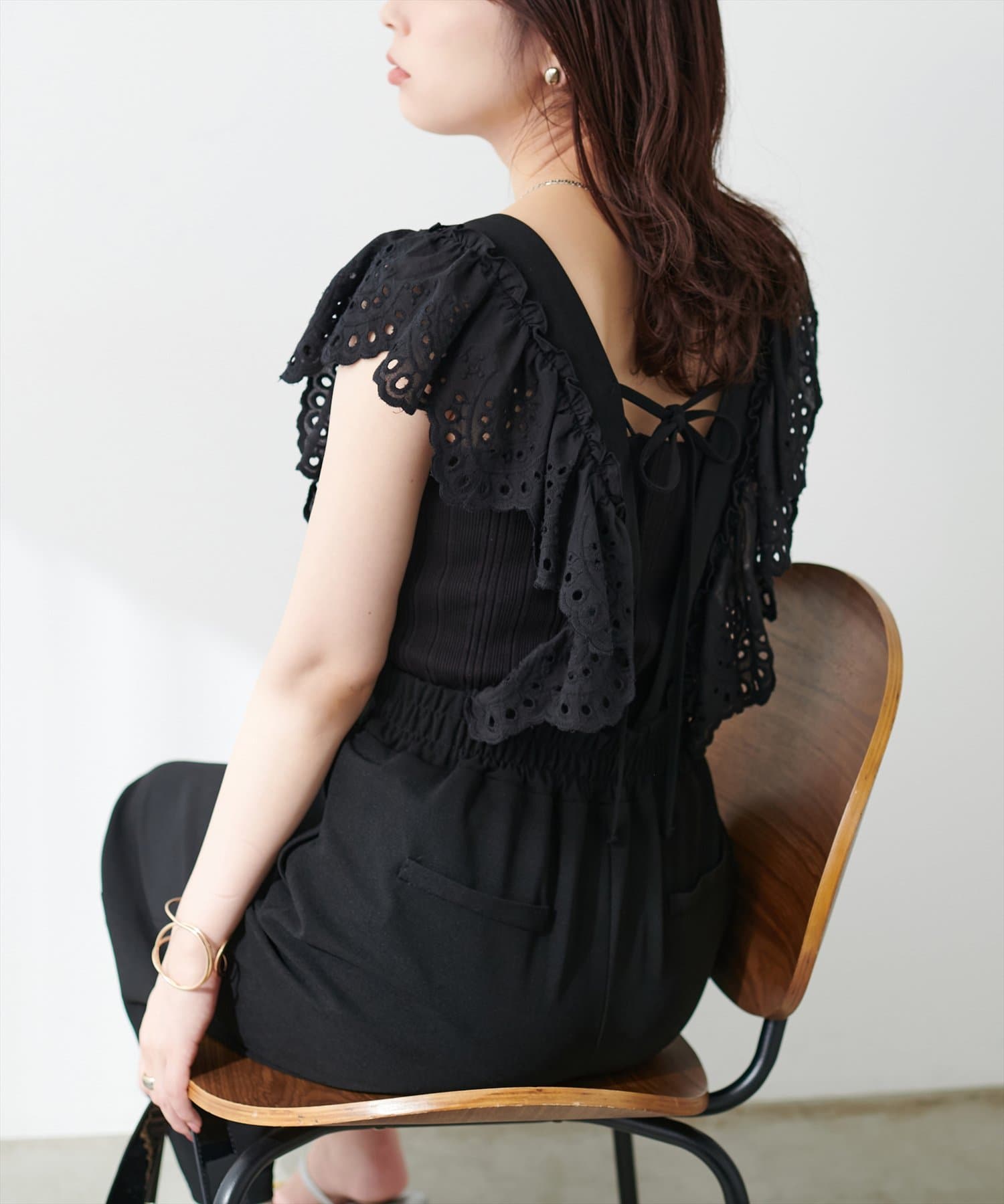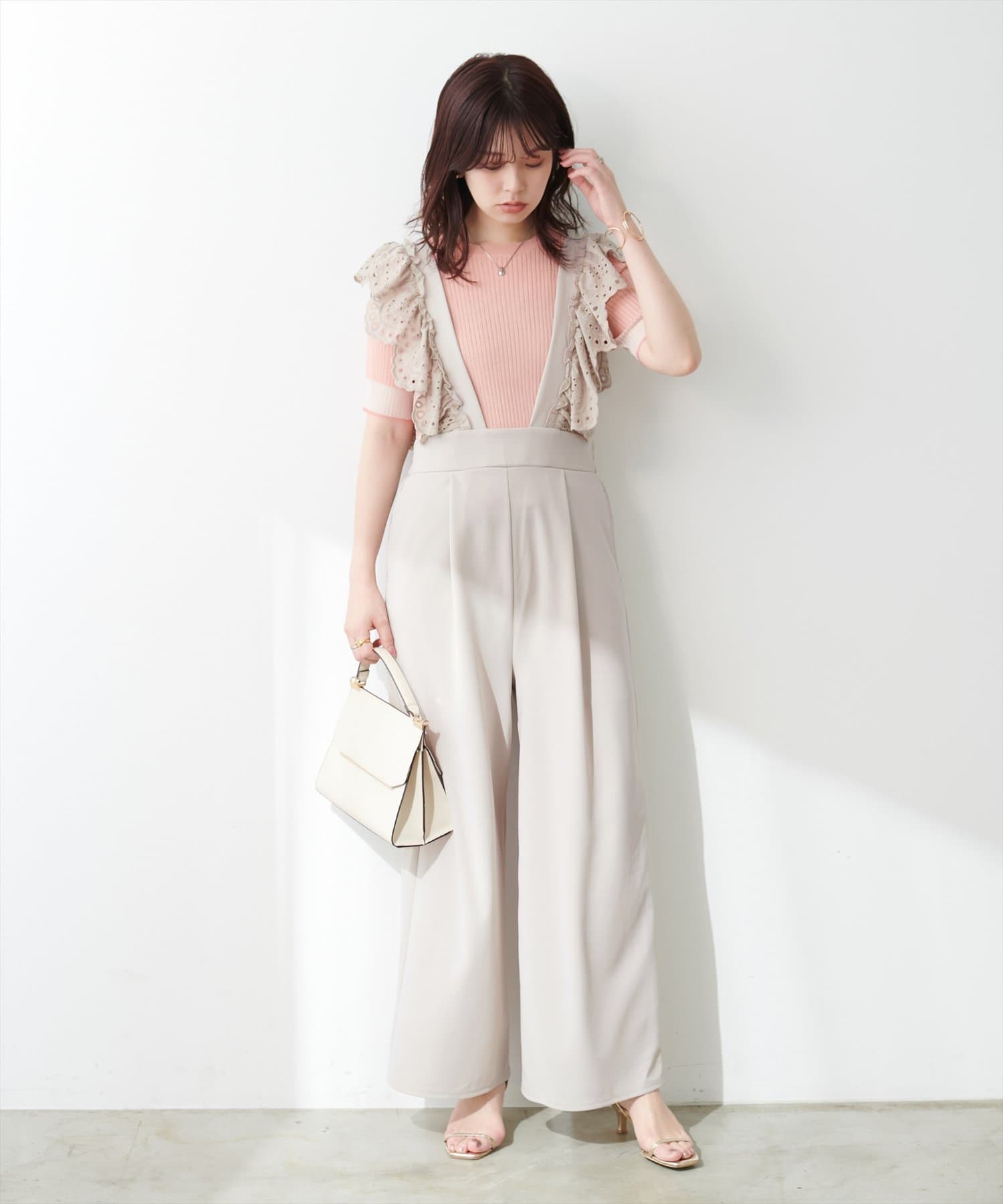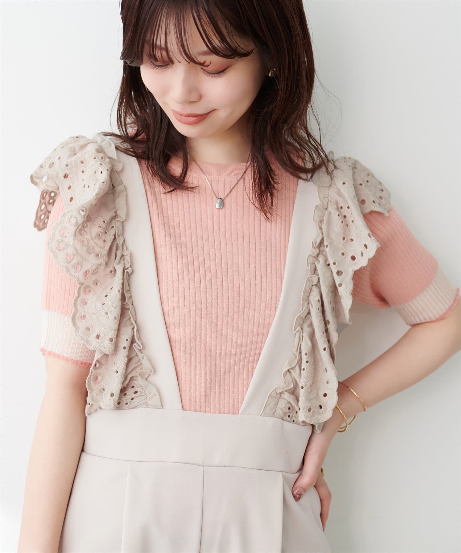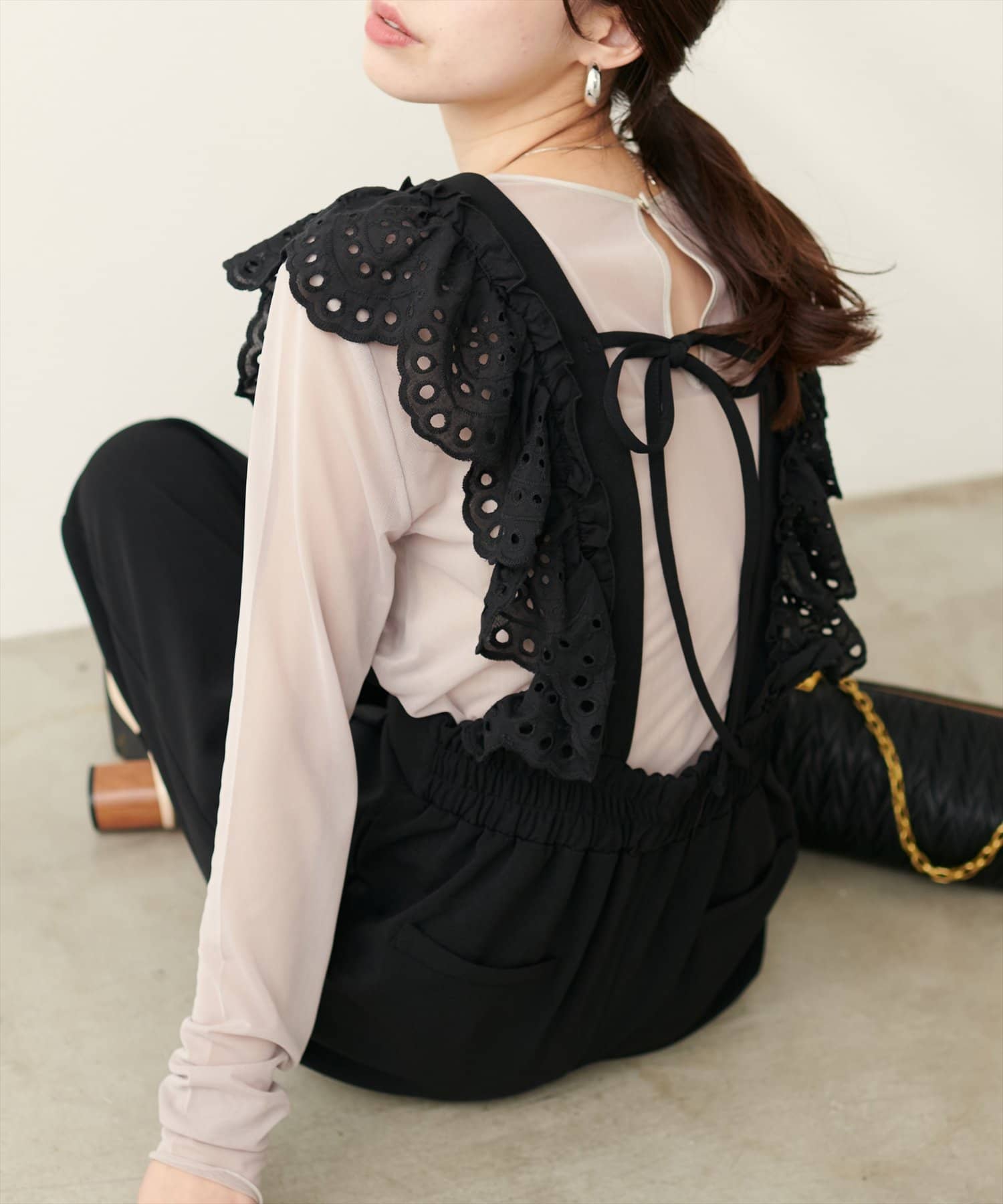 カジュアルになりがちなサロペットですが、スカラップ刺繍フリルで大人ガーリーにお召頂けます。