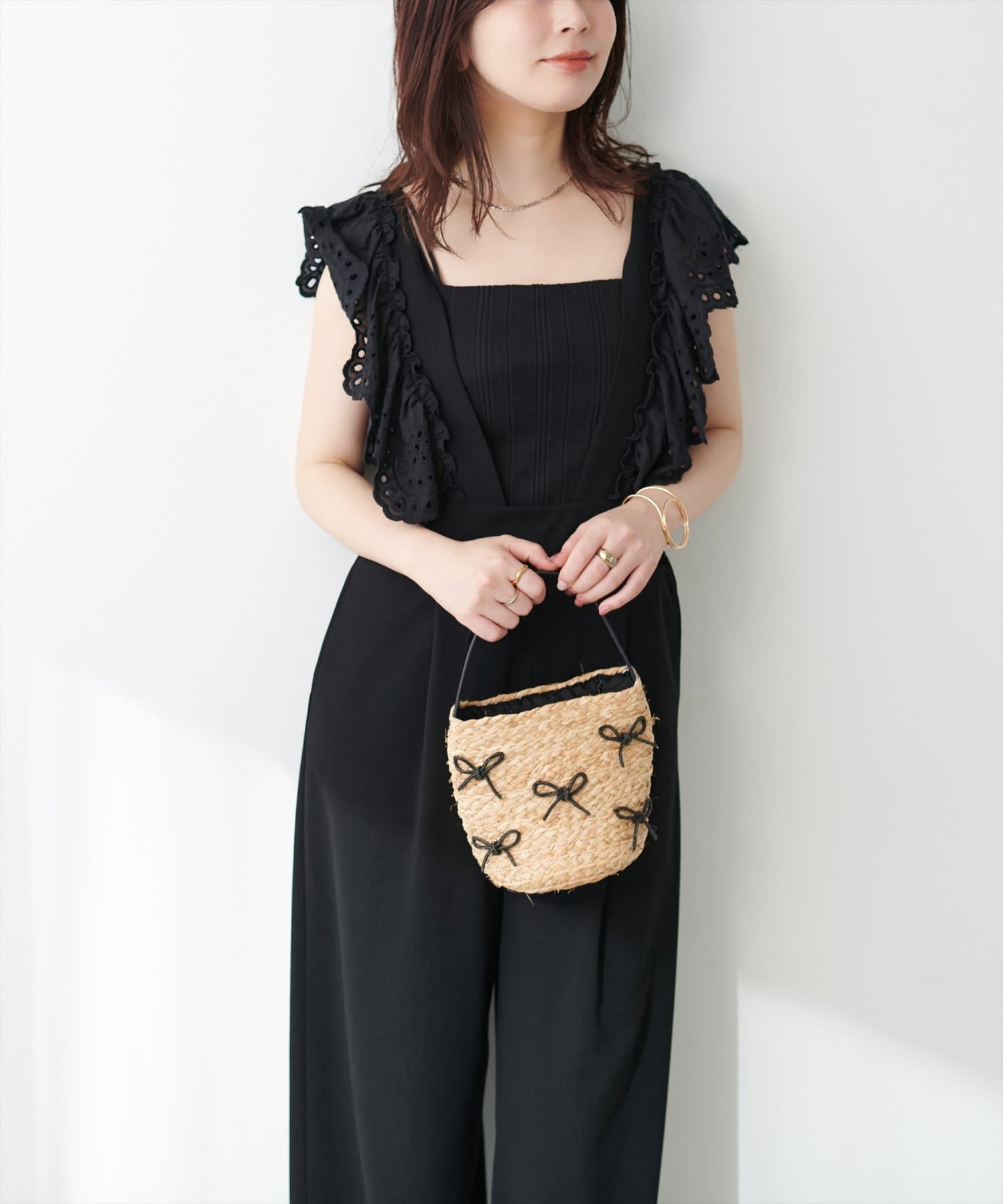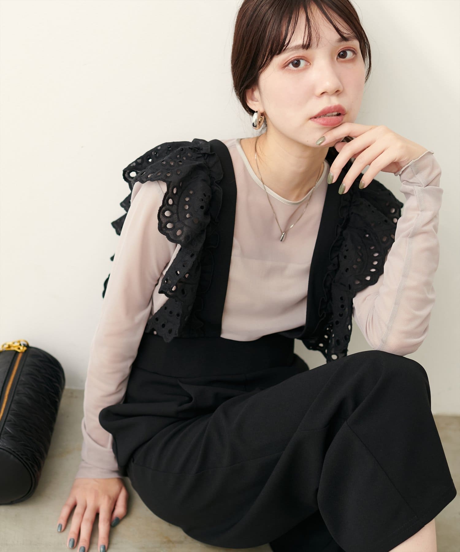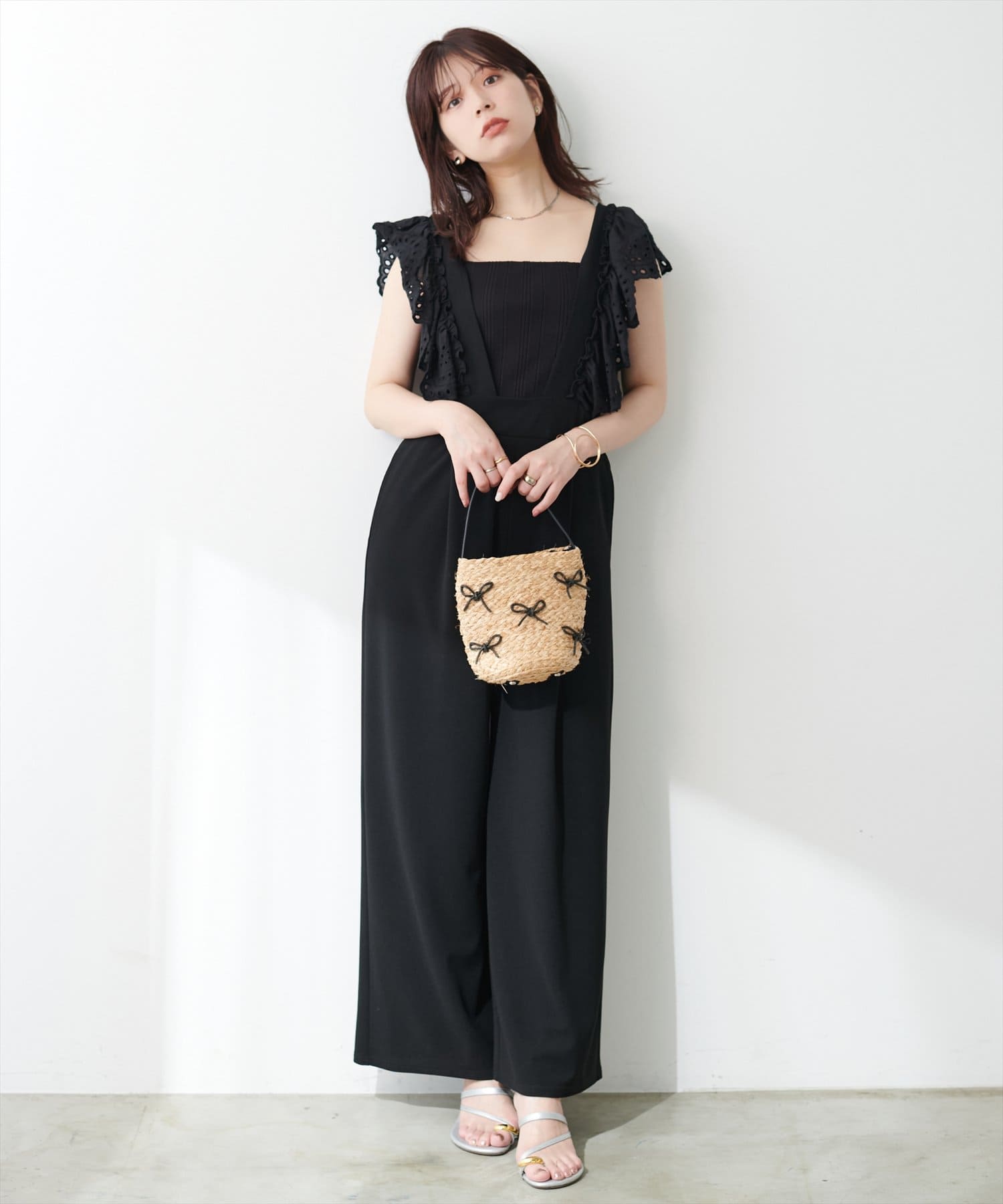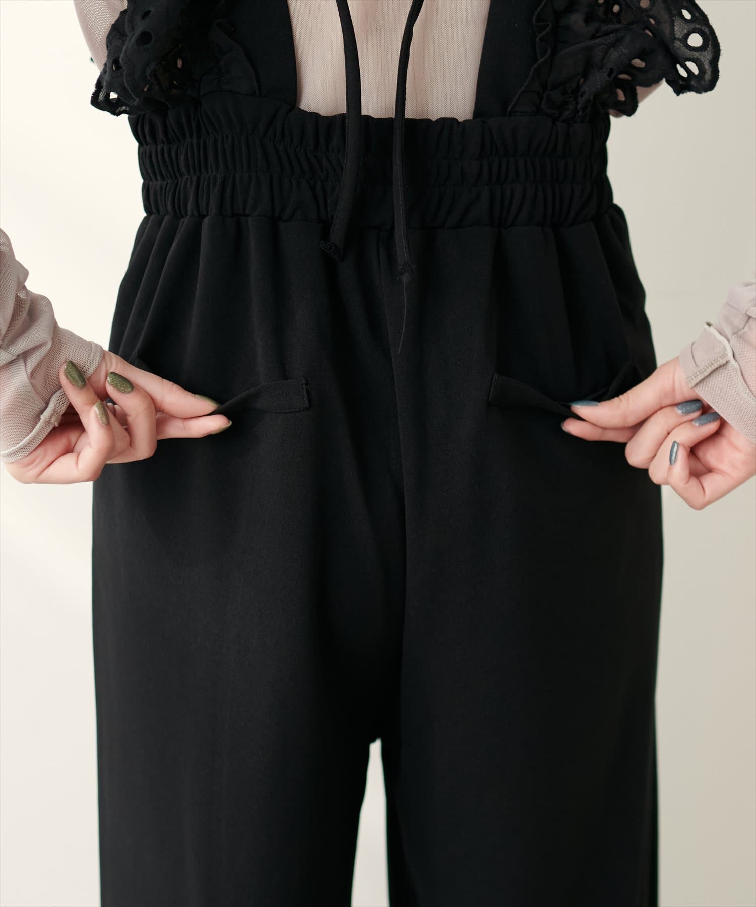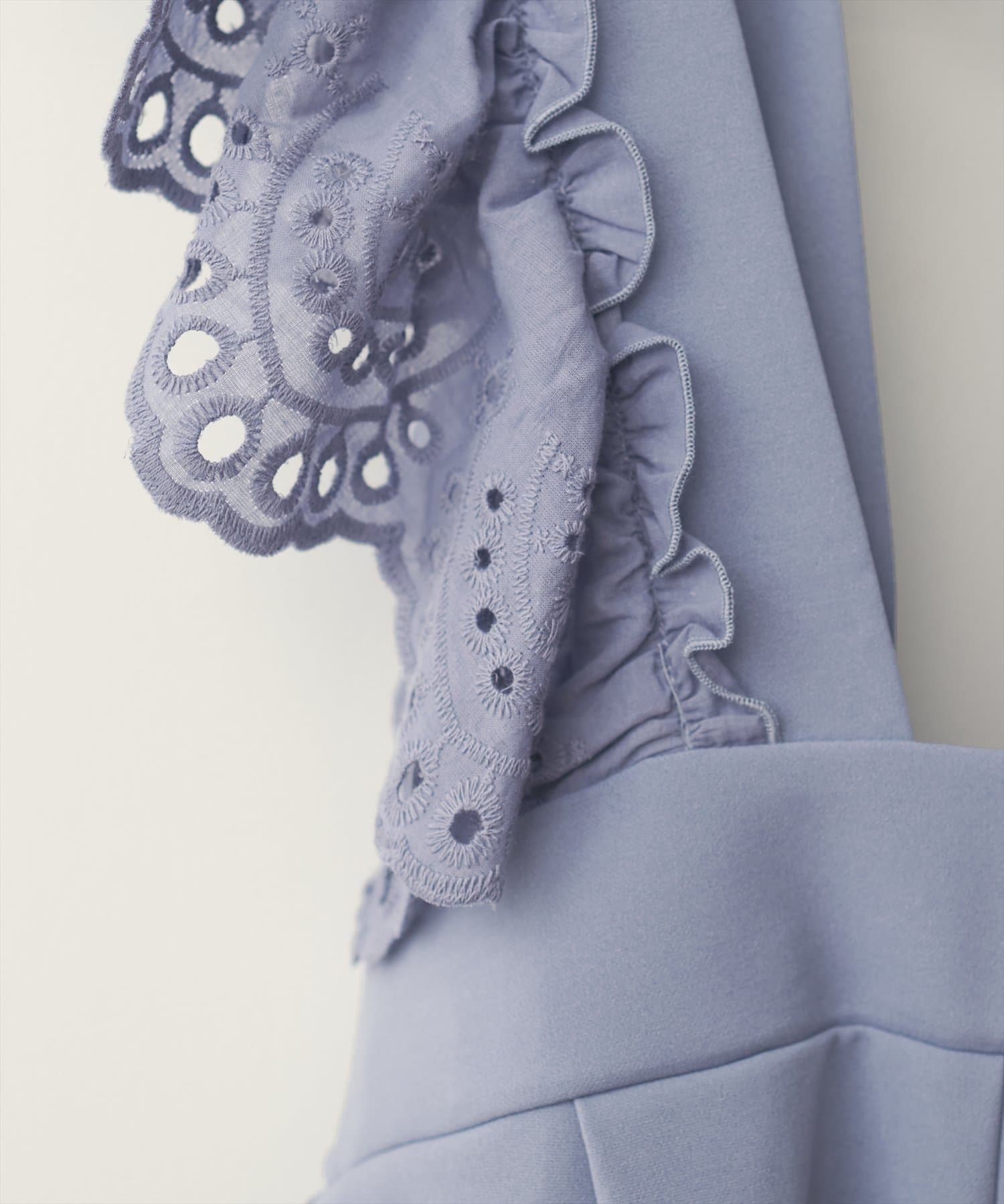 カジュアルになりがちなサロペットですが、スカラップ刺繍フリルで大人ガーリーにお召頂けます。