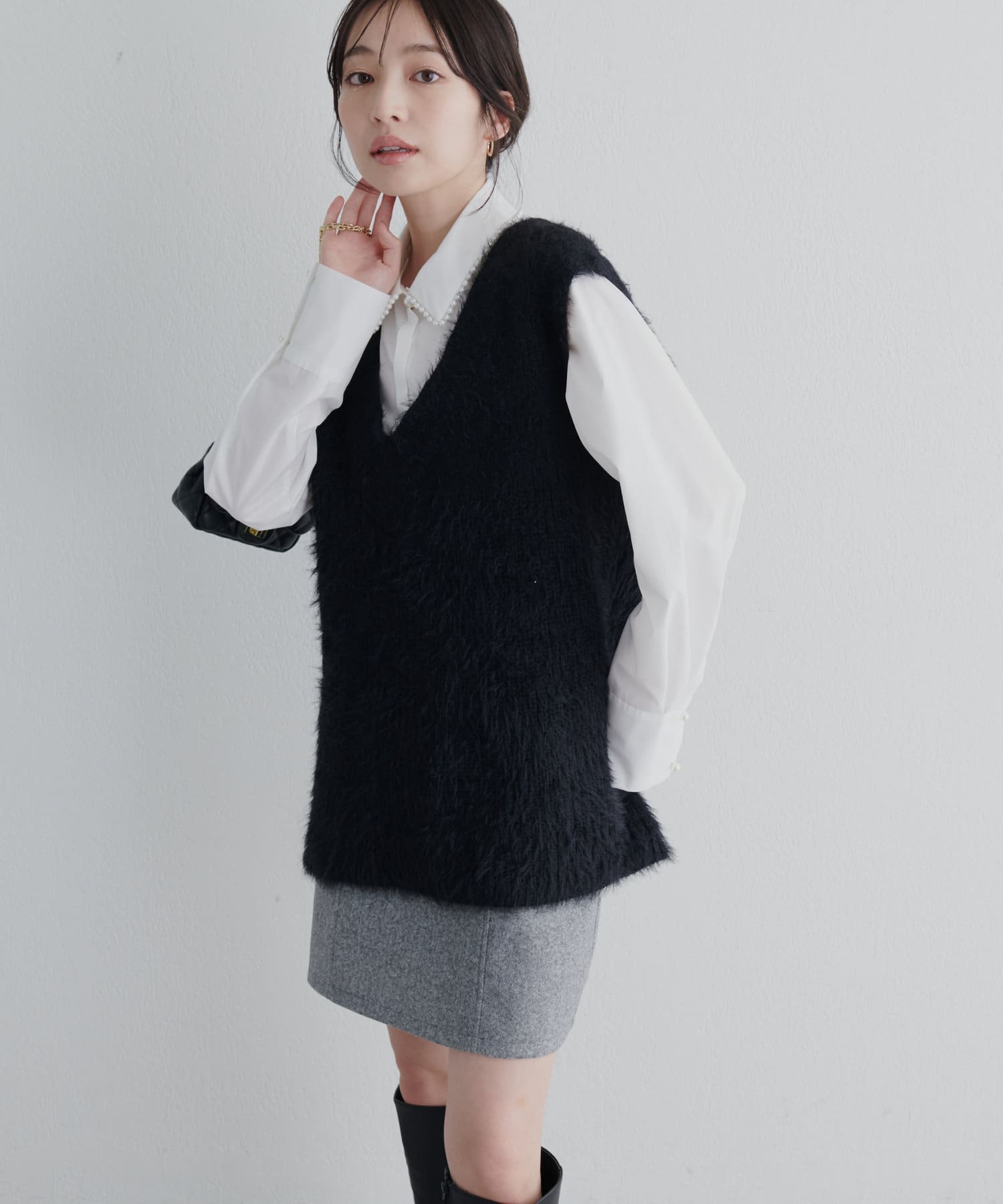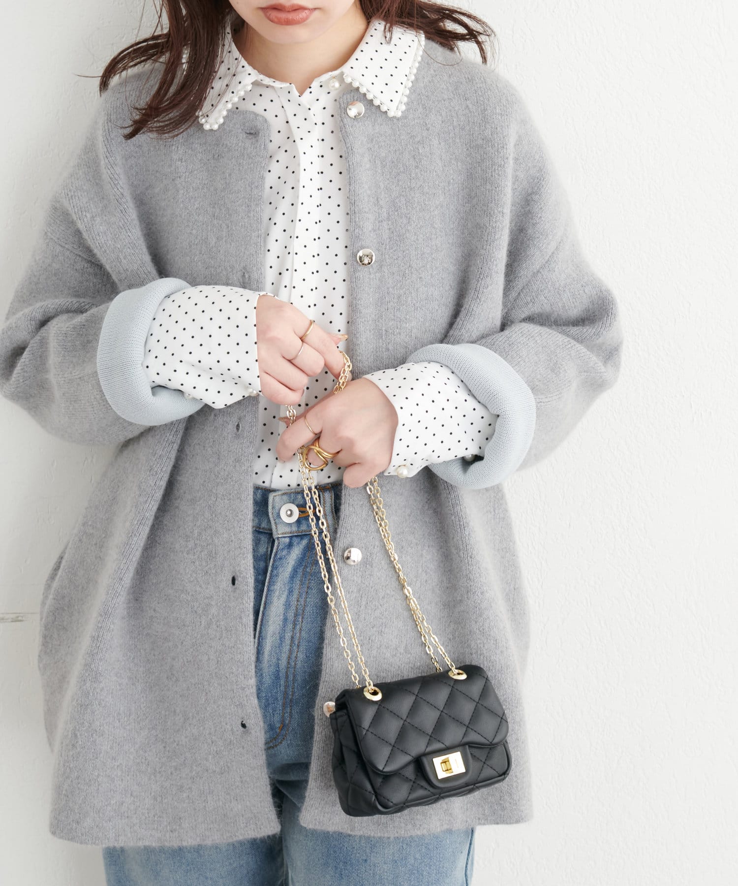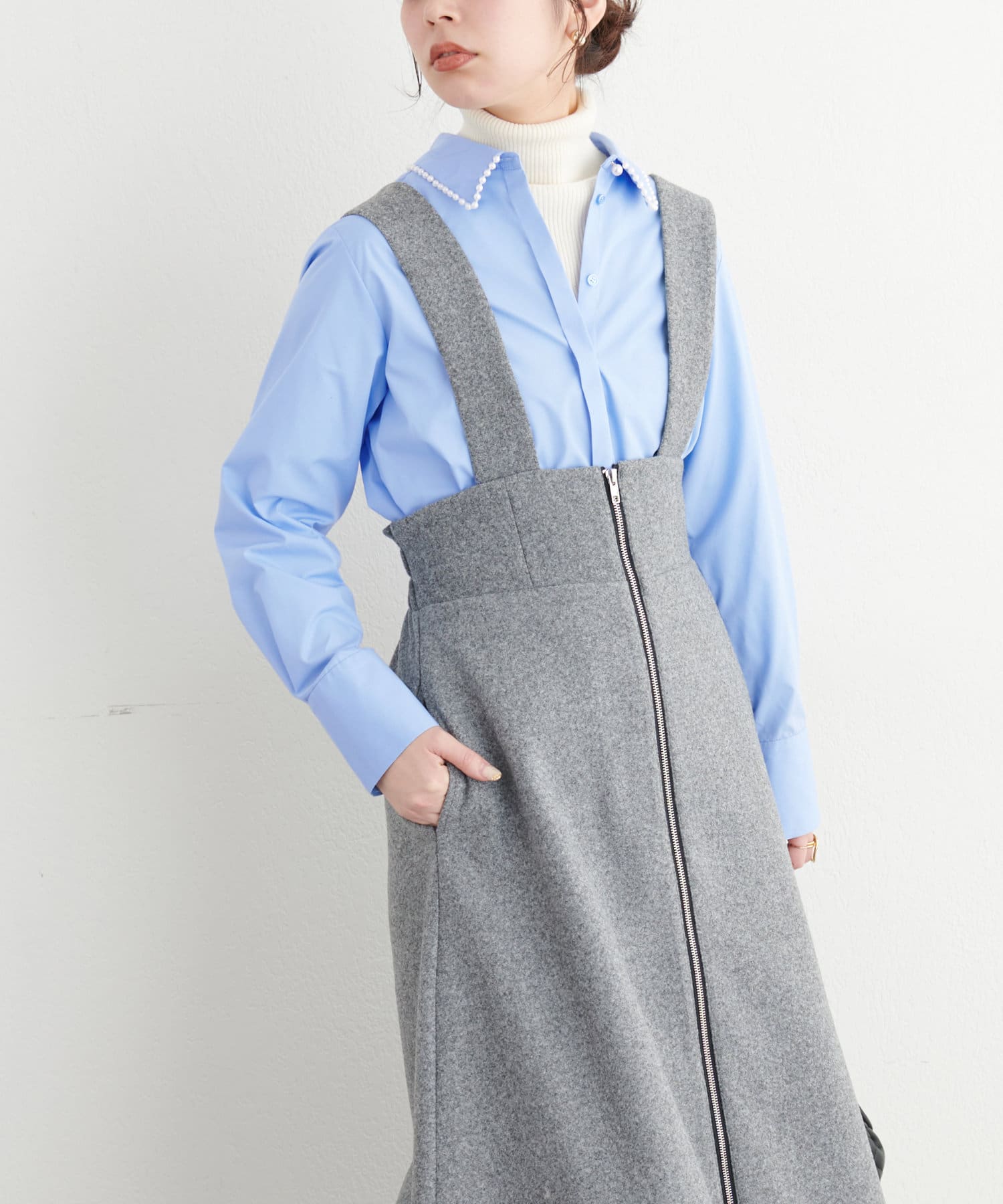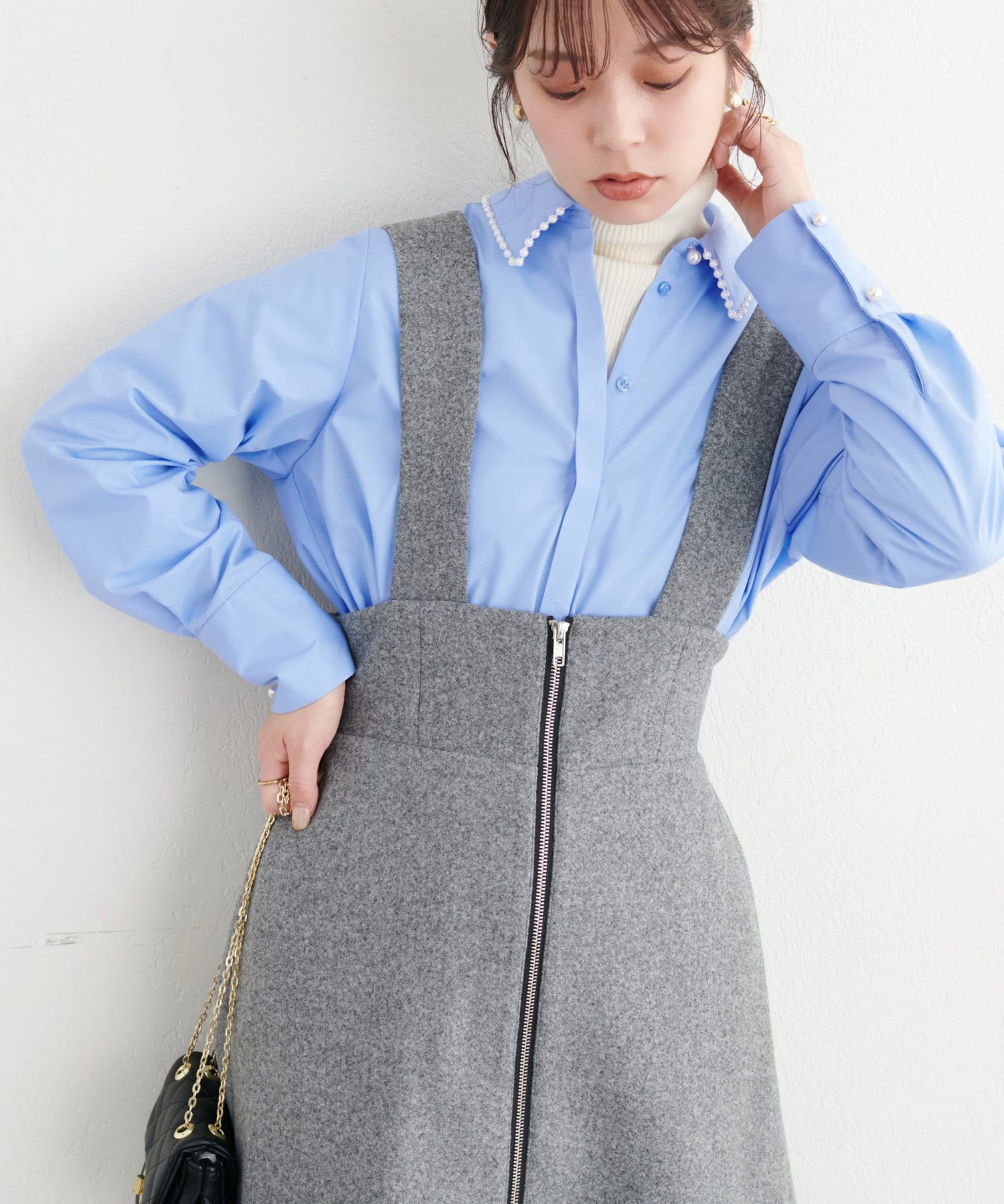 1枚ではもちろん、レイヤードで衿ぐりのパールを覗かせるスタイルもおすすめ。