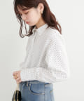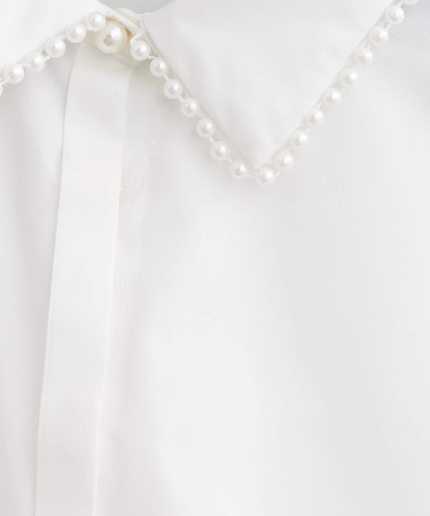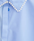 パッと見ただけで可愛らしい、衿ぐりにあしらわれたパールが印象的なシャツ。