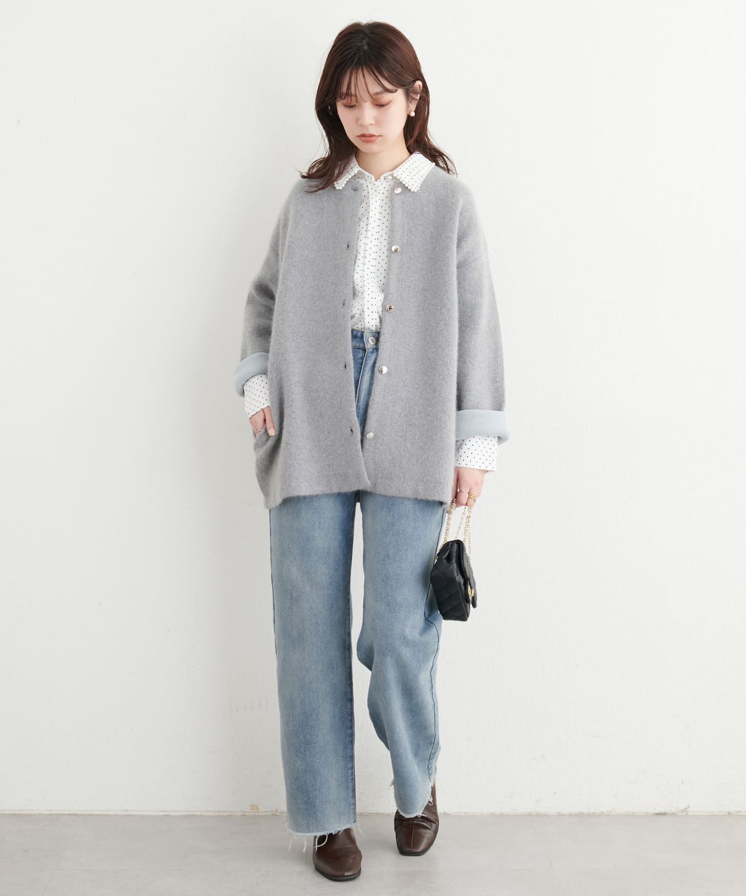 毛足のあるふんわりとしたニットや、メンズライクなスウェットと相性抜群◎