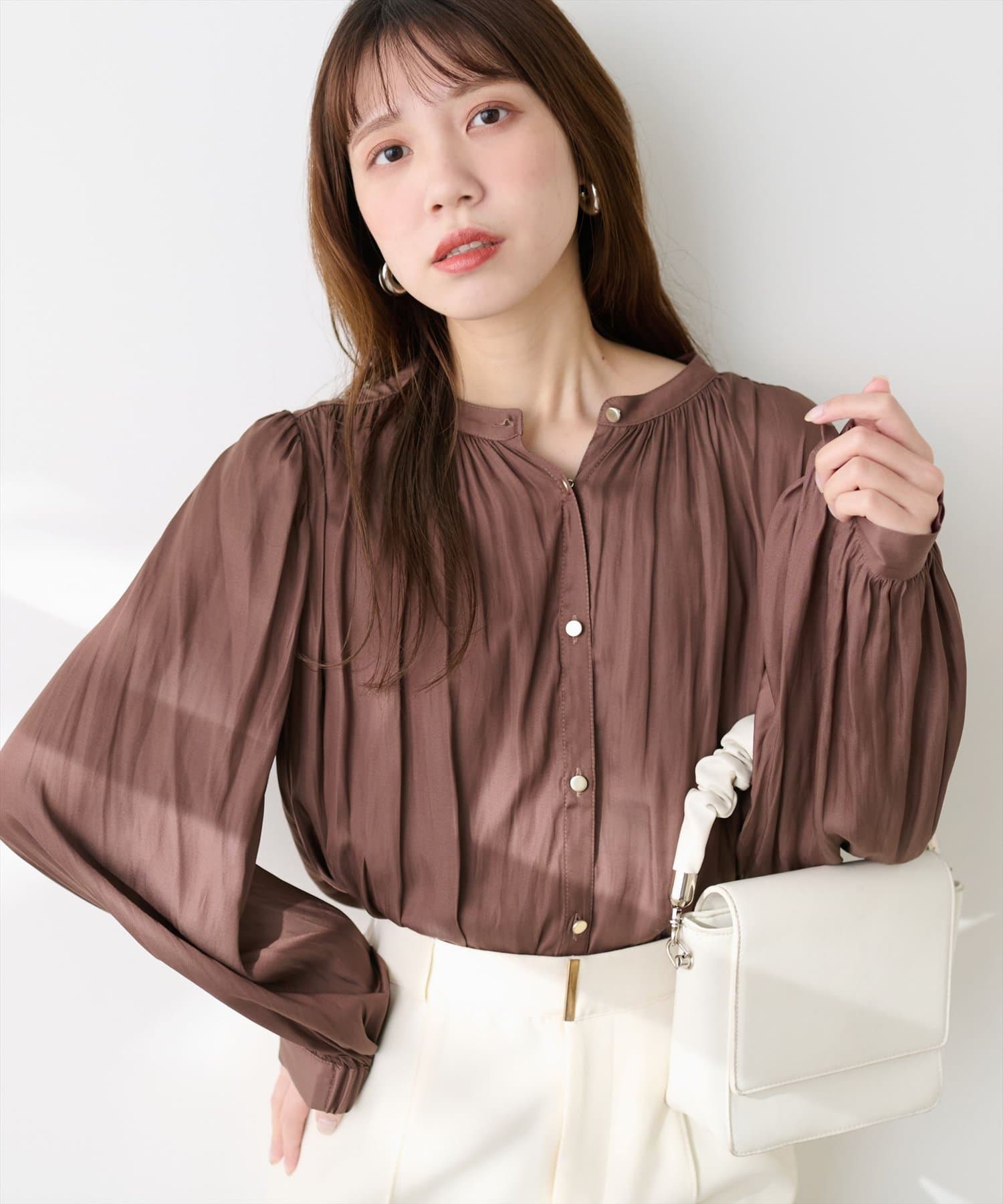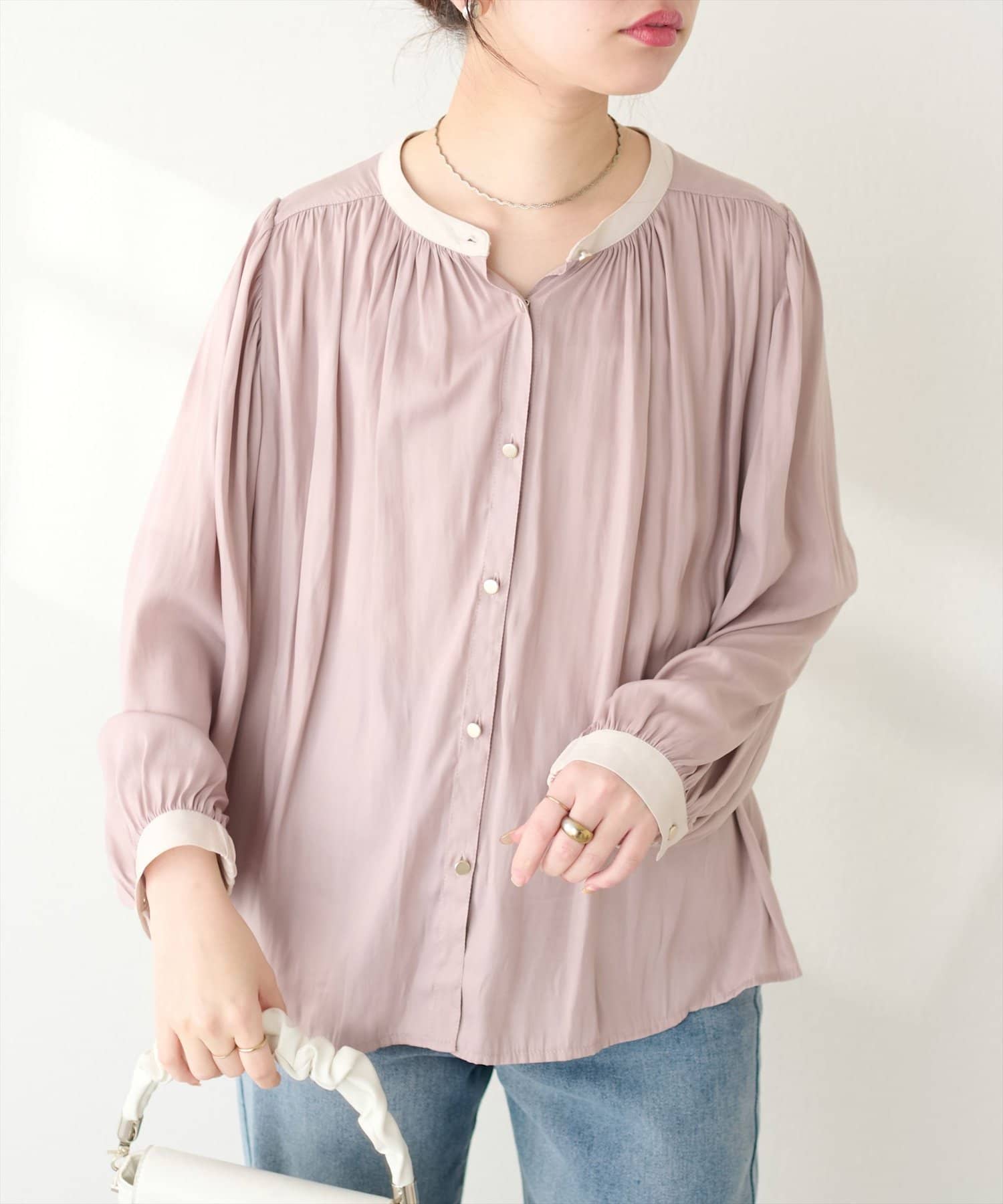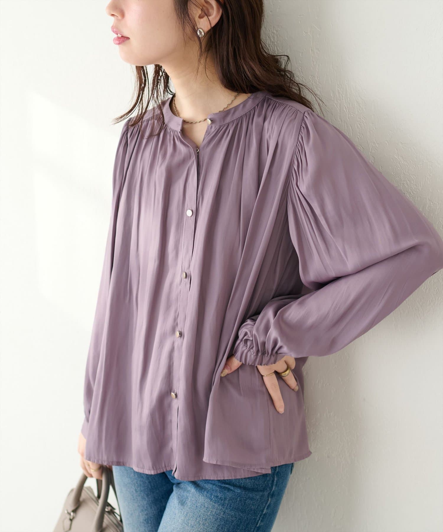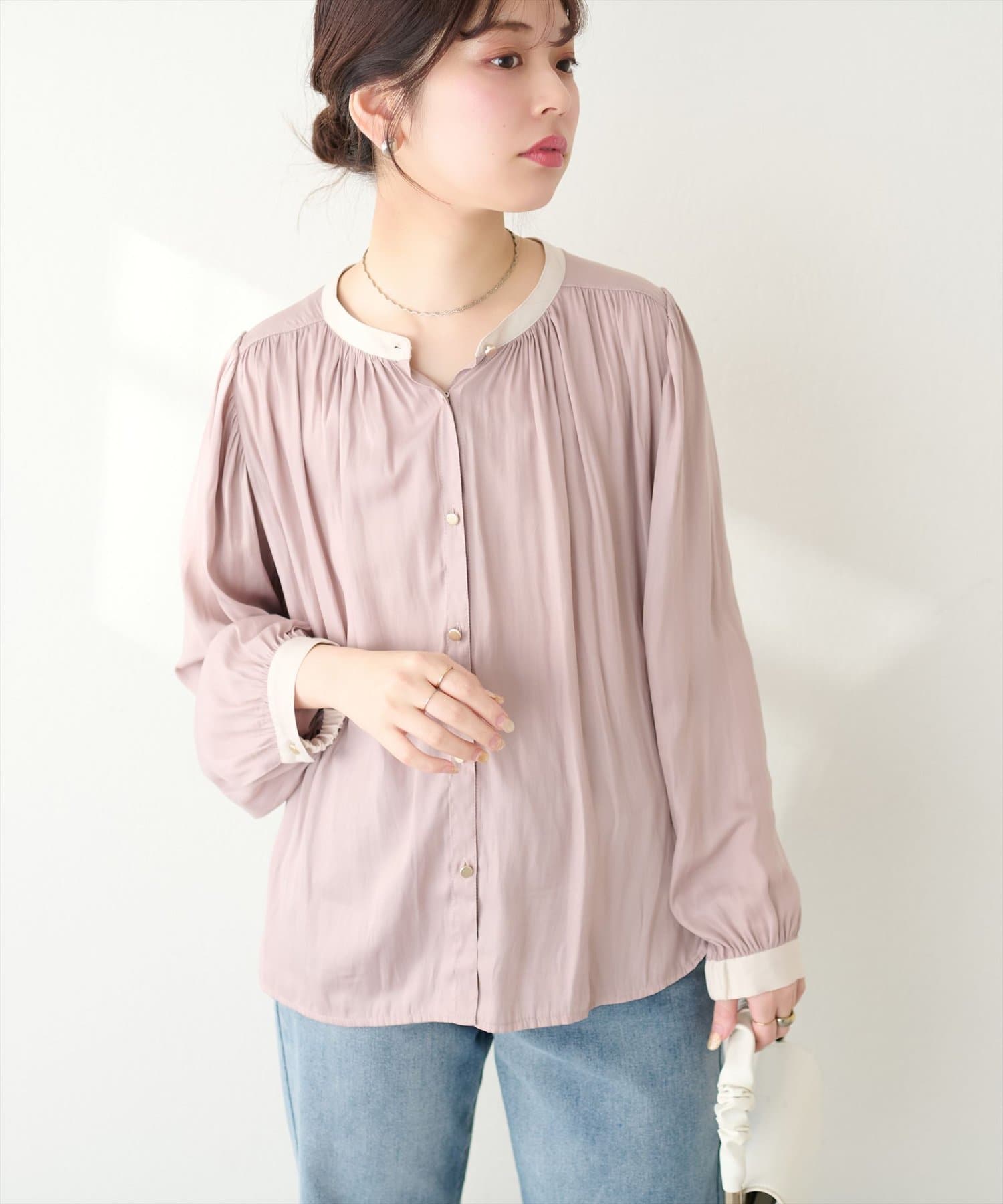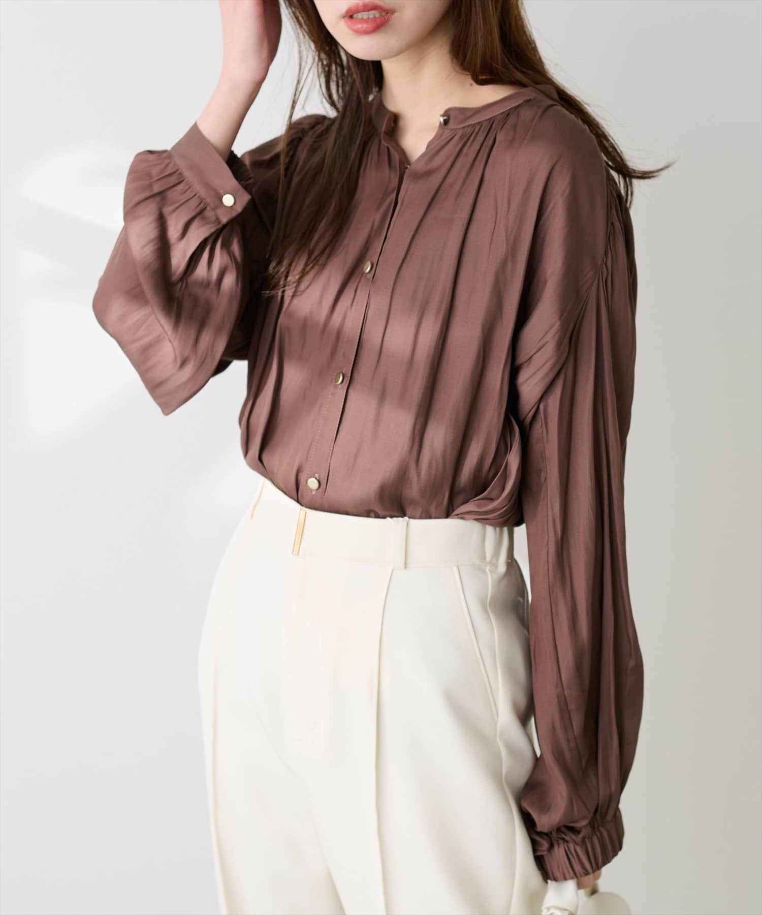 エレガントな表情が魅力のバンドカラーブラウス