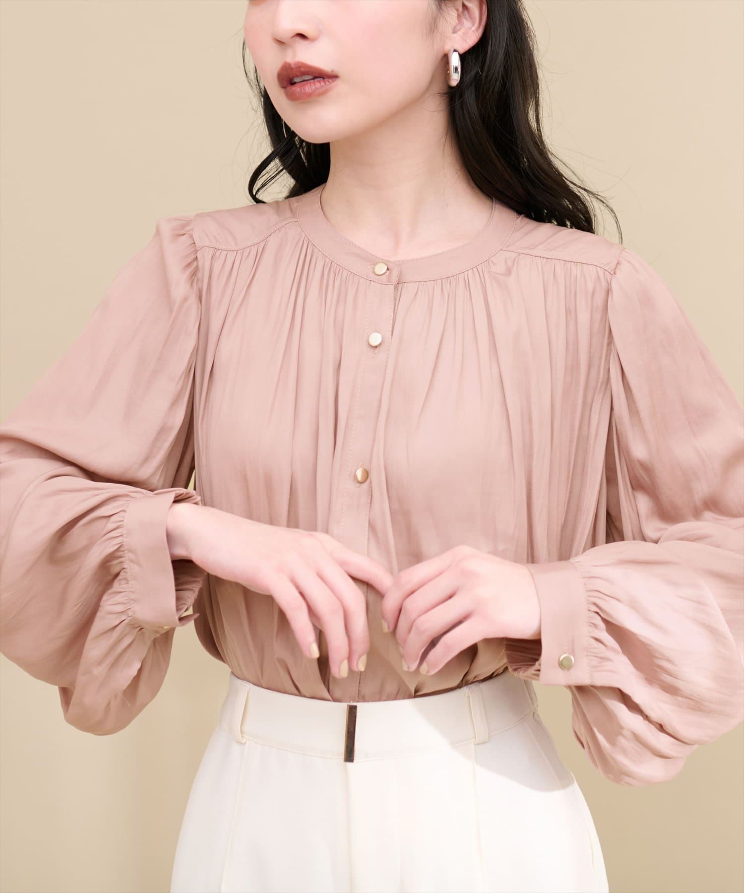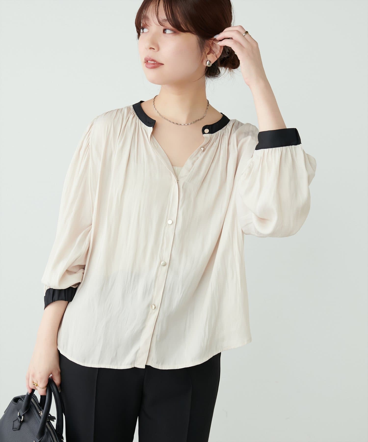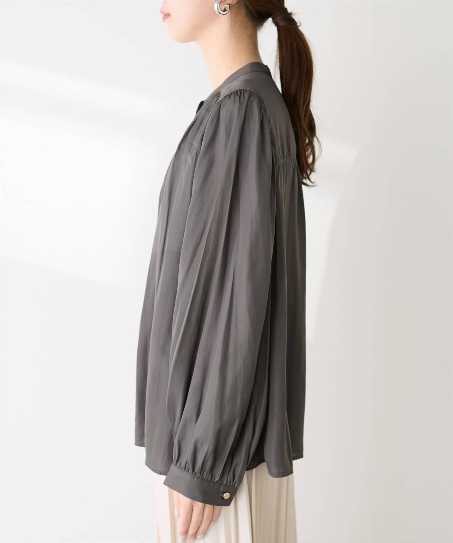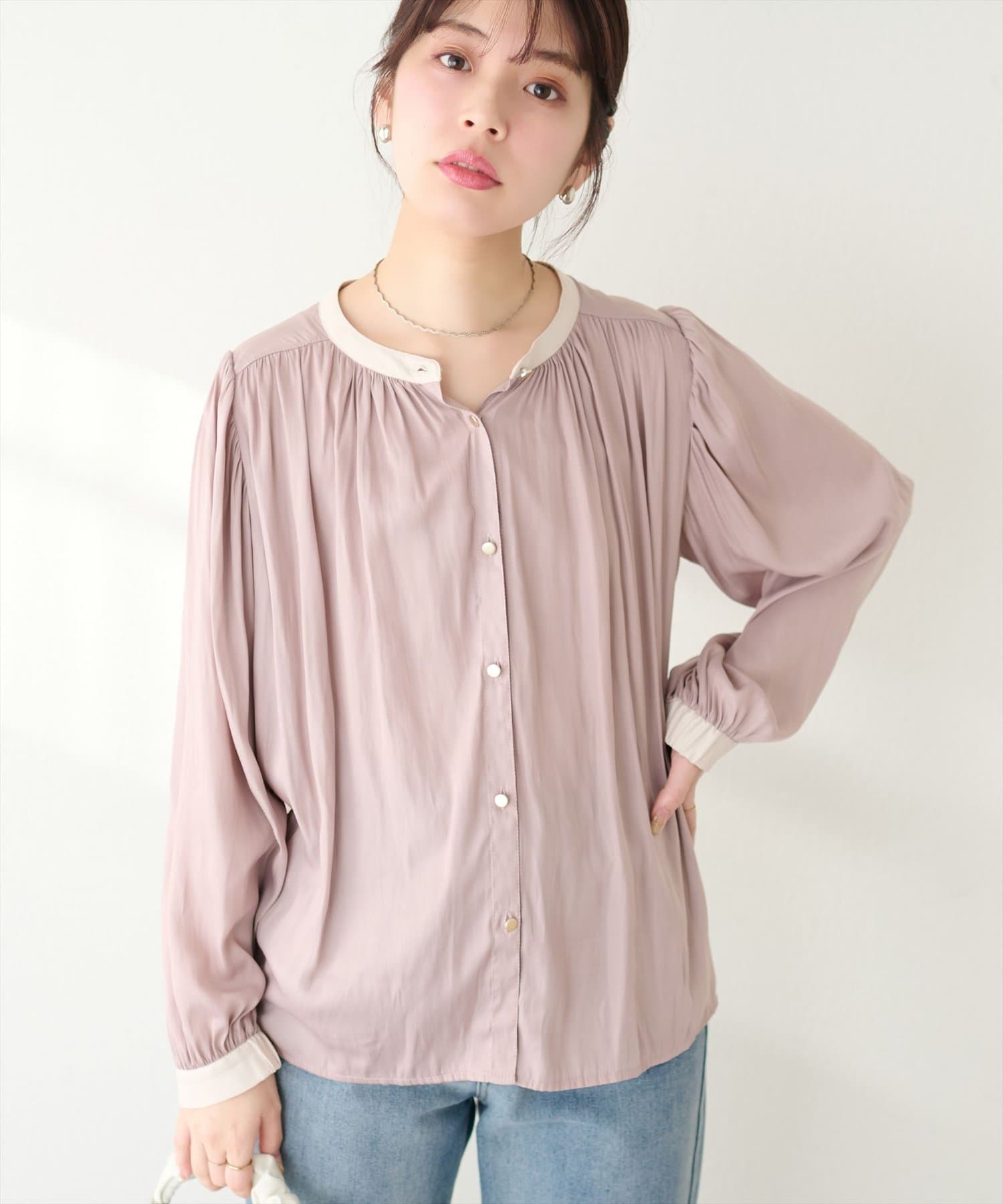 エレガントな表情が魅力のバンドカラーブラウス