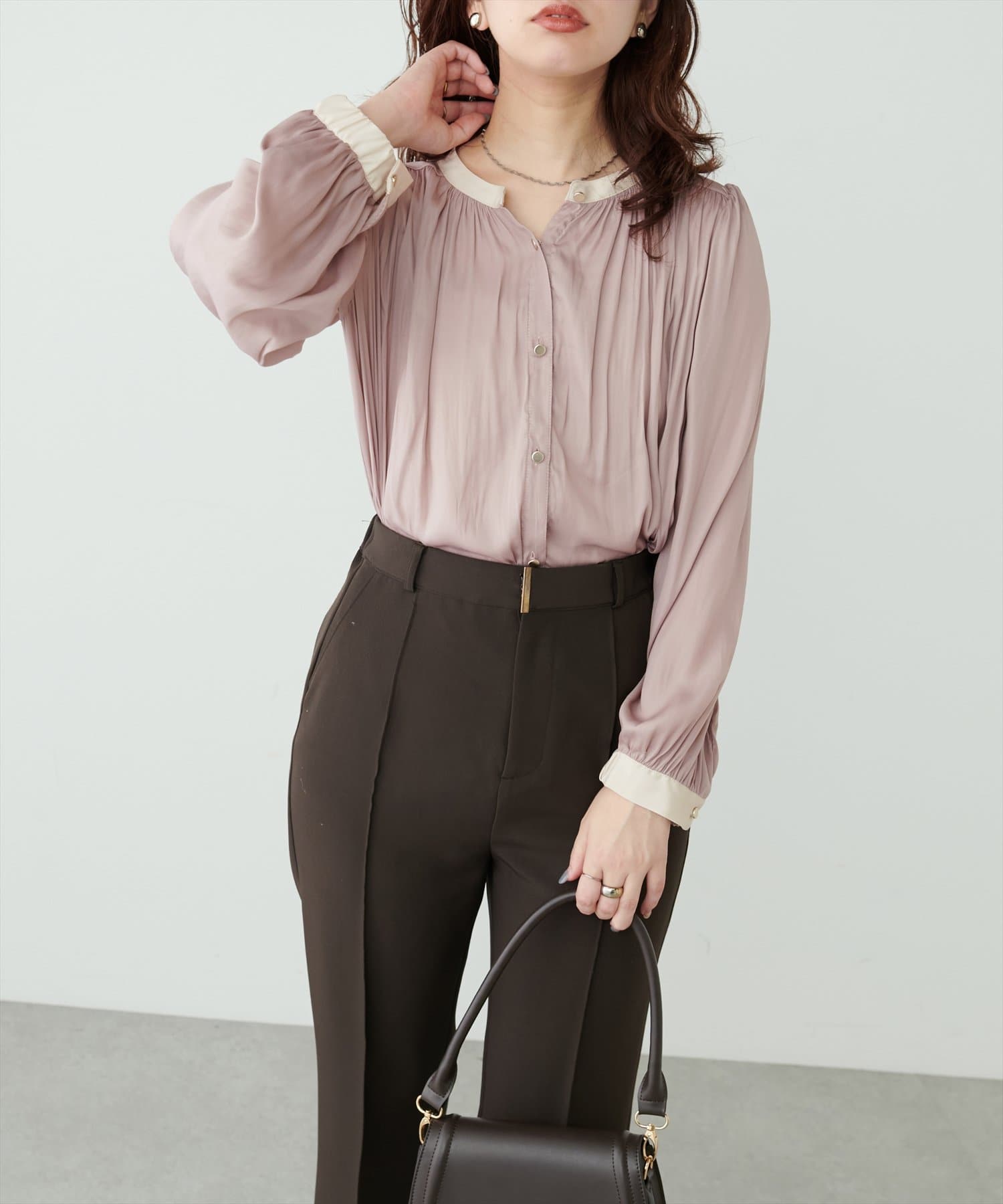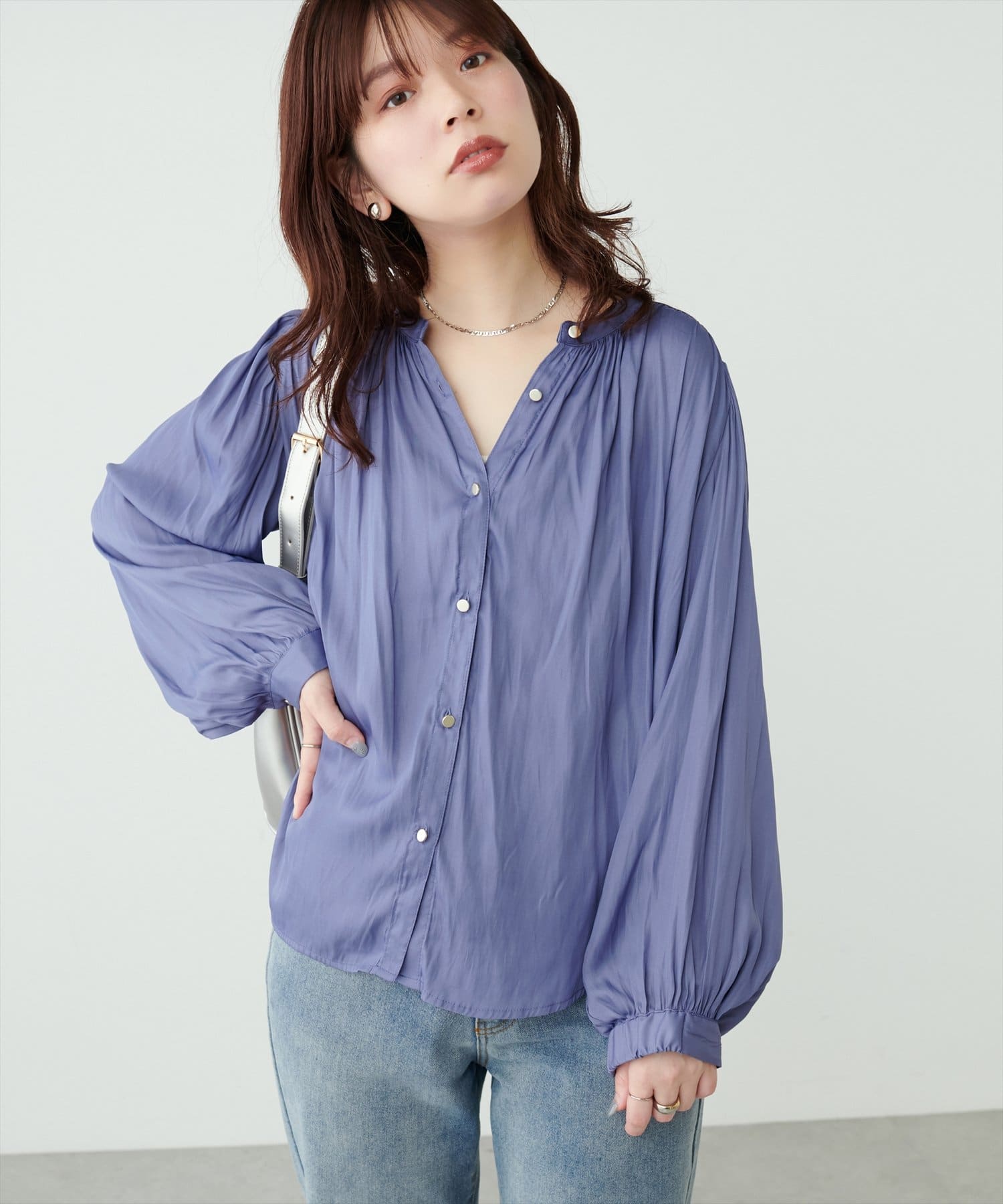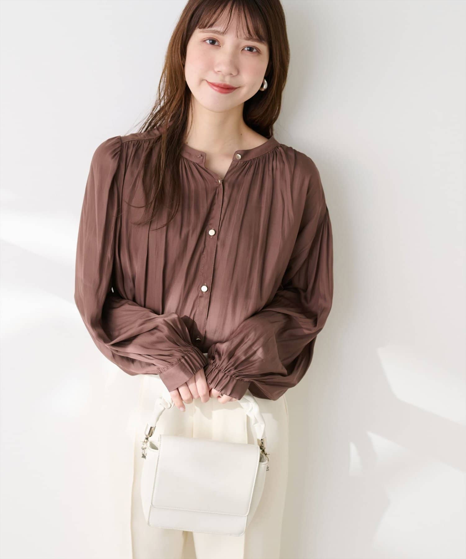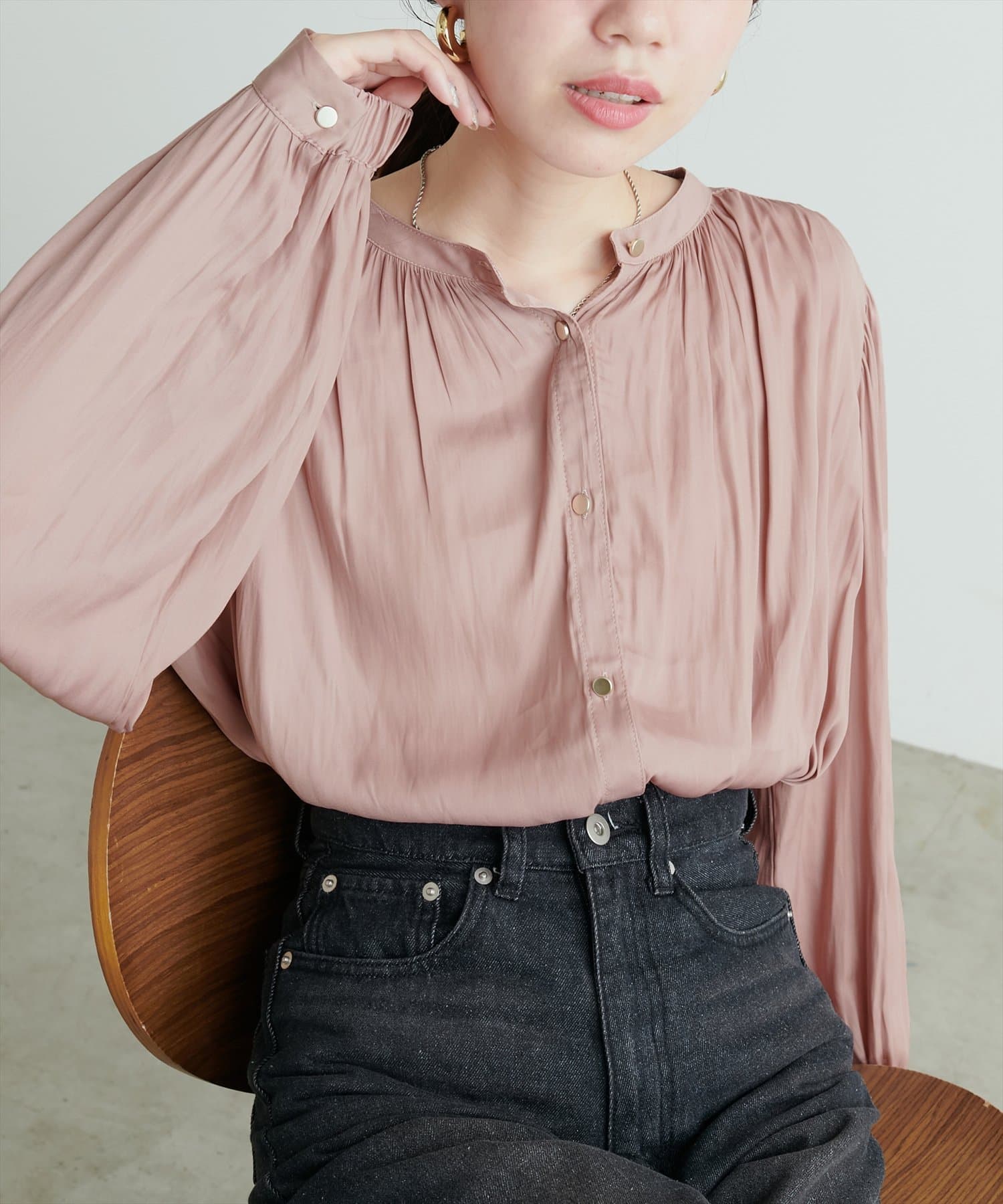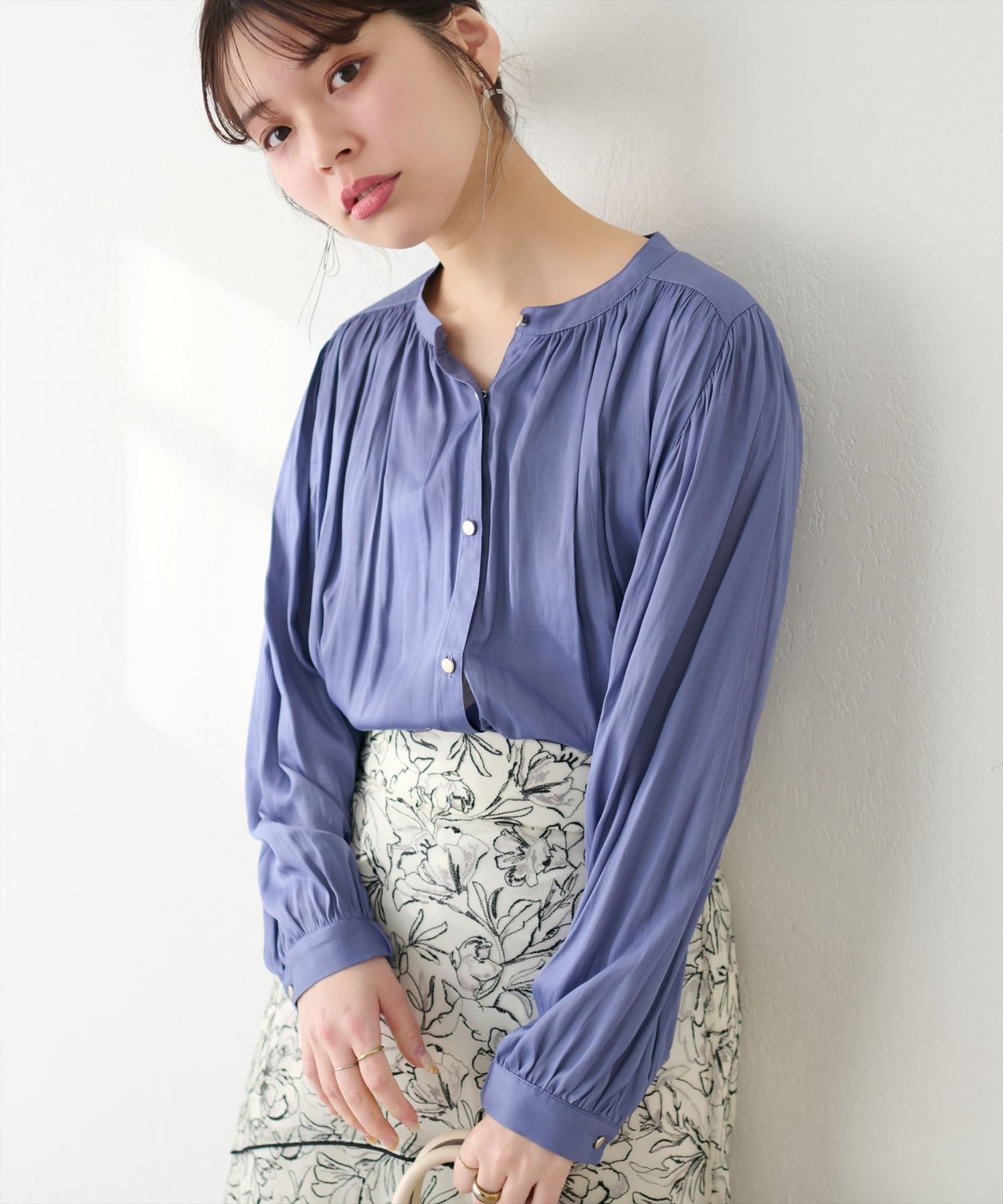 エレガントな表情が魅力のバンドカラーブラウス