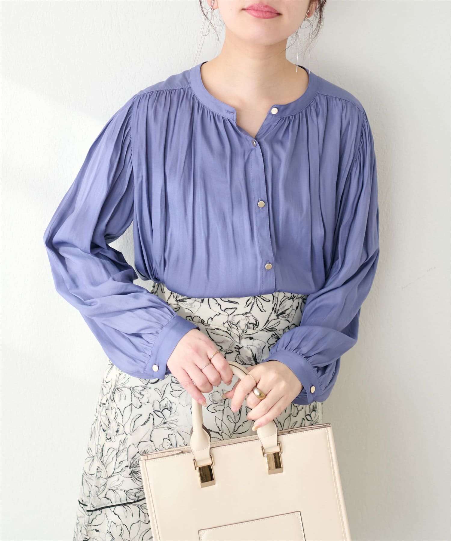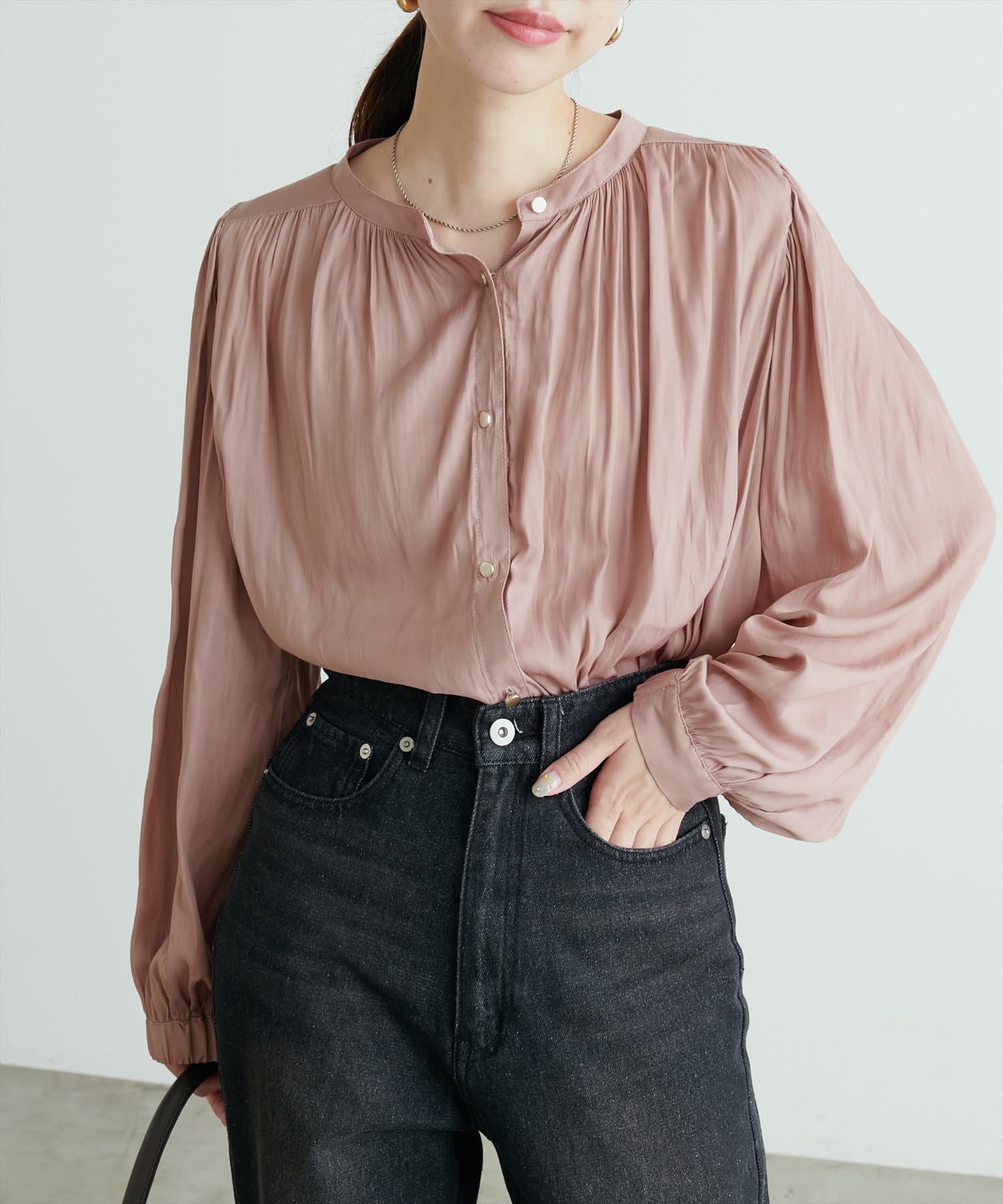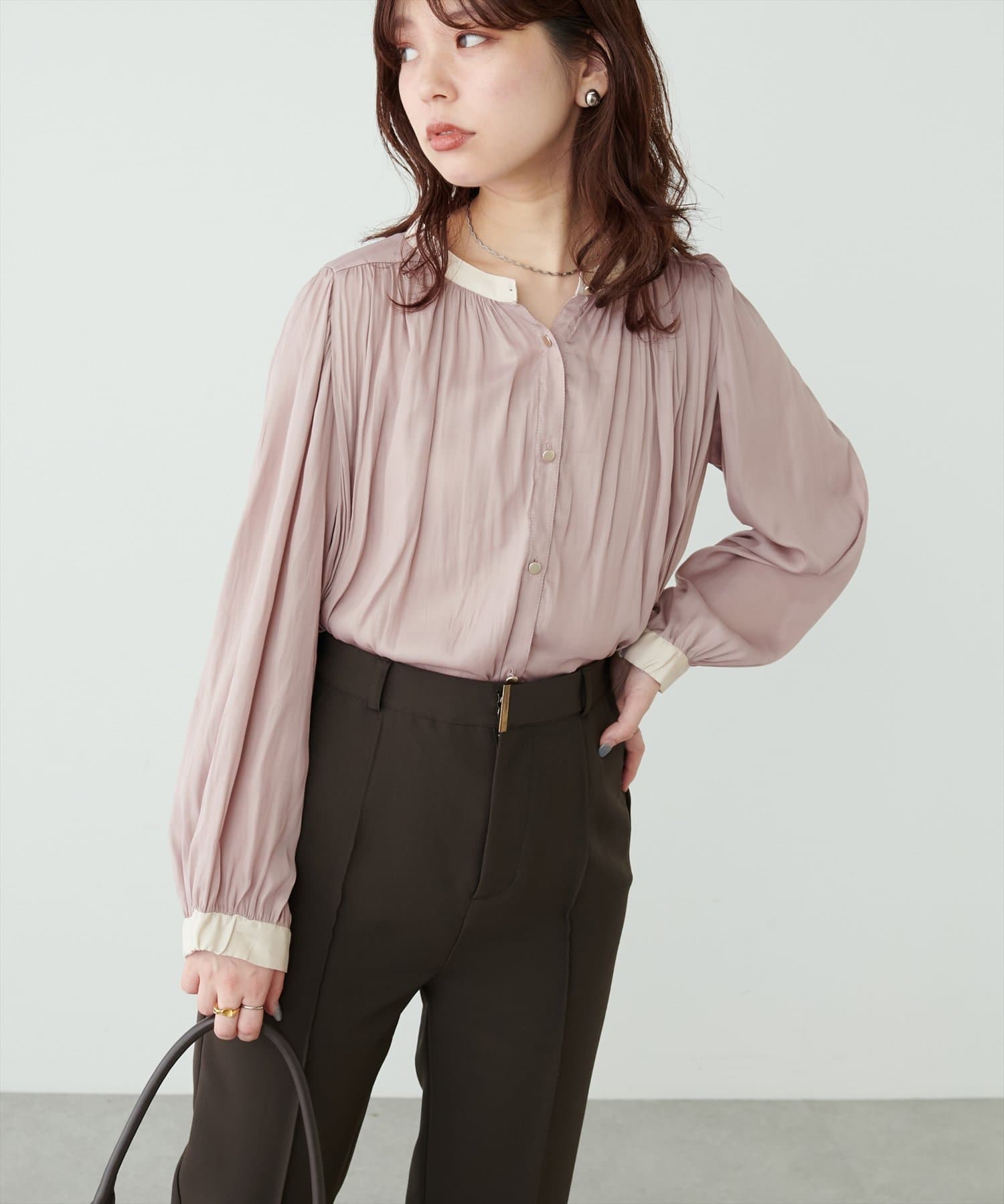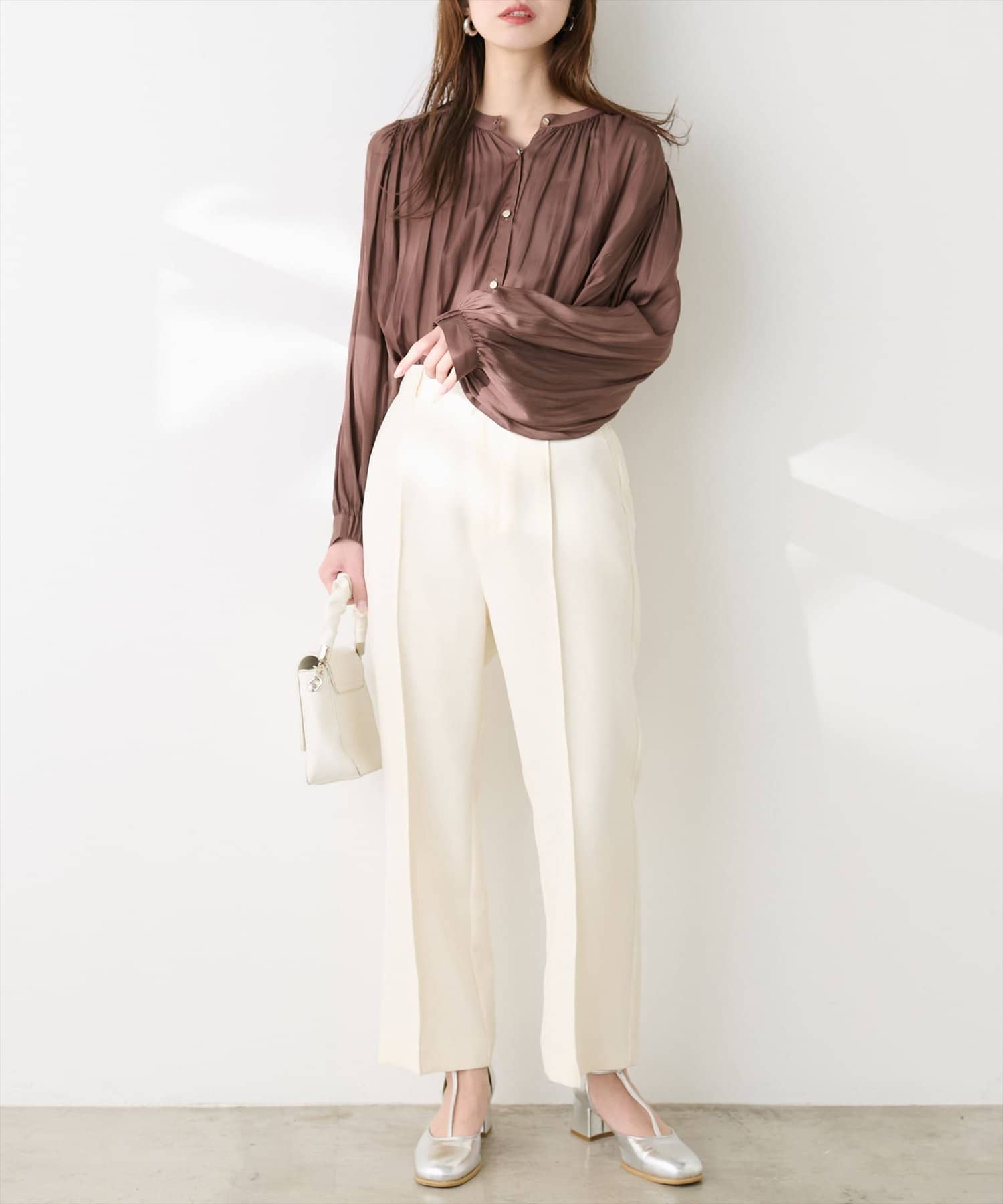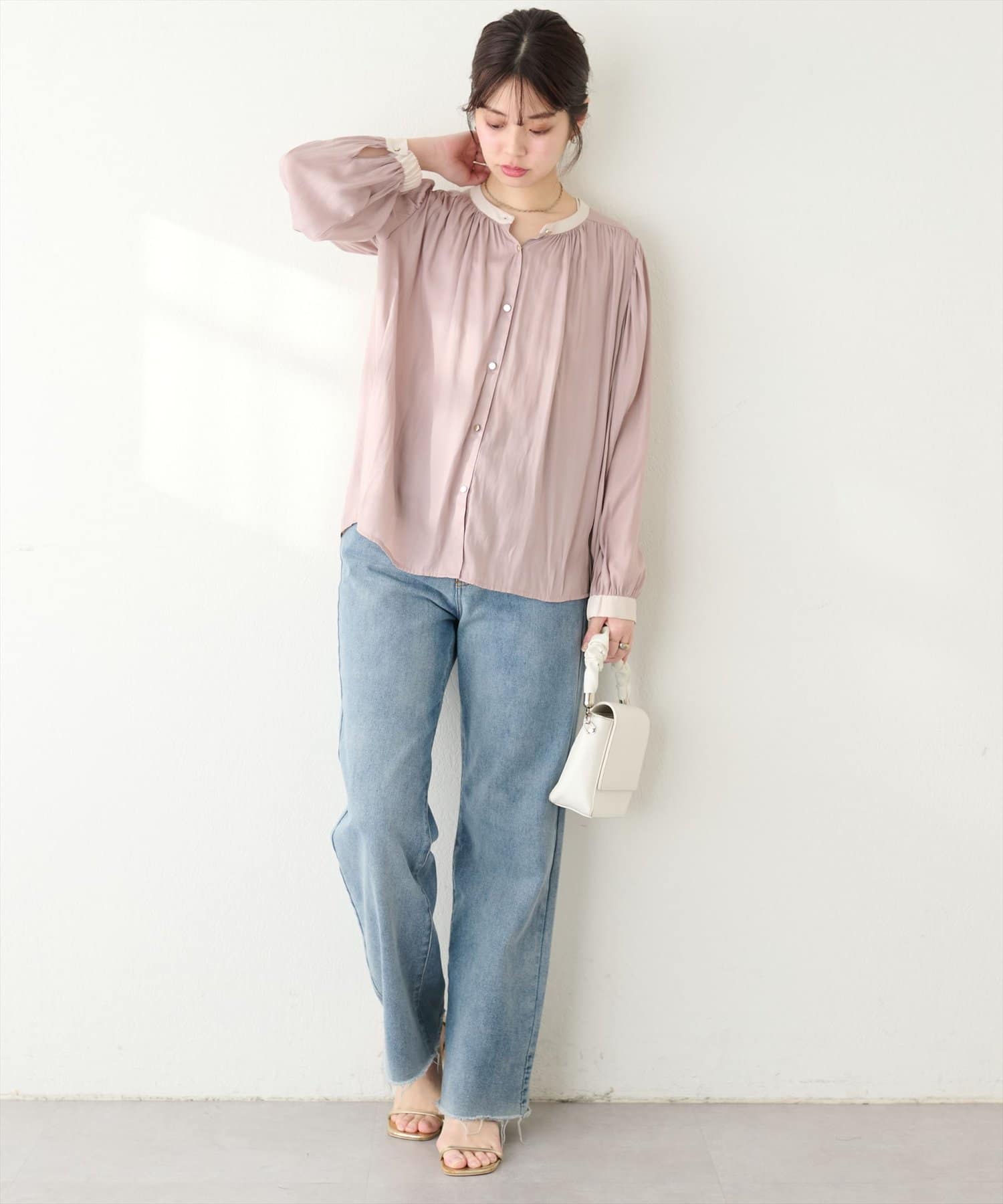 エレガントな表情が魅力のバンドカラーブラウス