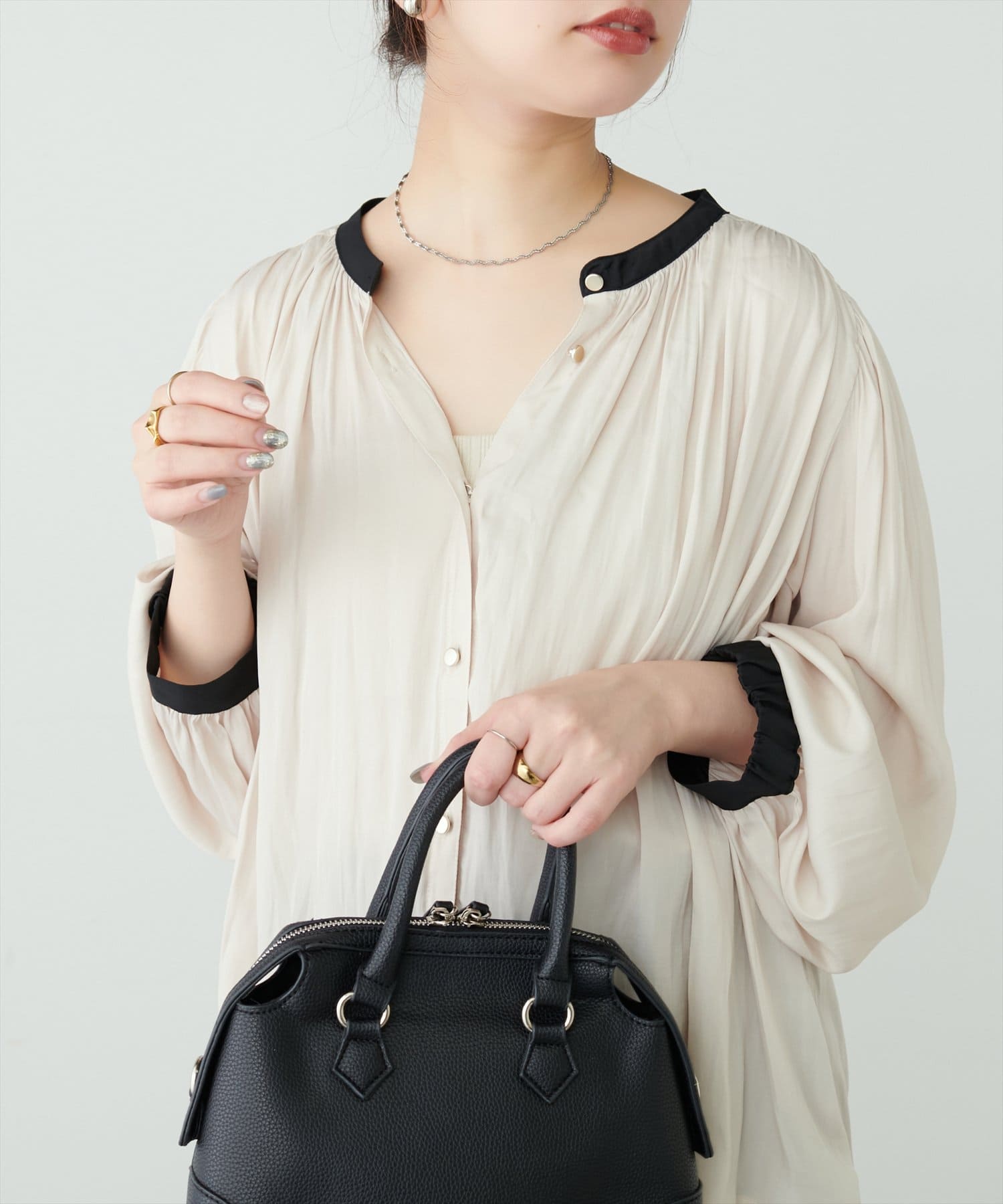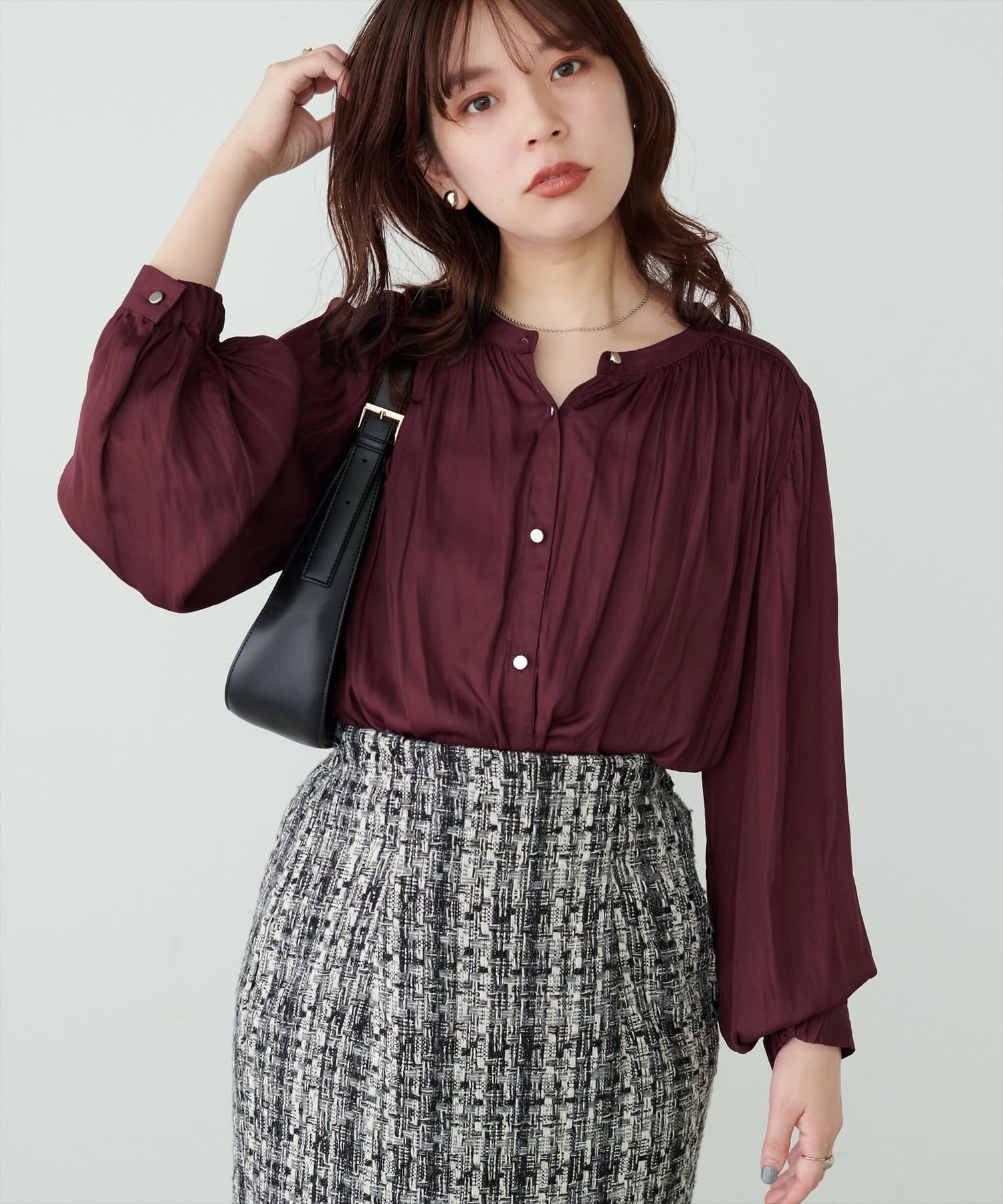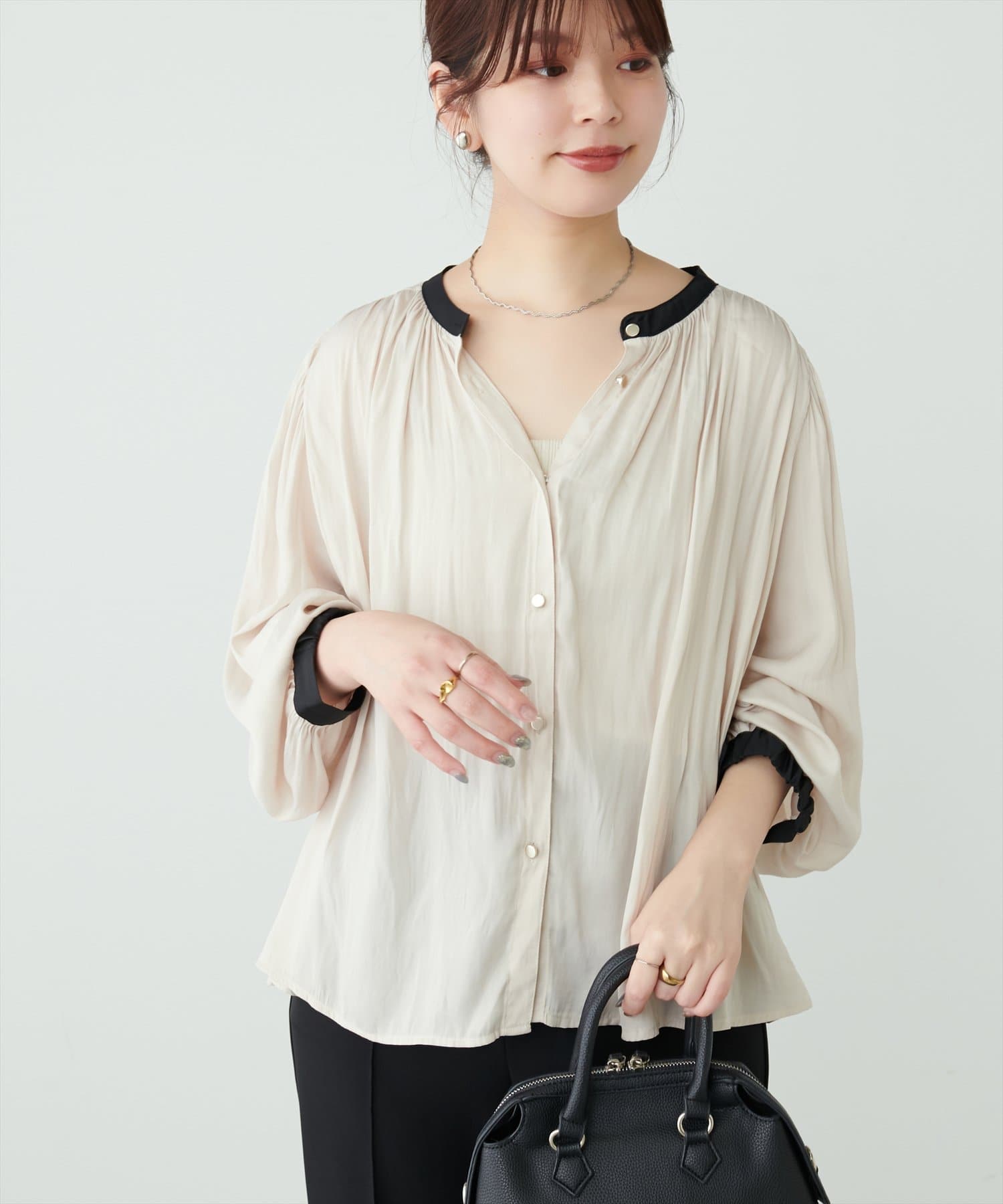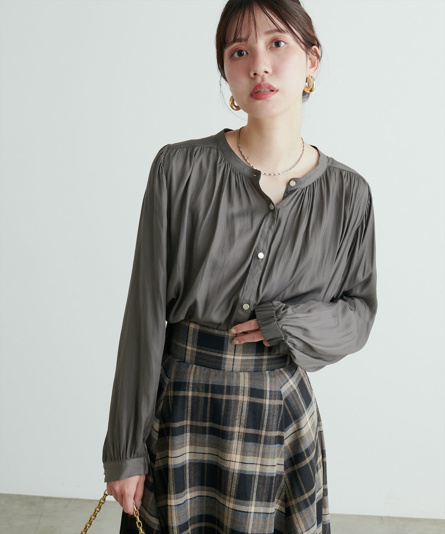 エレガントな表情が魅力のバンドカラーブラウス