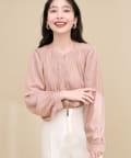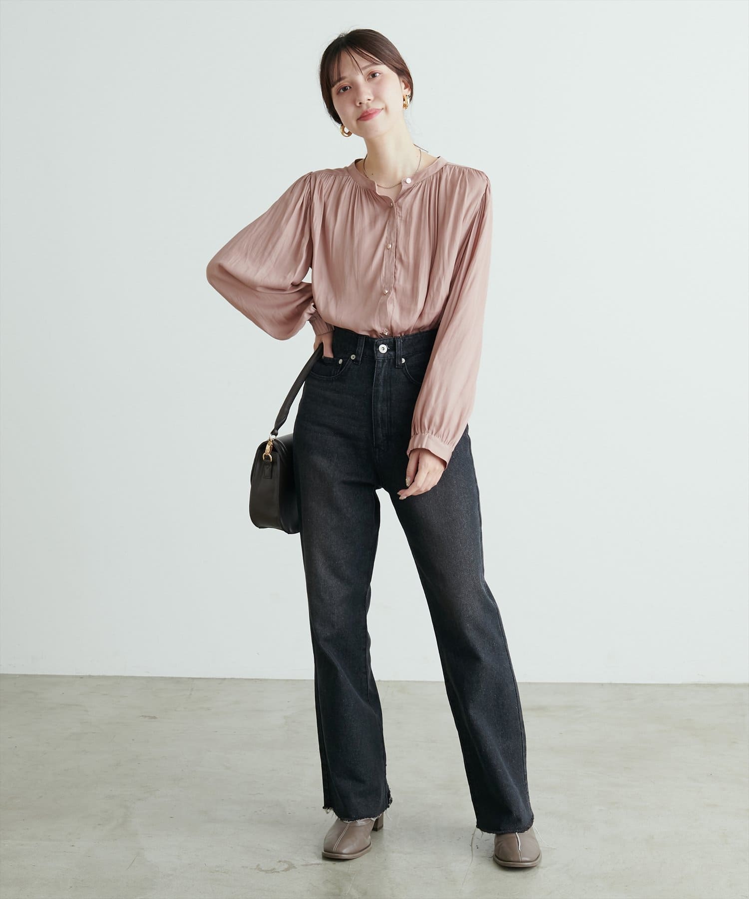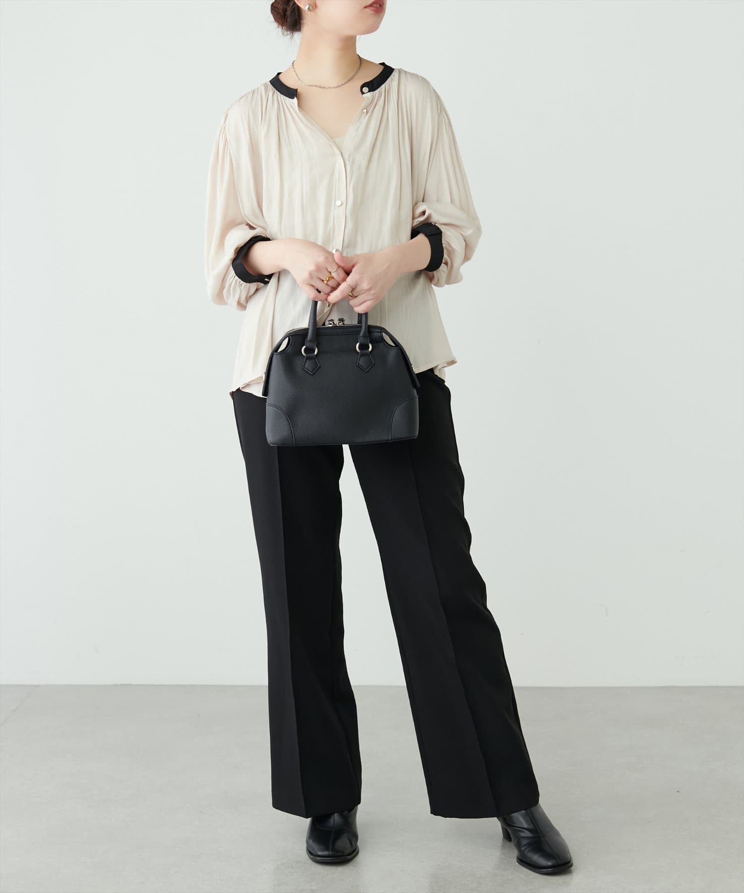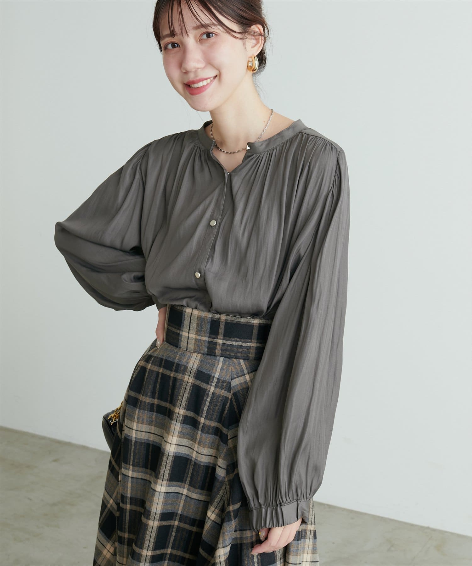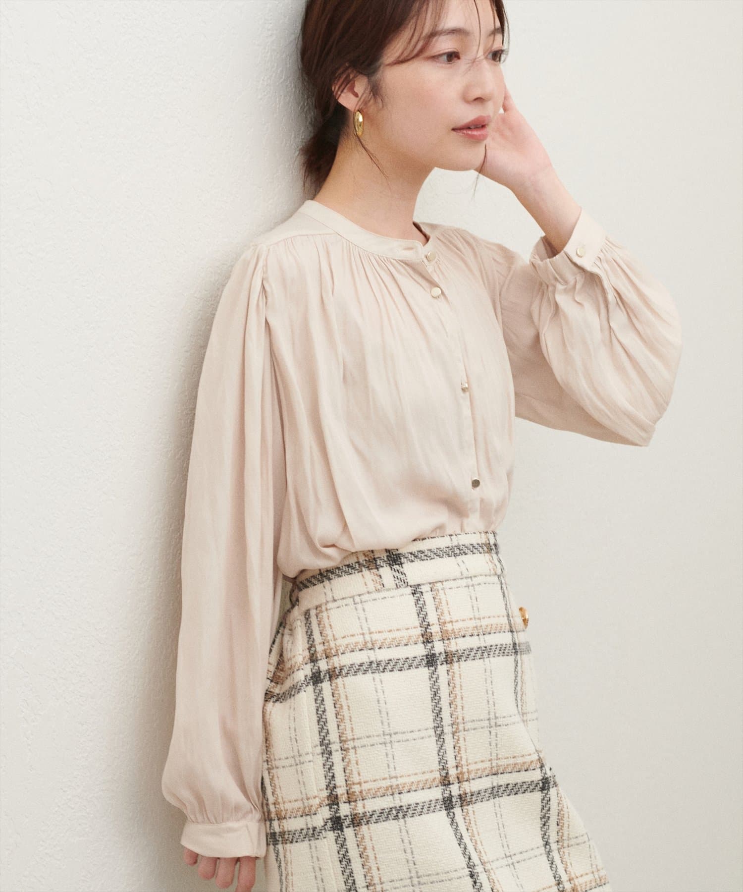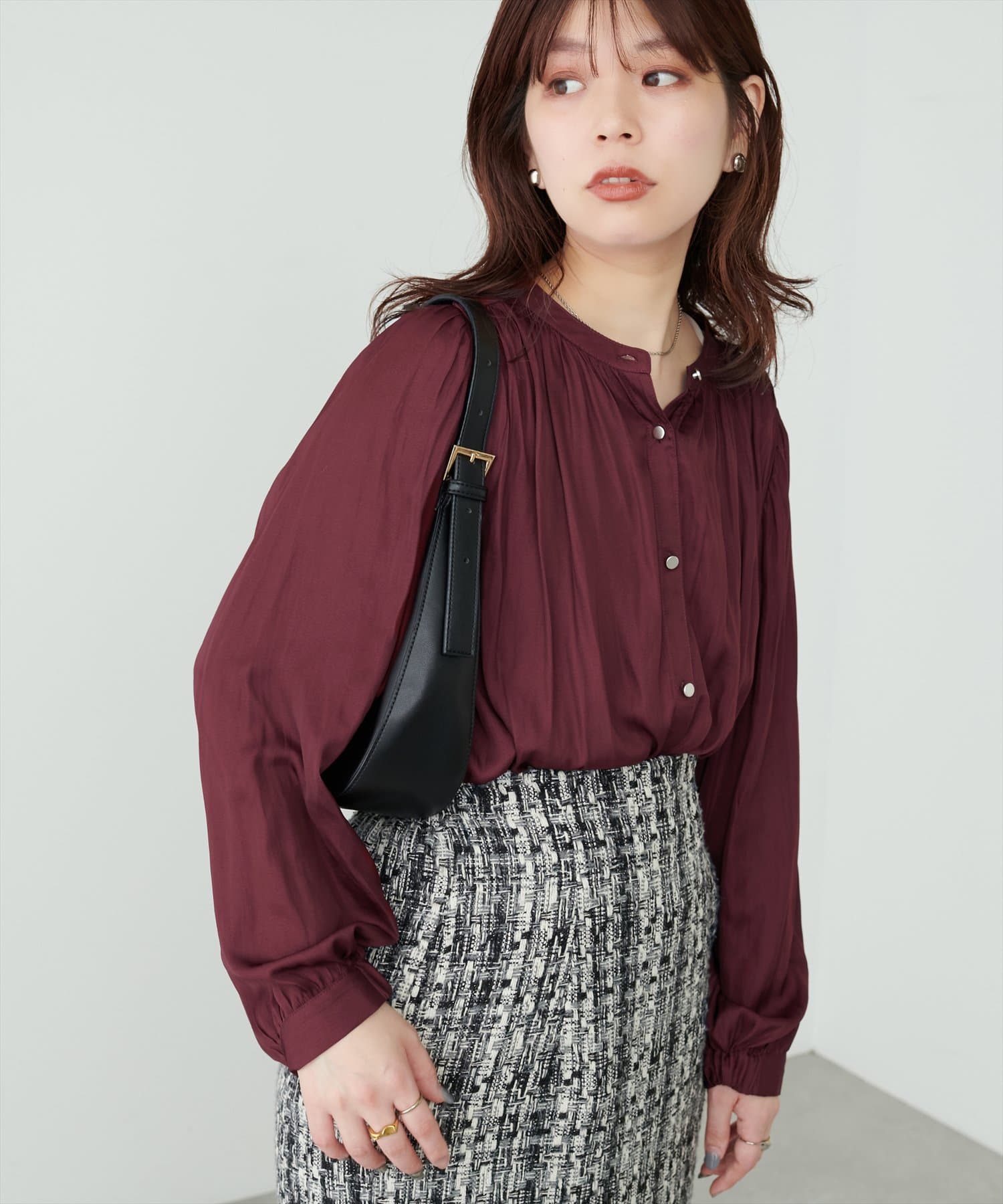 エレガントな表情が魅力のバンドカラーブラウス