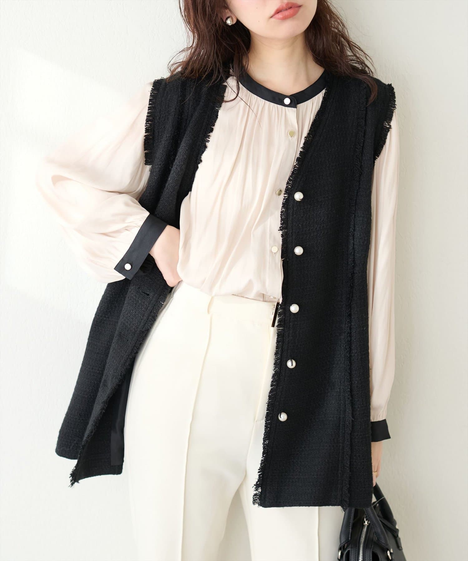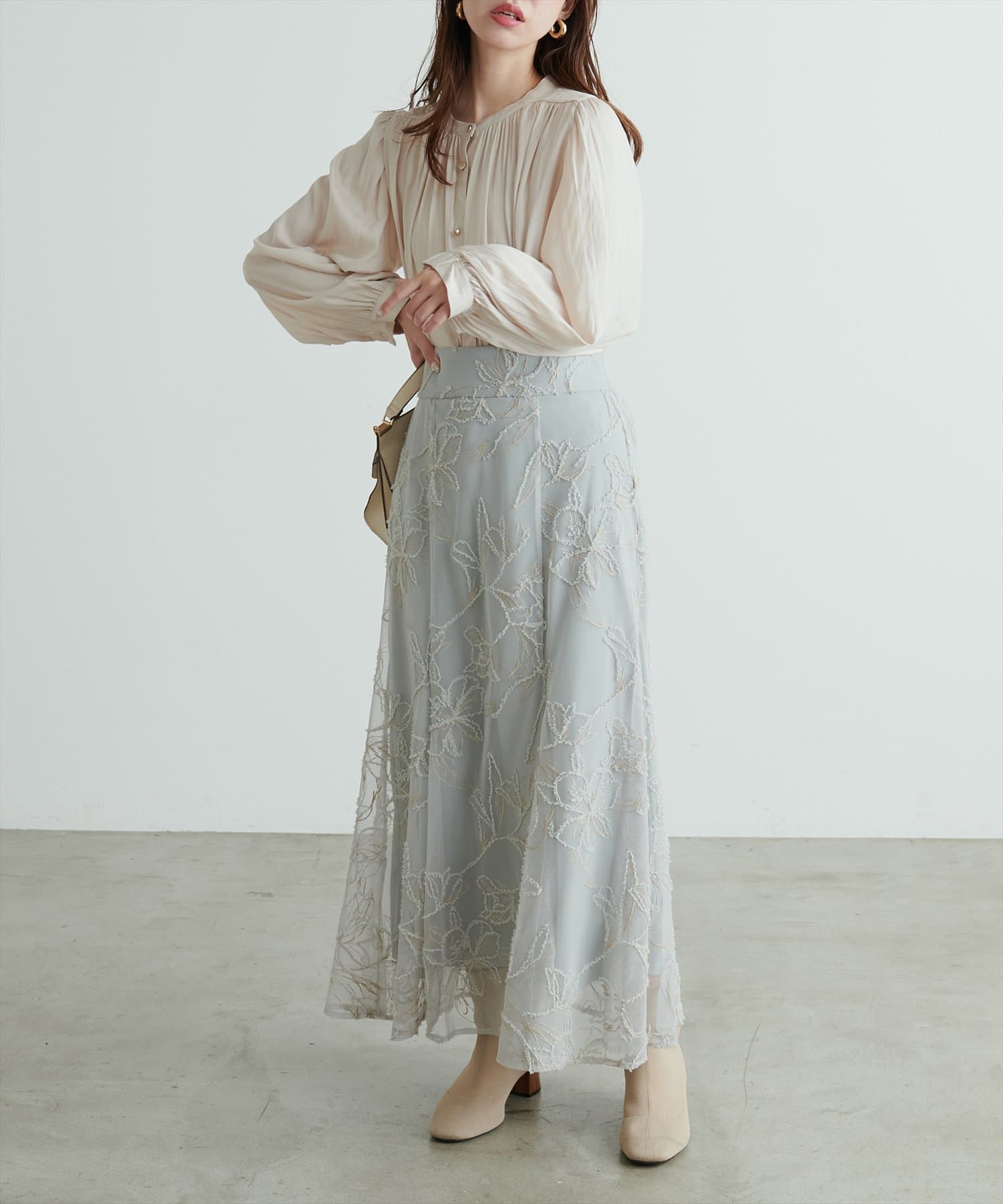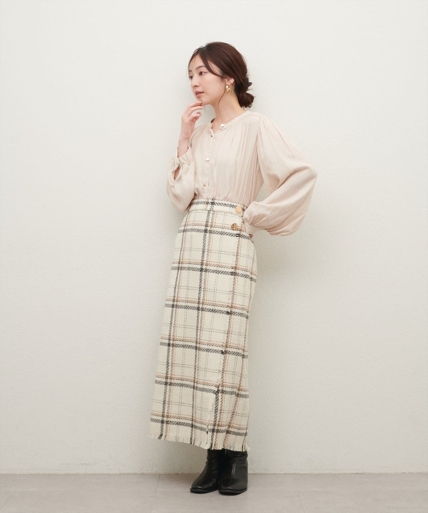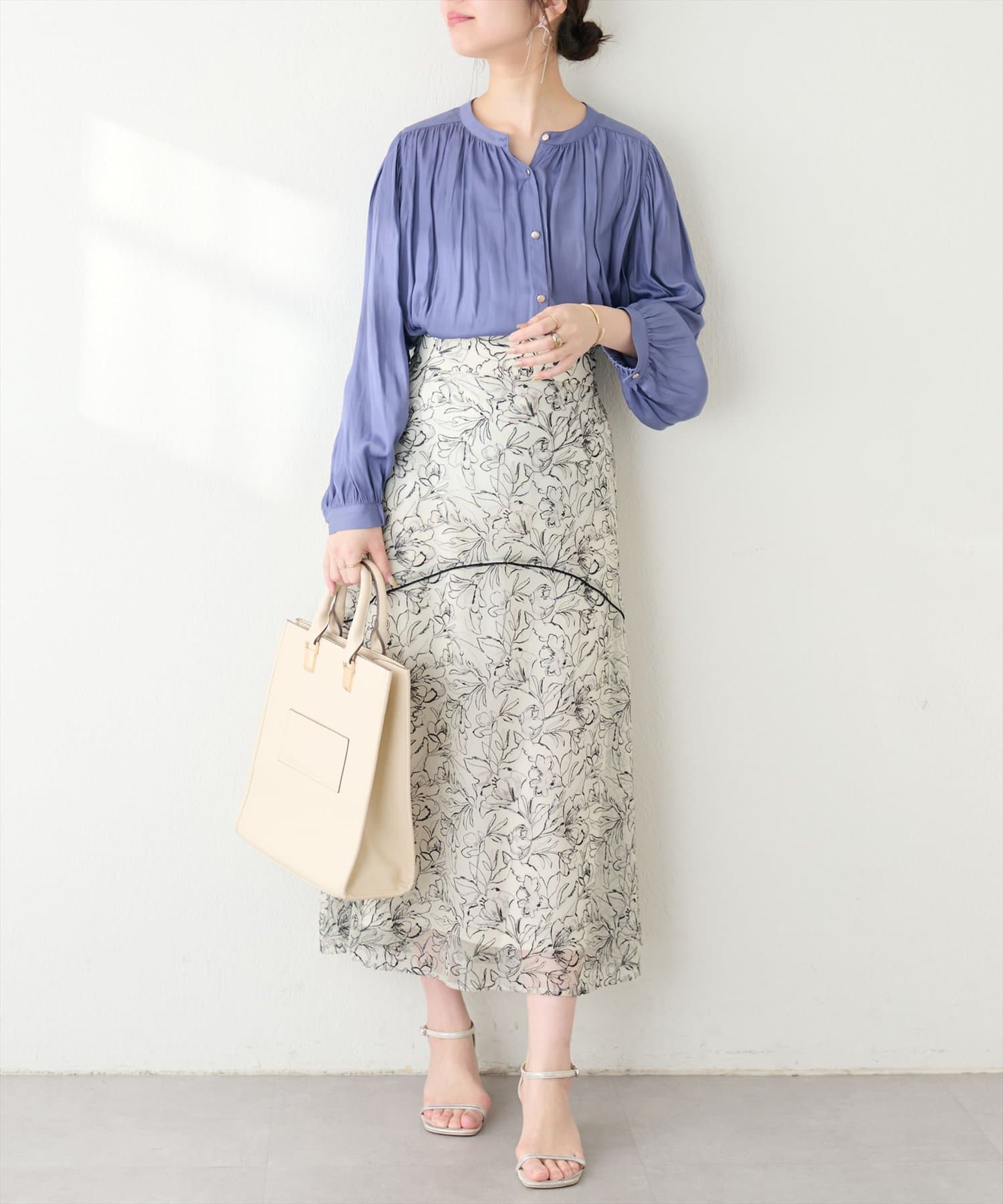 フレアラインやナローシルエットのスカートにウエストインして頂くと、すっきり上品に決まります。
