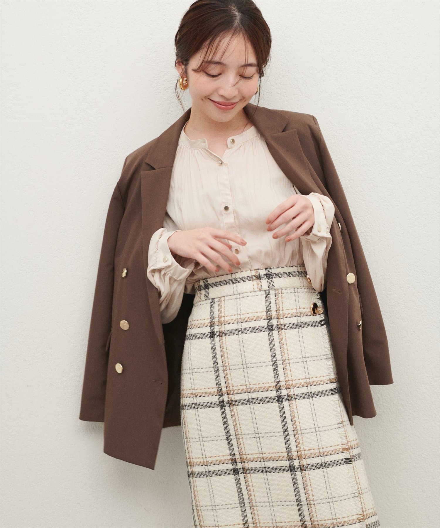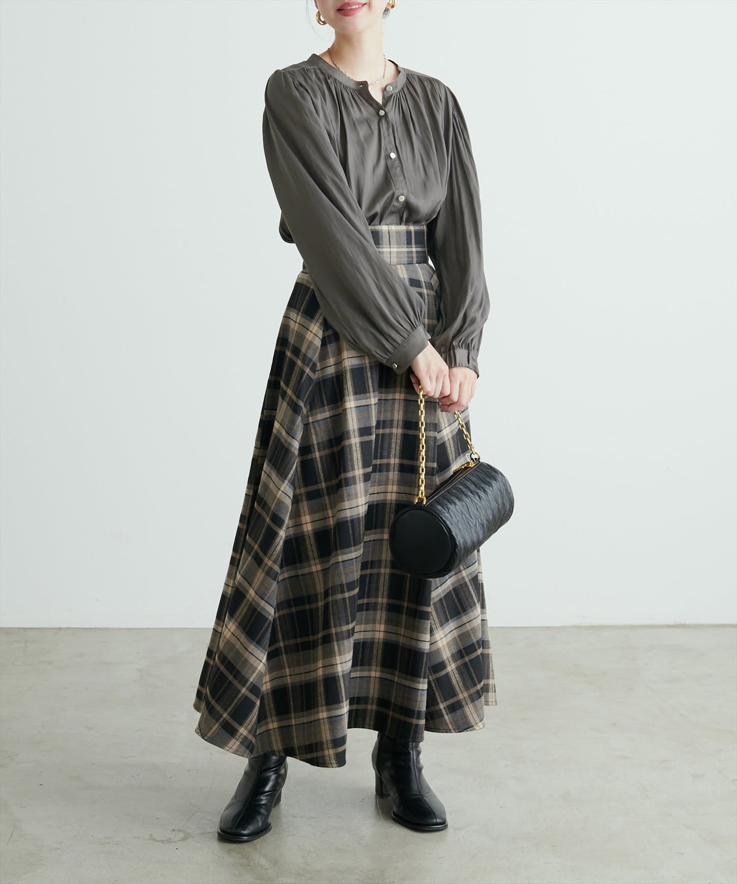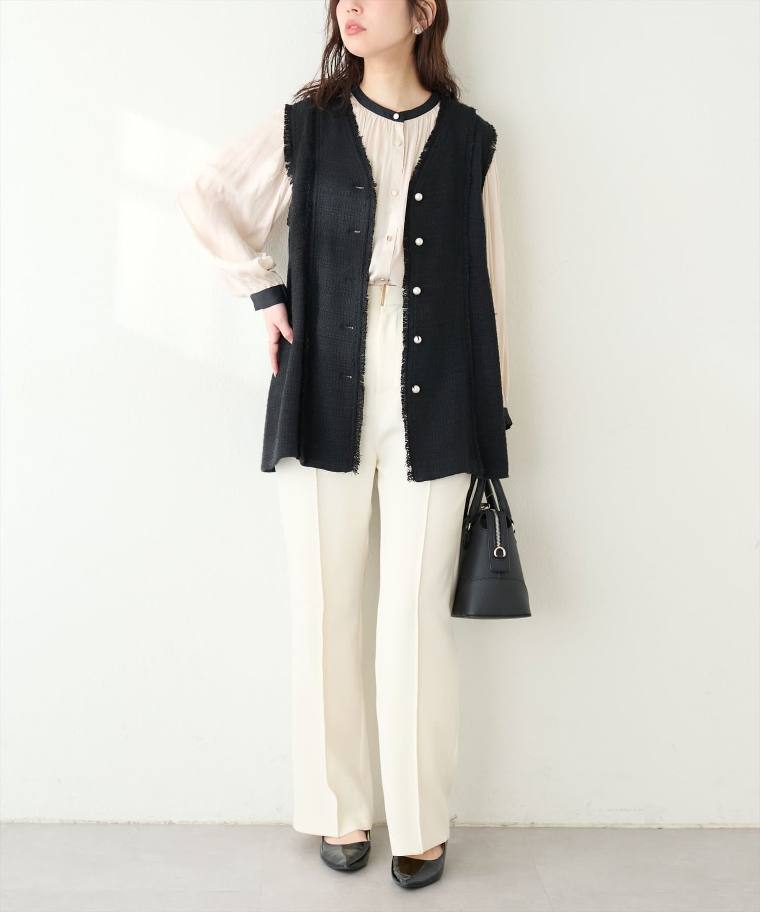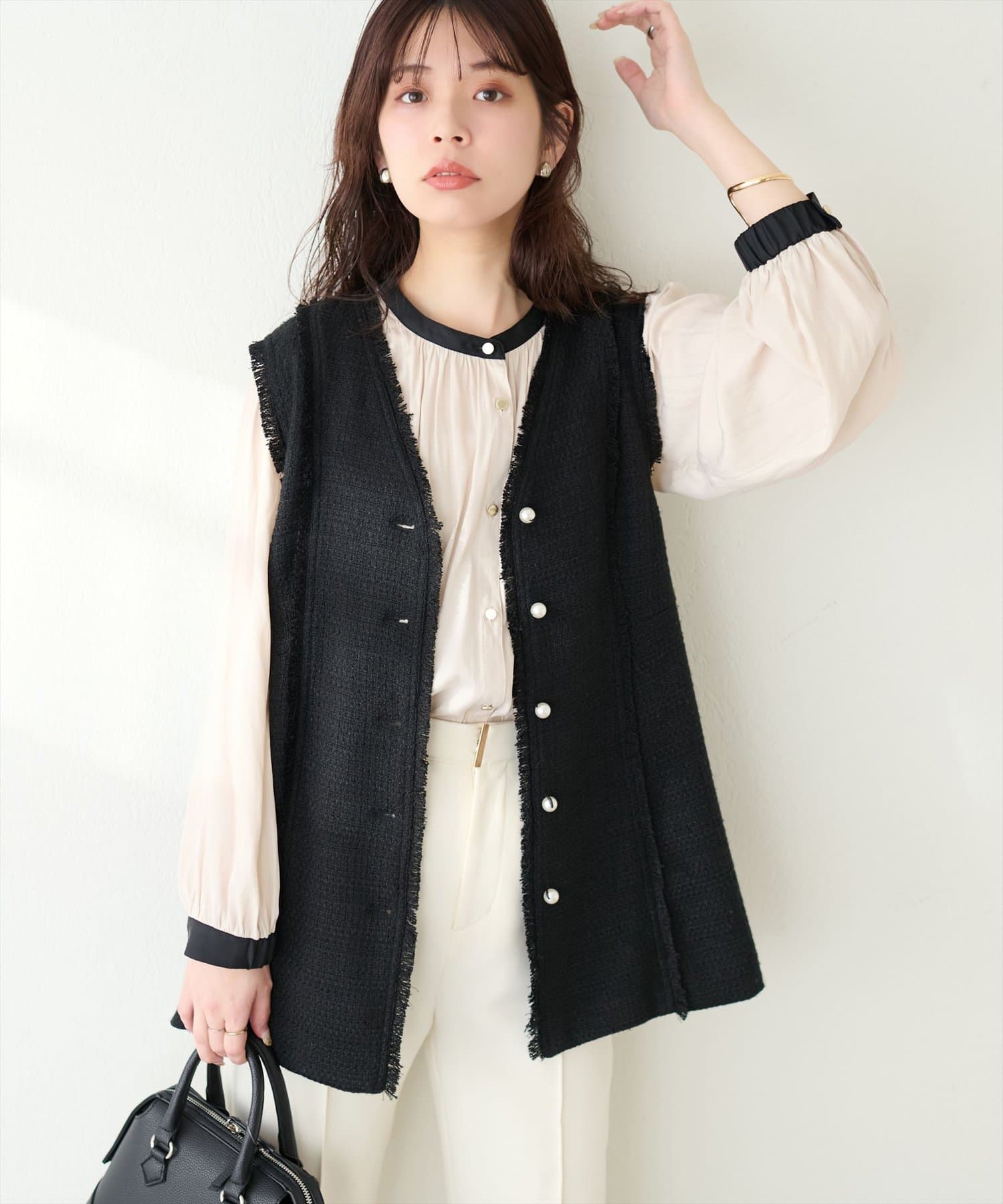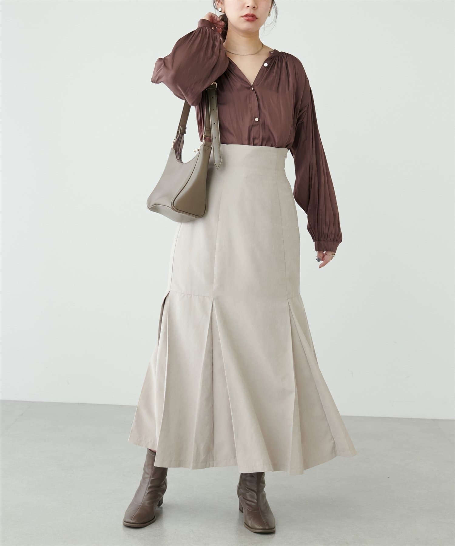 フレアラインやナローシルエットのスカートにウエストインして頂くと、すっきり上品に決まります。