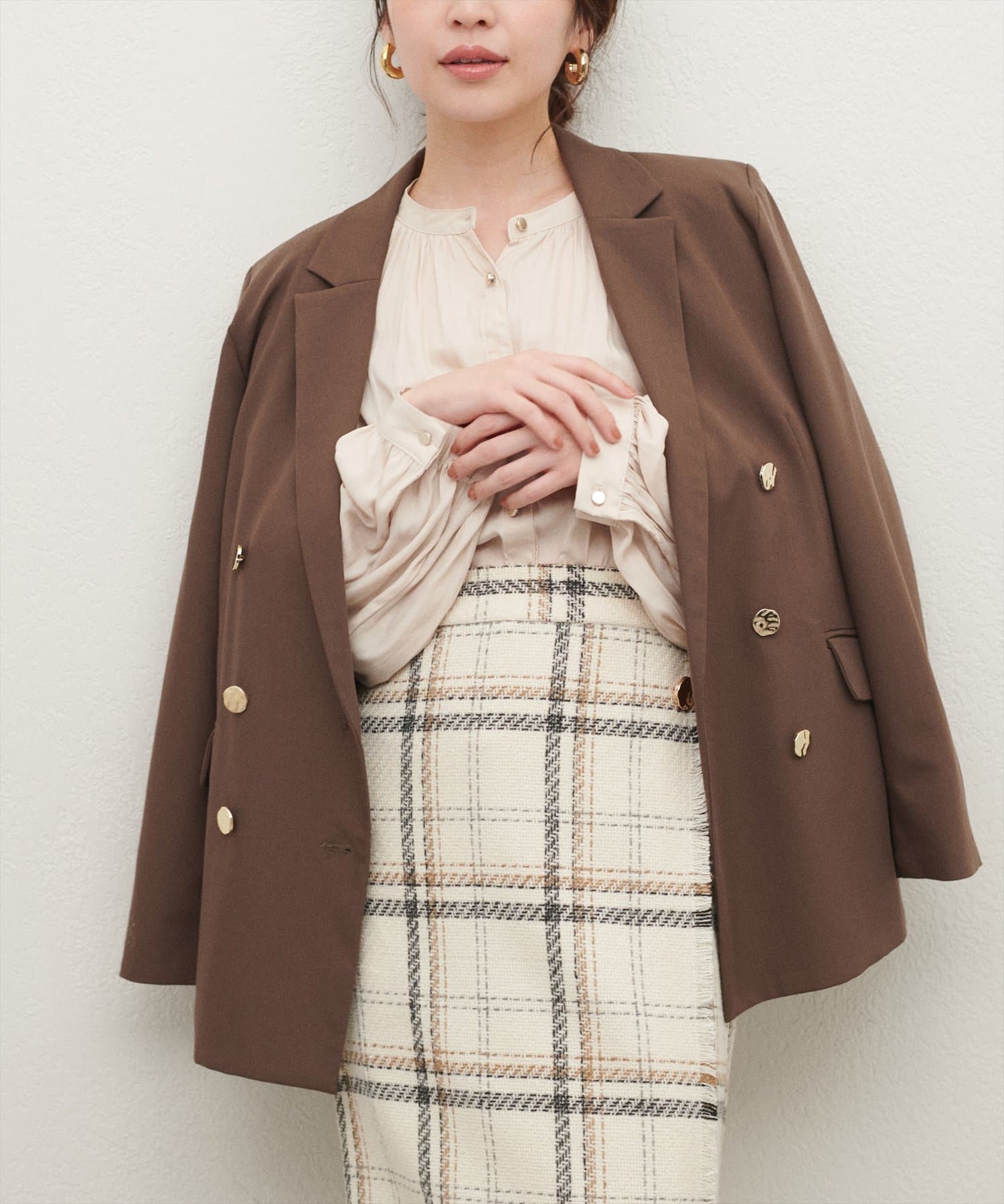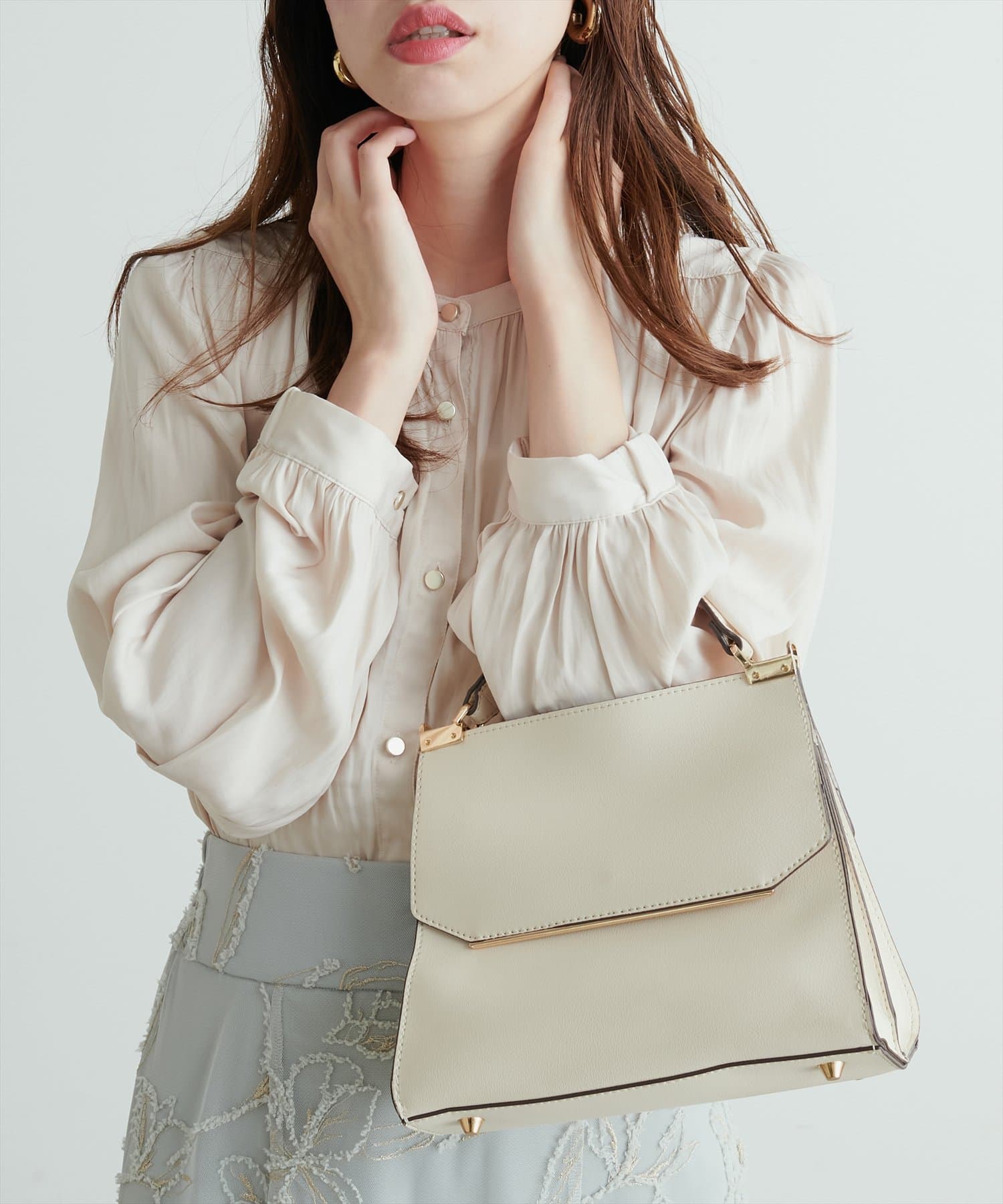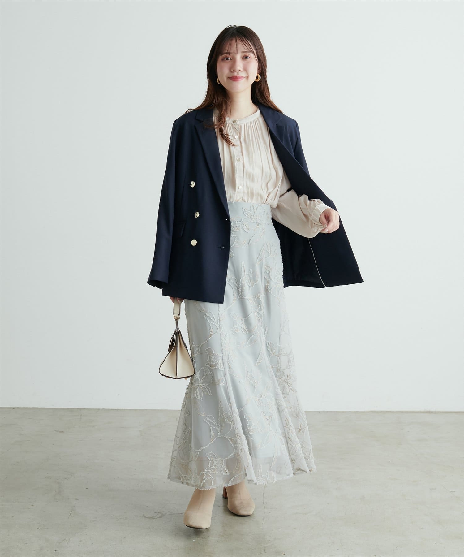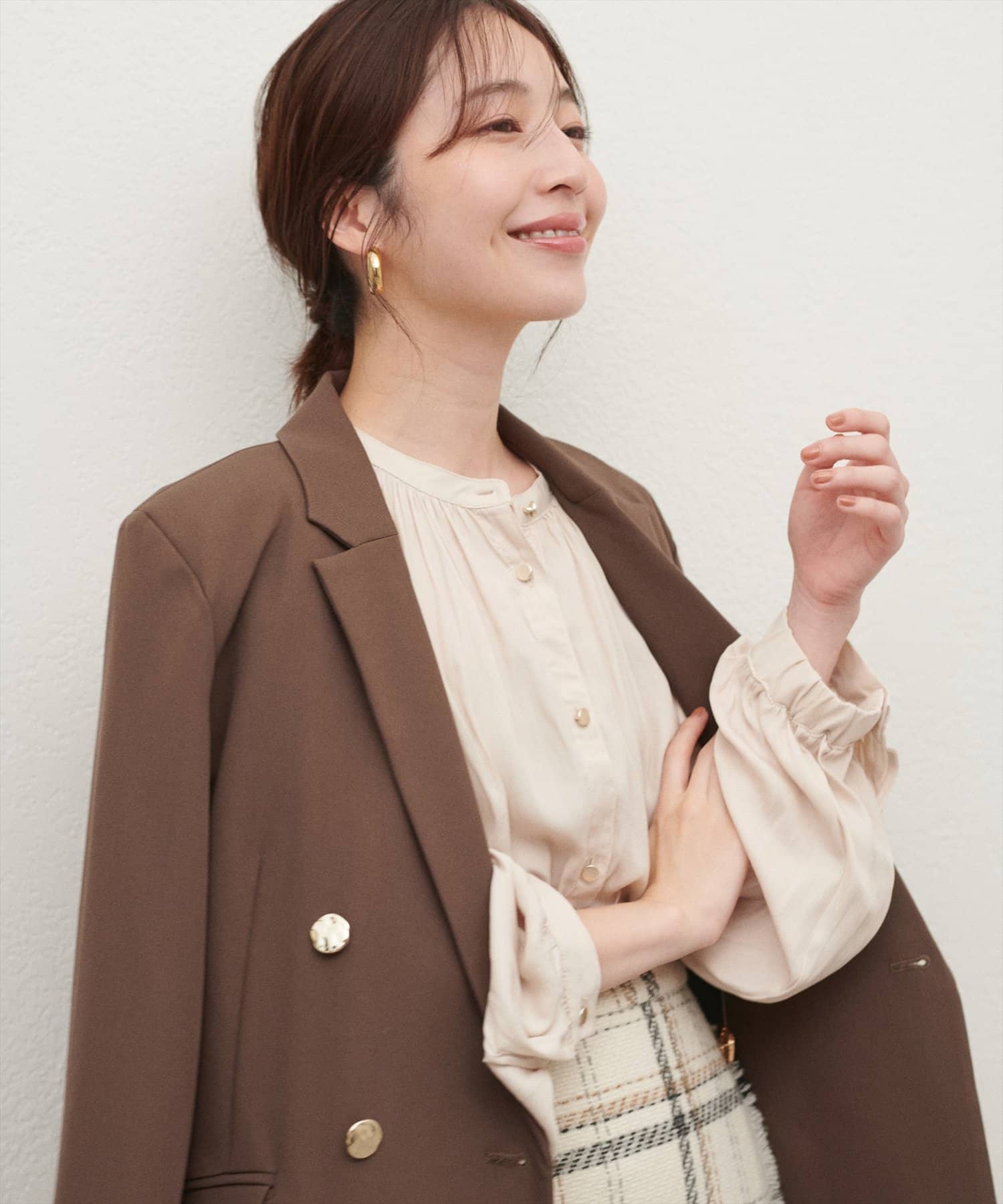 フレアラインやナローシルエットのスカートにウエストインして頂くと、すっきり上品に決まります。